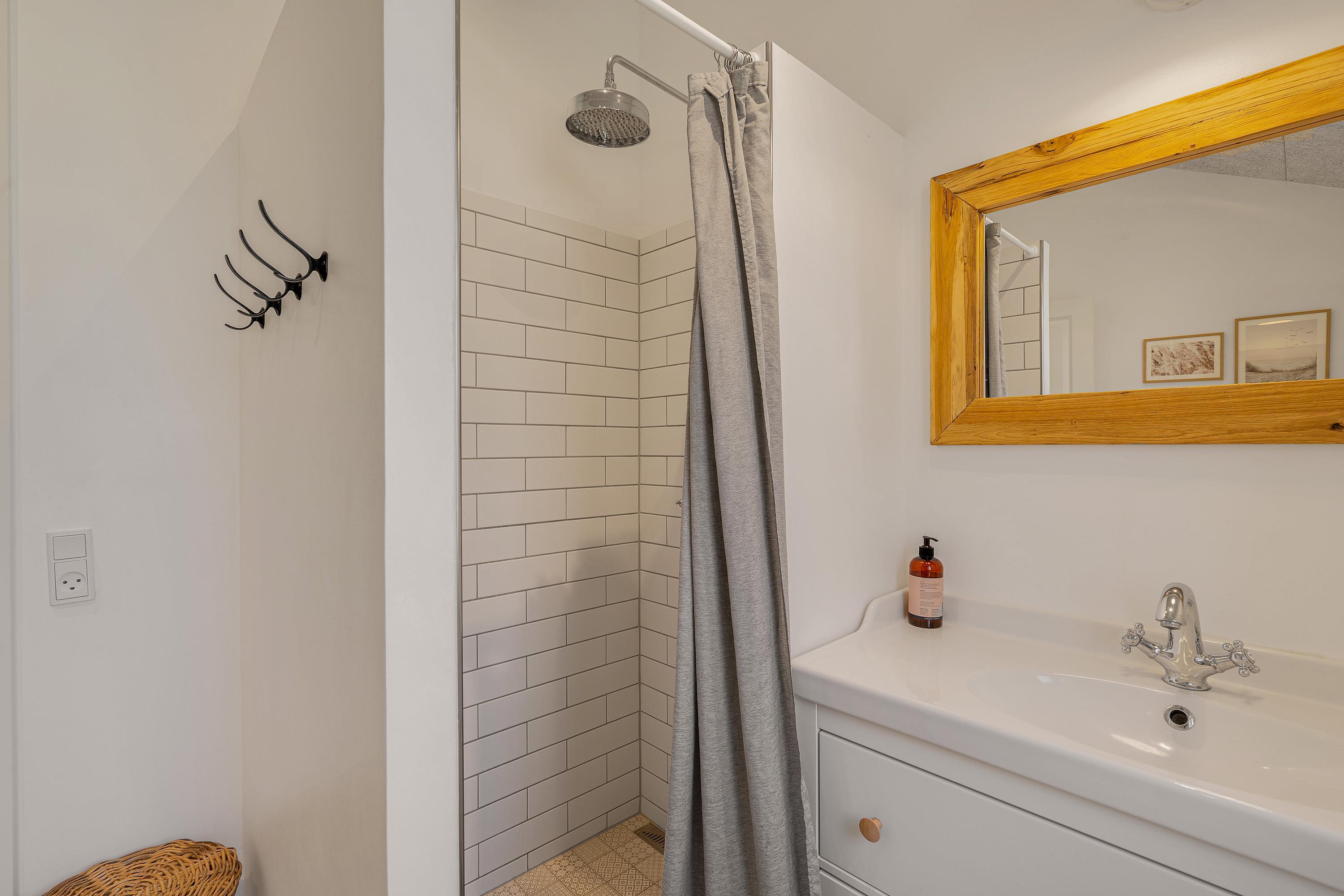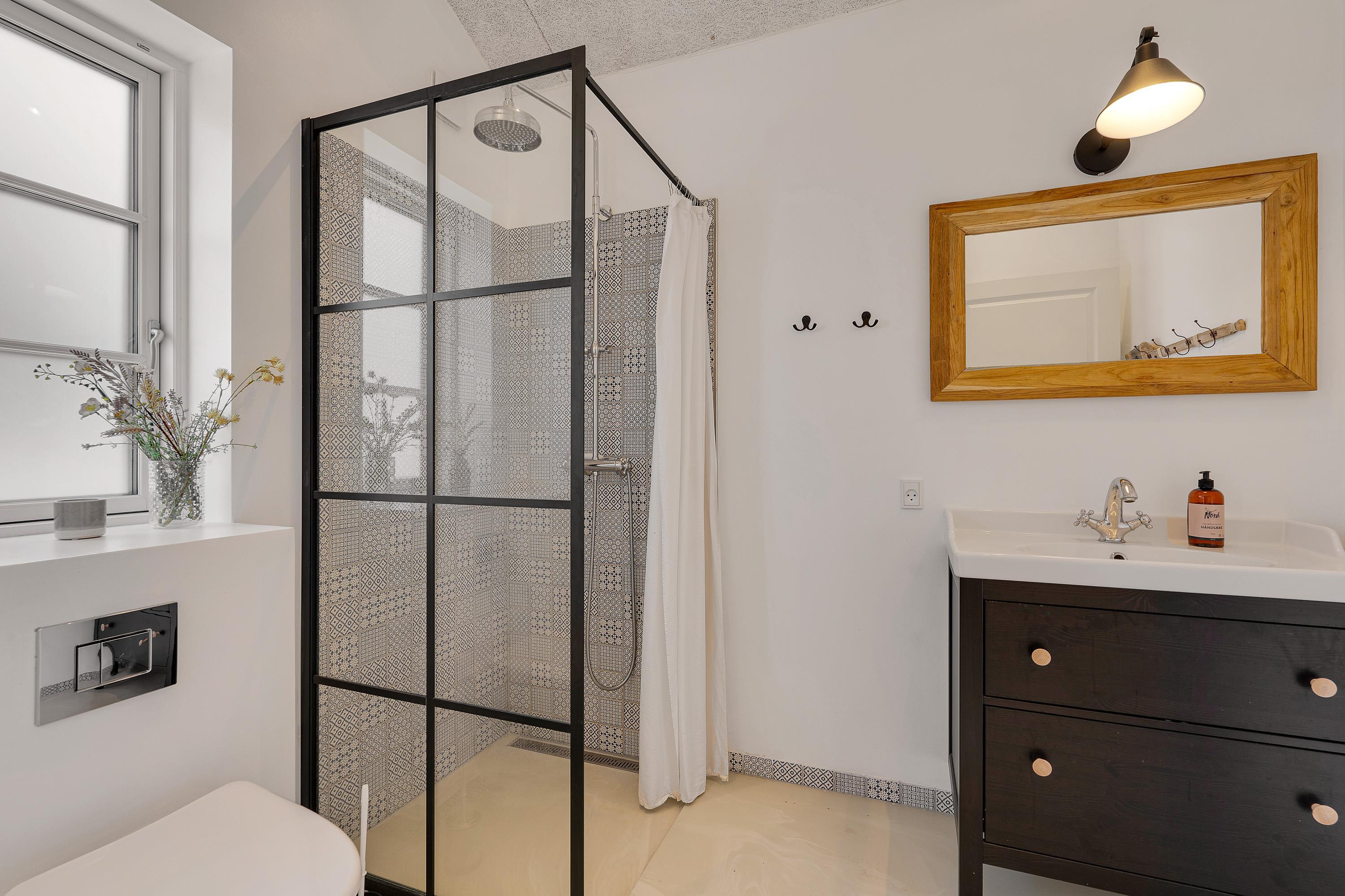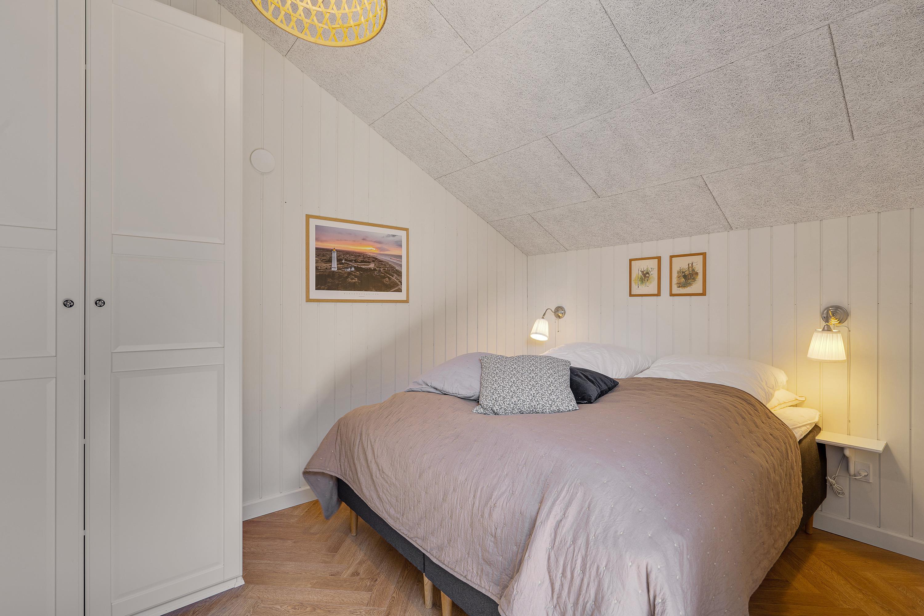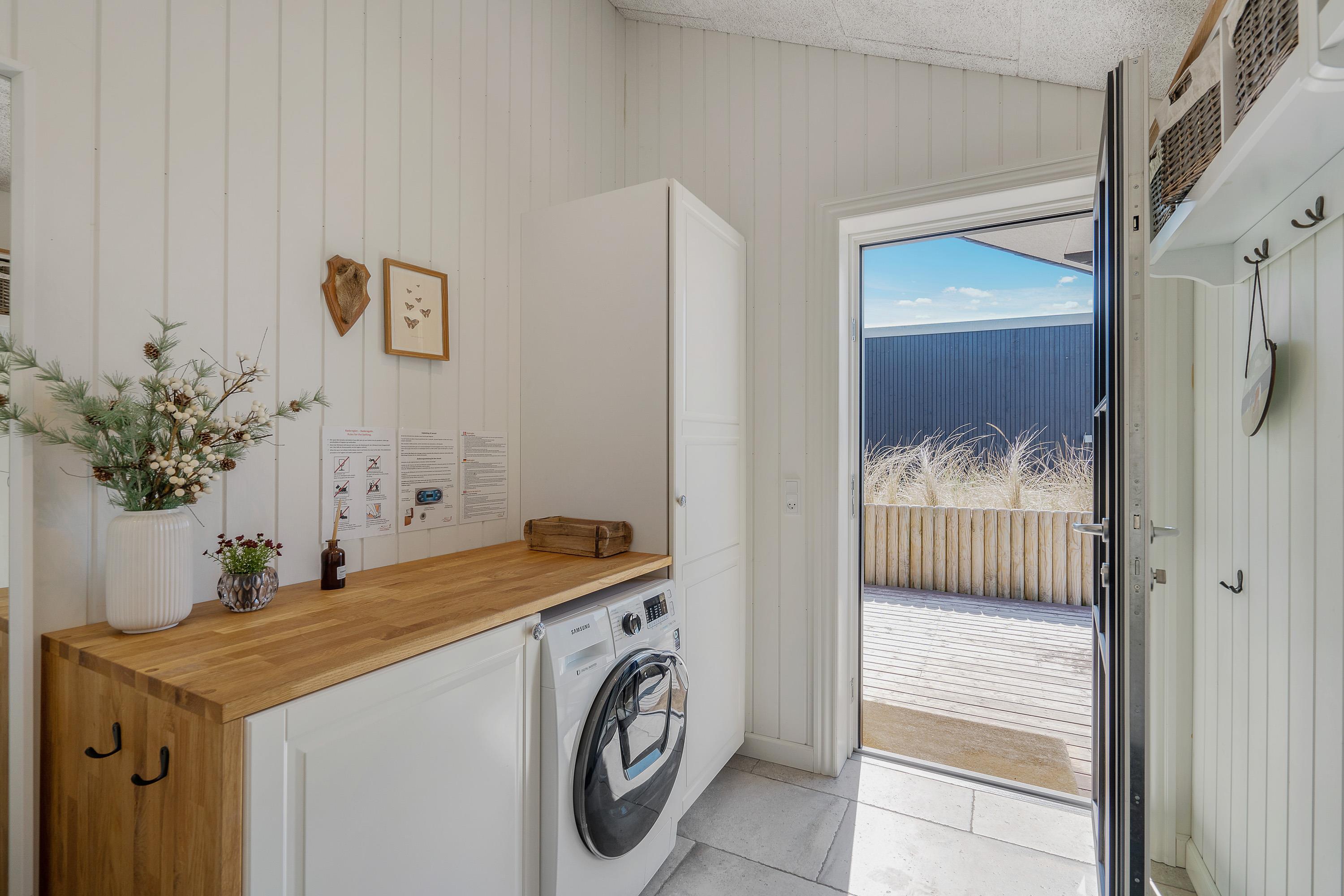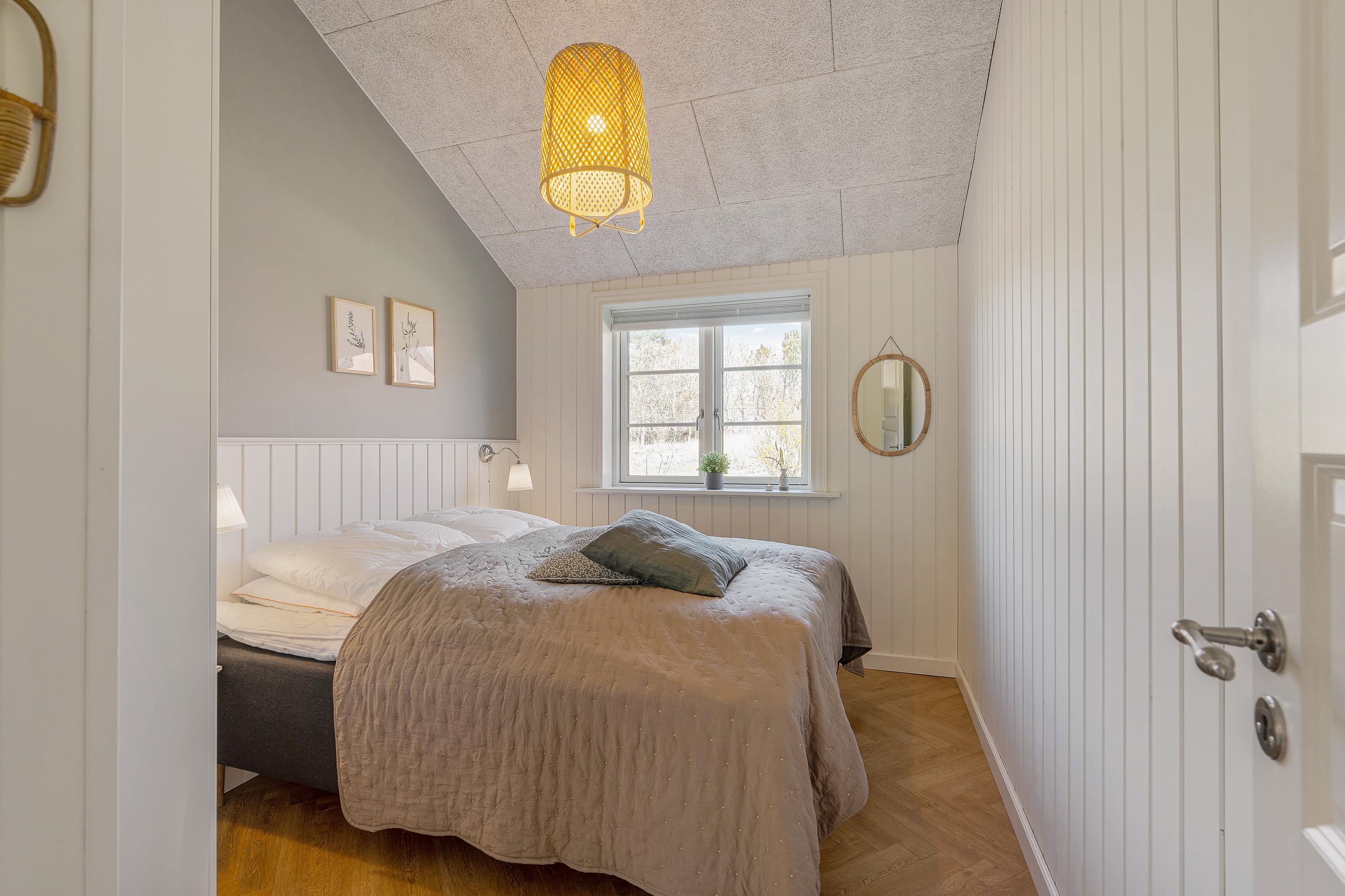 Rent praktisk rummer feriehuset 6 soveværelser med dobbeltsenge og 3 badeværelser – hvoraf et er med puslebord og badekar, så I til hver en tid slipper for kø om morgenen. Tøjvask er også hurtigt klaret med en kombineret vaskemaskine og tørretumbler. Samtidig er sommerhuset også energibesparende, da der er gulvvarme i alle rum.