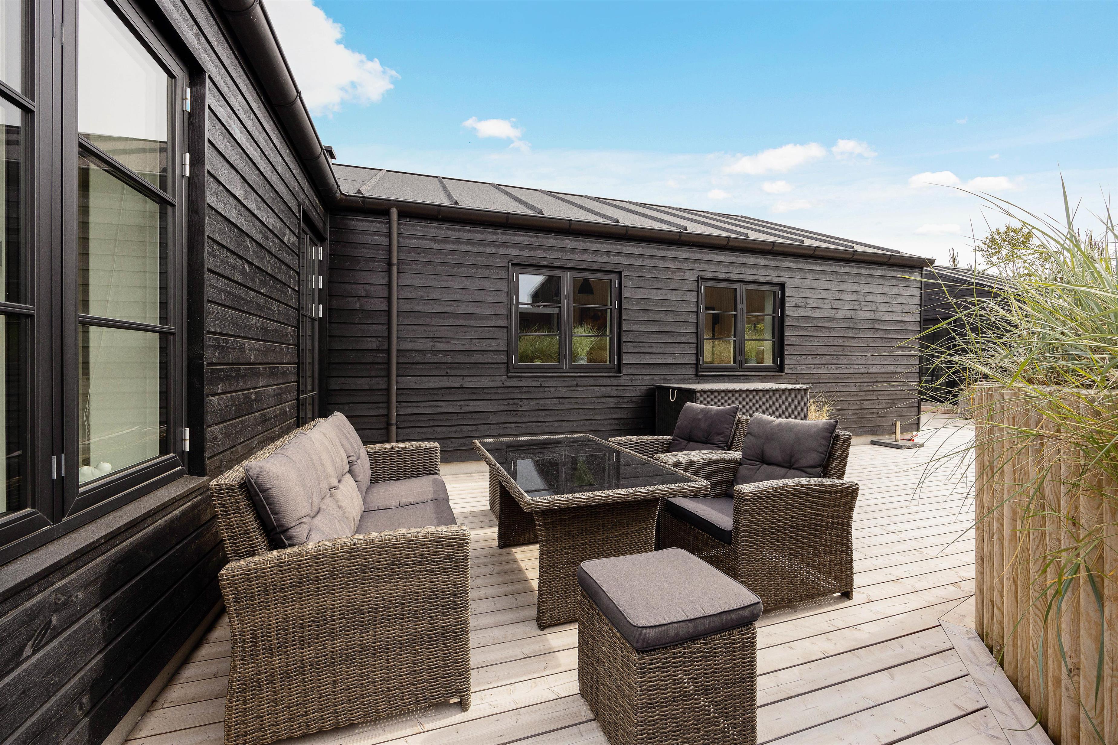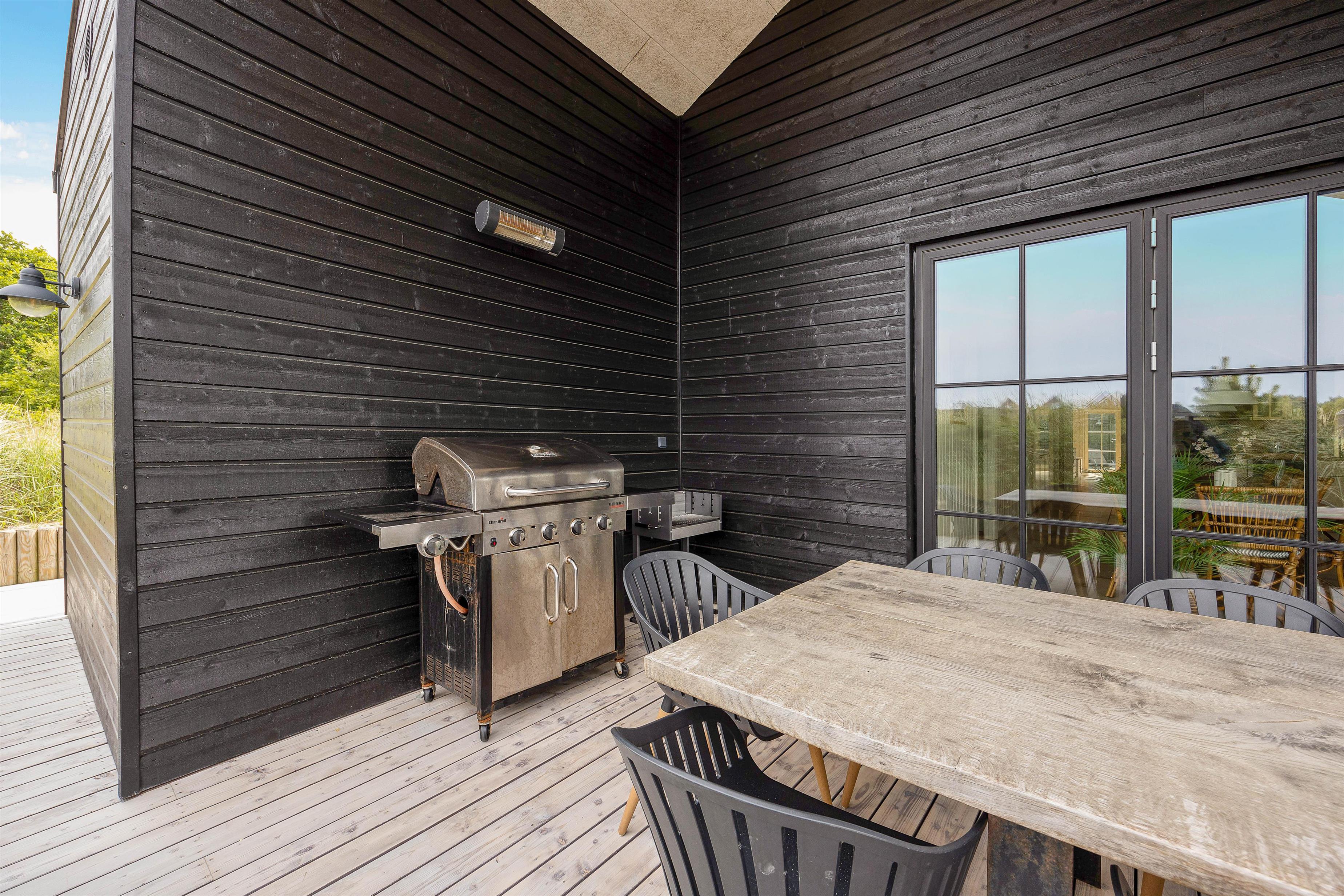 Sommerhuset emmer ikke kun af luksus indenfor; udemiljøet er også helt i top. Her er en tilsvarende stor terrasse, hvor der er flere fine kroge med havemøbler, liggestole og en grill. Dele af terrassen er tilmed overdækket, så I kan runde dagen af med en lækker grillaften i aftensolen på den overdækkede vestvendte terrasse med terrassevarmer.