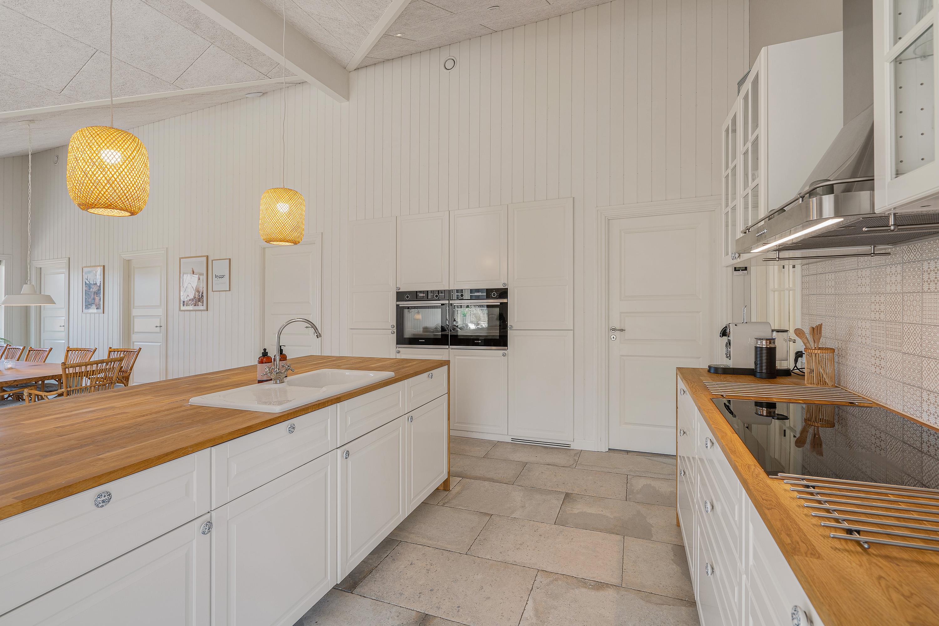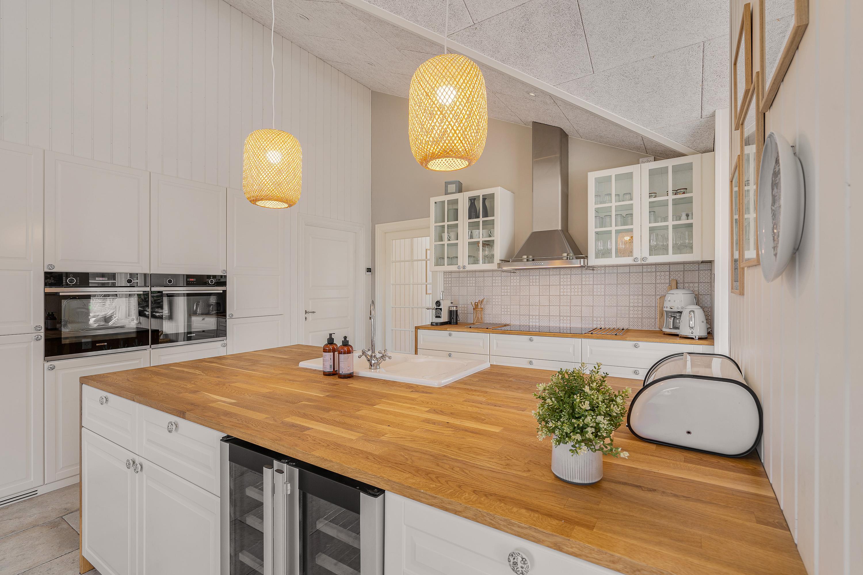 Feriehusets hjerte er uden tvivl det store køkkenalrum. I køkkenet er der rigeligt plads til at samles om madlavningen, mens resten af familien spiller spil ved spisebordet eller slapper af i den komfortable sofa foran brændeovnen. Køkkenet er veludstyret og indeholder både 2 køleskabe, 2 ovne, opvaskemaskine, vinkøler og Nespressomaskine med mælkeskummer.