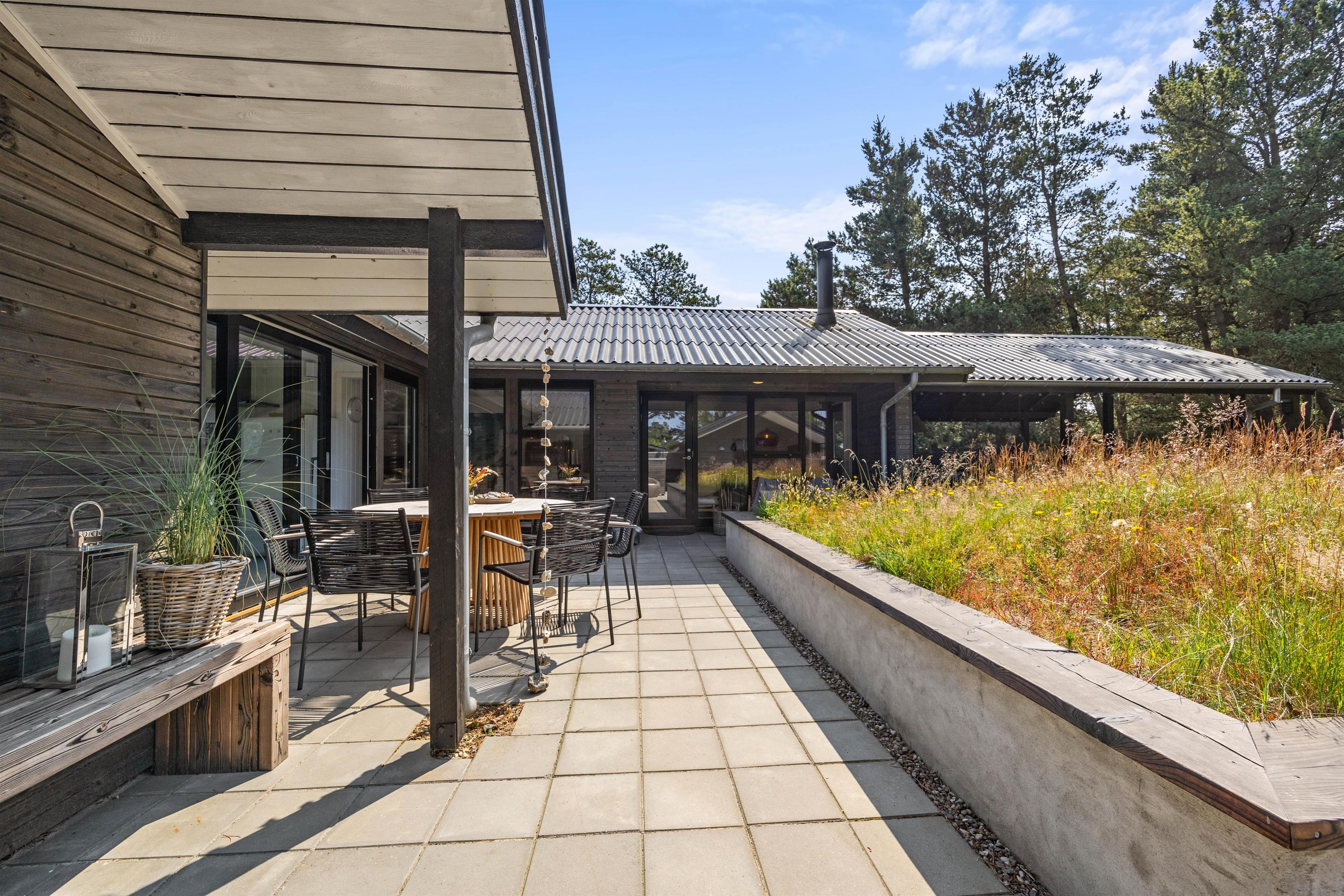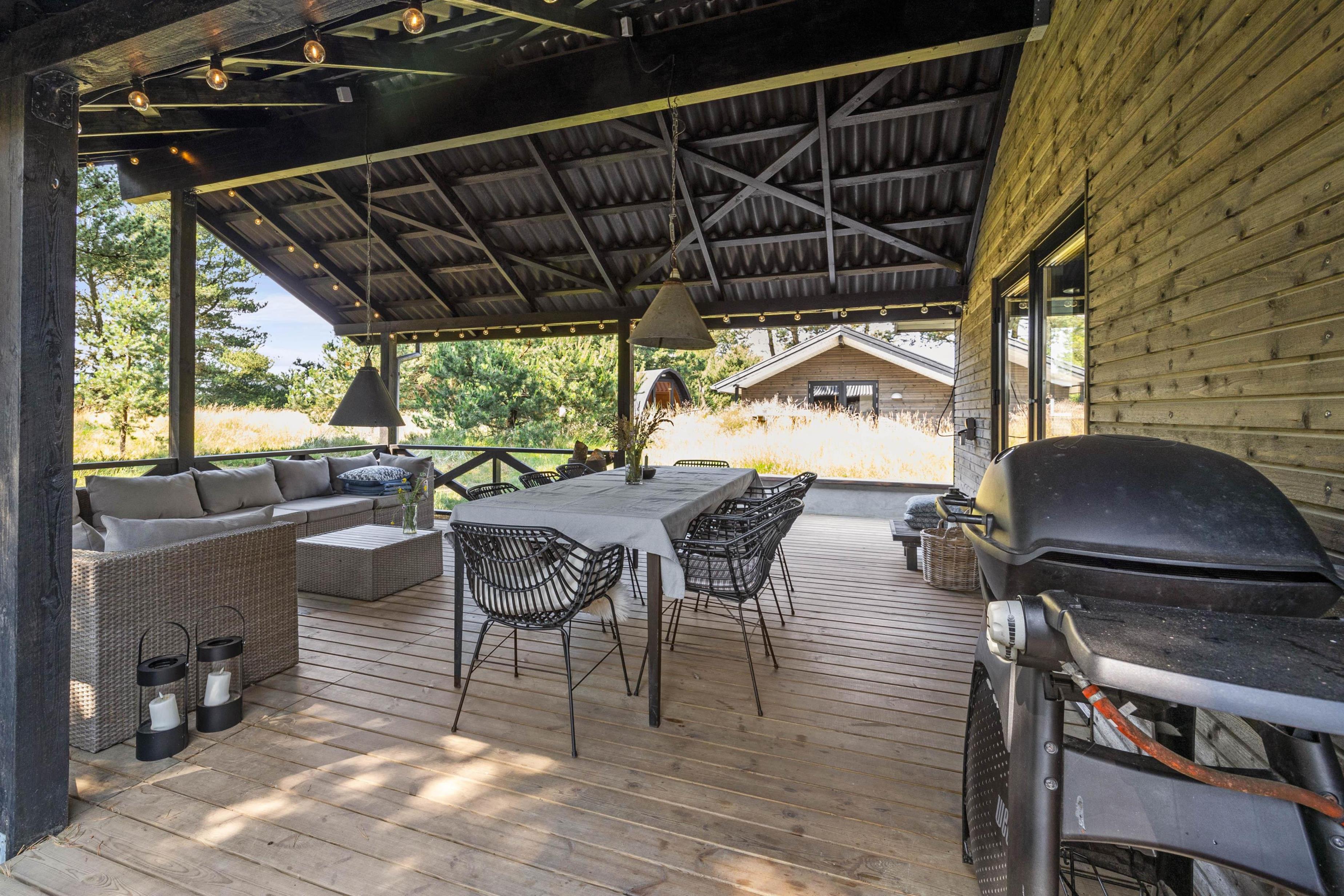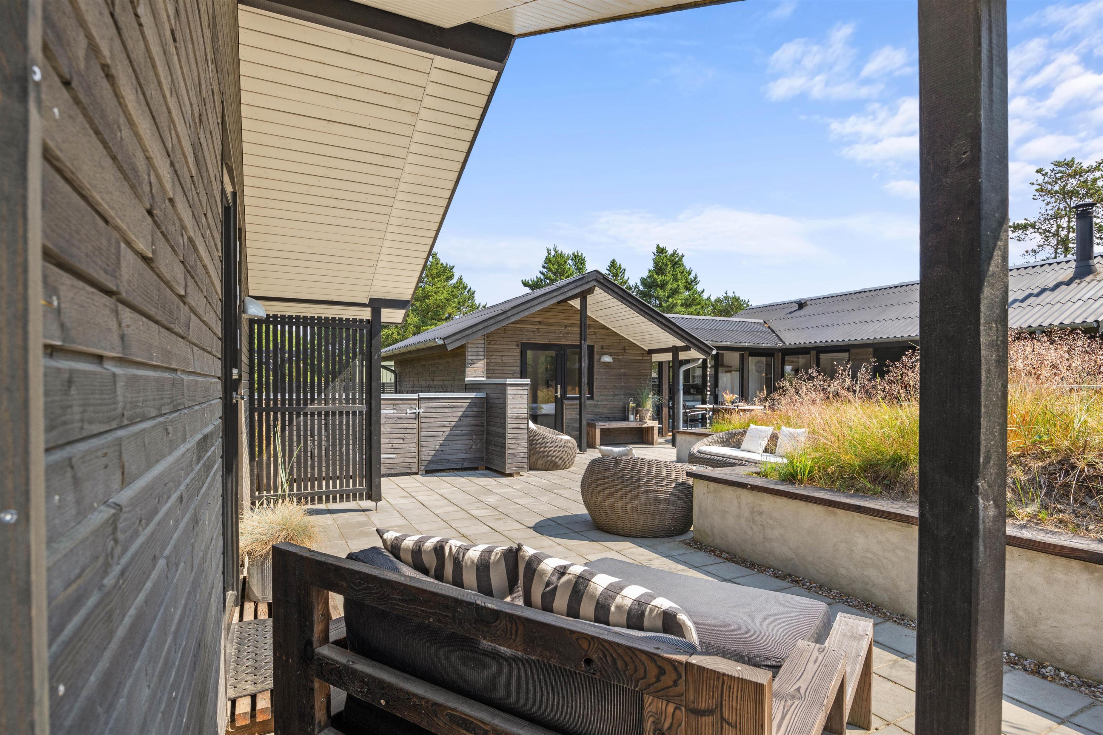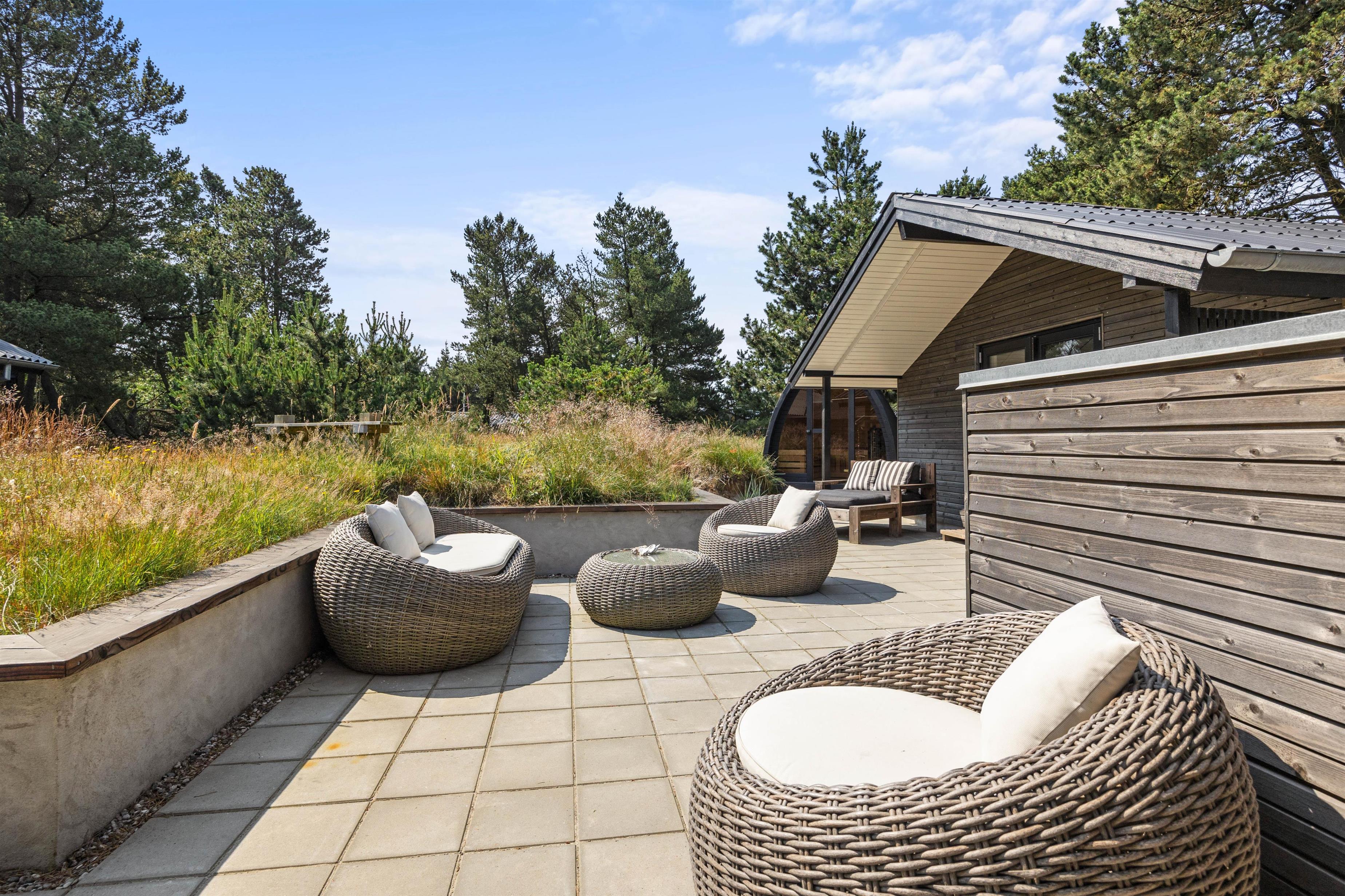 Sommerhuset er beliggende på en fin naturgrund, hvor I er omgivet af masser af skøn natur på ferien. Her har I flere terrasser, hvor I kan finde jer godt til rette i havemøblerne. På sommerhusets dejlige udeområde er der rig mulighed for at nyde de solrige feriedage. Der er ovenikøbet en udebruser, der kan benyttes fra 1. april til 31. oktober, hvor I kan blive afkølet efter et besøg i udesaunaen.