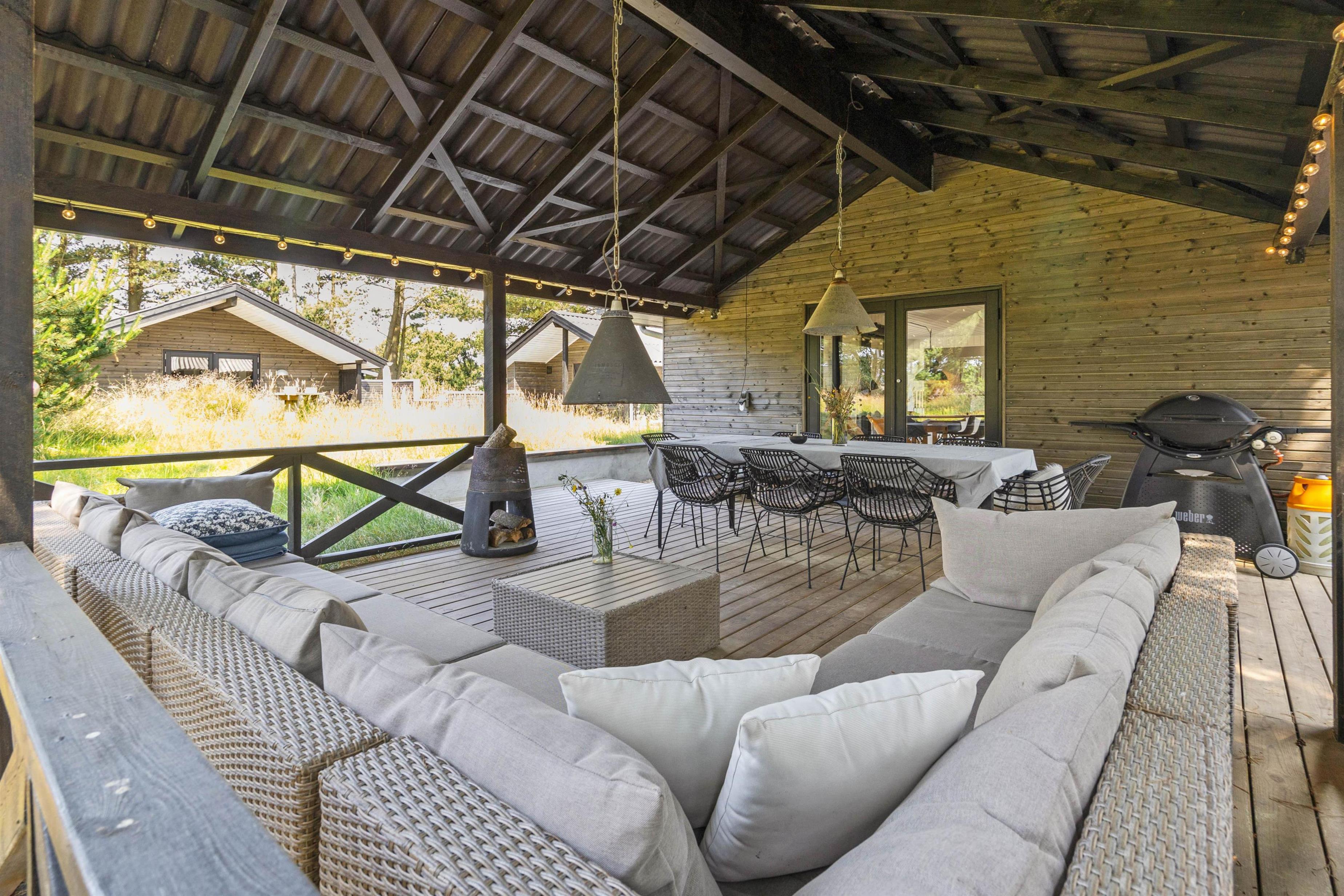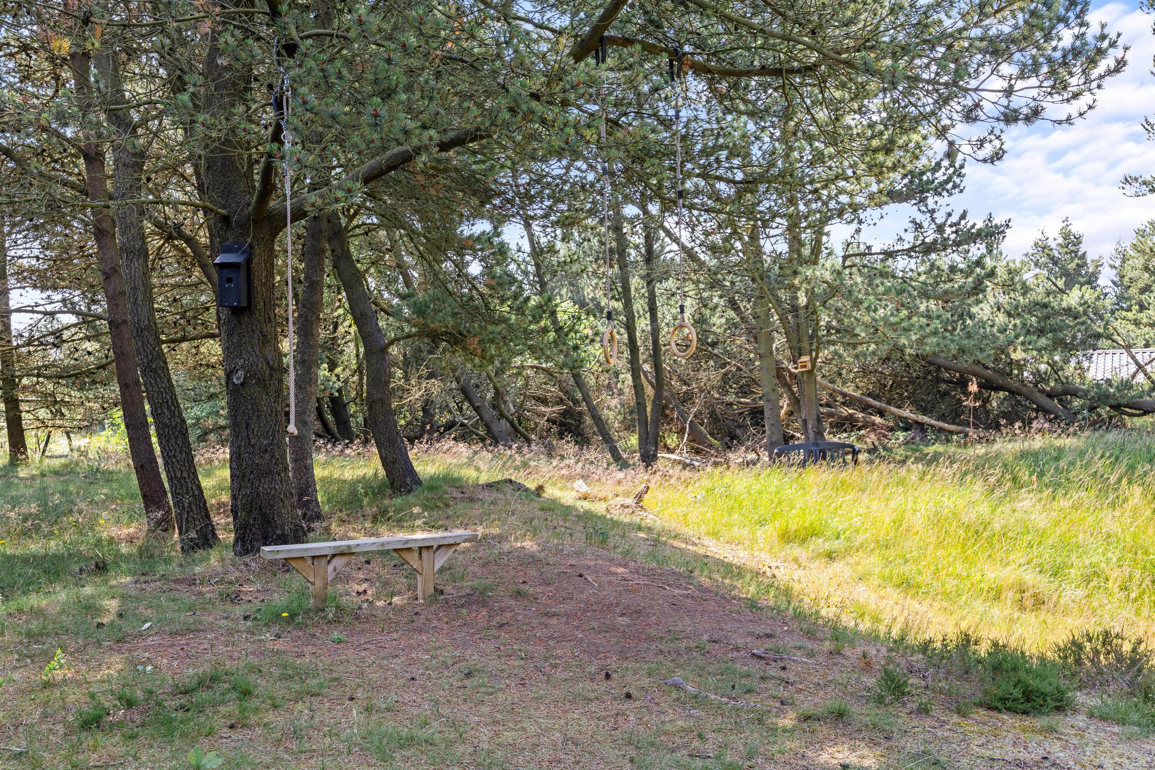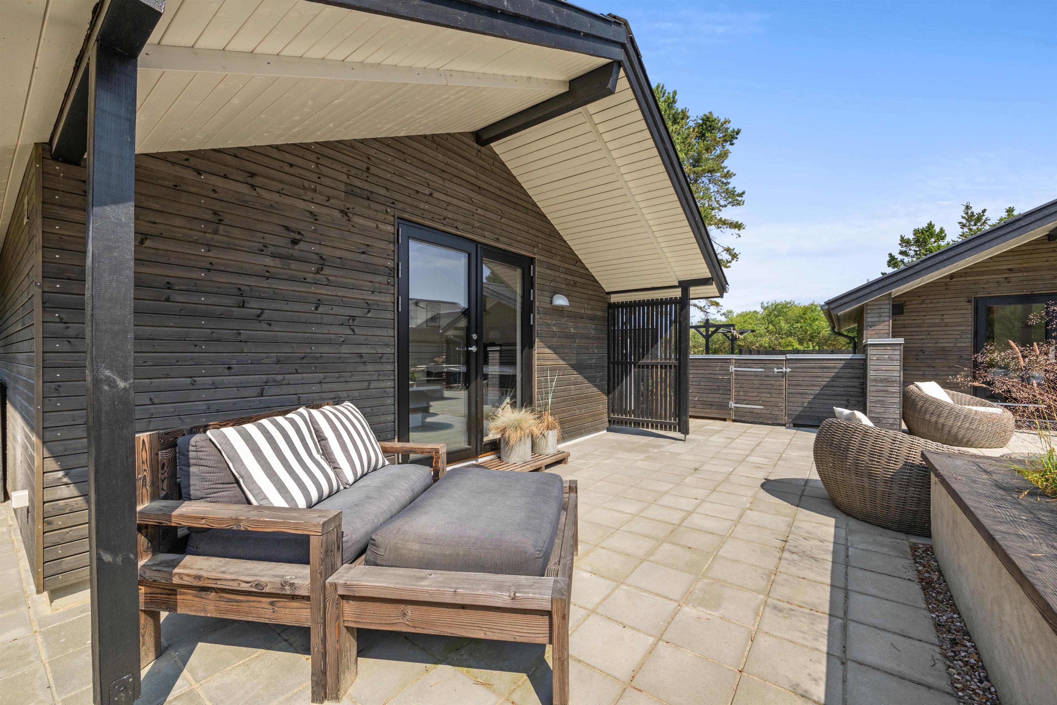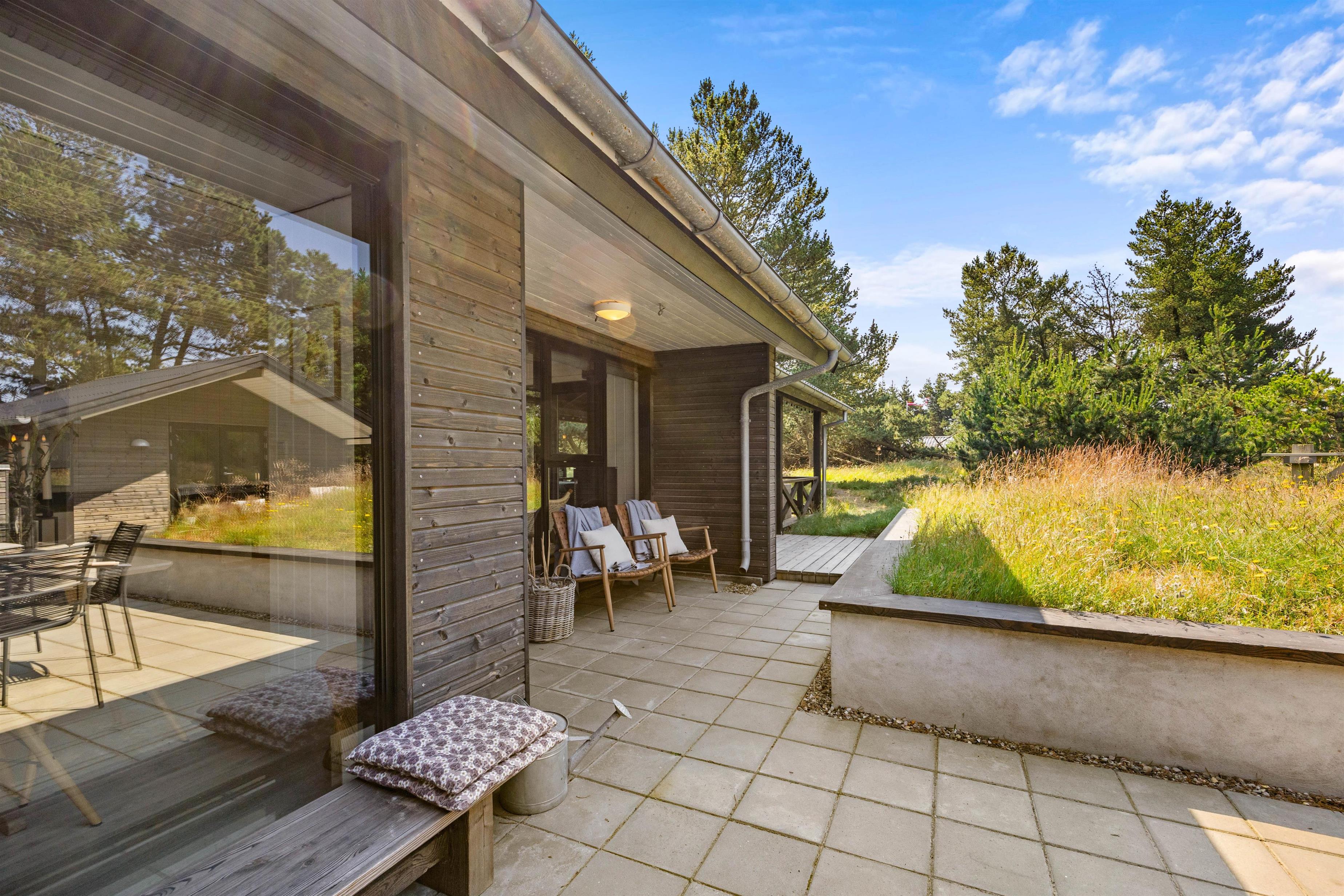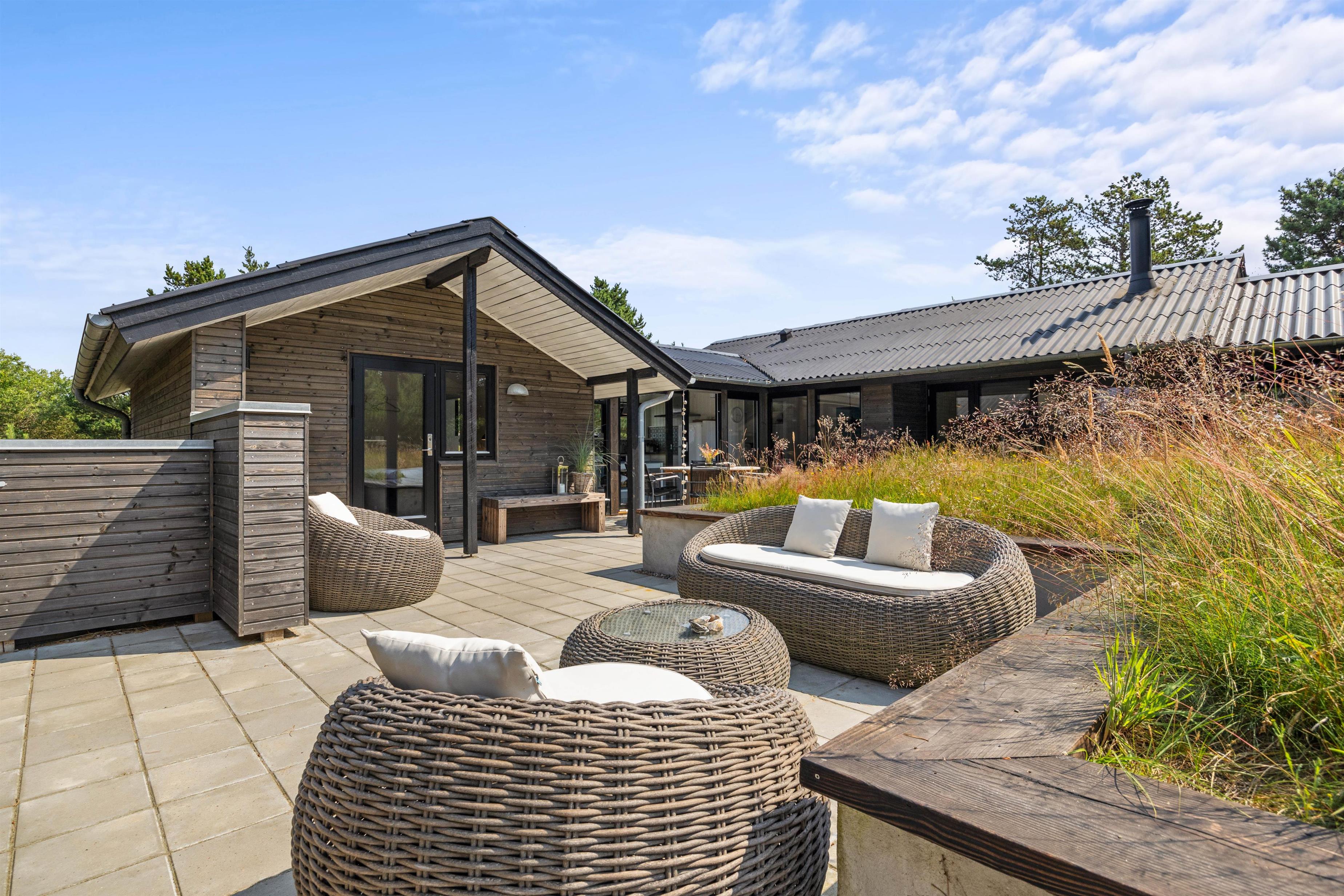 Sommerhuset er beliggende på en fin naturgrund, hvor I er omgivet af masser af skøn natur på ferien. Her har I flere terrasser, hvor I kan finde jer godt til rette i havemøblerne. På sommerhusets dejlige udeområde er der rig mulighed for at nyde de solrige feriedage. Der er ovenikøbet en udebruser, der kan benyttes fra 1. april til 31. oktober, hvor I kan blive afkølet efter et besøg i udesaunaen.