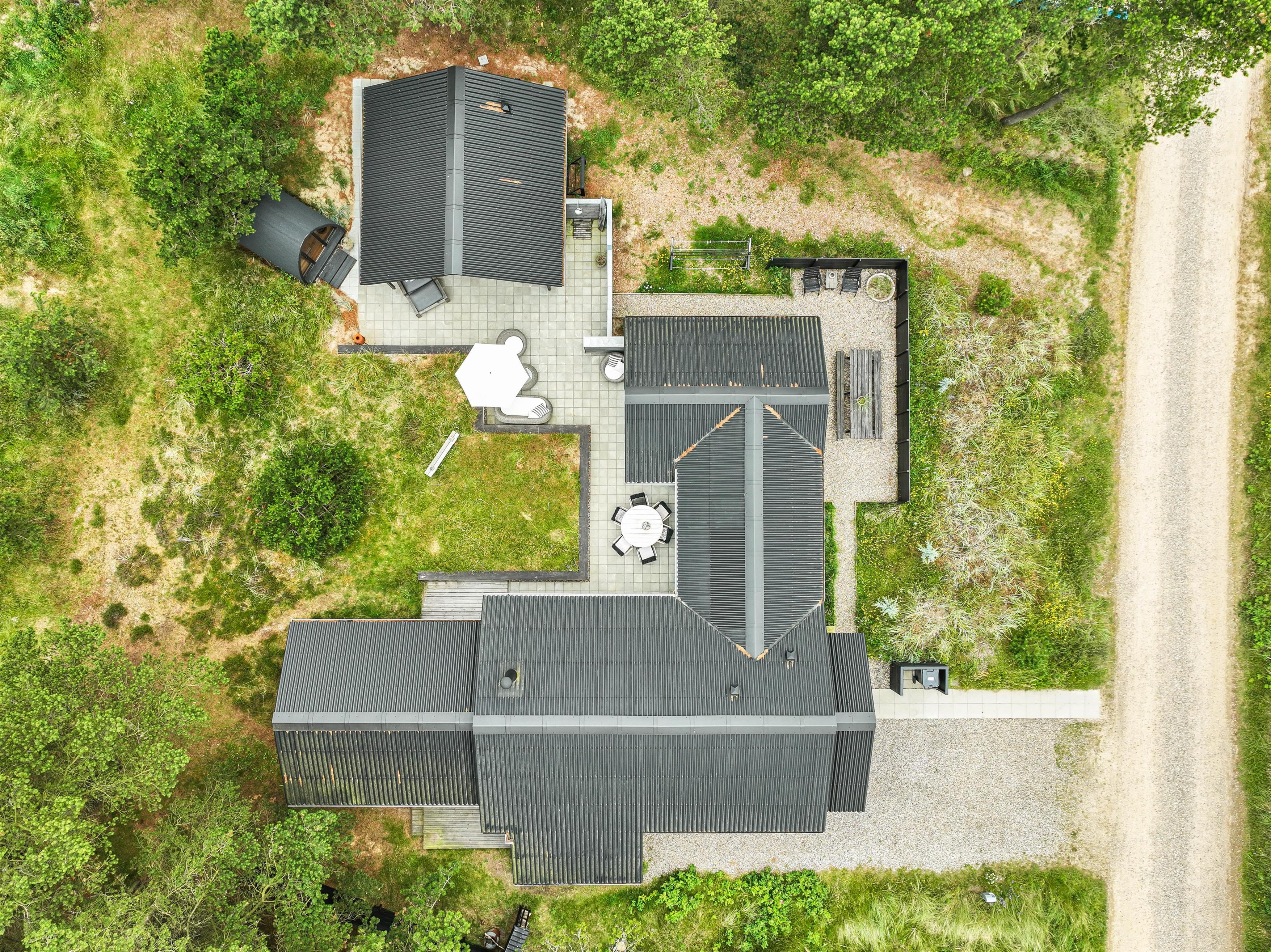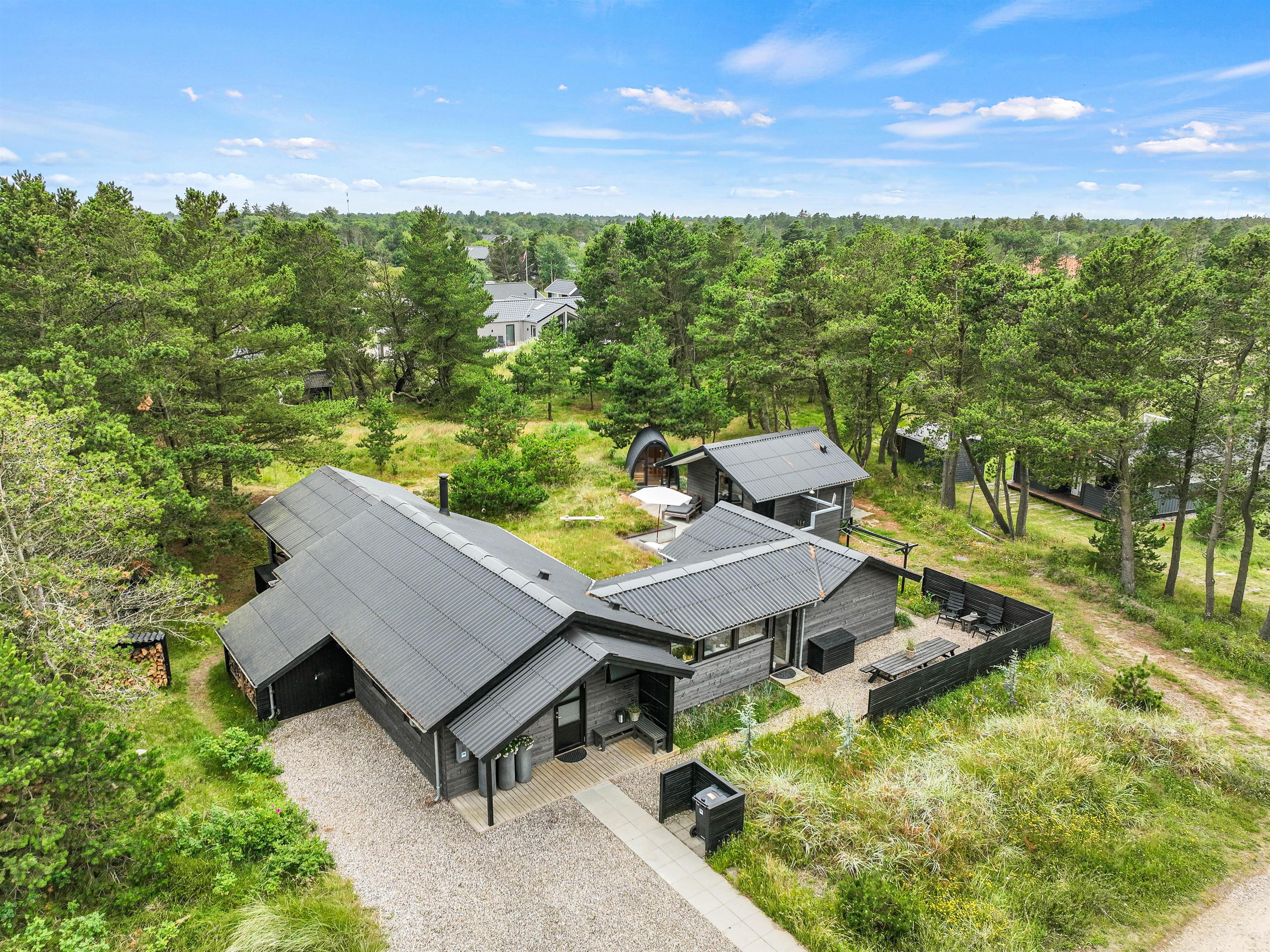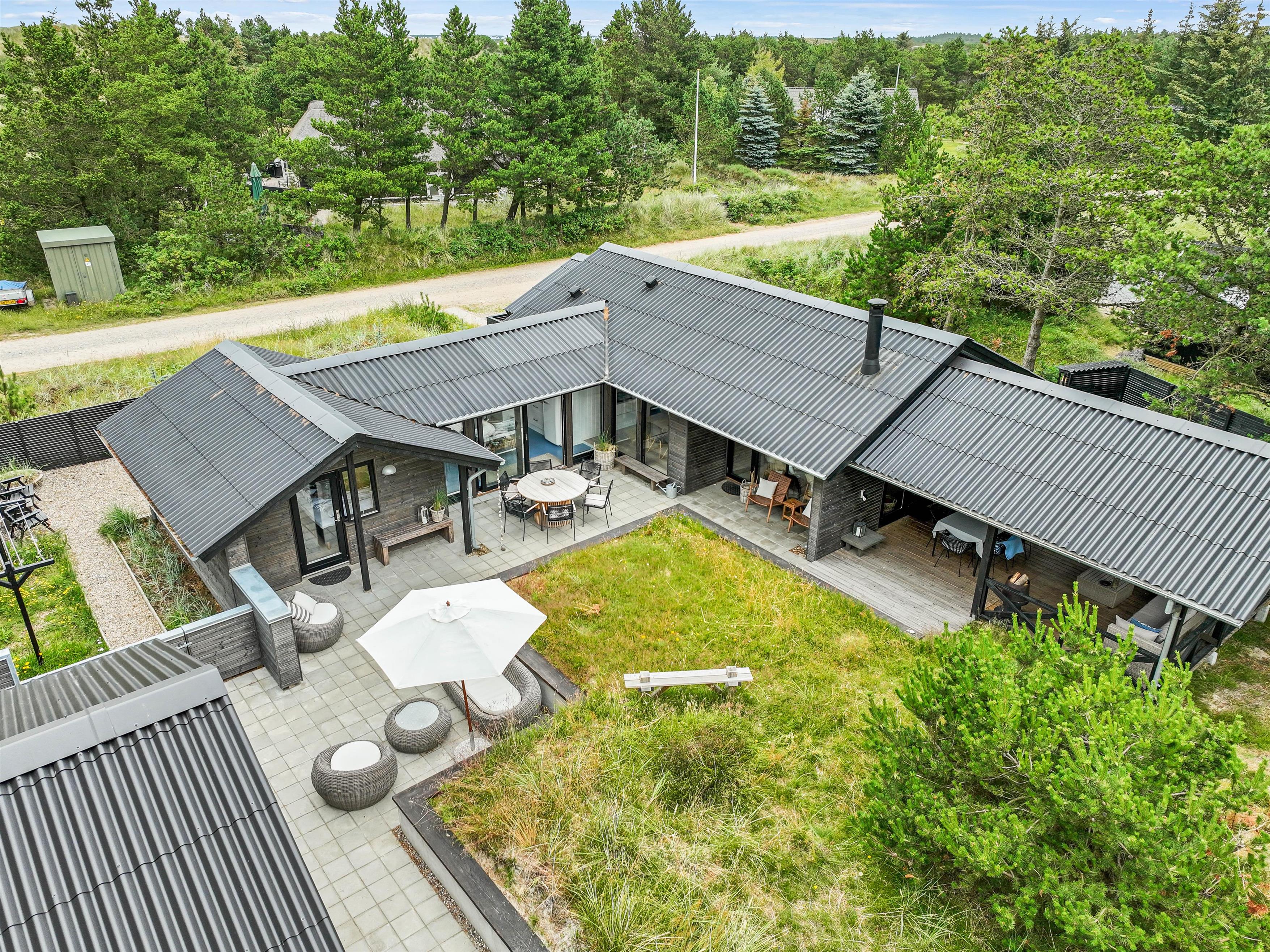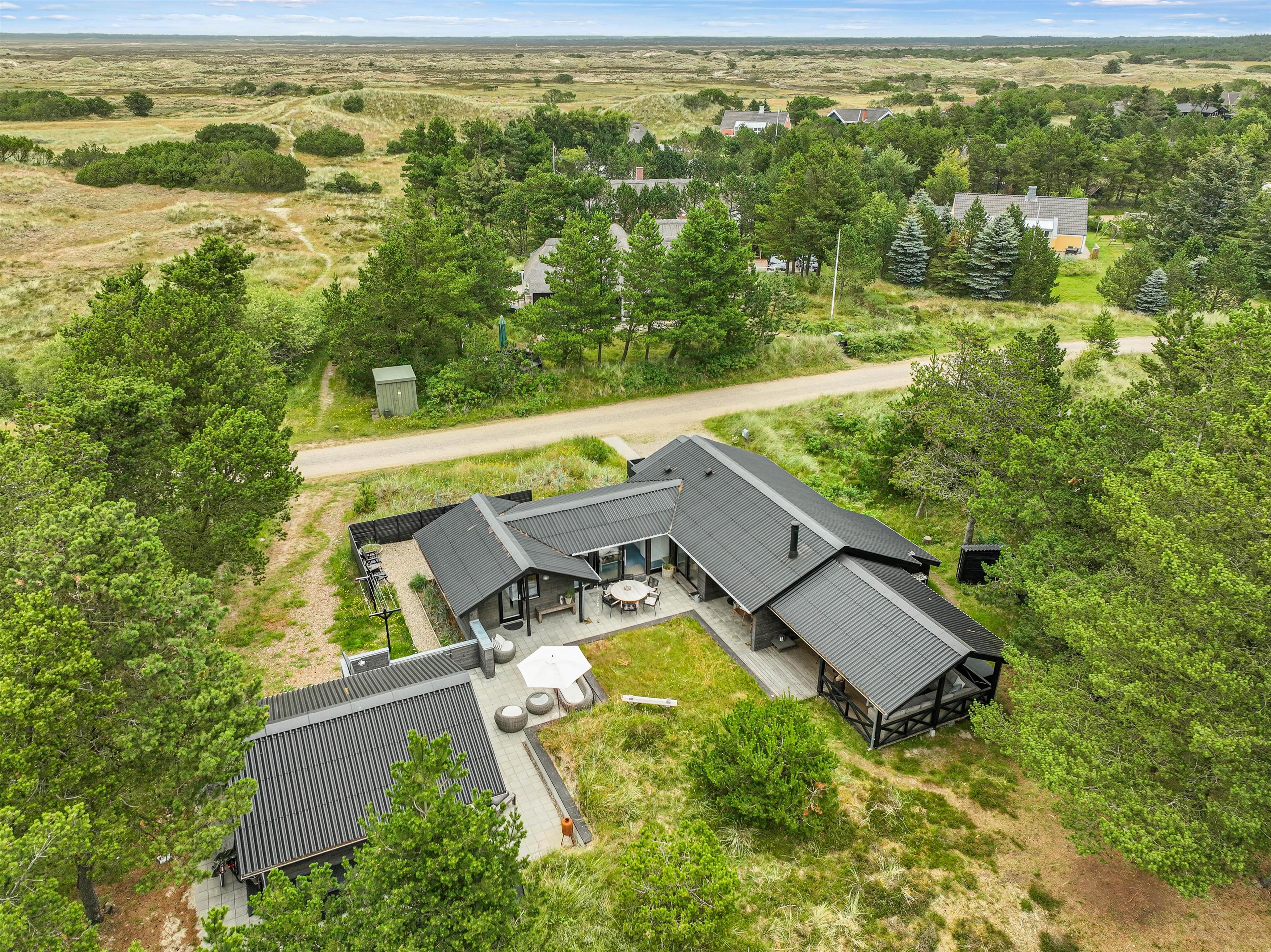 Sommerhuset er beliggende på en fin naturgrund, hvor I er omgivet af masser af skøn natur på ferien. Her har I flere terrasser, hvor I kan finde jer godt til rette i havemøblerne. På sommerhusets dejlige udeområde er der rig mulighed for at nyde de solrige feriedage. Der er ovenikøbet en udebruser, der kan benyttes fra 1. april til 31. oktober, hvor I kan blive afkølet efter et besøg i udesaunaen.