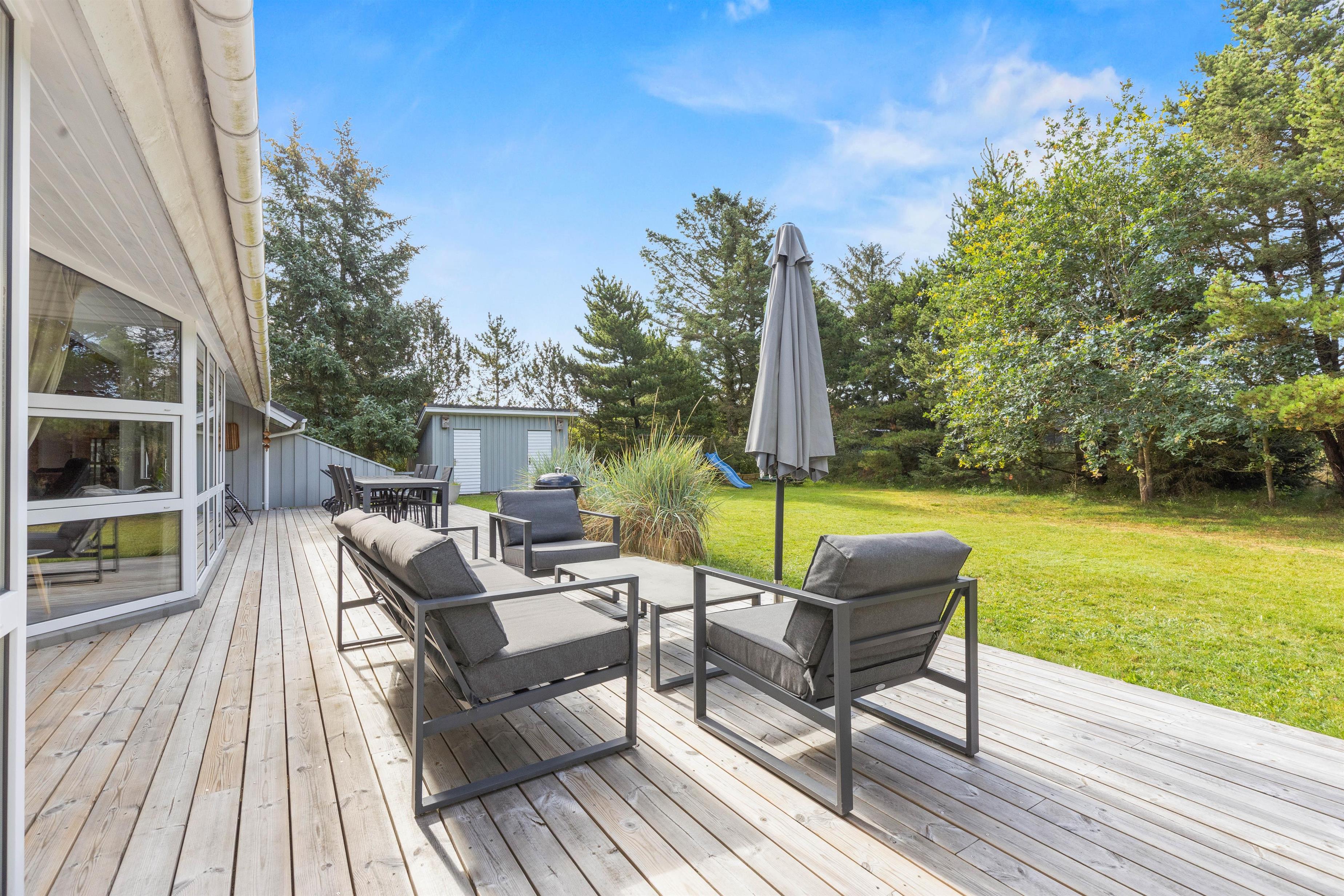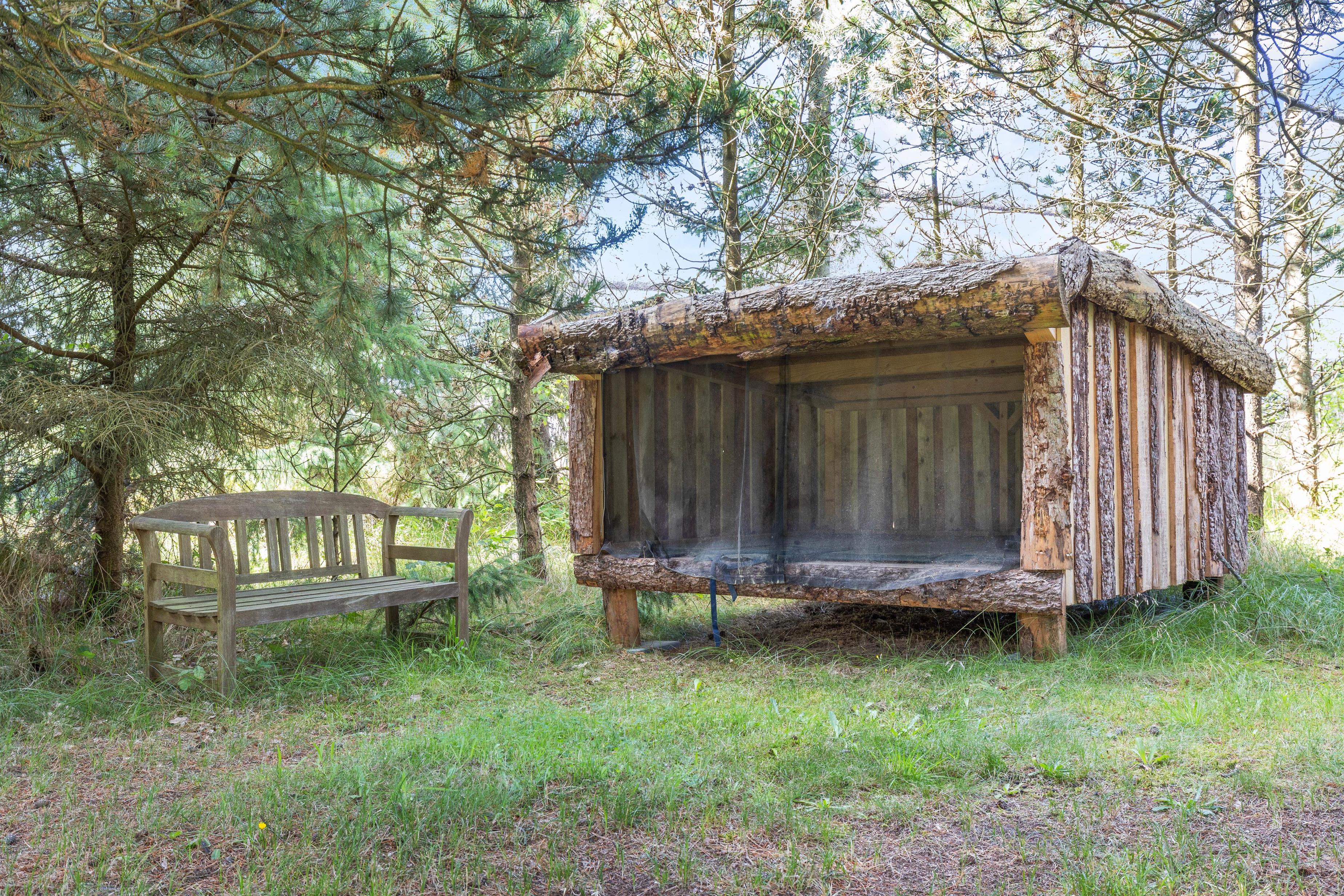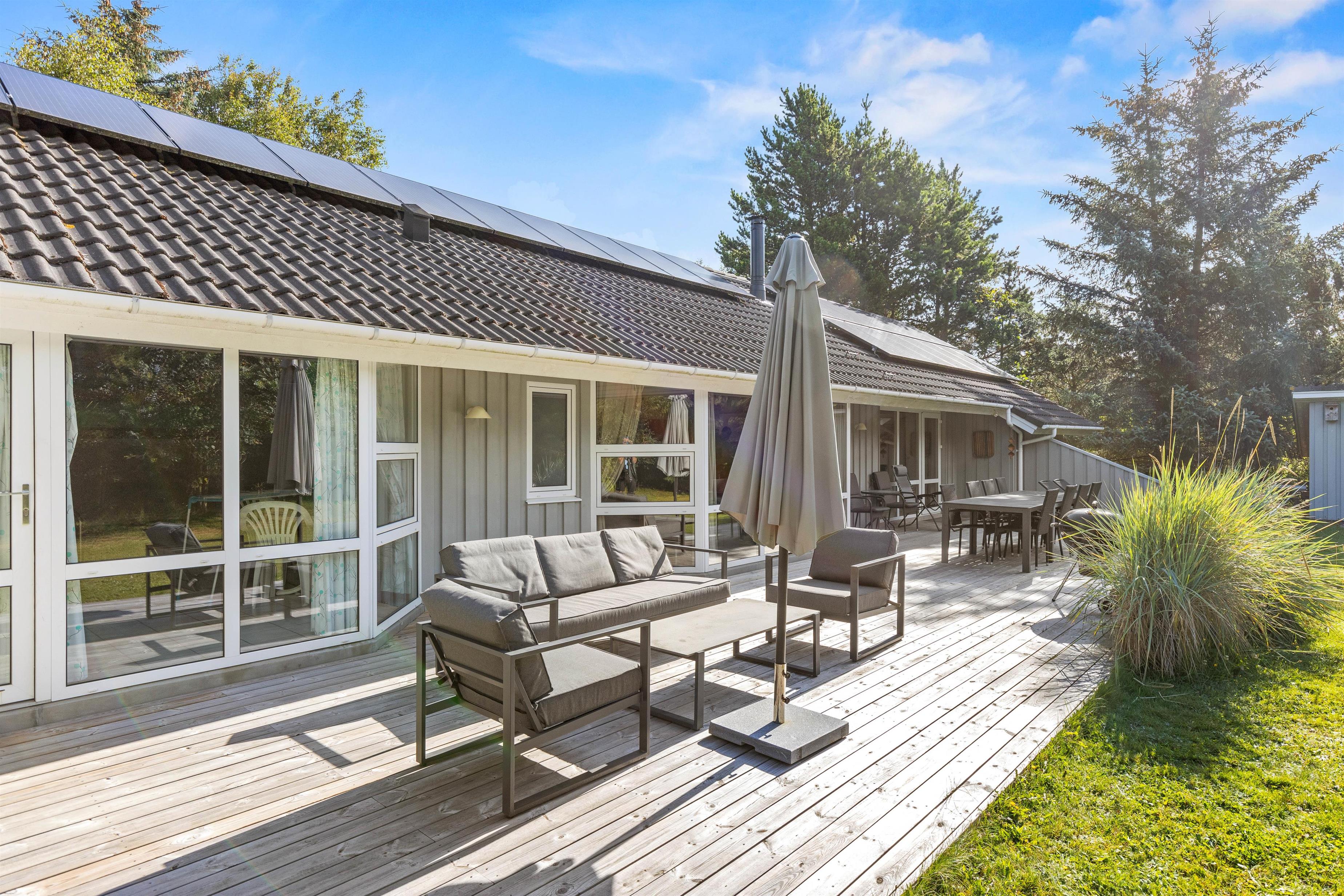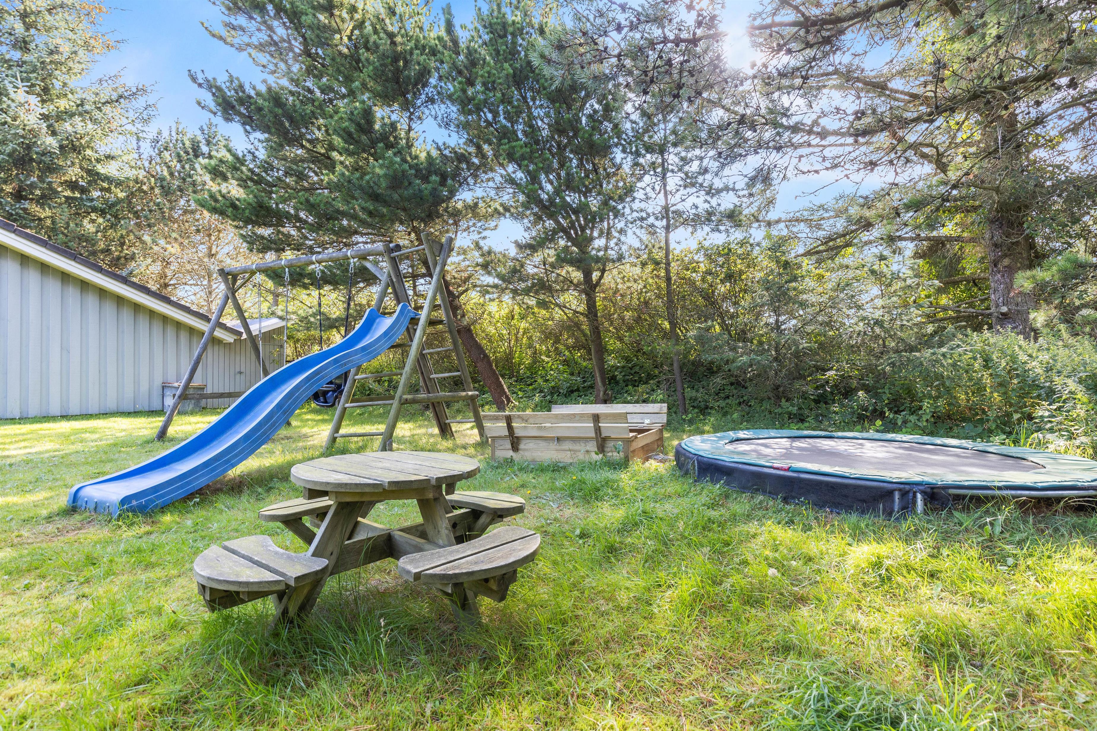 Den store træterrasse strækker sig over næsten hele feriehusets sydside. Der er flere sæt komfortable havemøbler til rådighed, så alle kan gøre sig det behageligt og slappe af med en god bog. Der er også tænkt på de yngre gæster - både et bænkesæt, sandkasse, klatrestativ med rutsjebane og trampolin er klar til børnene. På græsplæne er der også plads til leg, tummel og boldspil. Tænd op i grillen, og slut dagen af med et lækkert grillmåltid sammen. Og hvis I vil prøve noget nyt natten over, så sov en nat i shelter, dette vil børnene huske i langt ud i fremtiden.