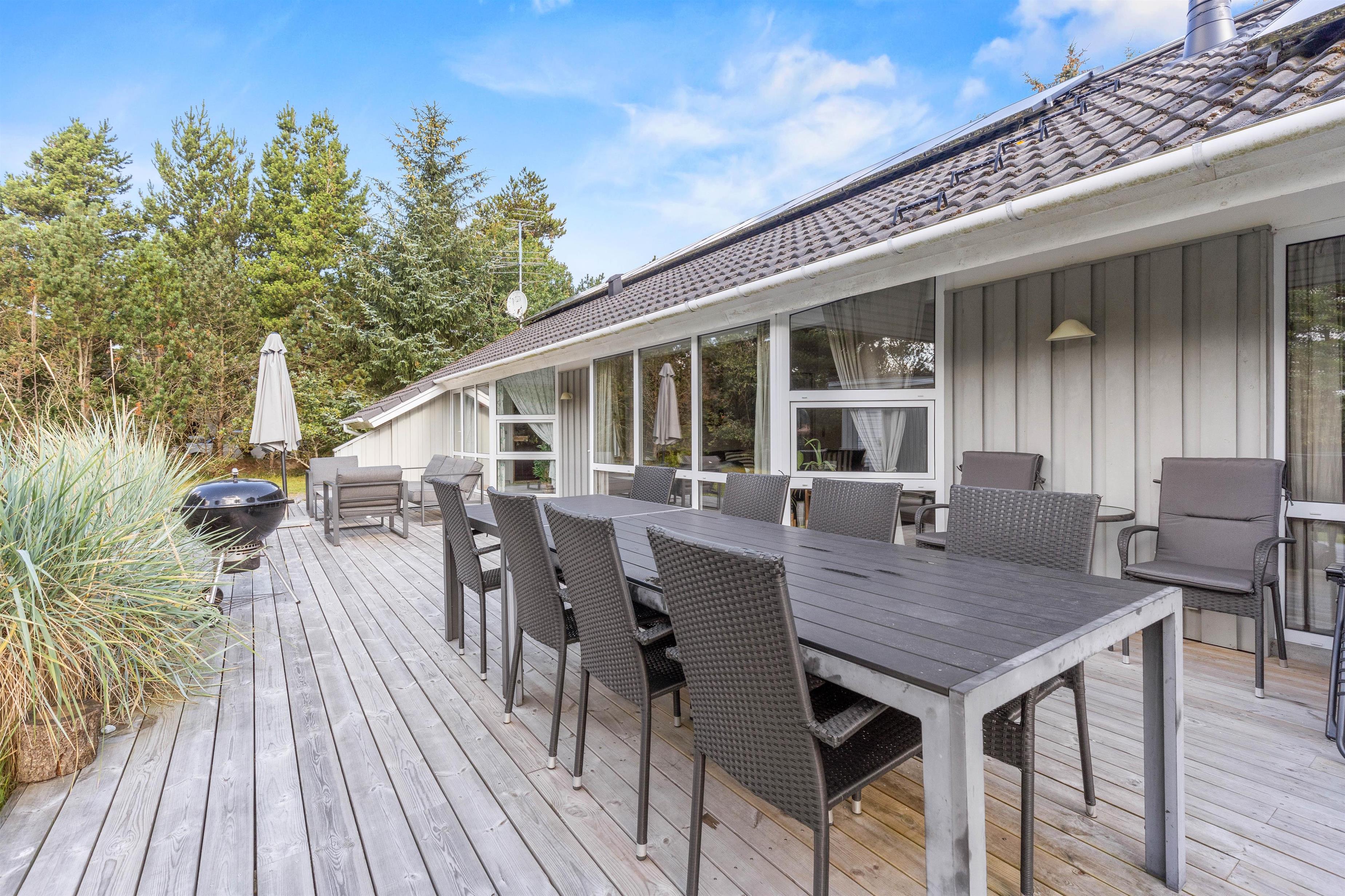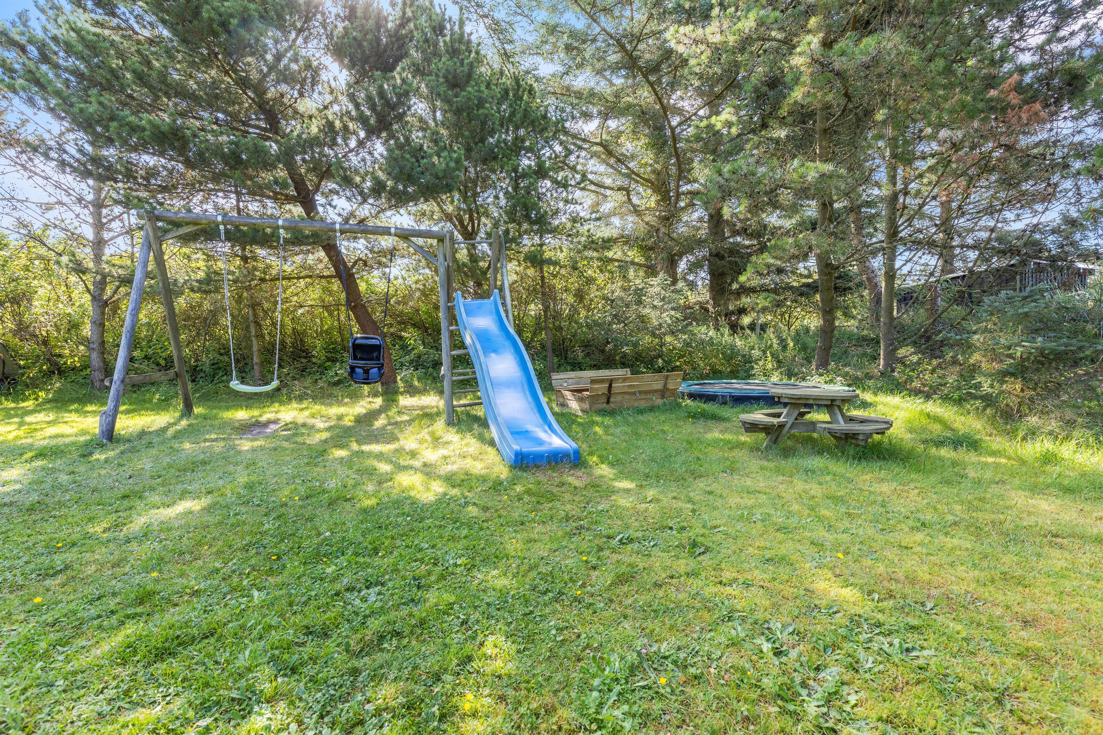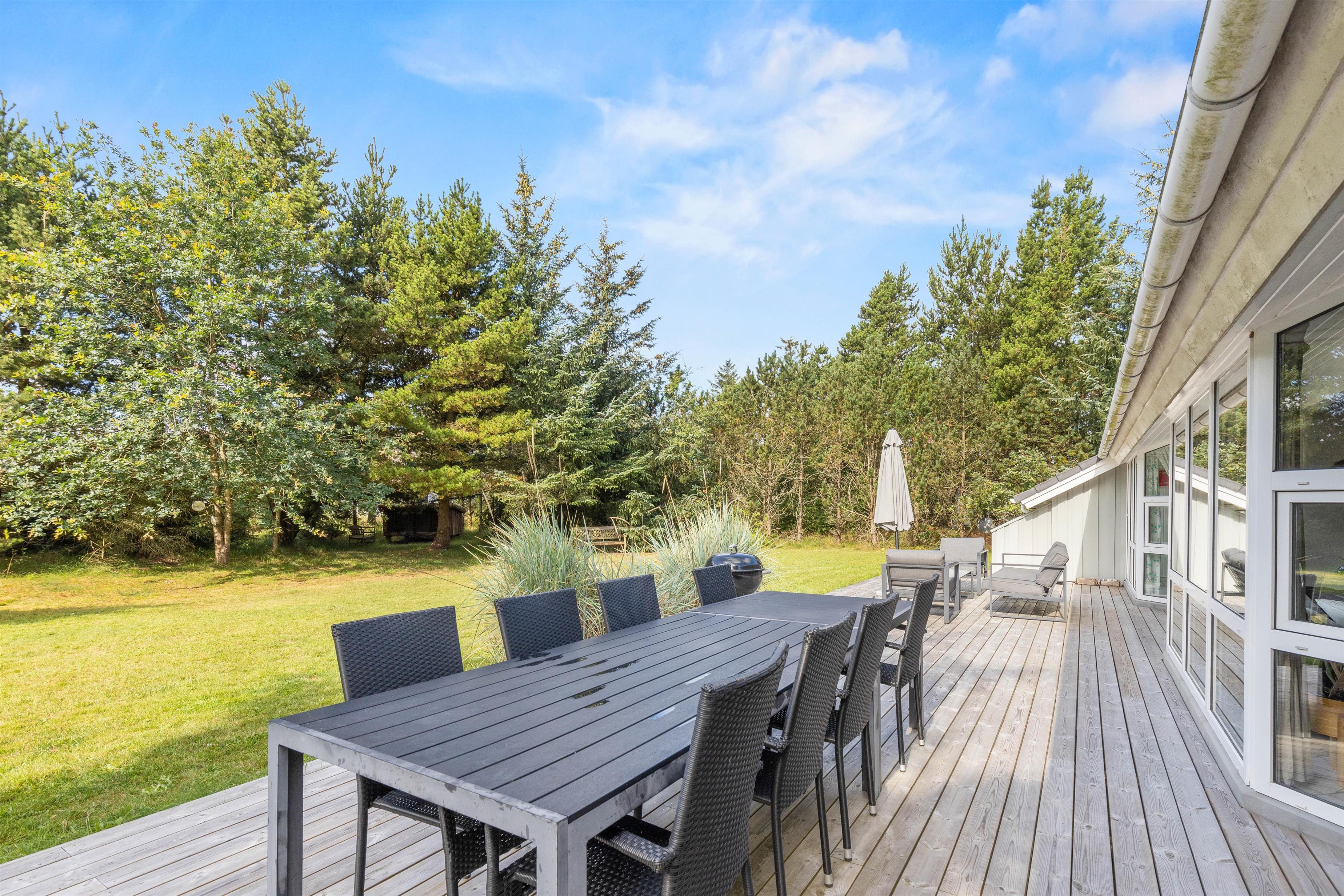 Den store træterrasse strækker sig over næsten hele feriehusets sydside. Der er flere sæt komfortable havemøbler til rådighed, så alle kan gøre sig det behageligt og slappe af med en god bog. Der er også tænkt på de yngre gæster - både et bænkesæt, sandkasse, klatrestativ med rutsjebane og trampolin er klar til børnene. På græsplæne er der også plads til leg, tummel og boldspil. Tænd op i grillen, og slut dagen af med et lækkert grillmåltid sammen. Og hvis I vil prøve noget nyt natten over, så sov en nat i shelter, dette vil børnene huske i langt ud i fremtiden.
