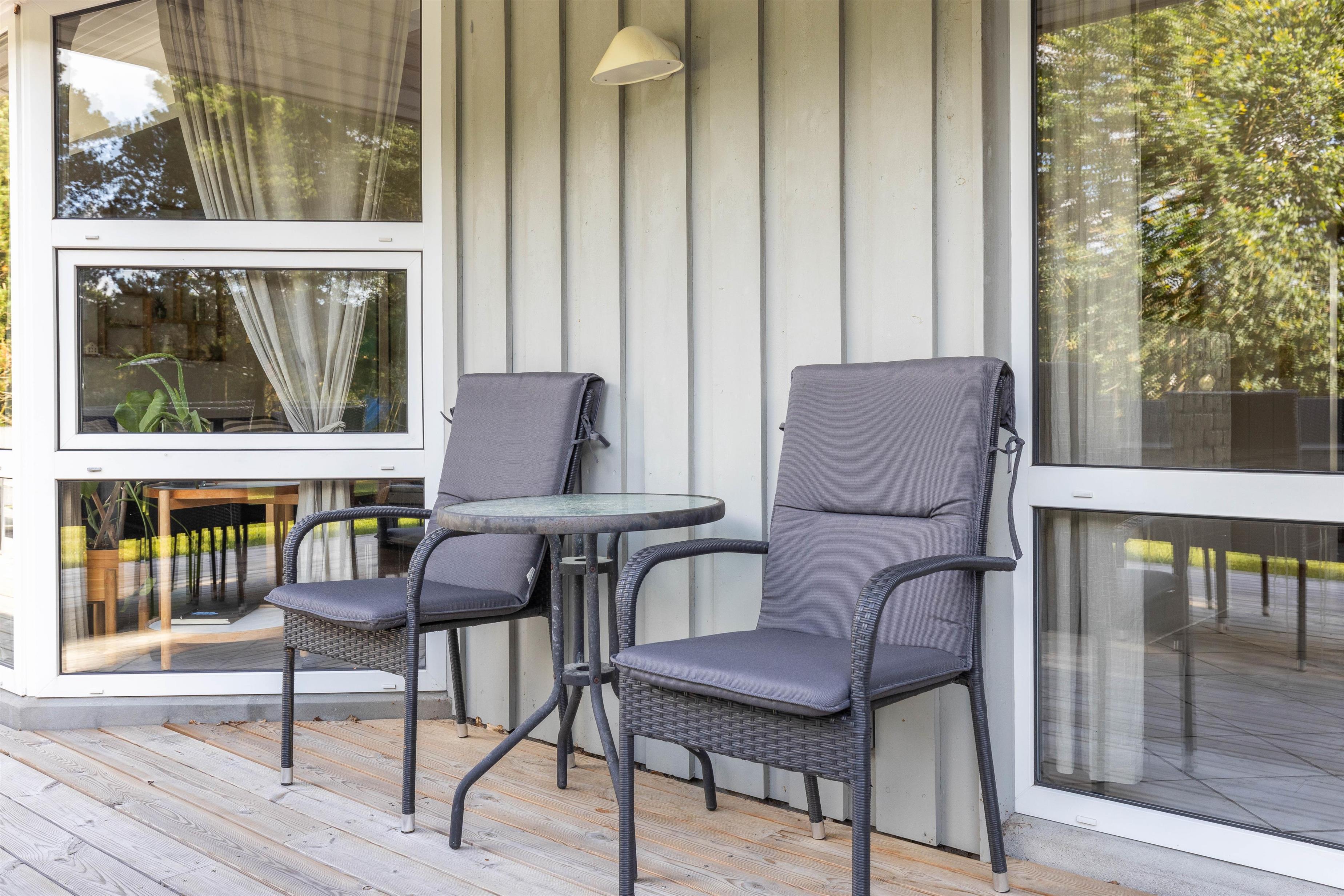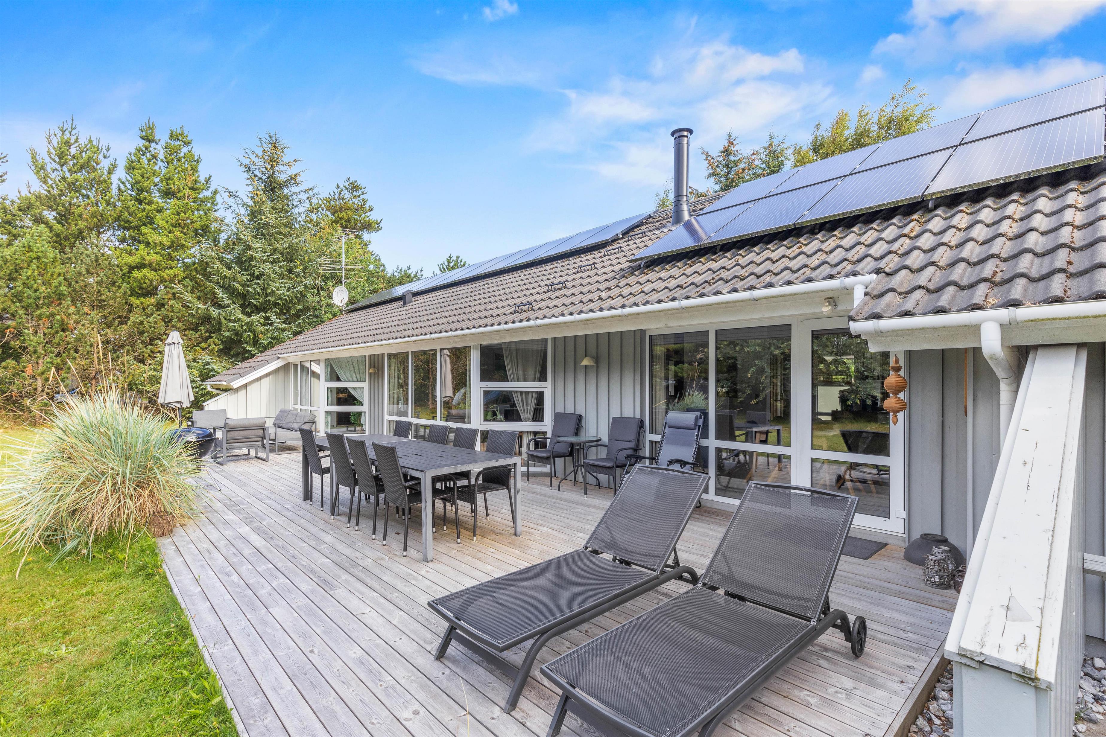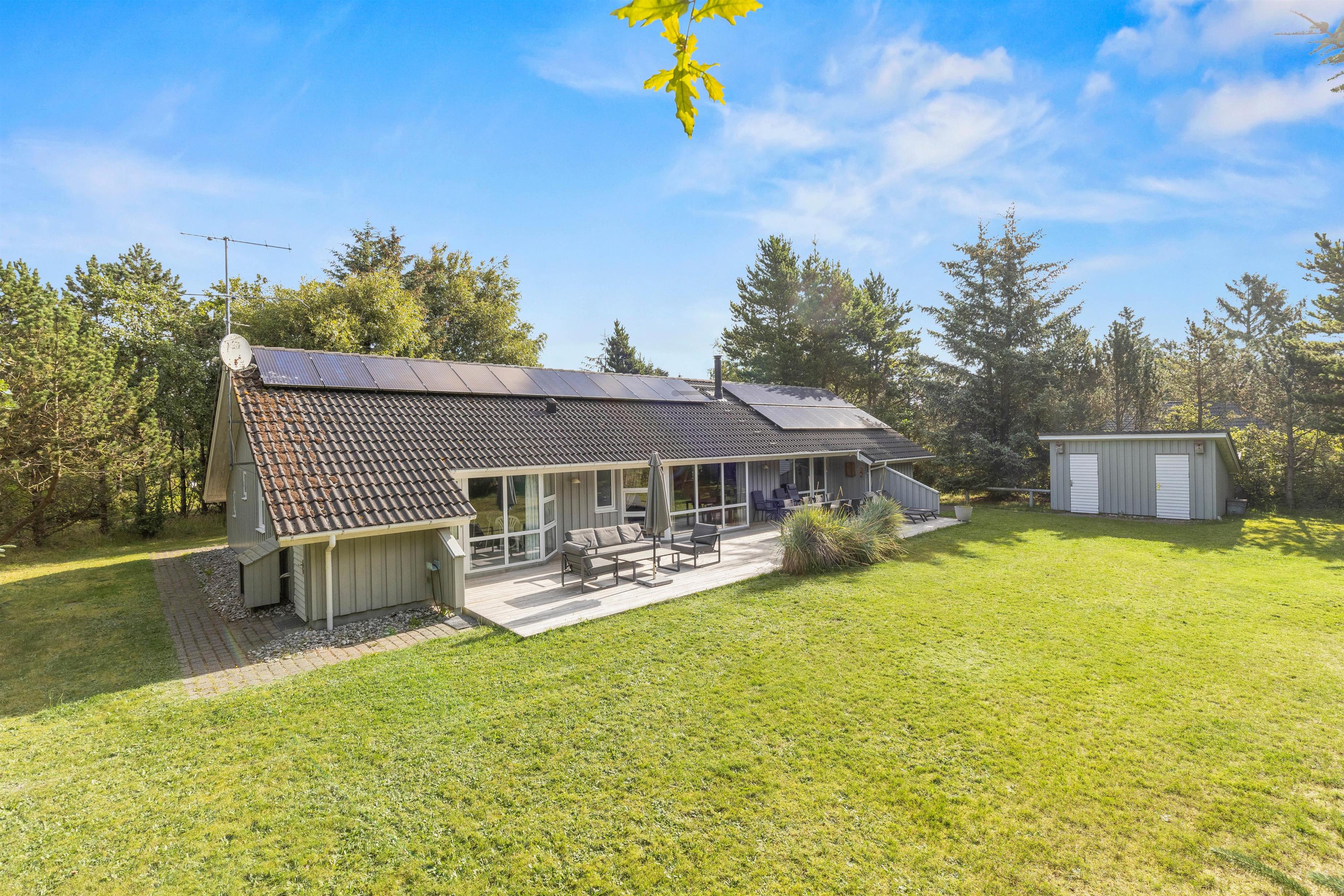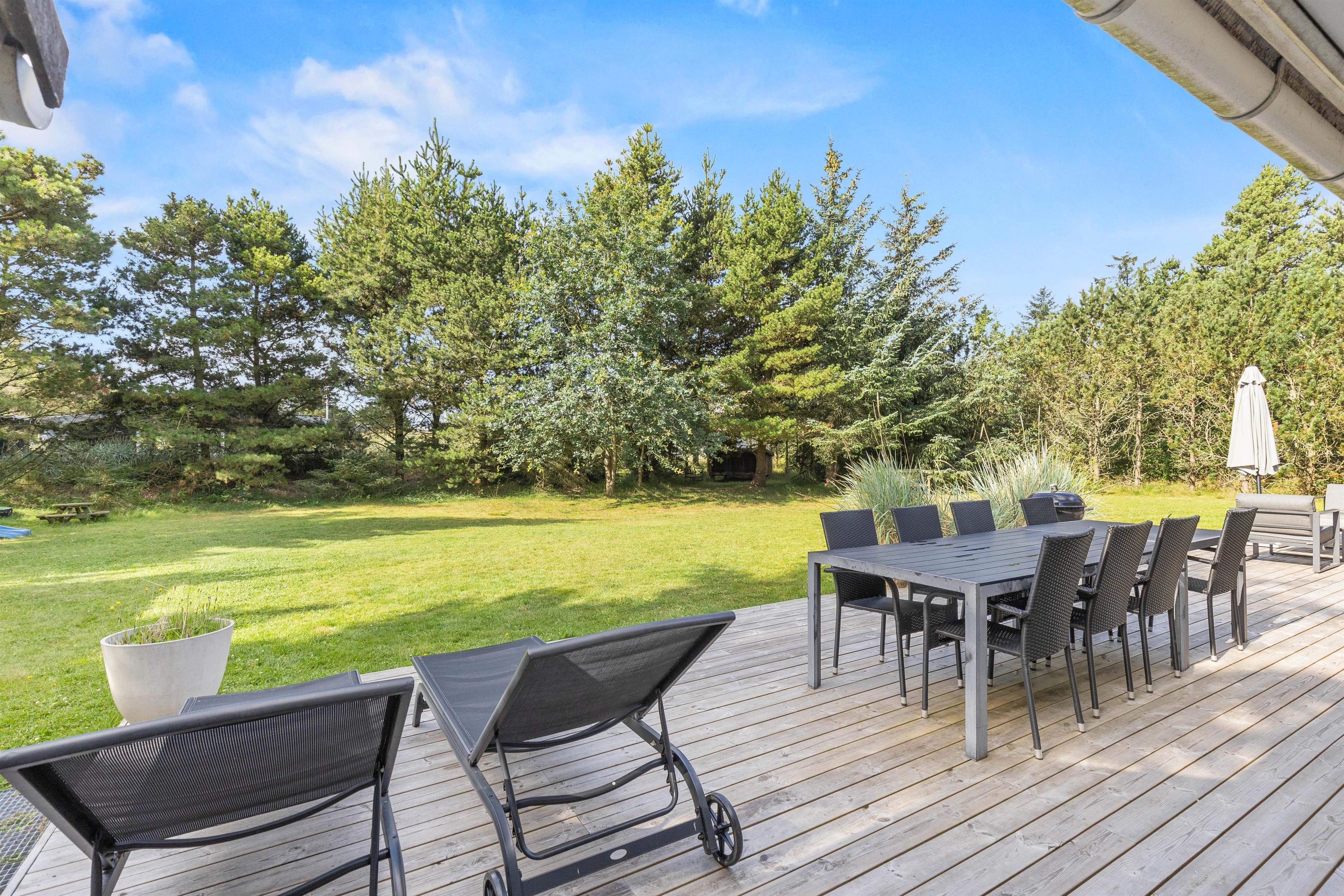 Den store træterrasse strækker sig over næsten hele feriehusets sydside. Der er flere sæt komfortable havemøbler til rådighed, så alle kan gøre sig det behageligt og slappe af med en god bog. Der er også tænkt på de yngre gæster - både et bænkesæt, sandkasse, klatrestativ med rutsjebane og trampolin er klar til børnene. På græsplæne er der også plads til leg, tummel og boldspil. Tænd op i grillen, og slut dagen af med et lækkert grillmåltid sammen. Og hvis I vil prøve noget nyt natten over, så sov en nat i shelter, dette vil børnene huske i langt ud i fremtiden.