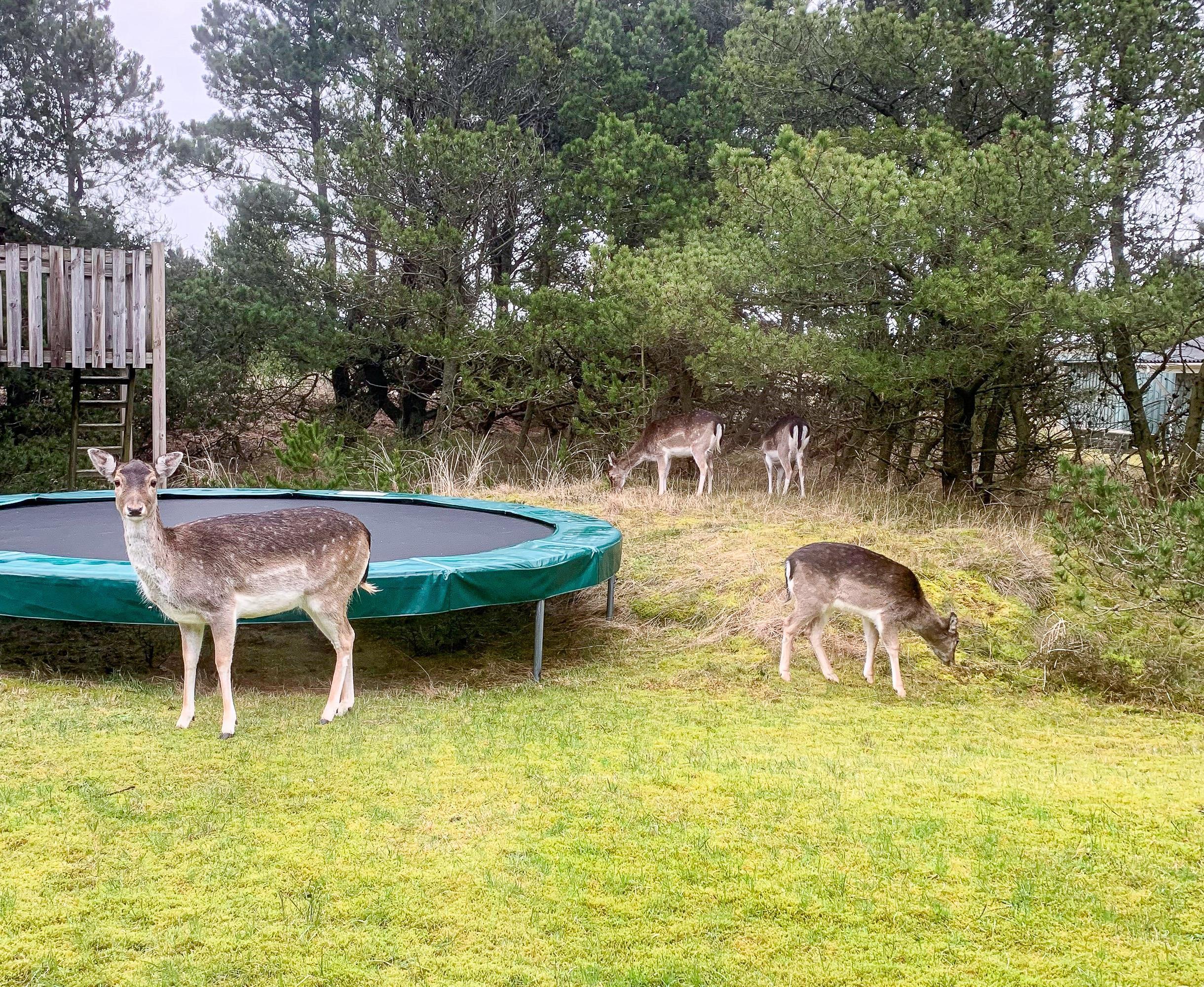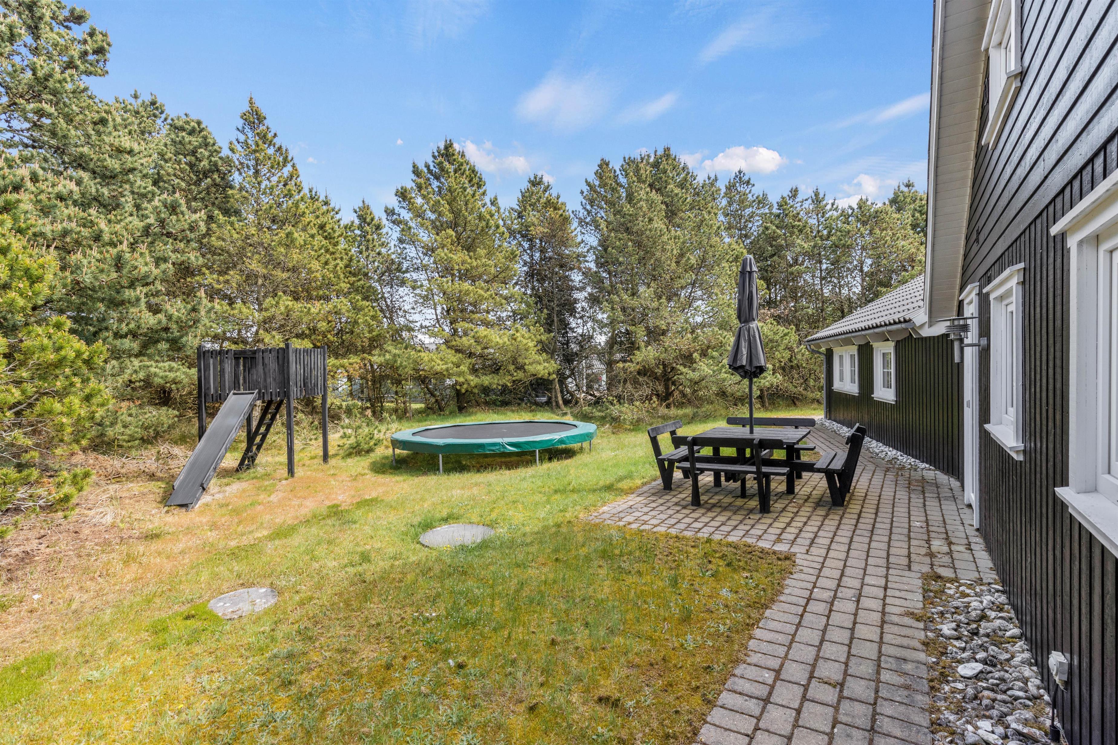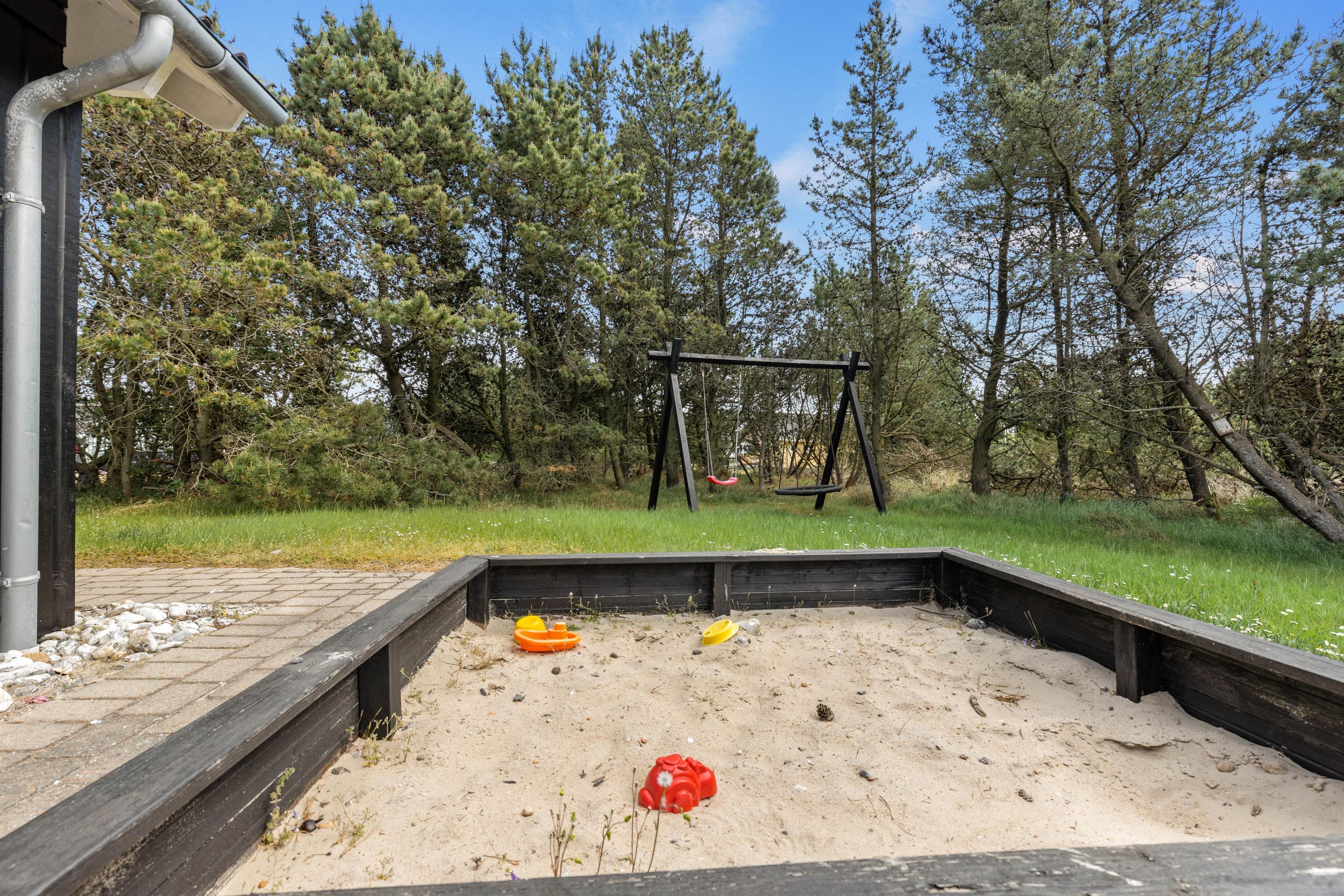 Den velholdte græsplæne går hele vejen rundt om sommerhuset og er et paradis for alle. Her er gyngestativ, 3 hængekøjer, sandkasse, rutsjebane, fodboldmål og trampolin, så ingen kommer til at kede sig på ferien. Desuden er der et cykelskur, hvor I kan parkere jeres medbragte cykler.
