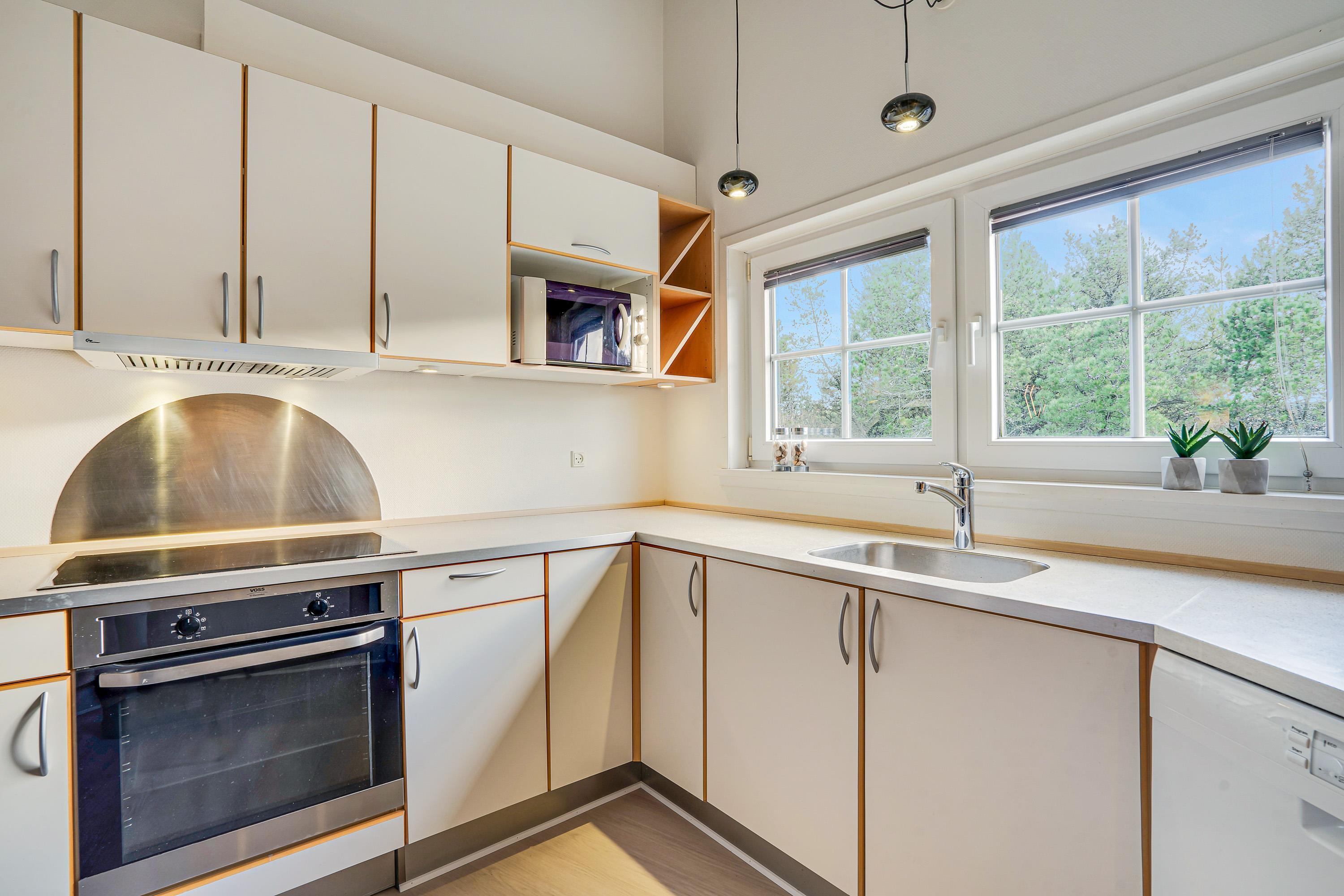 Køkkenet er udstyret med amerikanerkøleskab med isterningemaskine samt en opvaskemaskine, som sammen med vaskemaskinen og tørretumbleren sørger for, at de praktiske opgaver hurtigt er overståede.