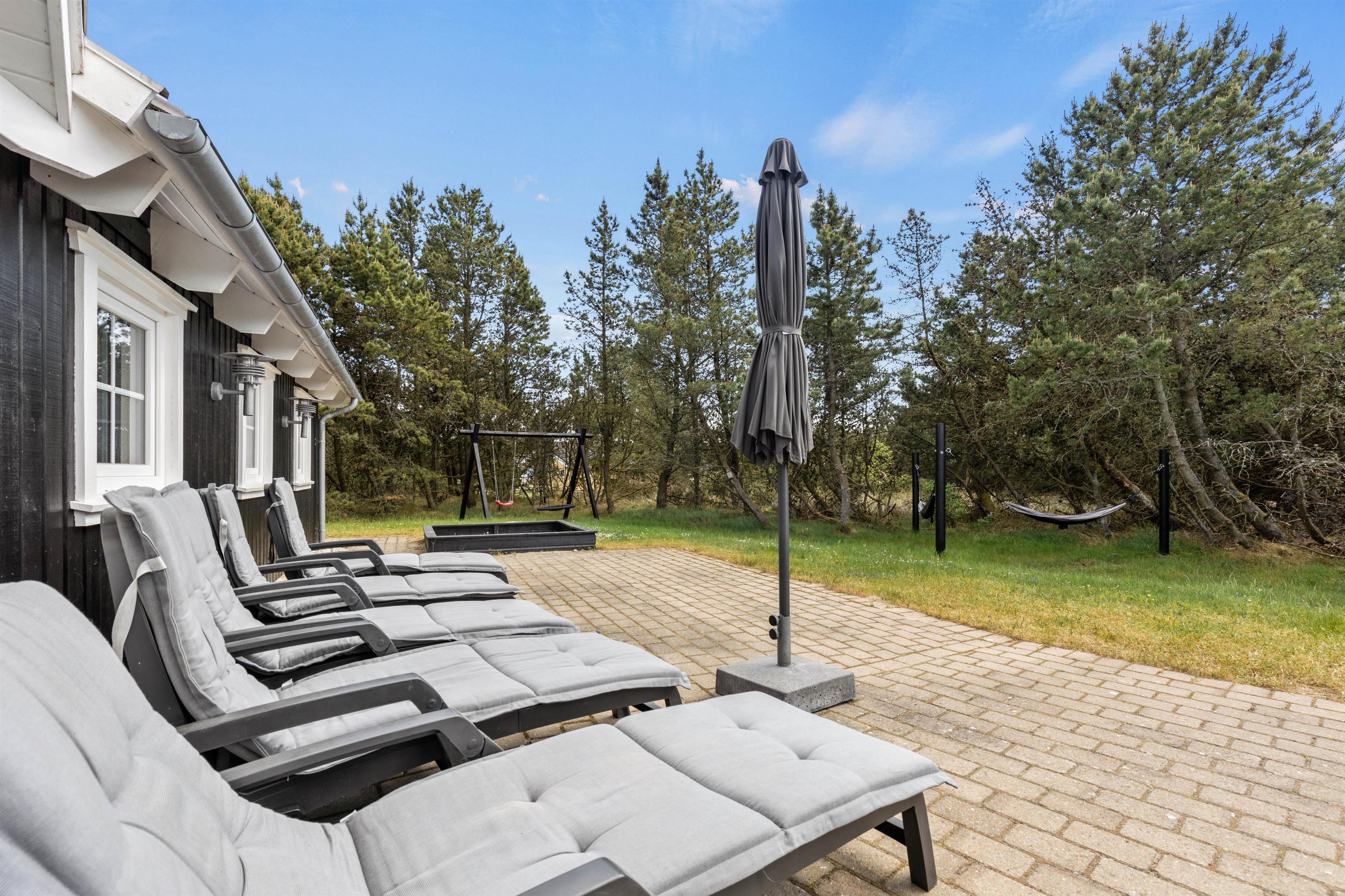 På den store terrasse finder alle gæster en plads i solen, og der er havemøbler til alle – naturligvis suppleret med liggestole og grill.