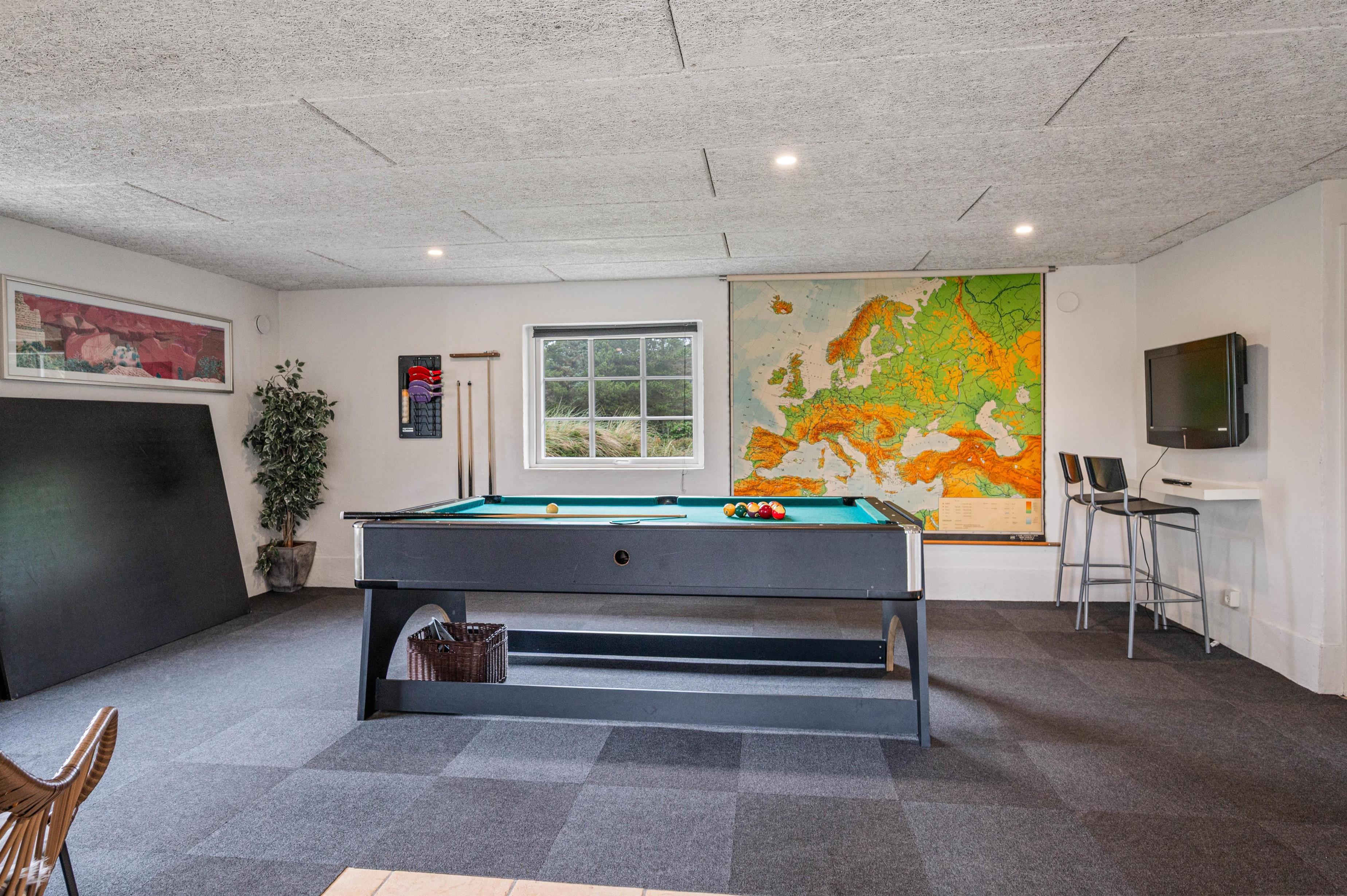 I 4 af de 5 soverum er der dobbeltsenge, og i det 5. soverum, som må betegnes som et hyggeligt lille kammer, er der en trekvartseng. Her vil især jeres børn elske at sove under de skrå vægge.