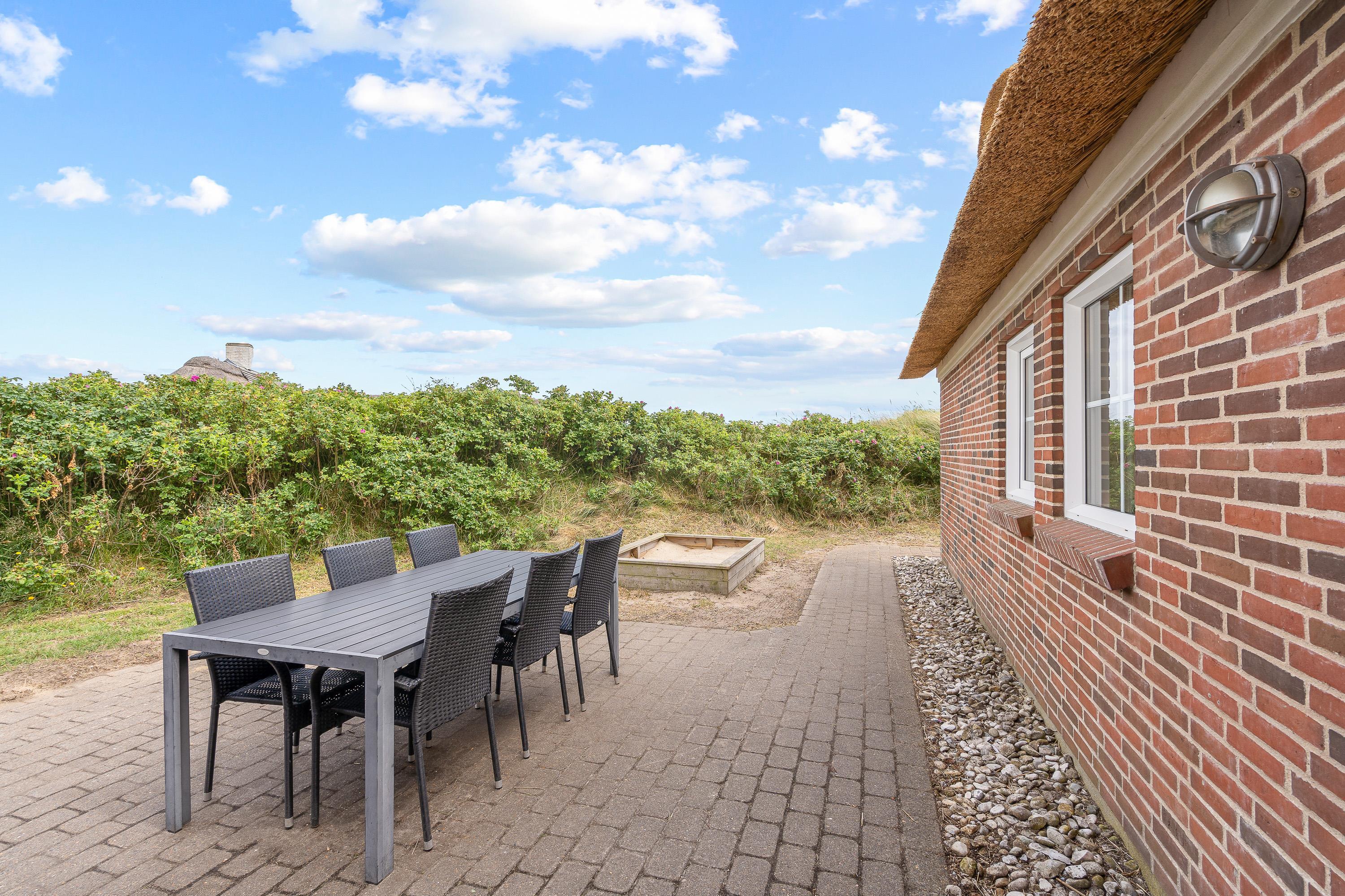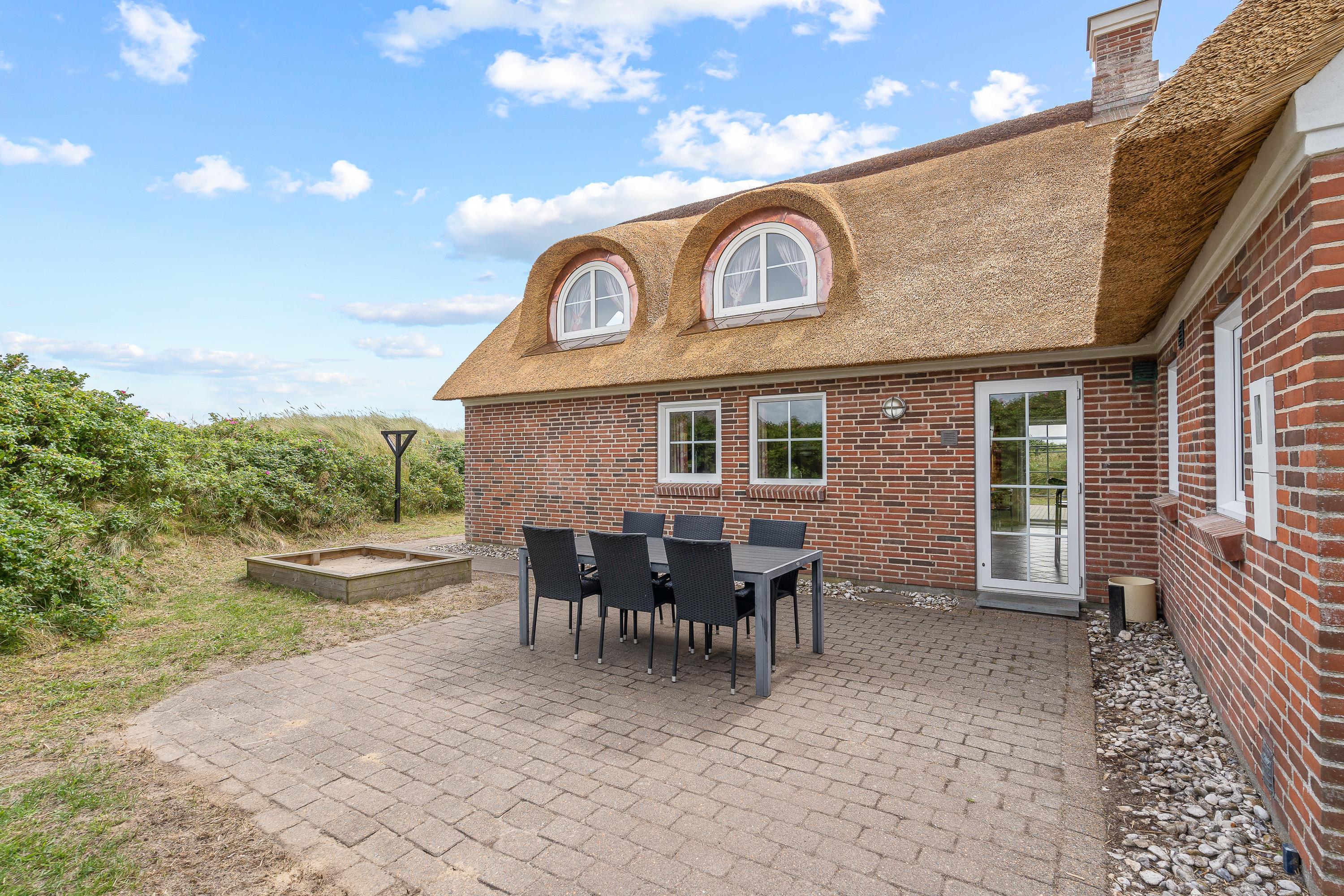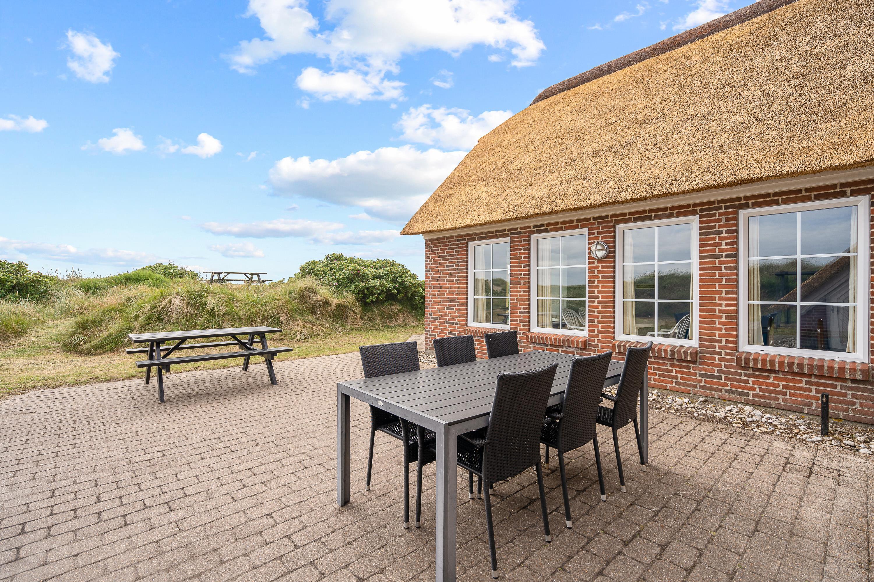Udendørs venter jer hele 2 åbne terrasser, som I kan nyde de solrige feriedage på. De 2 terrasser er forbundet af en sti, der løber omkring sommerhuset, og på terrasserne står havemøbler klar til jer, som I kan finde jer til rette i, mens I slapper af i solen til lyden af bølgernes brusen i baggrunden.