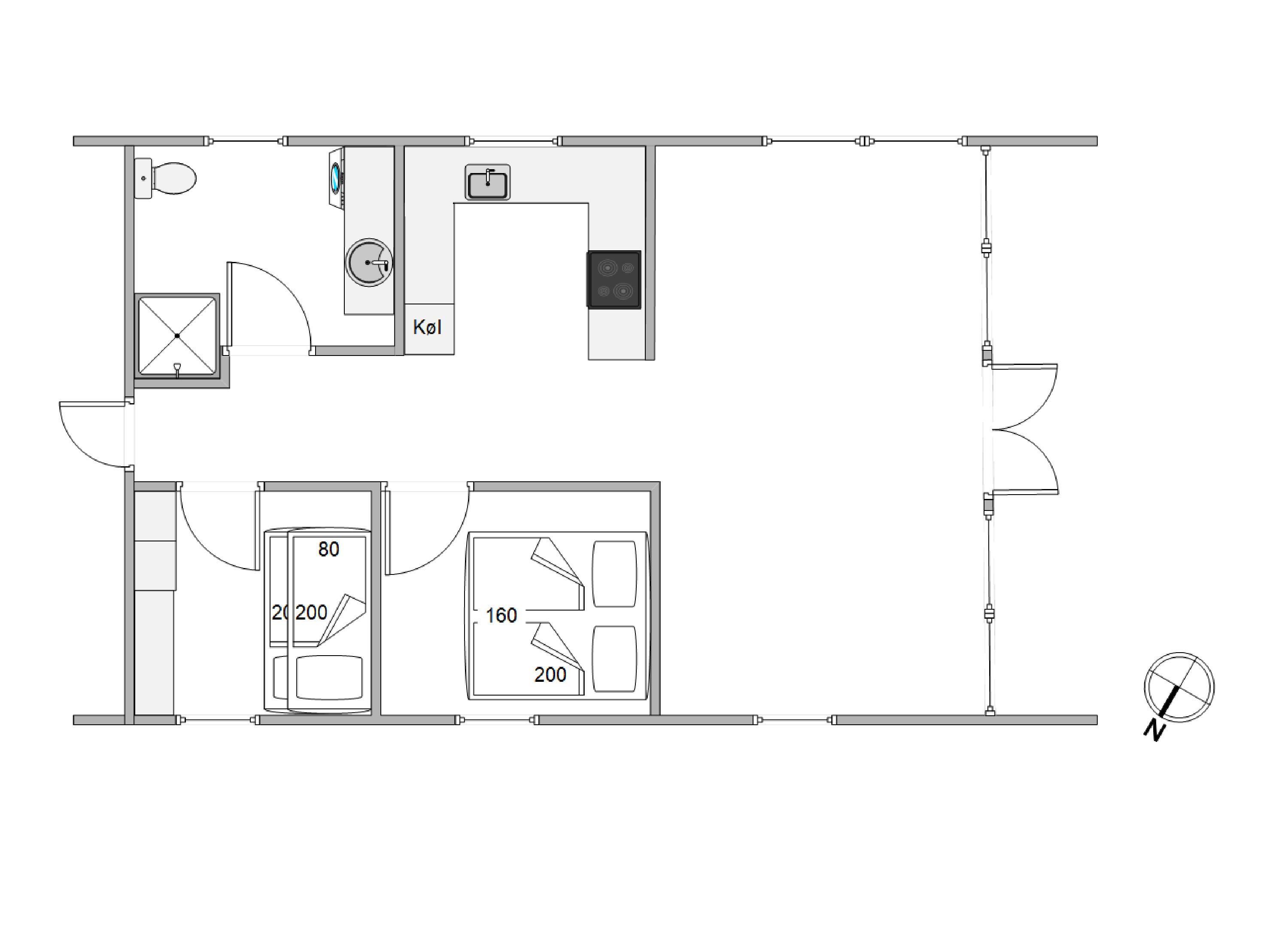 Foruden alrummet finder I på sommerhusets 50 kvadratmeter også 2 soveværelser, der er indrettet med henholdsvis en dobbeltseng og en etageseng. Derudover er der et badeværelse med gulvvarme i feriehuset.