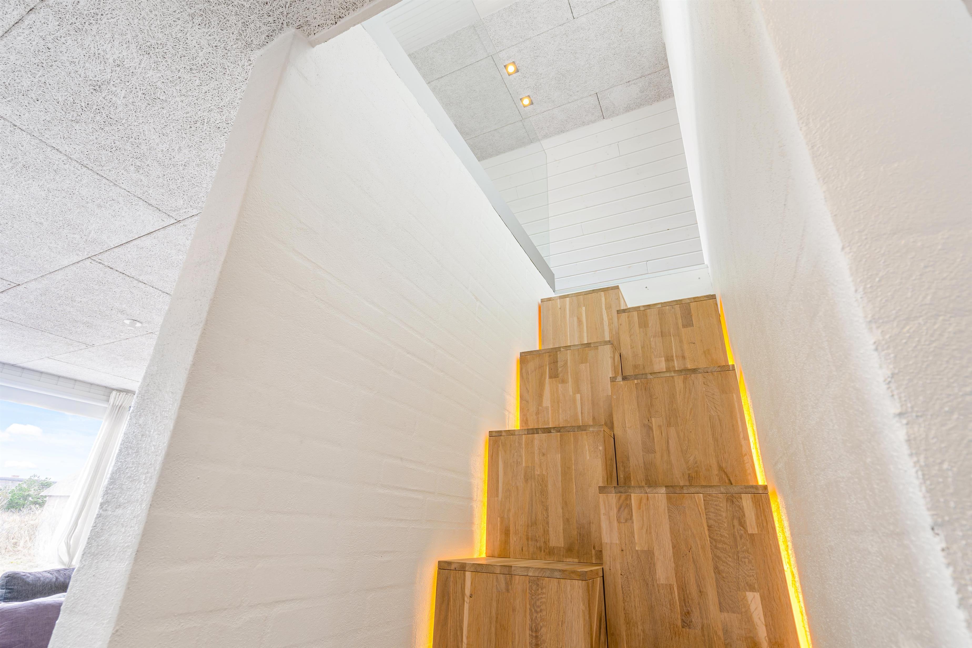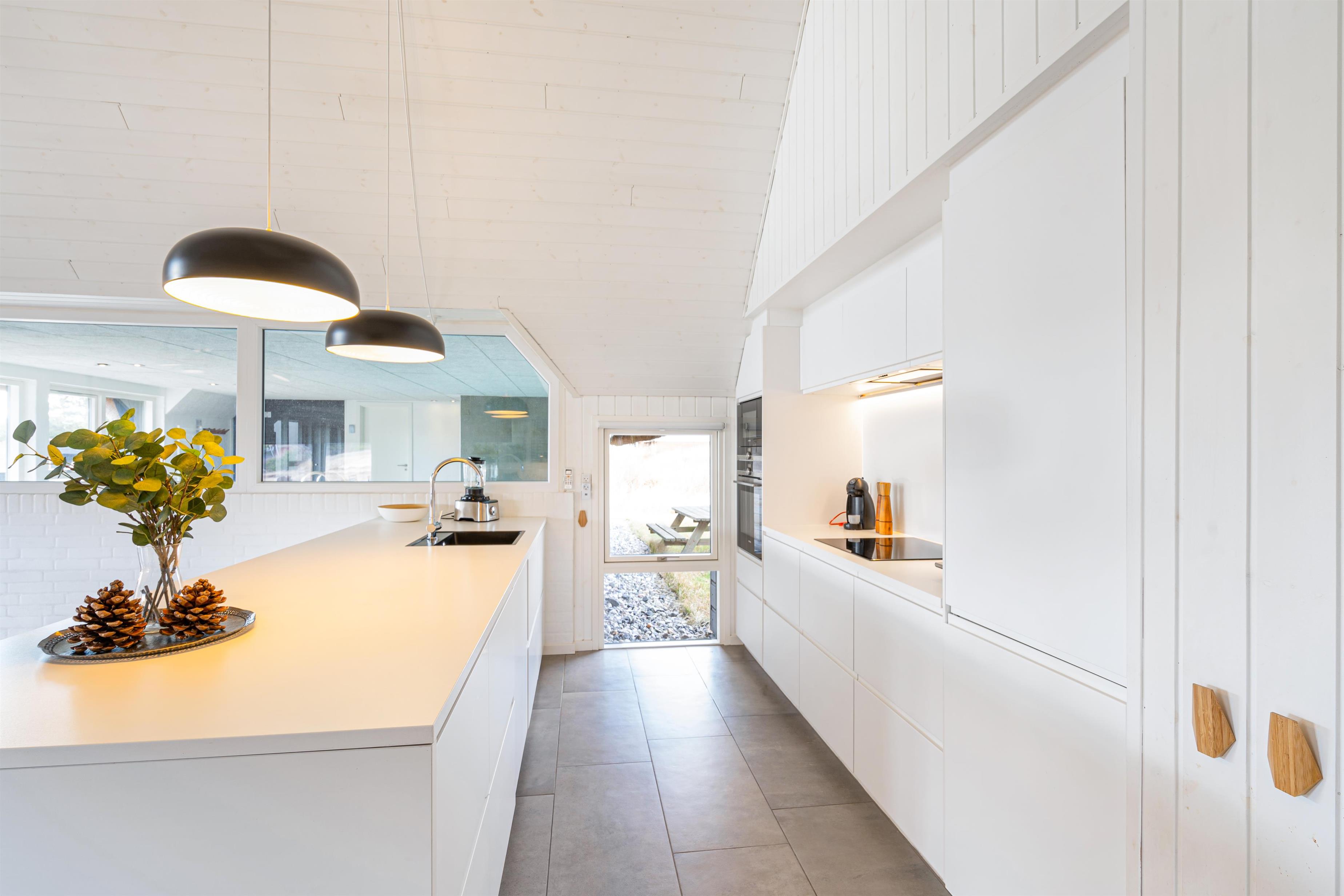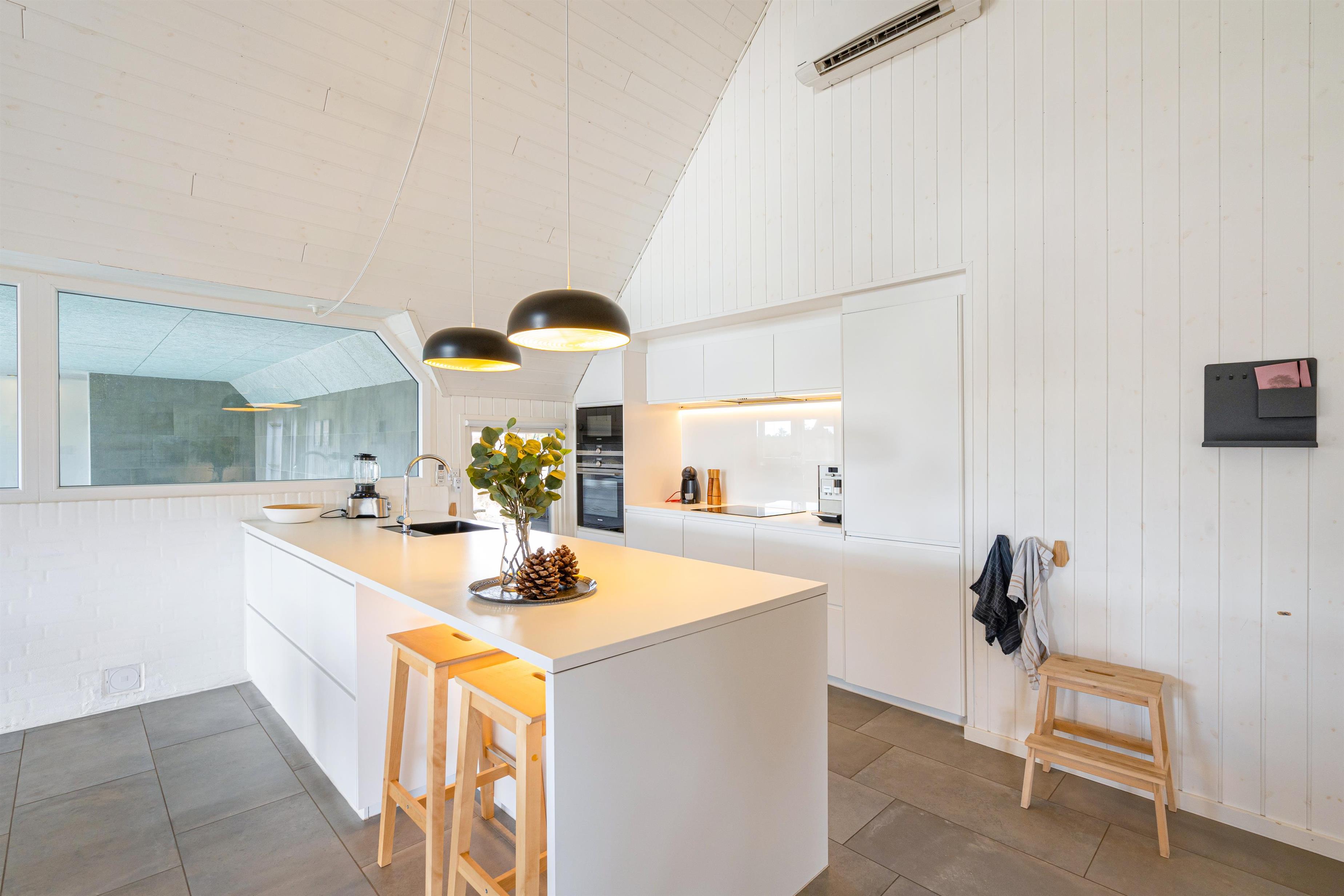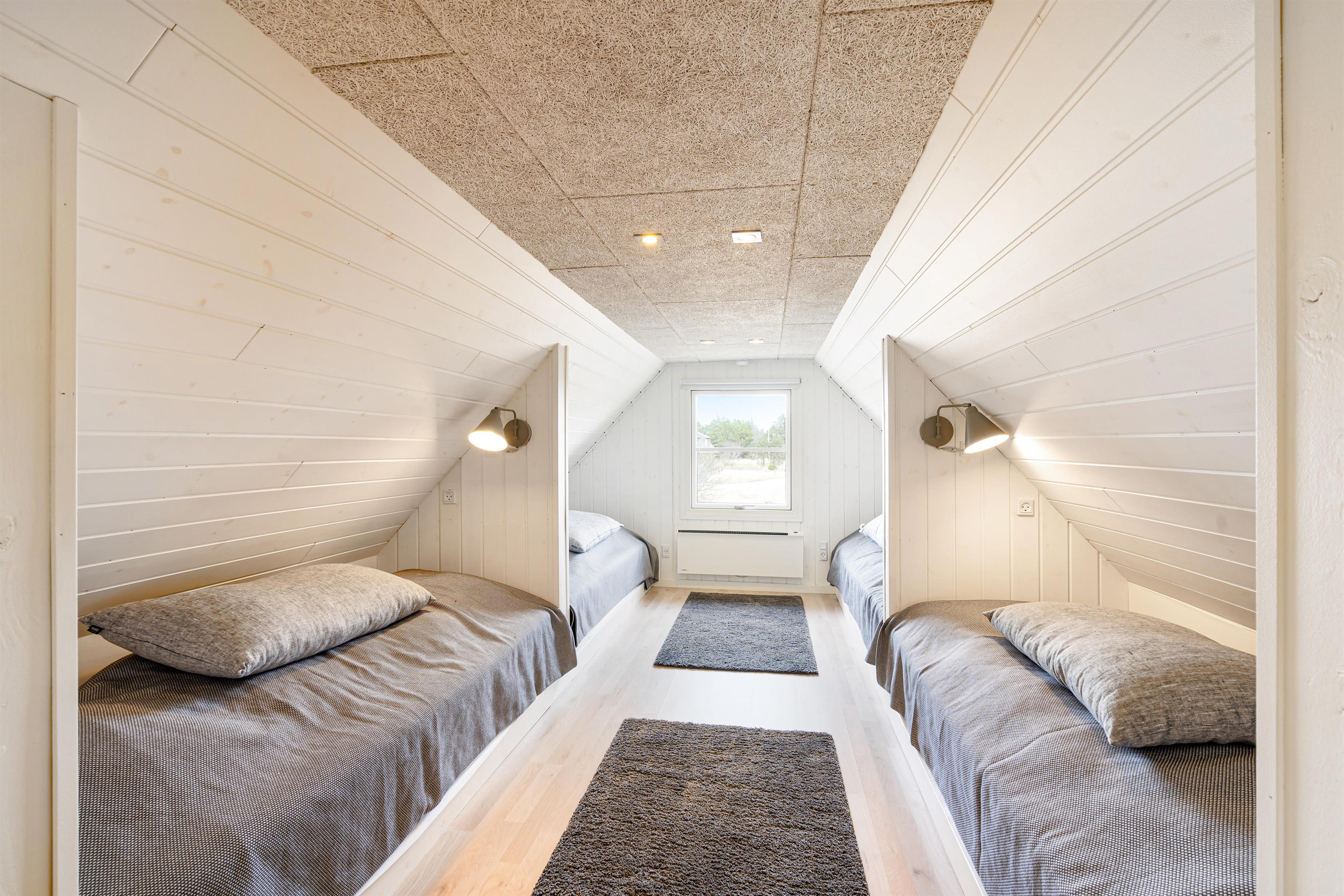Det flotte, åbne køkkenalrum lægger op til mange timers samvær med gode snakke over køkkenets barområde – måske med et koldt glas hvidvin direkte fra vinkøleren? Sommerhusets sovepladser fordeler sig på fire gode soveværelser, alle med dobbeltseng og eget fjernsyn, mens de sidste sovepladser er at finde på hemsen. Fra hemsen kan I desuden skimte havet, som ligger kun 400 meter væk.