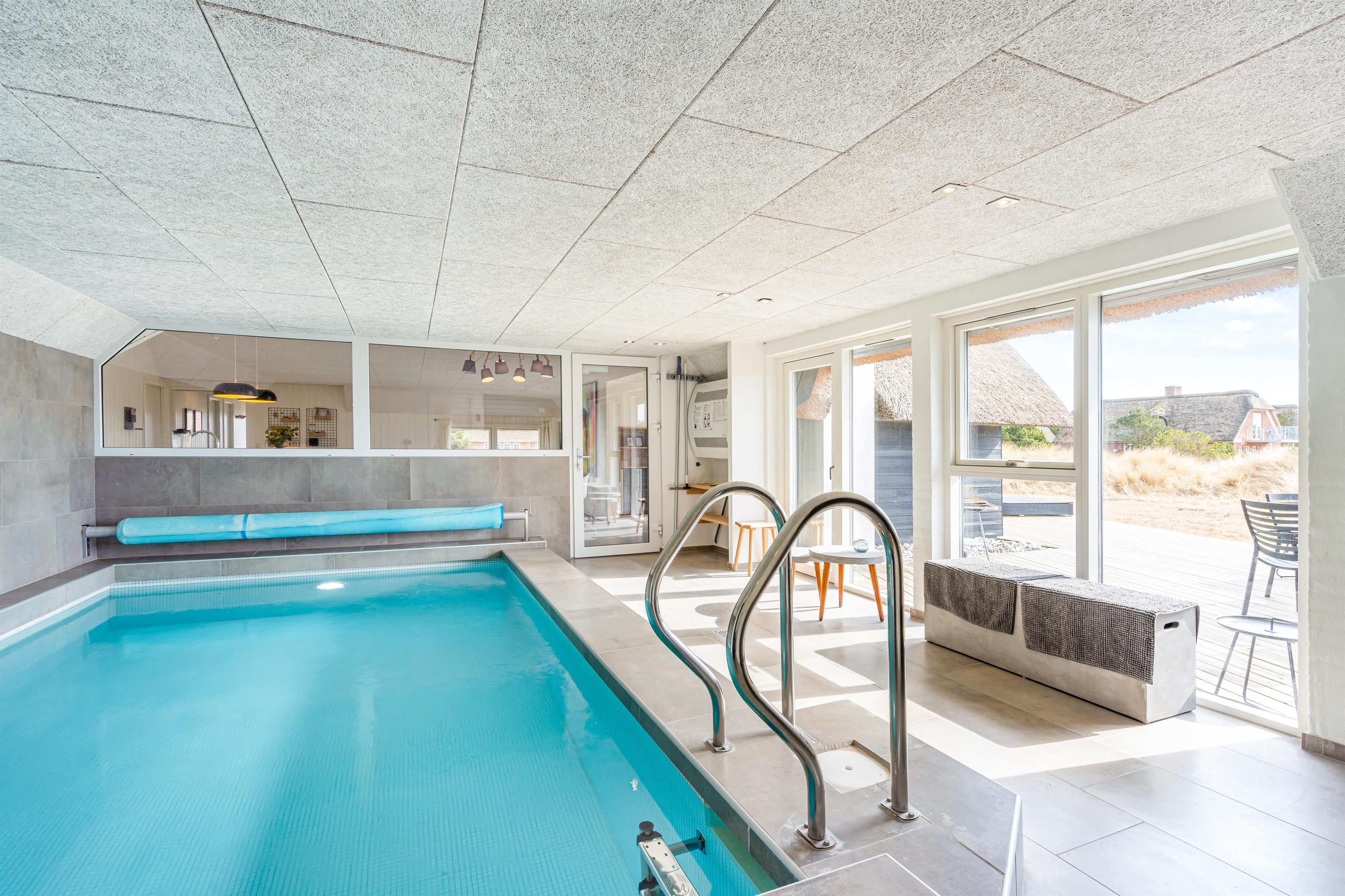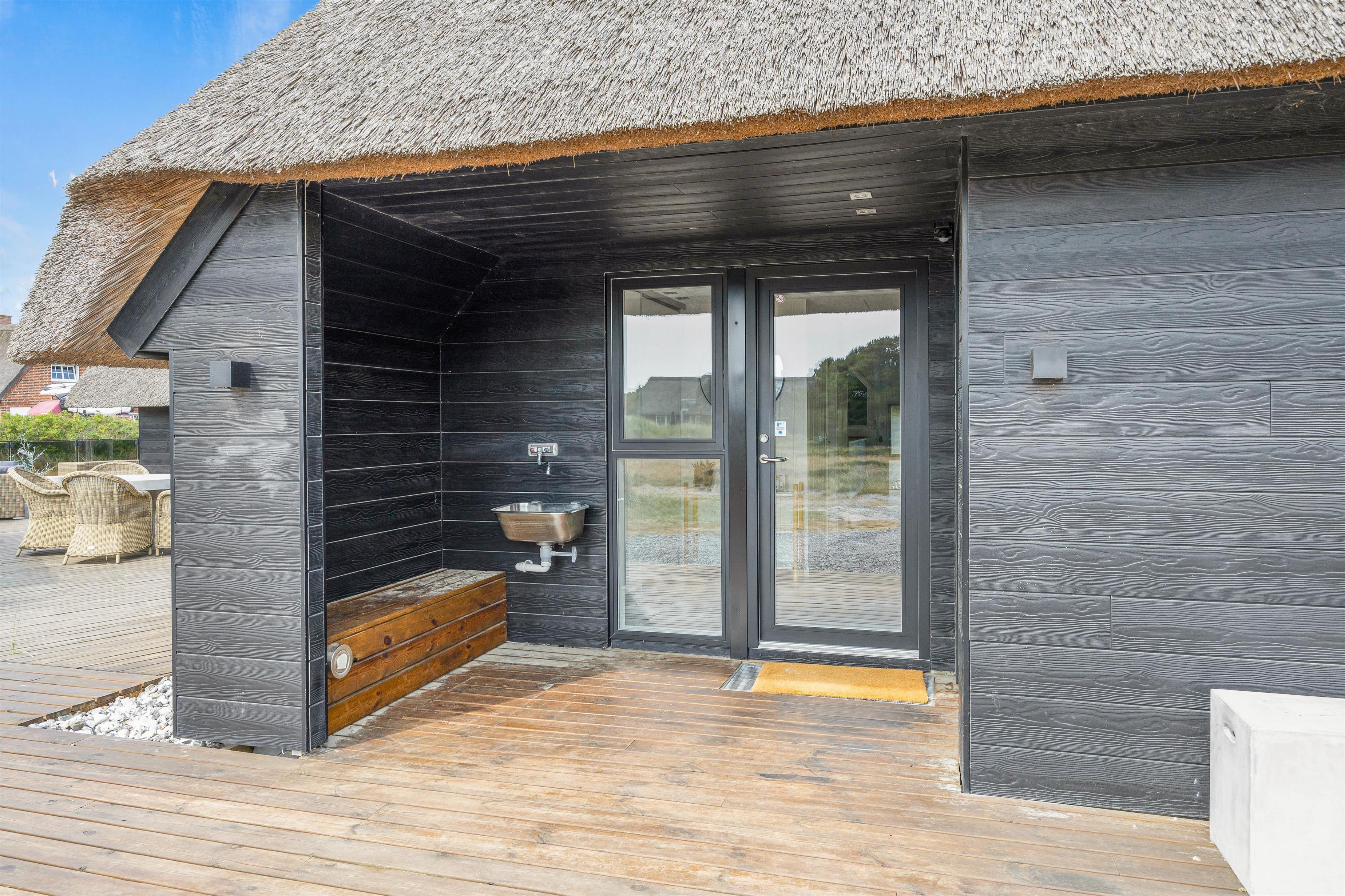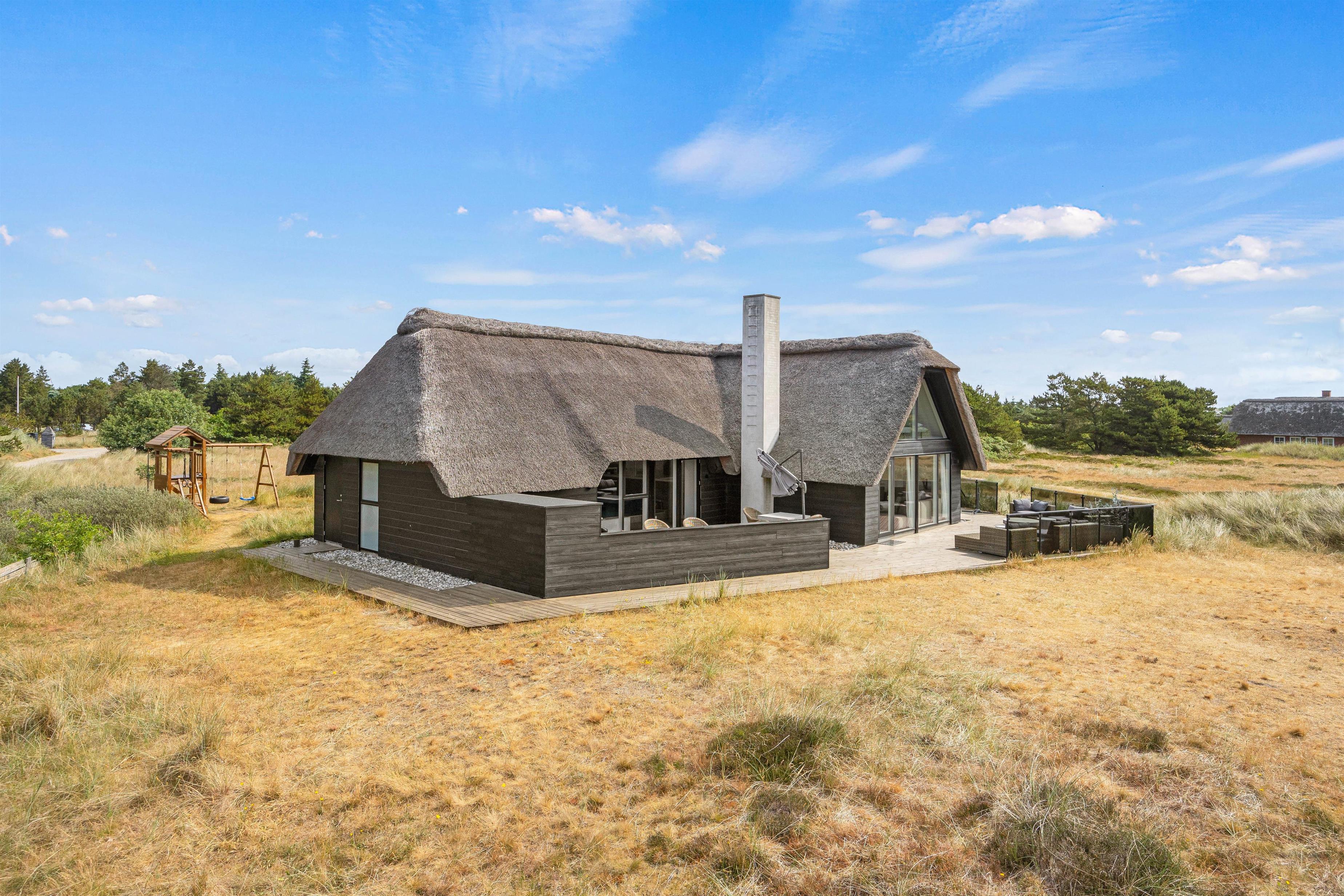 Dette stilfuld indrettede stråtækte poolhus har plads til helt op til 10 feriegæster, og hunden er også velkommen. Feriehusets indre rummer blandt andet en lækker poolafdeling med både swimmingpool, sauna og dampbad samt et aktivitetsrum. Prikken over i’et er selvfølgelig husets fantastiske beliggenhed kun fem minutters gang fra stranden og Blåvands centrum.