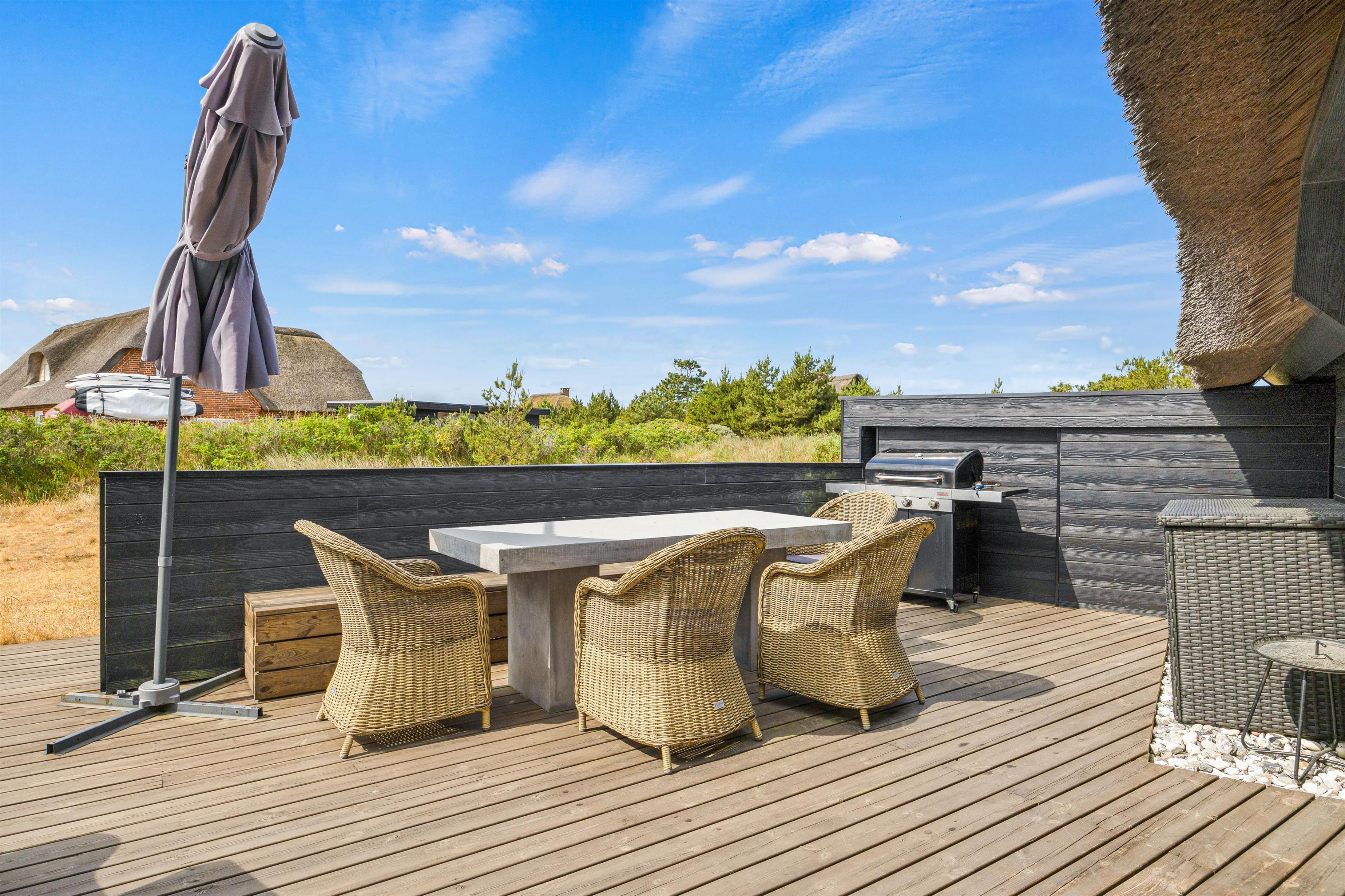 Fra både poolafdelingen og alrummet er der udgang til ferieboligens skønne terrasse. Her finder alle feriegæster hurtigt en plads i solen, og på terrassens afskærmede del sidder I altid i læ af vinden. Der er suppleret op med masser af havemøbler og liggestole, og på de lune sommeraftener er det oplagt at tænde op i gasgrillen.