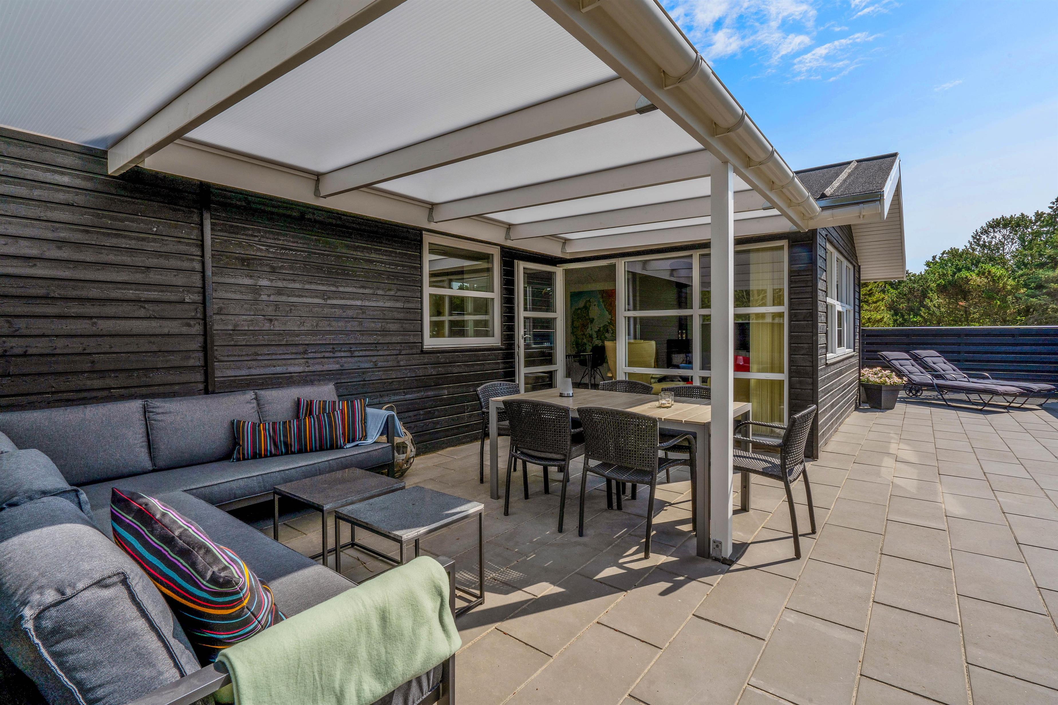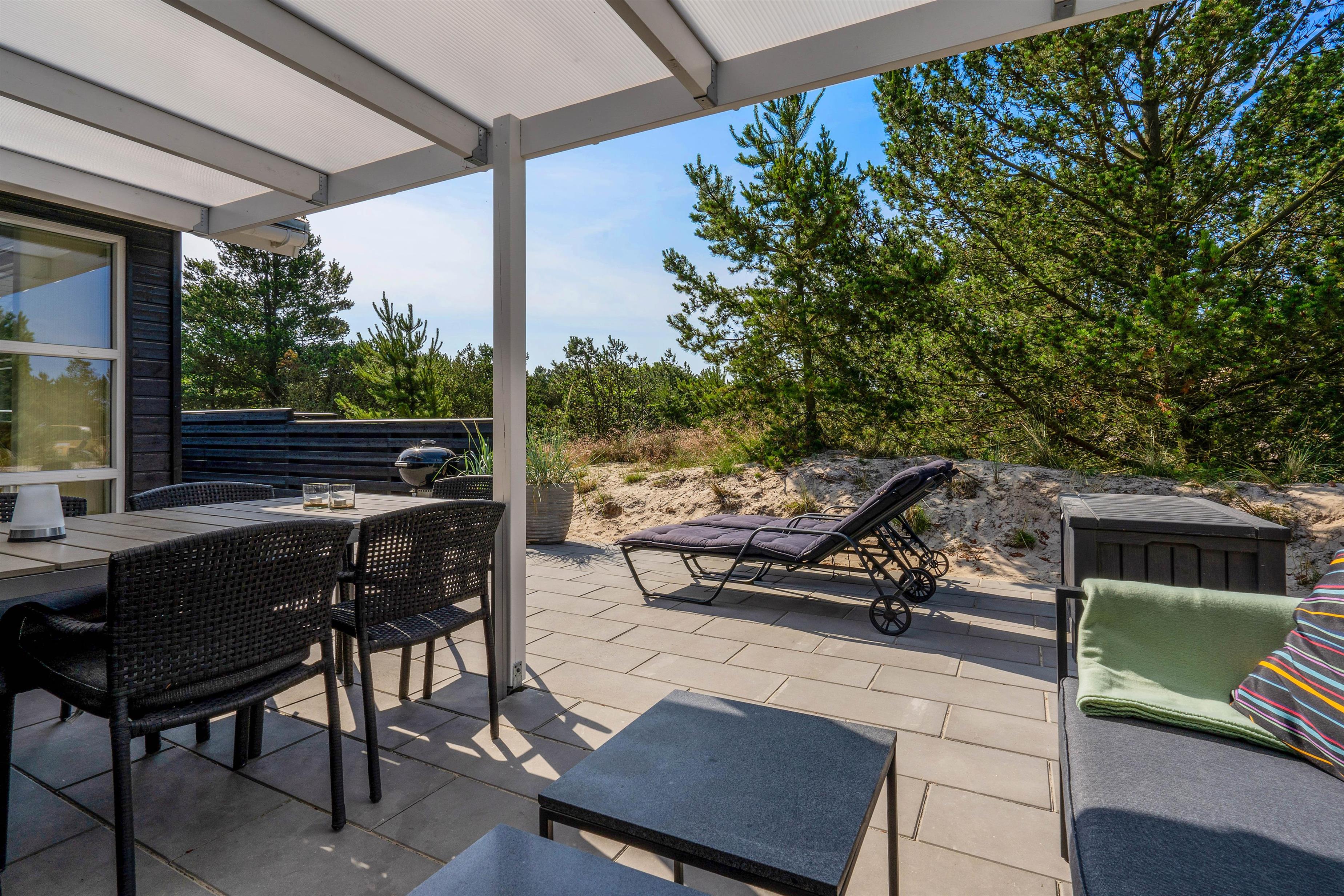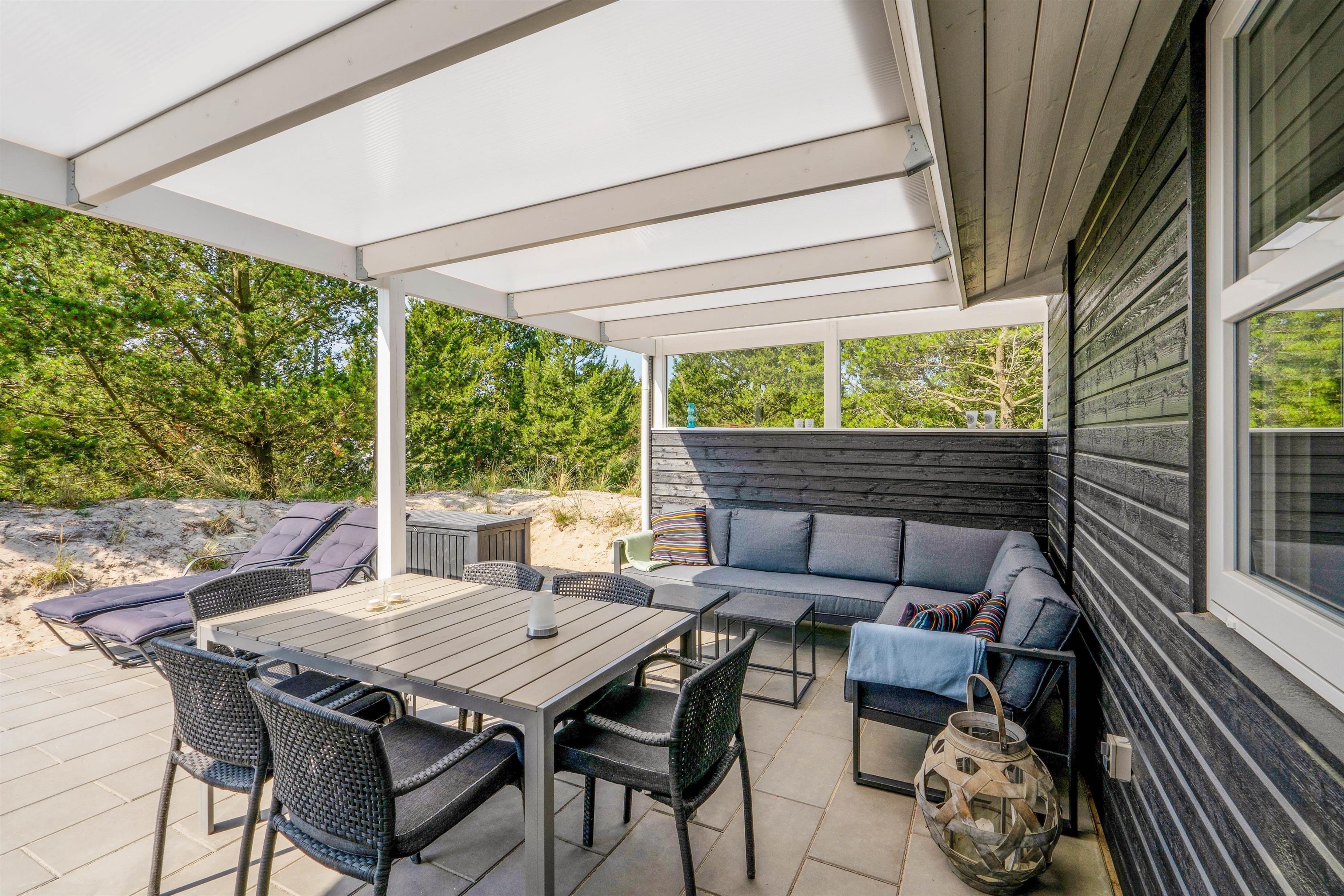 Terrassen er afskærmet og delvist overdækket, så her kan I også sidde i både ly og læ. Desuden sidder I også uforstyrret på terrassen takket være de høje træer, der omgiver sommerhuset.