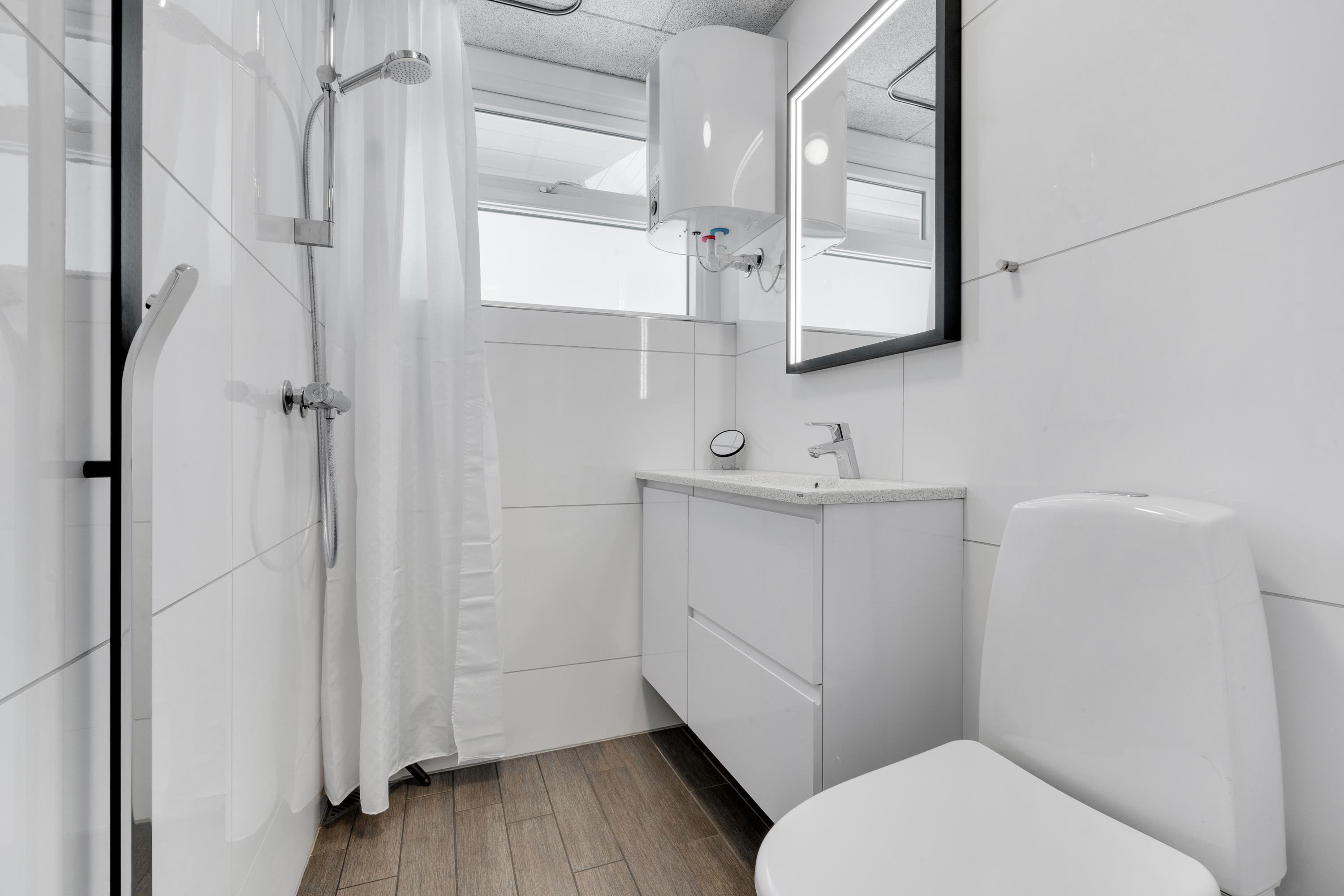 Det skønne sommerhus på 55 kvadratmeter er indrettet med 2 soveværelser, der begge har en dobbeltseng, samt 1 badeværelse med gulvvarme – her er der ingen, der fryser fødderne fra morgenstunden.