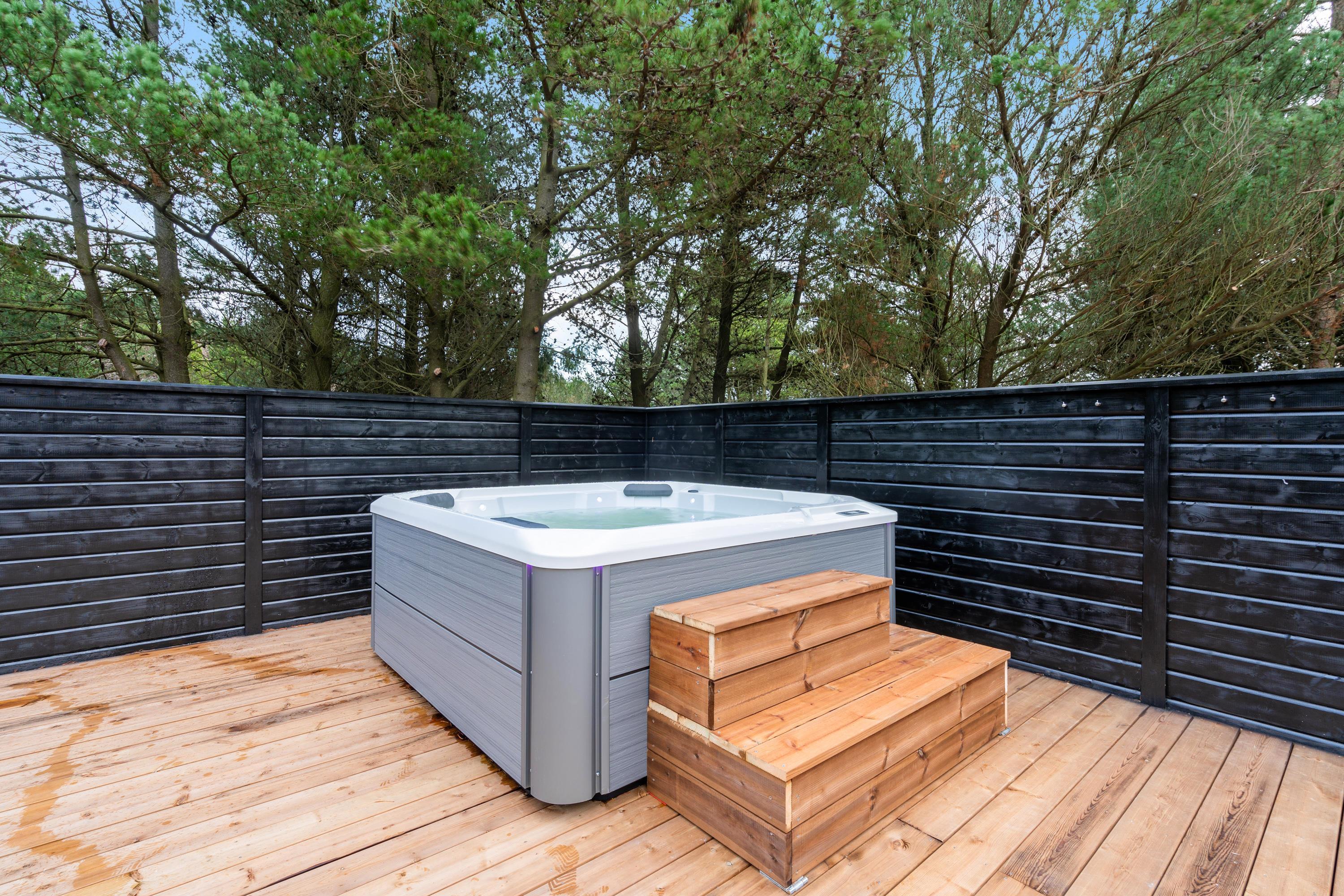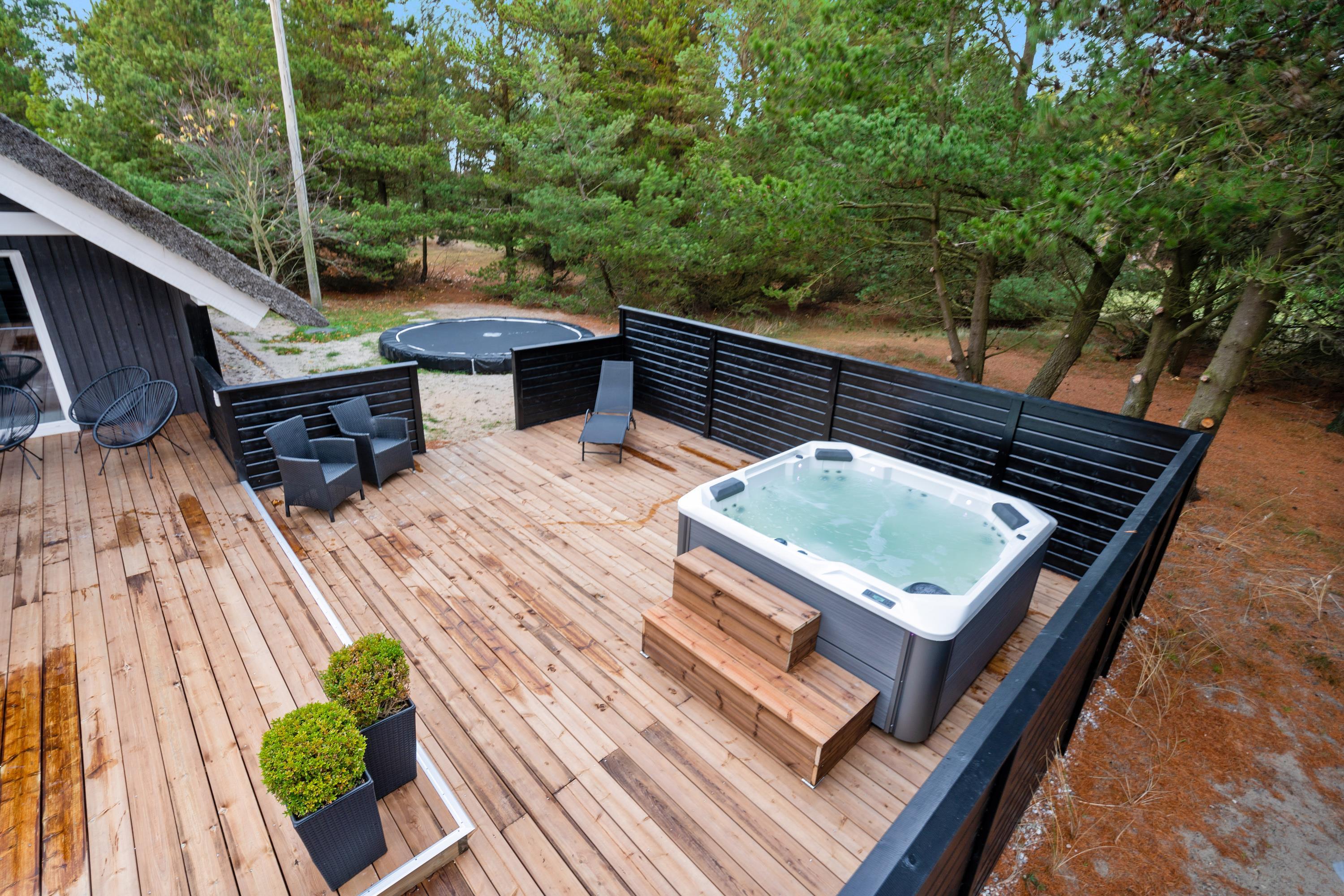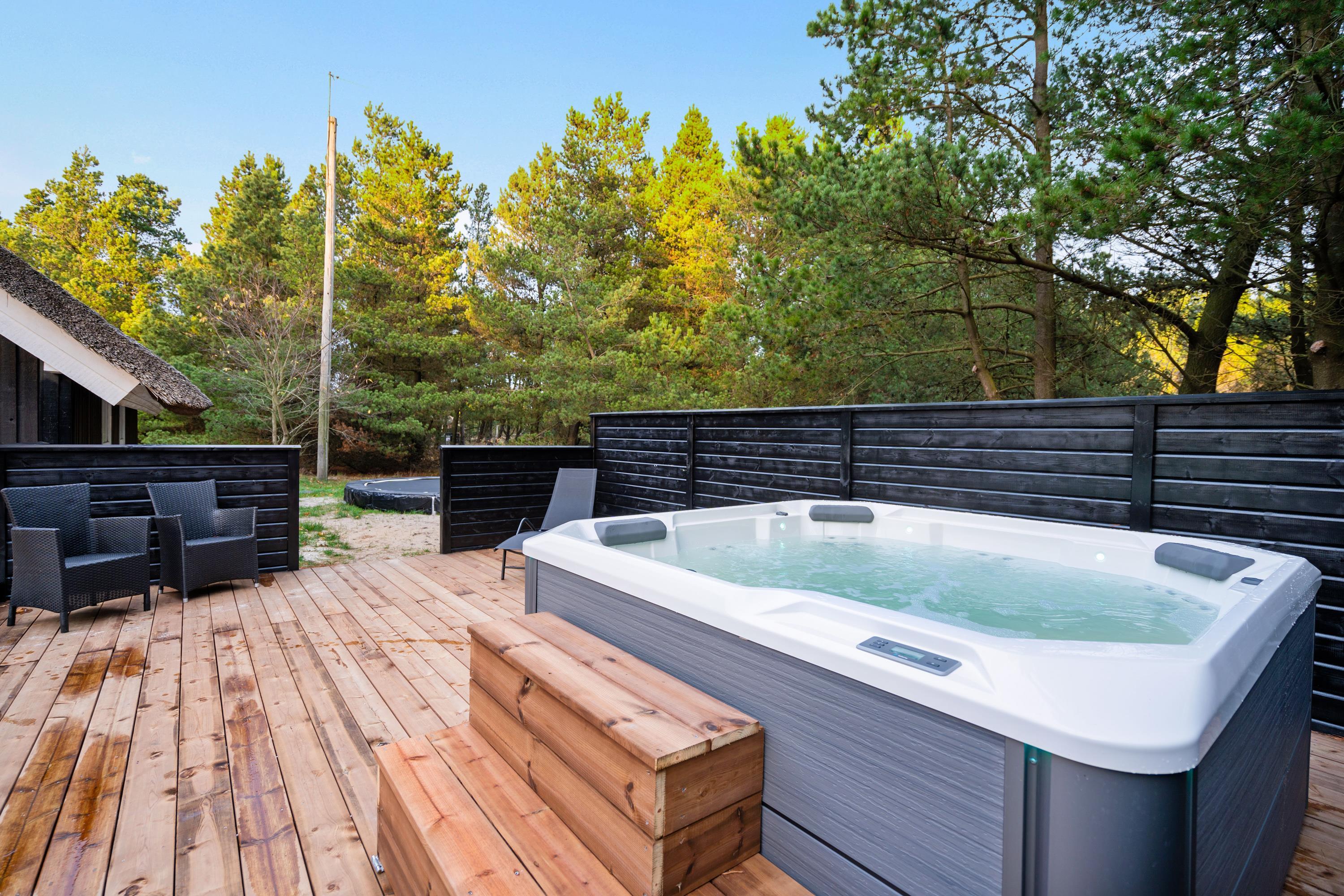 Stor afskærmet terrasse med udendørs spabad