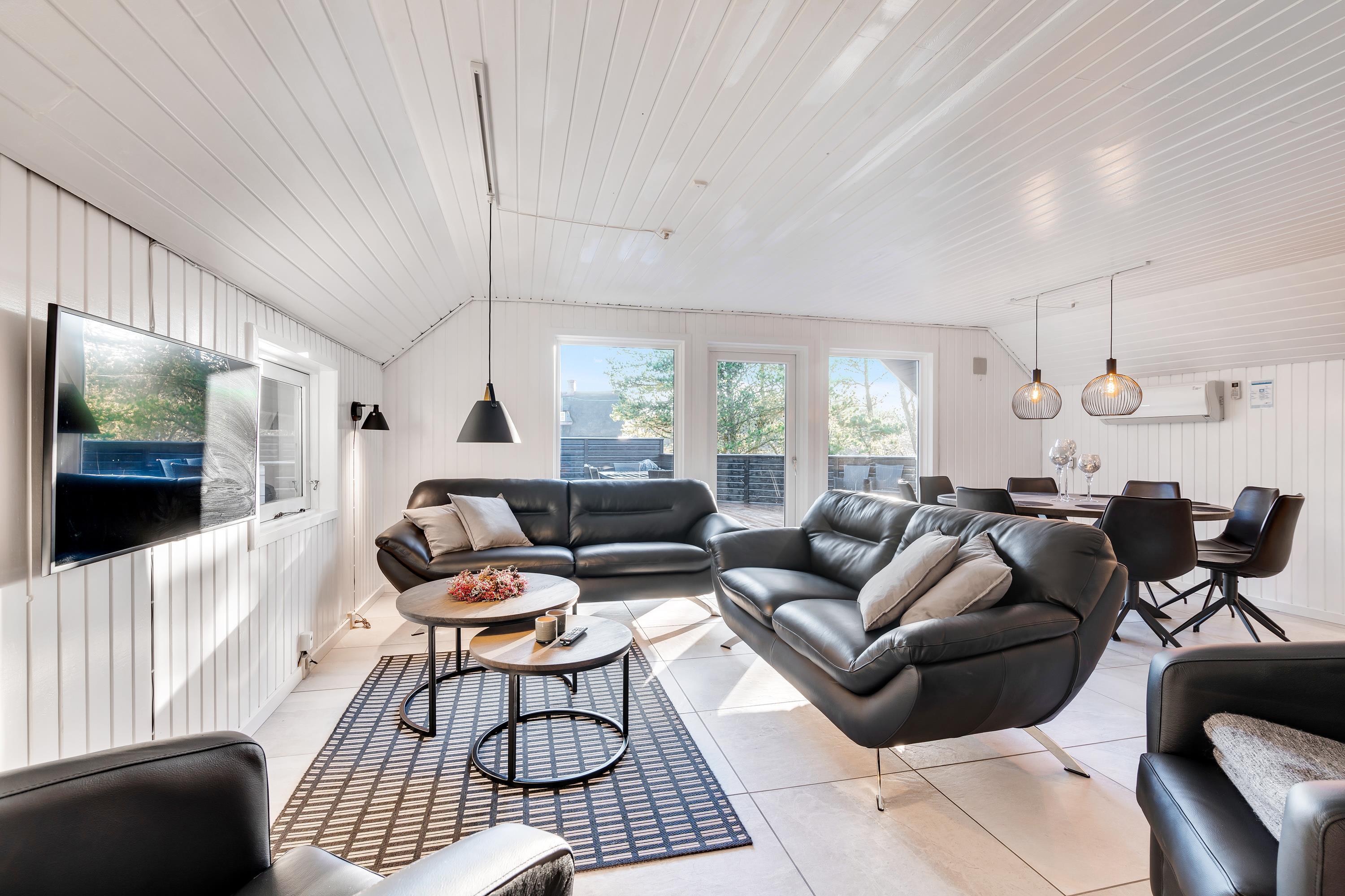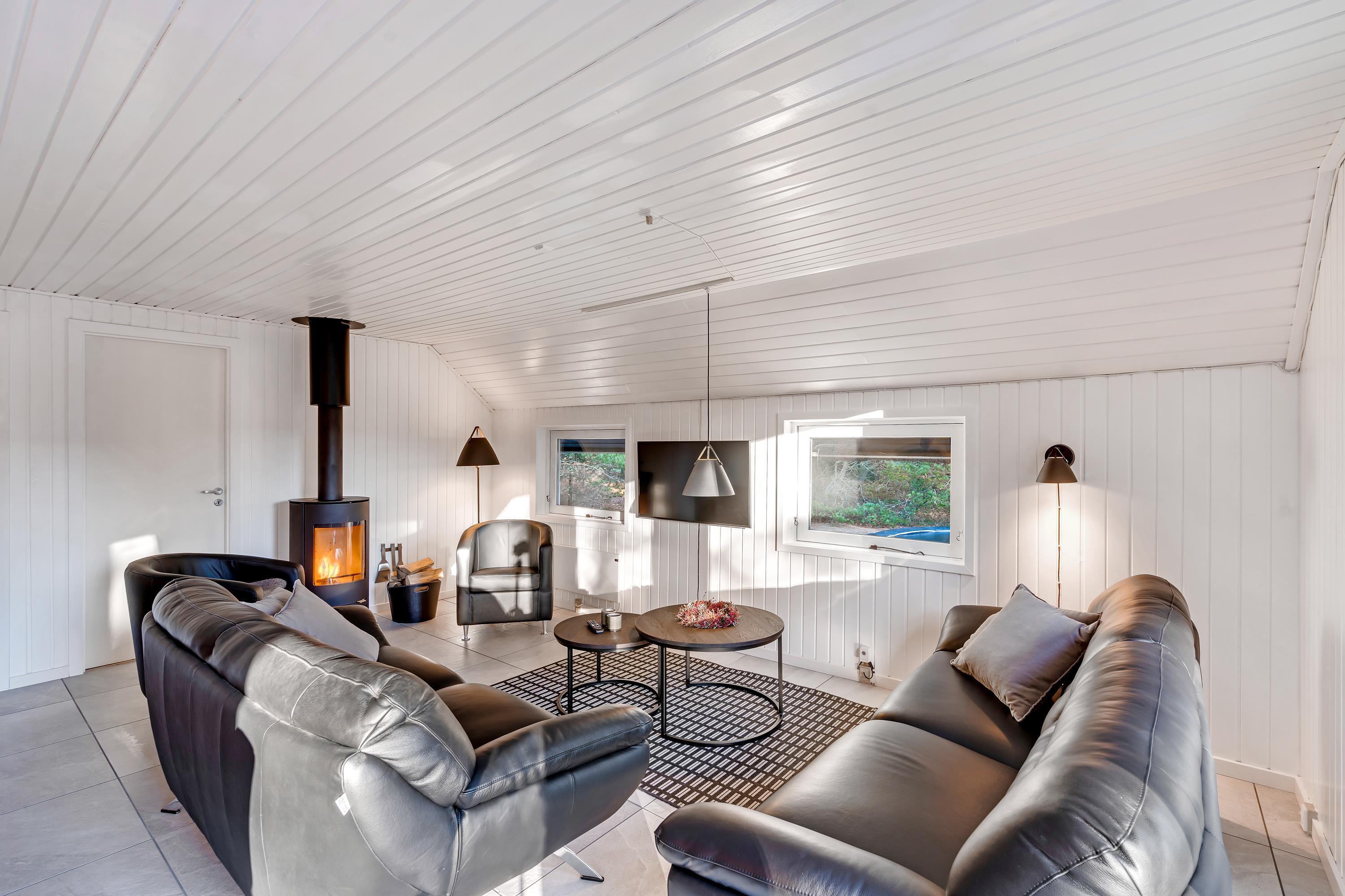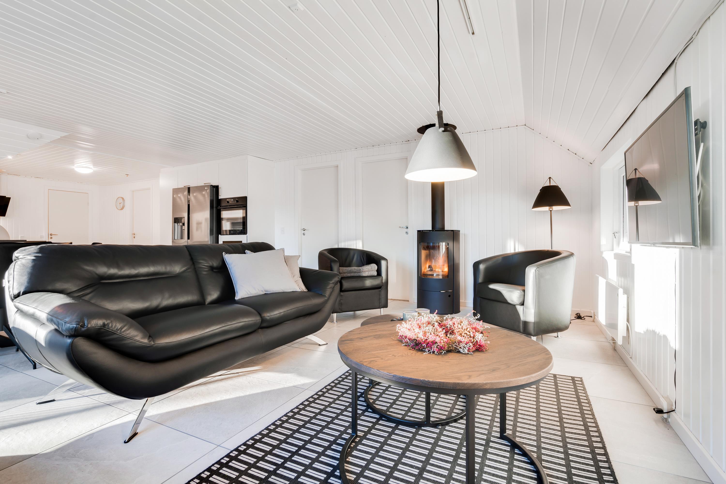 Også i sommerhusets opholdsrum kan I nyde mange sjove og hyggelige feriestunder sammen. I kan samle jer i sofaerne til en god film, når der skal lidt ro på, mens brændeovnen knitrer i baggrunden.