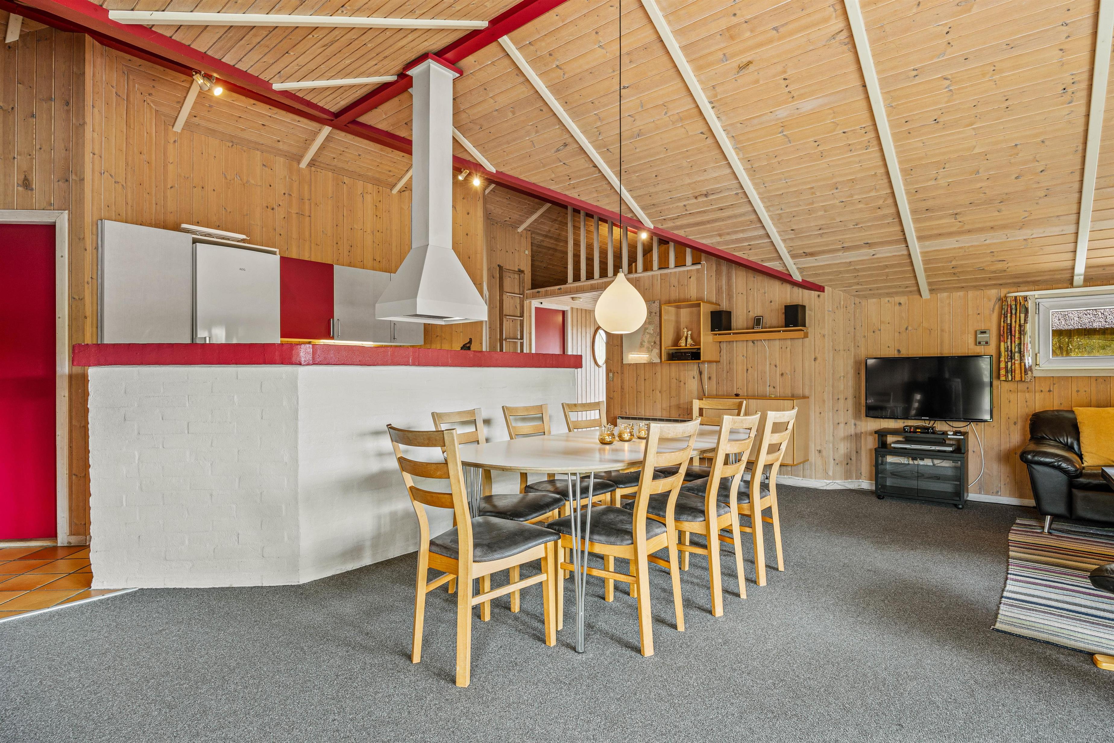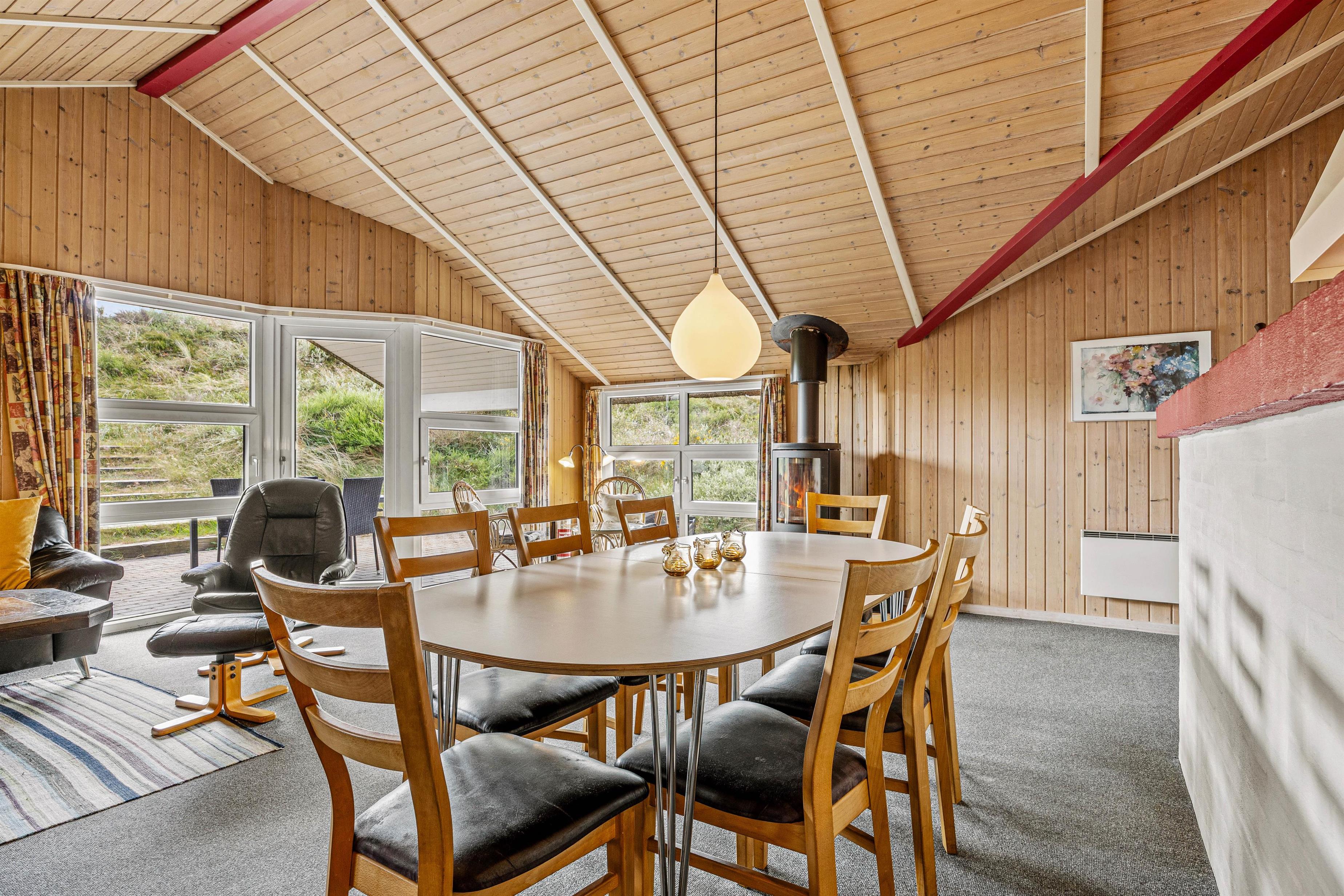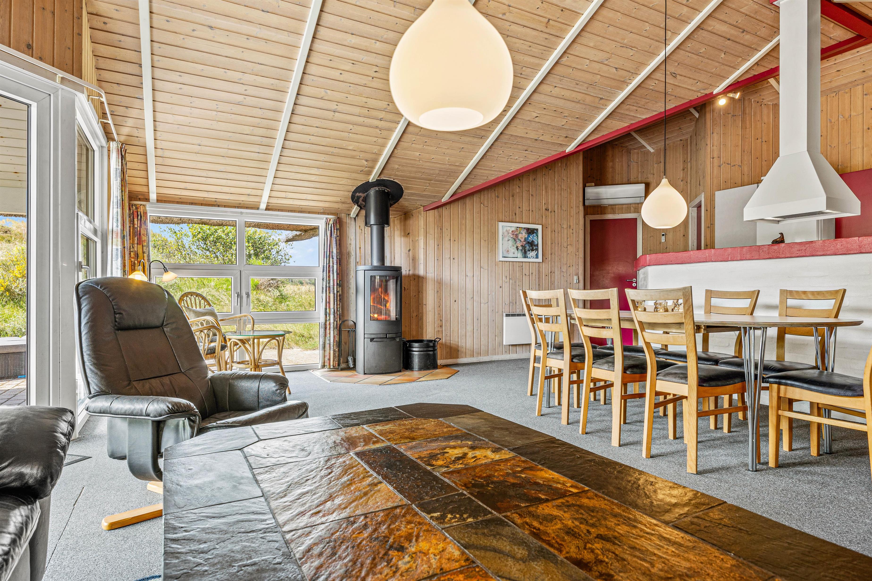 I køkkenet finder I alt, hvad I har brug for til fælles madlavning og hyggelige måltider – her er blandt andet opvaskemaskine og gulvvarme, som giver ekstra komfort, når vejret er køligt. Køkkenet ligger i åben forbindelse med stuen, hvor I kan slappe af foran brændeovnen eller nyde varmen fra den energivenlige varmepumpe. Her er der god plads til samvær, spil og afslapning.