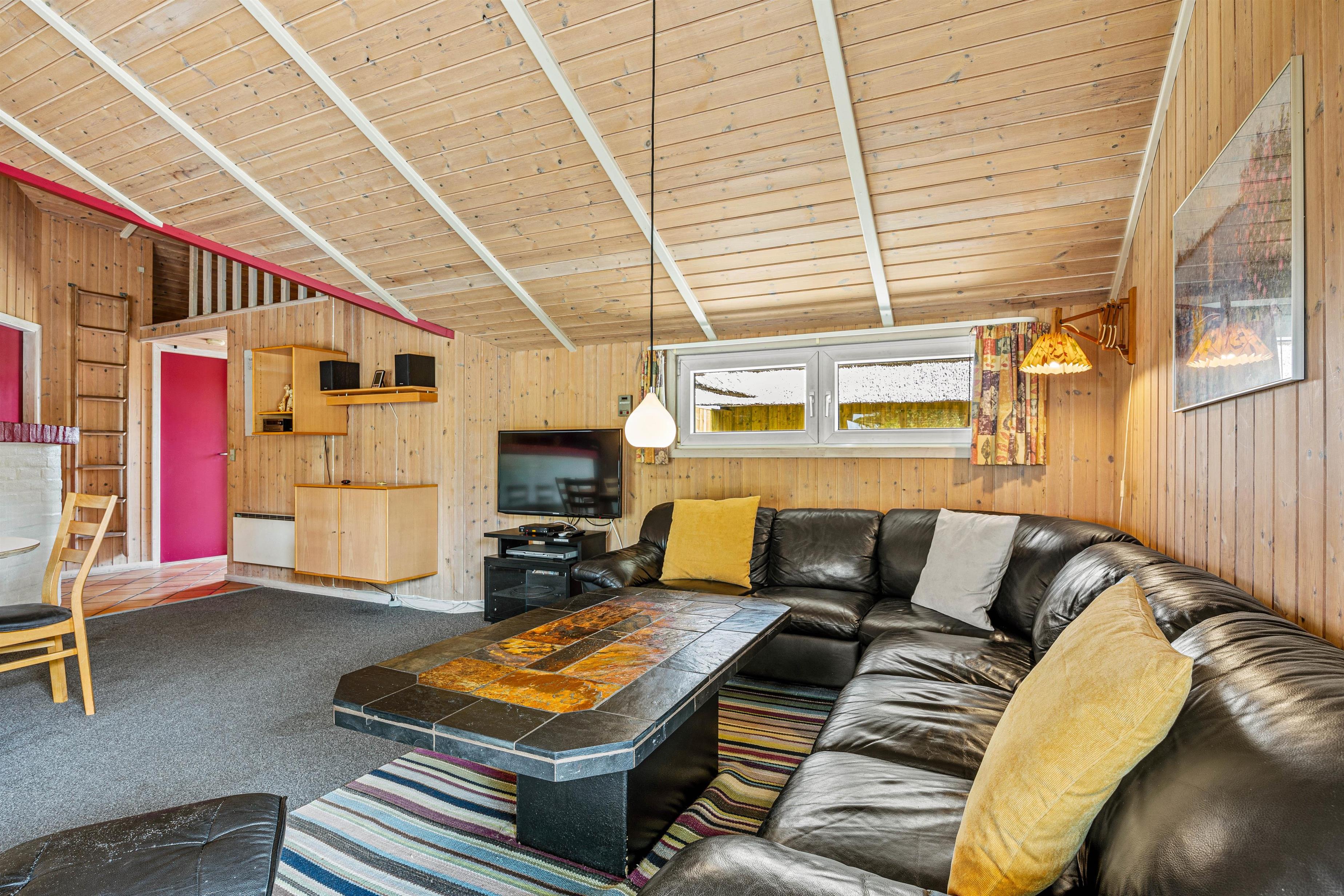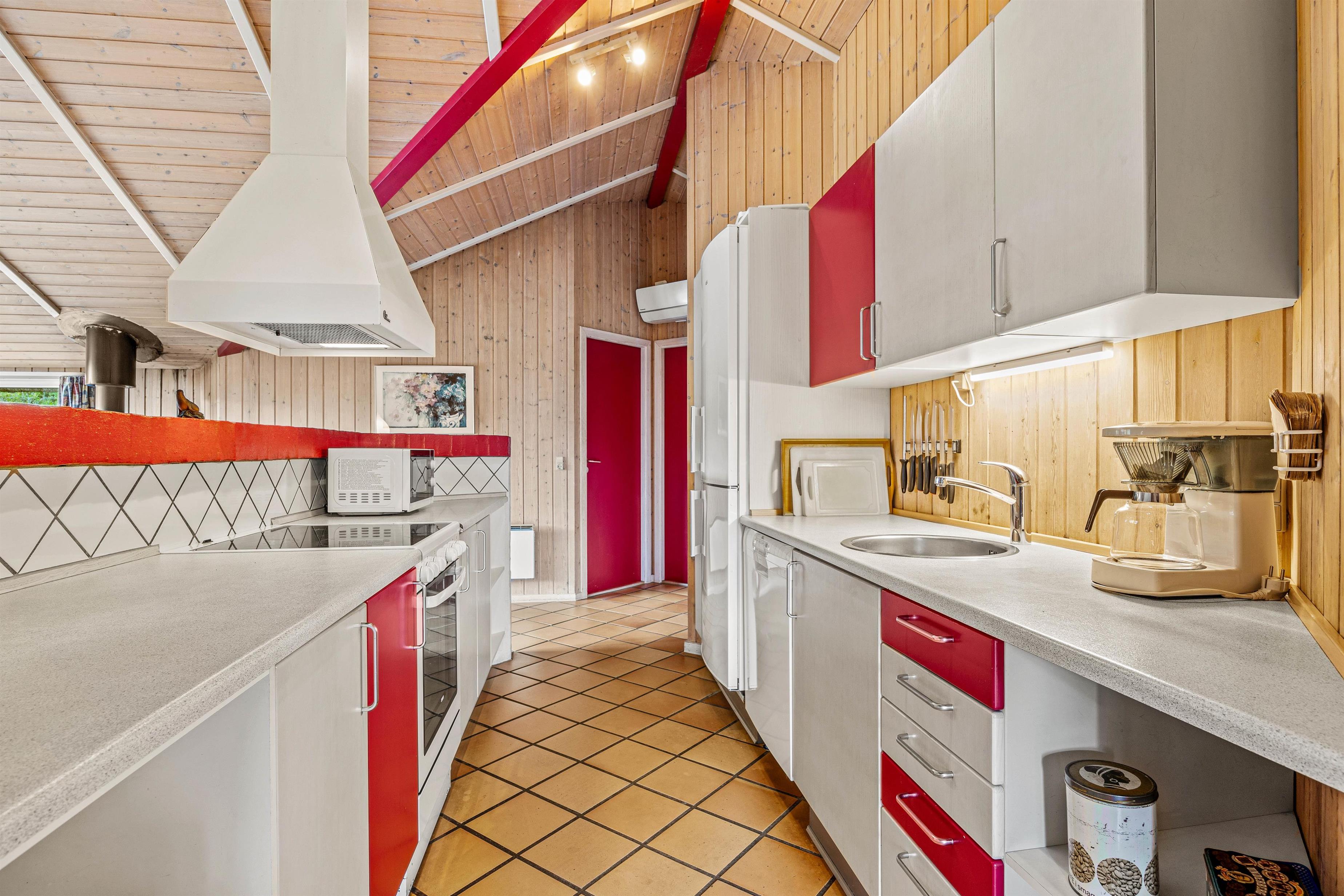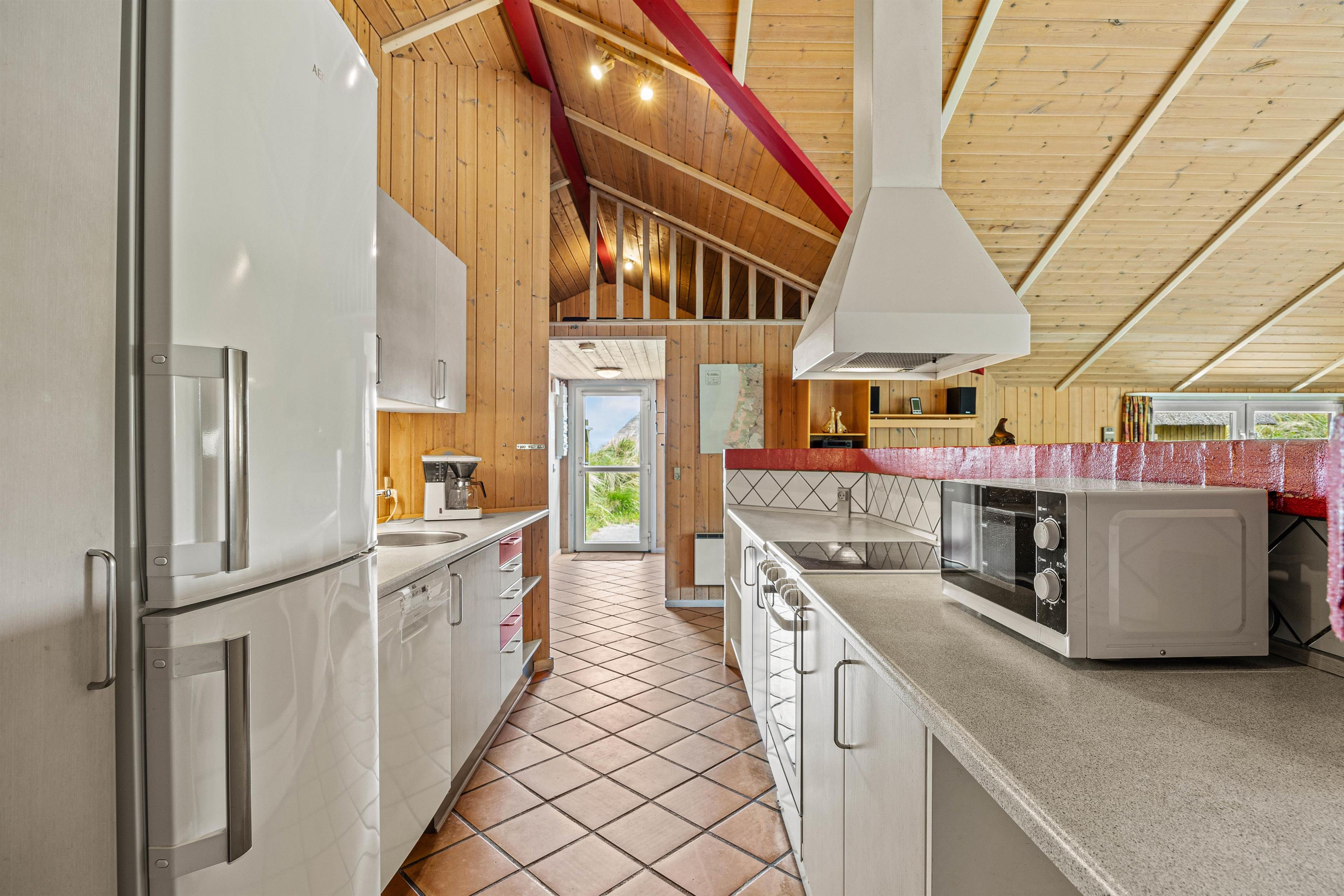 I køkkenet finder I alt, hvad I har brug for til fælles madlavning og hyggelige måltider – her er blandt andet opvaskemaskine og gulvvarme, som giver ekstra komfort, når vejret er køligt. Køkkenet ligger i åben forbindelse med stuen, hvor I kan slappe af foran brændeovnen eller nyde varmen fra den energivenlige varmepumpe. Her er der god plads til samvær, spil og afslapning.