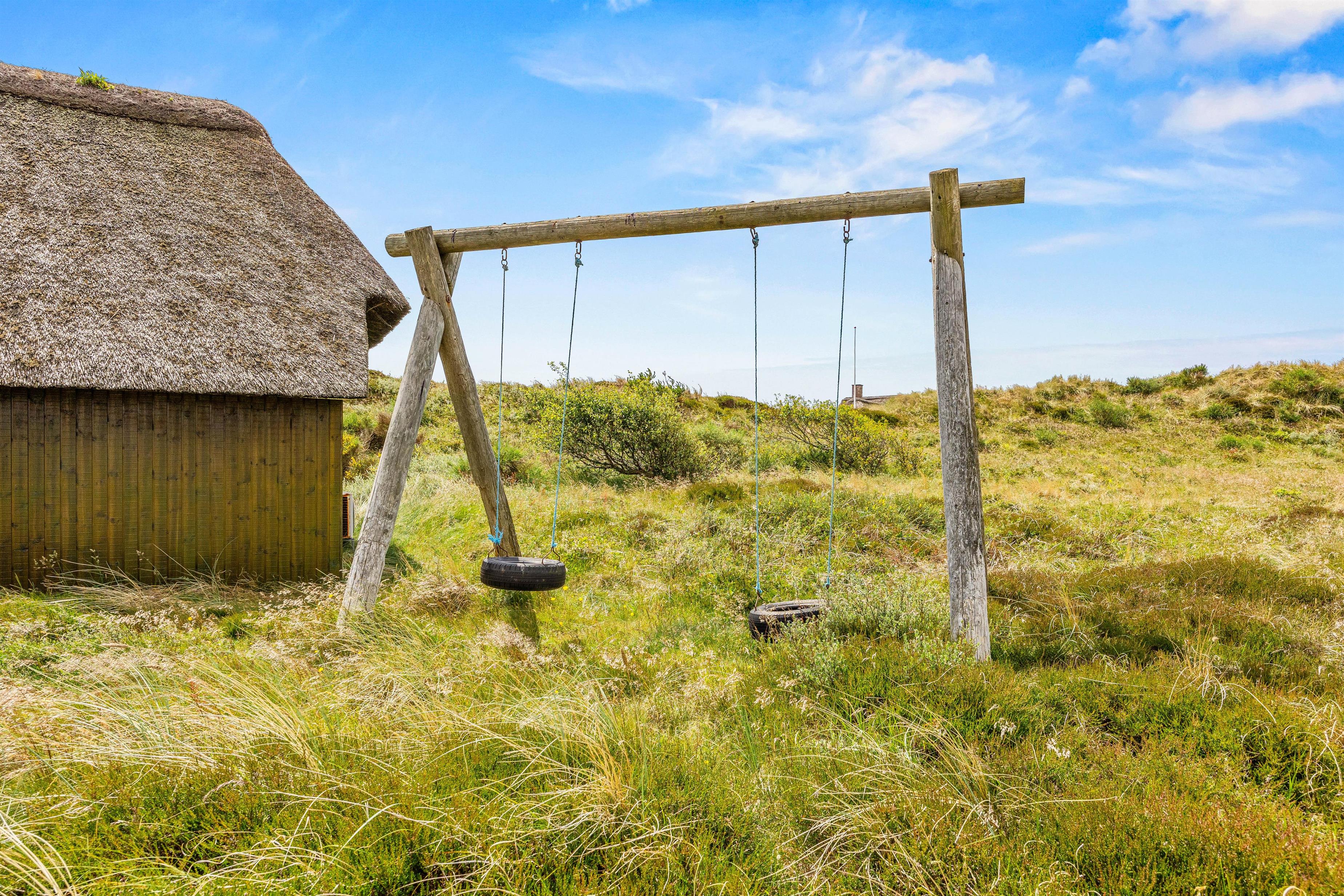 Mens de voksne nyder freden med en bog eller et glas vin, kan børnene lege frit. Der er både gynge og sandkasse til rådighed, og den naturlige beplantning omkring grunden giver en rolig og ugeneret stemning.