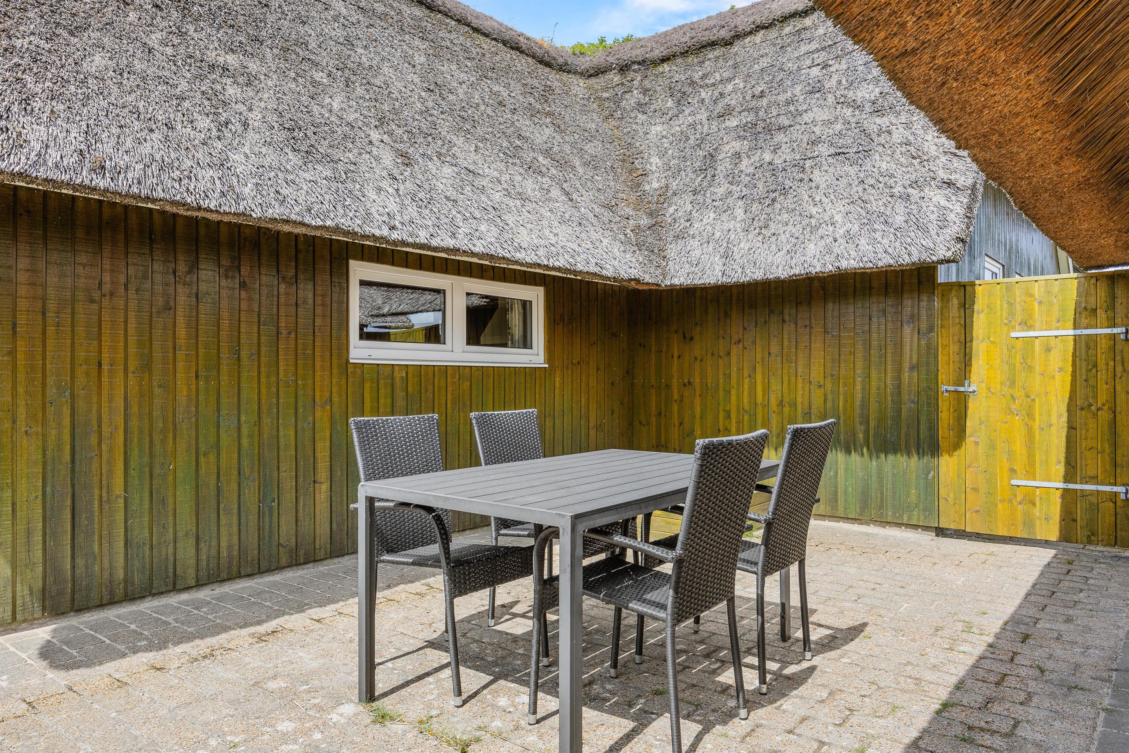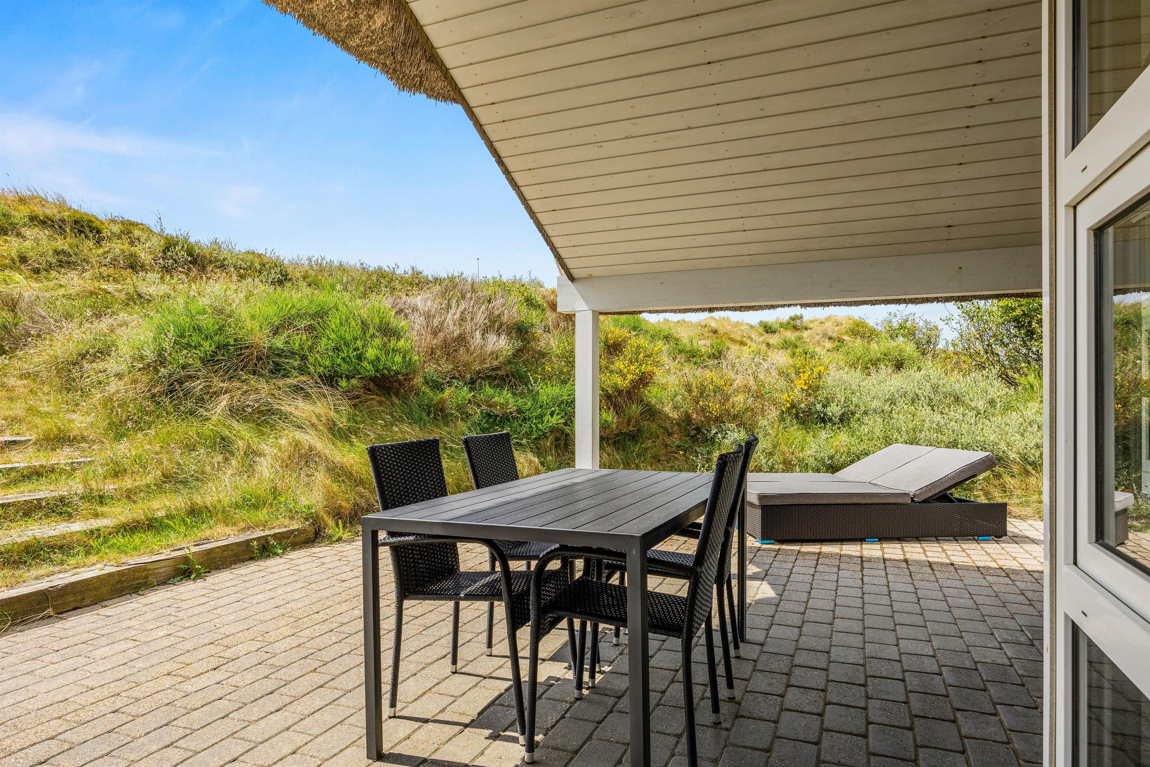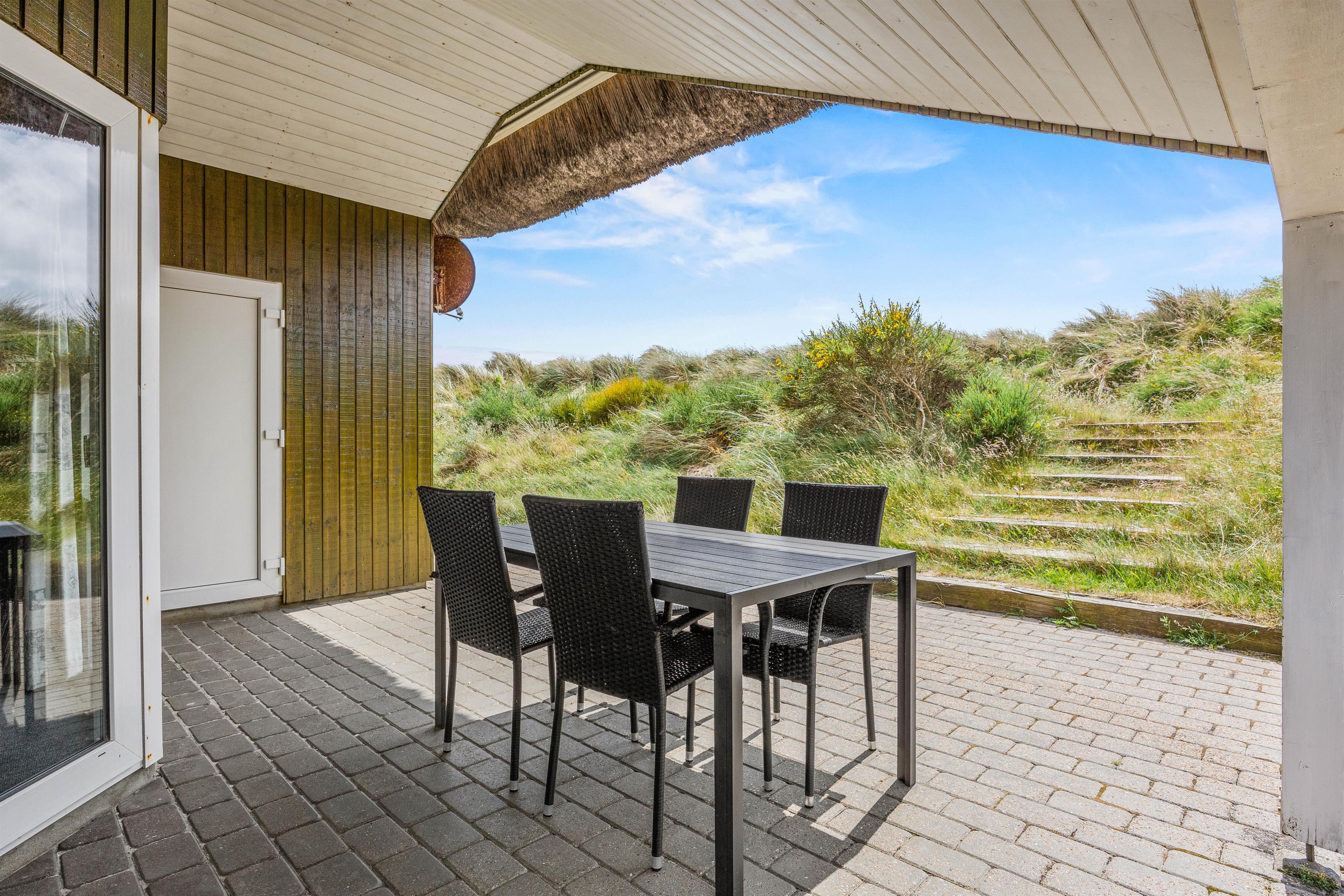 Sommerhuset ligger på en fin naturgrund, hvor I kan nyde udelivet fra morgen til aften. Den delvist overdækkede terrasse er udstyret med havemøbler og grill, så I nemt kan gøre plads til både afslappede morgenstunder med kaffe og lune sommeraftener med grillmad under åben himmel.