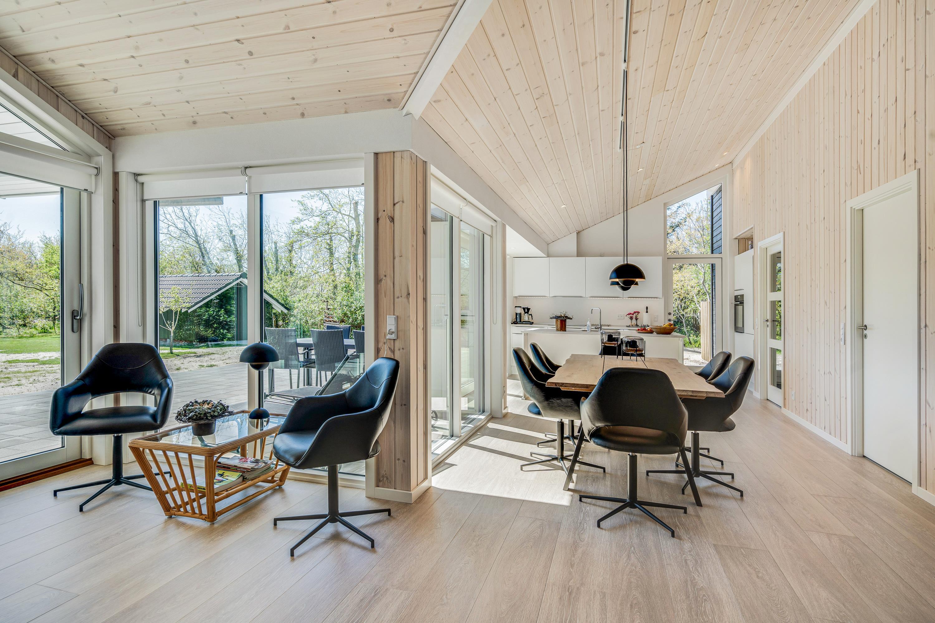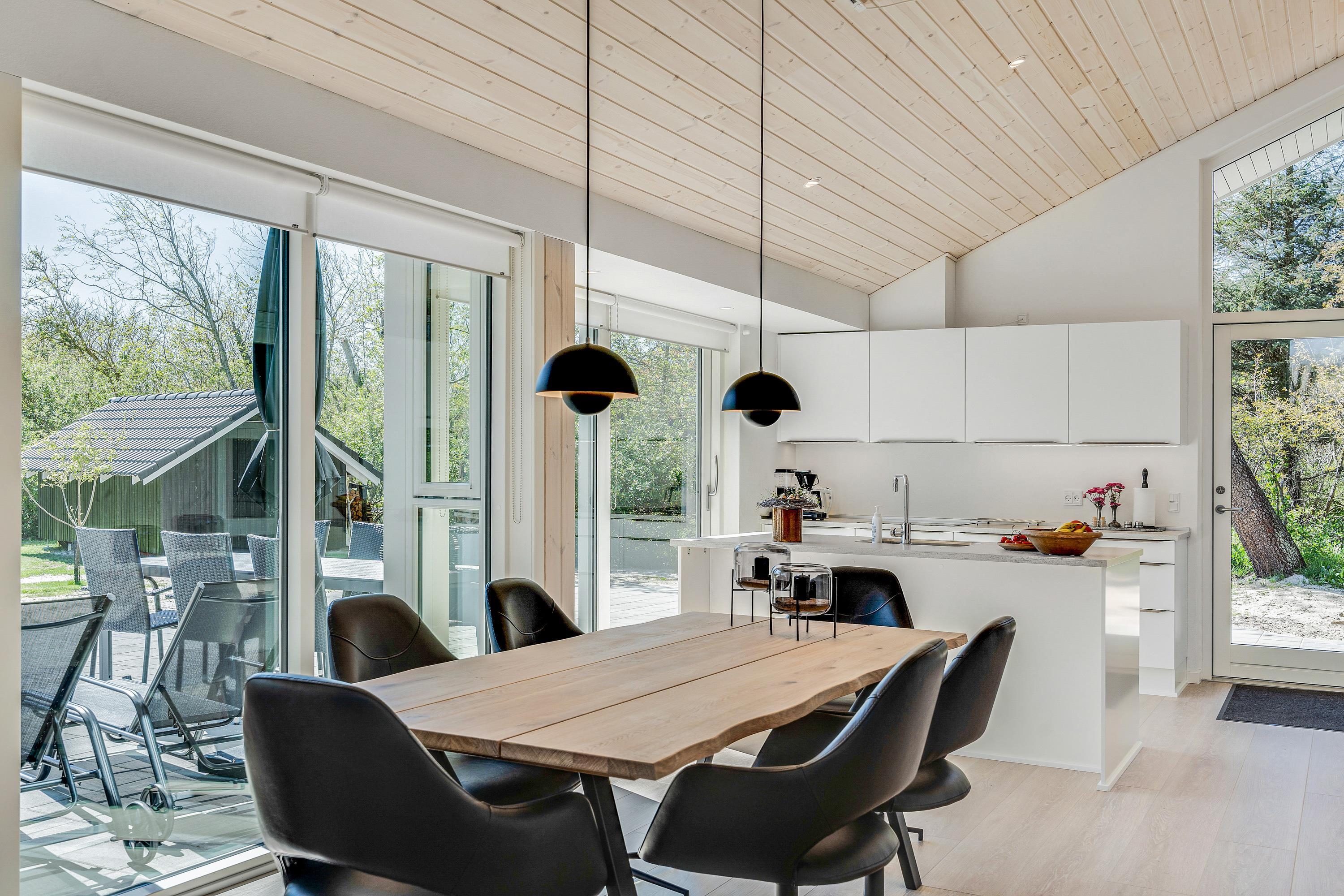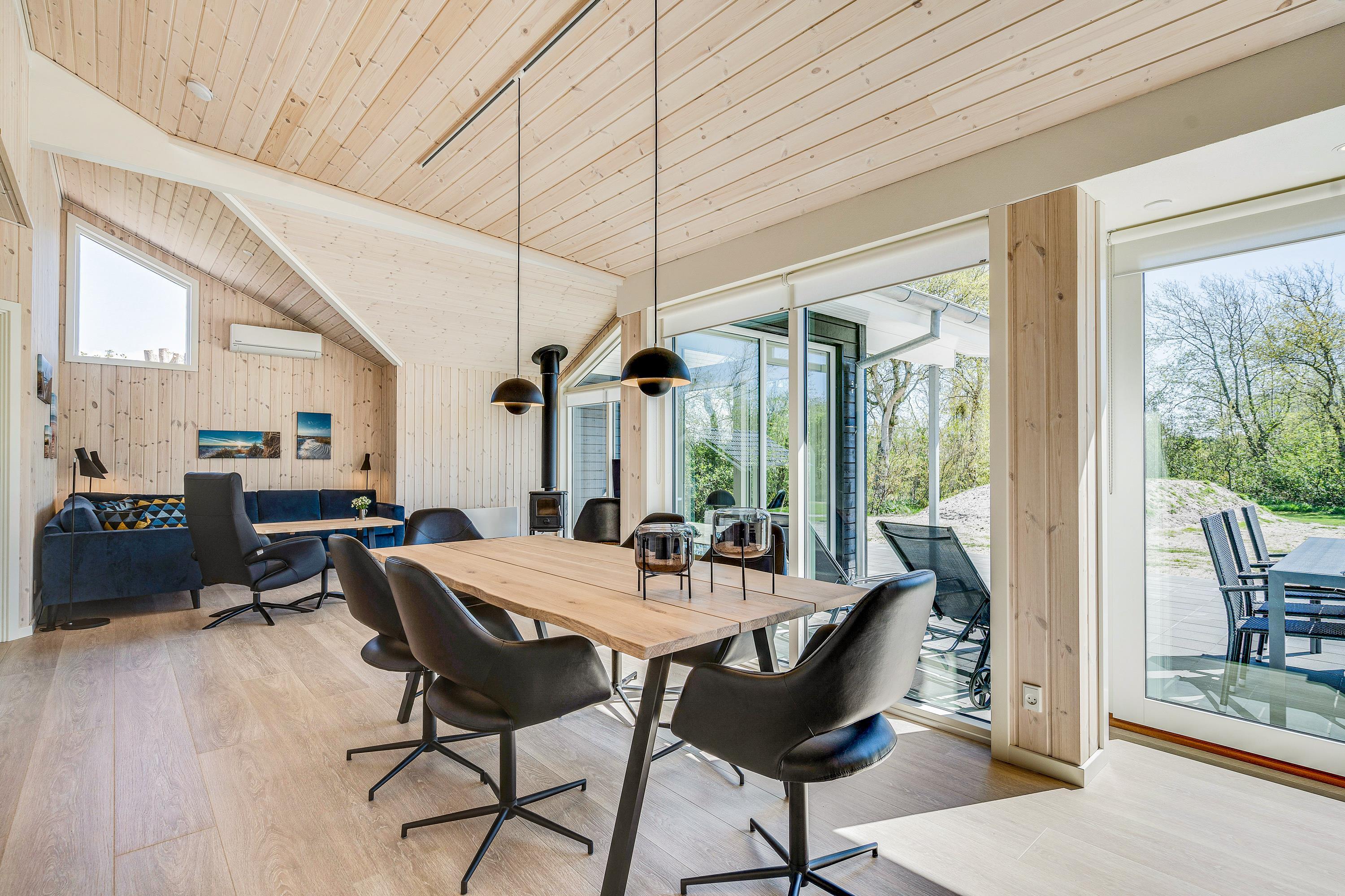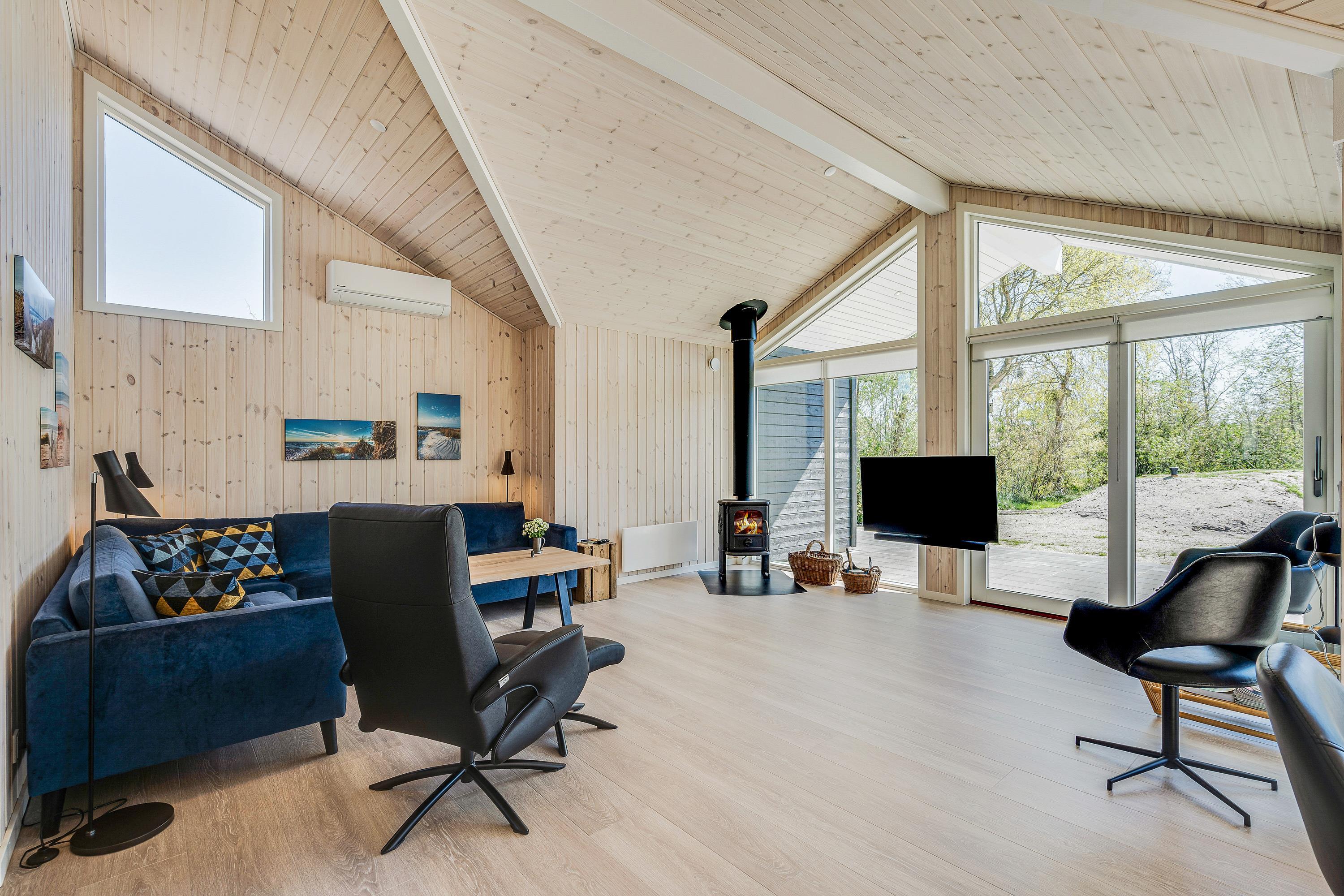 I det åbne opholdsrum kan I samles til masser af hyggelige feriestunder med fælles madlavning, gode middage og afslappende aftener på sofaen foran den knitrende brændeovn. De store vinduespartier sørger for et dejligt lysindfald og en flot udsigt til det naturskønne ferieområde, og der er flere udgange til terrassen.