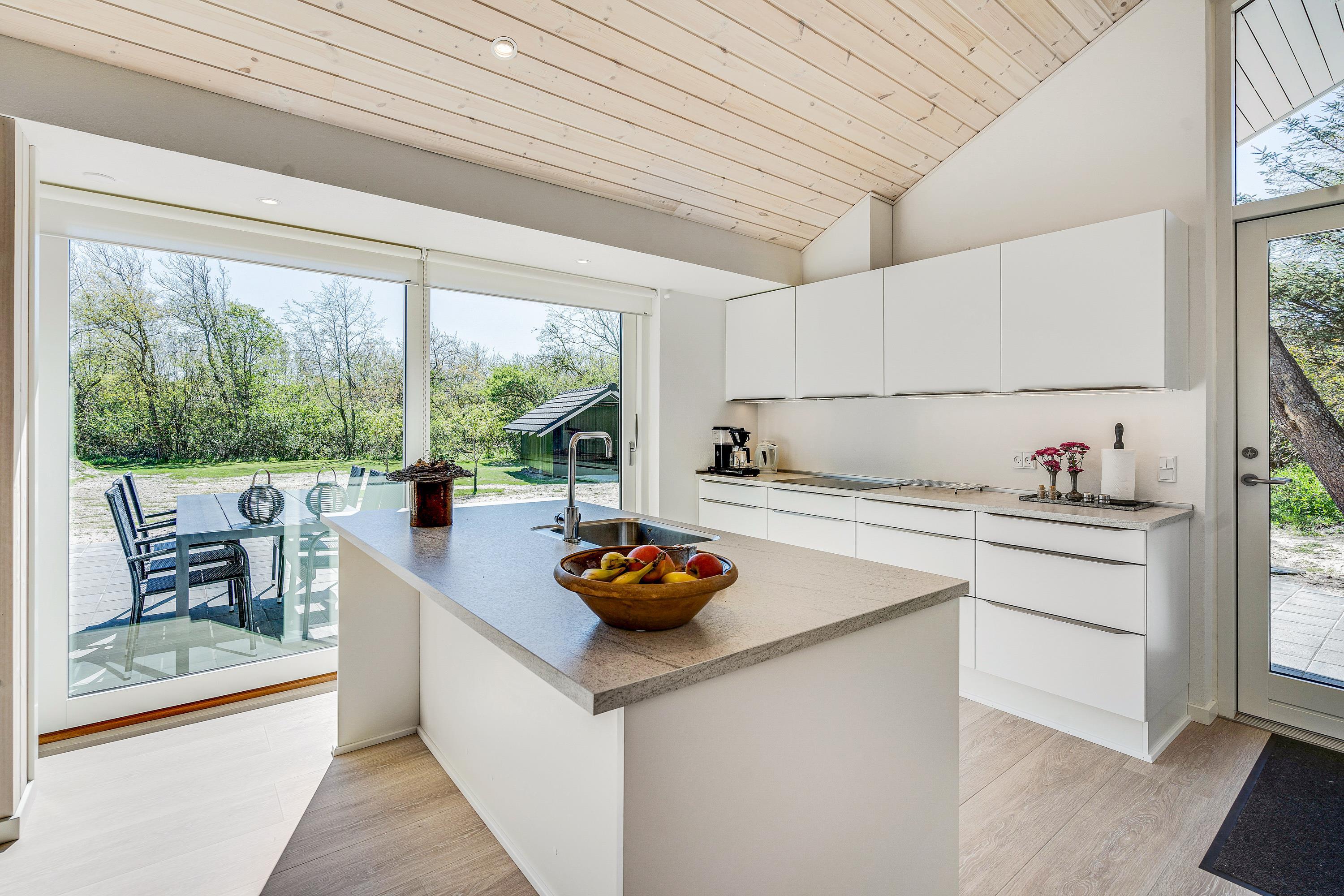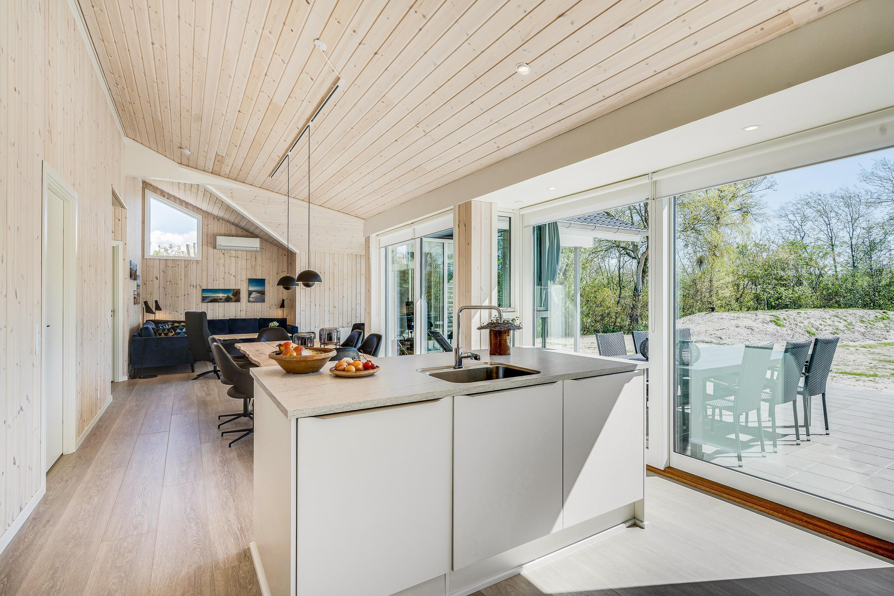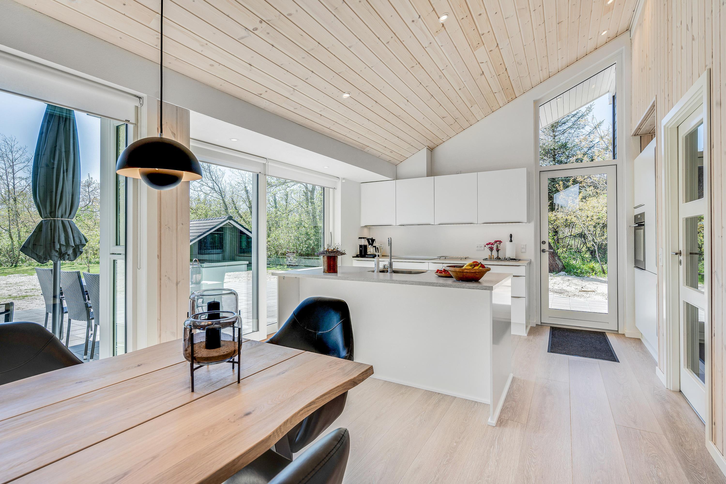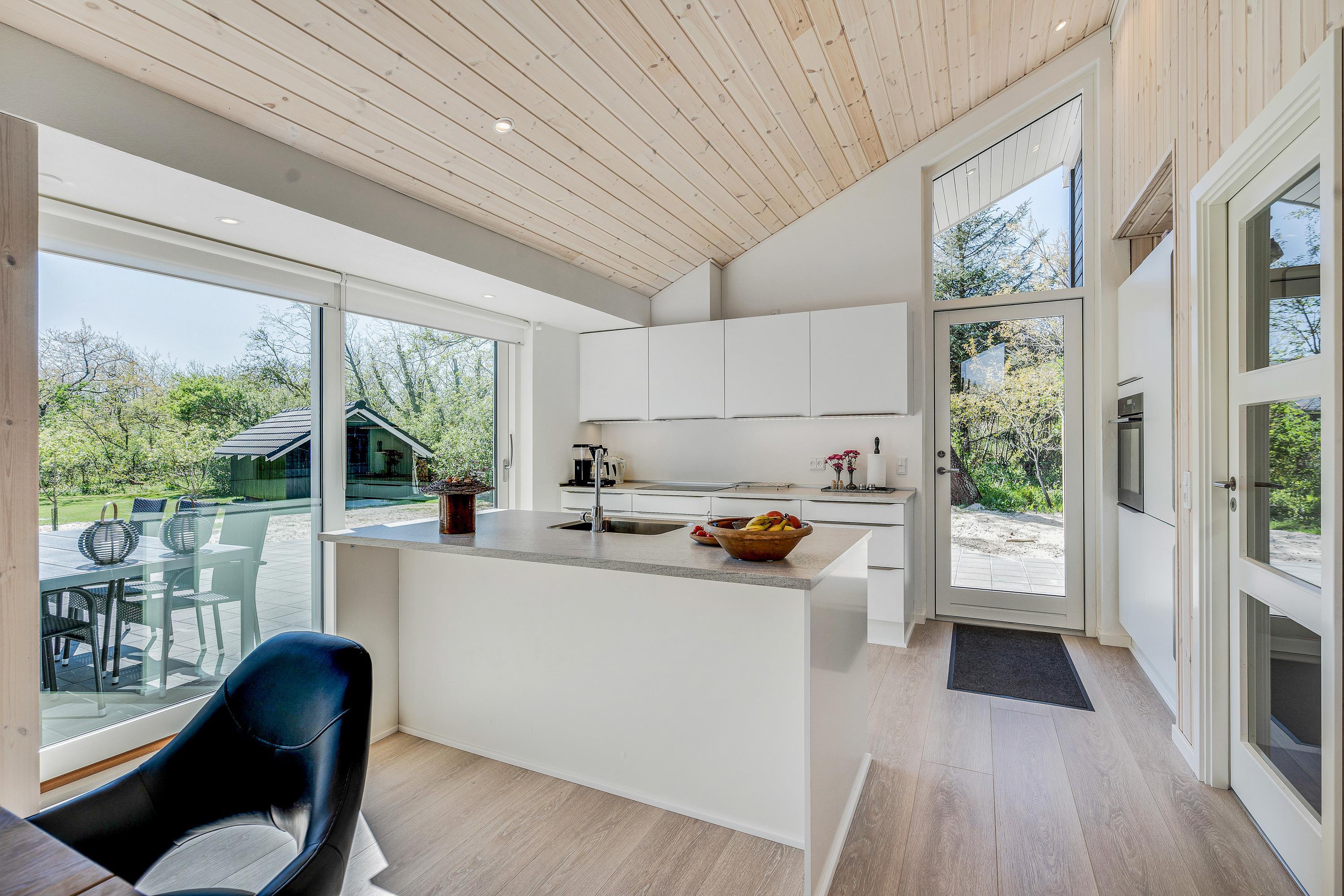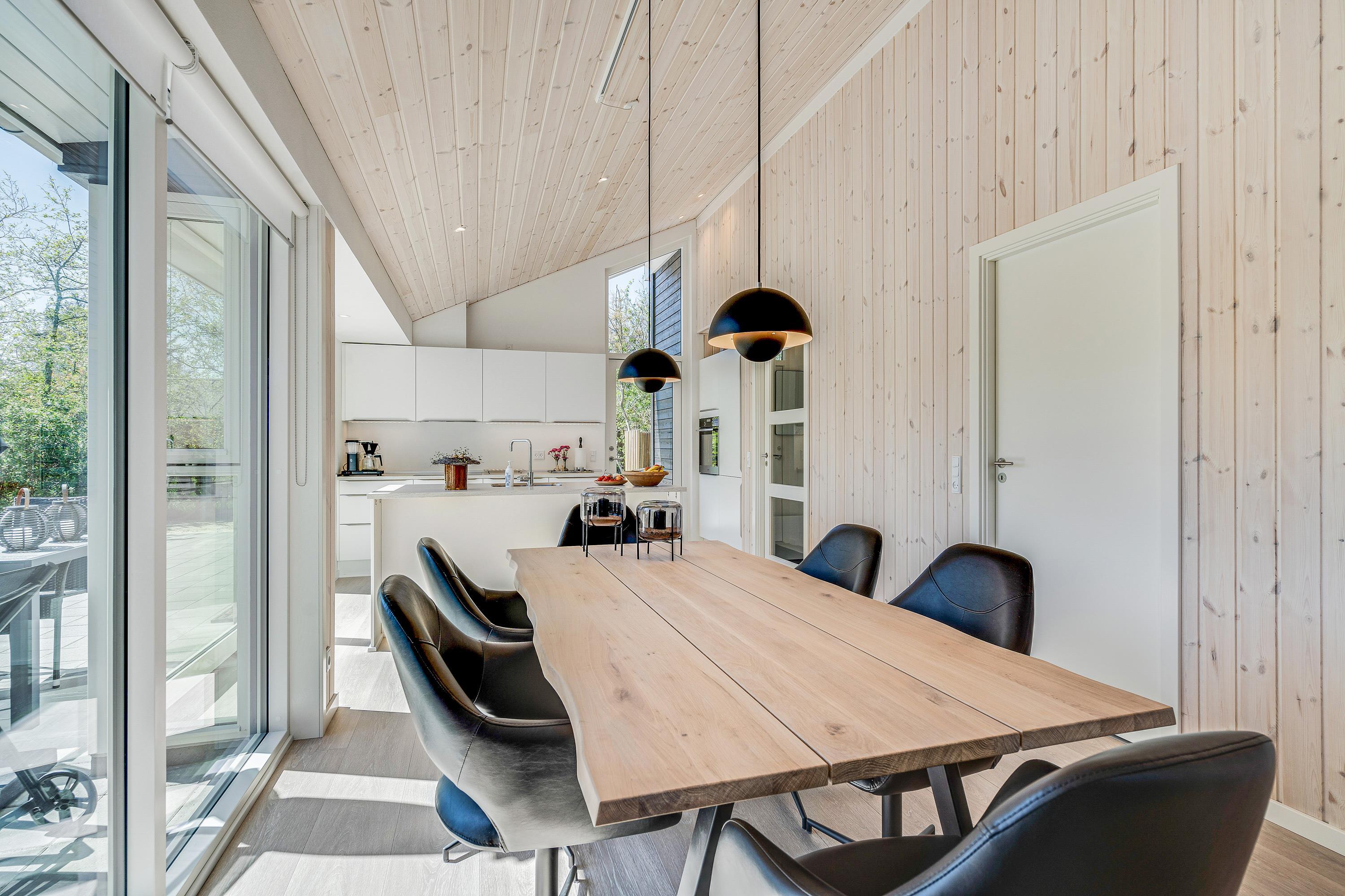 I det åbne opholdsrum kan I samles til masser af hyggelige feriestunder med fælles madlavning, gode middage og afslappende aftener på sofaen foran den knitrende brændeovn. De store vinduespartier sørger for et dejligt lysindfald og en flot udsigt til det naturskønne ferieområde, og der er flere udgange til terrassen.
