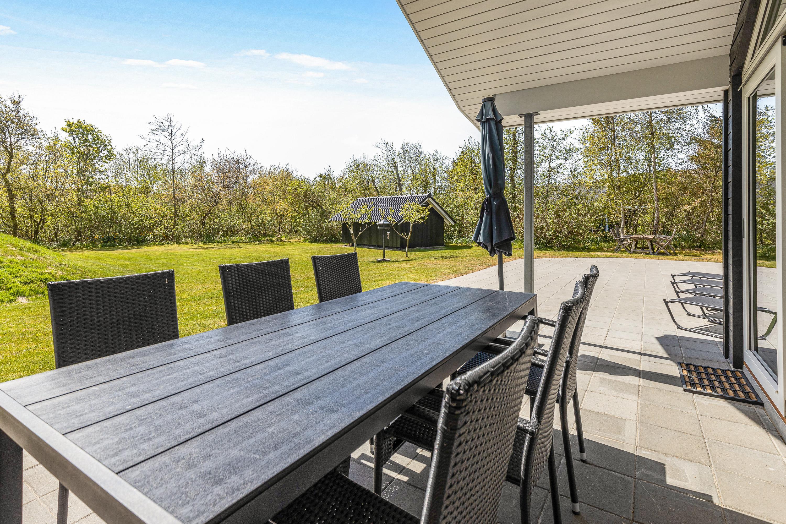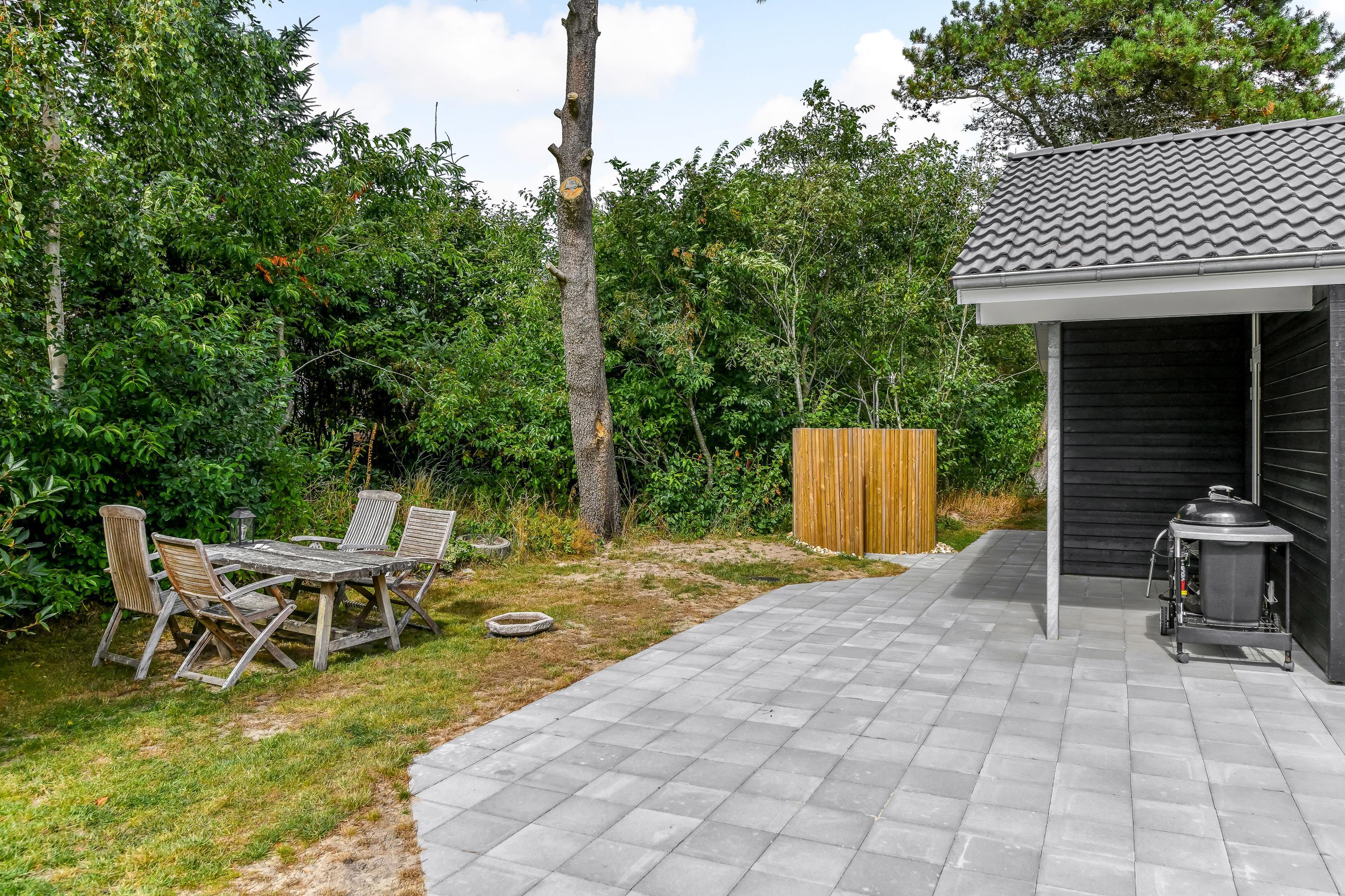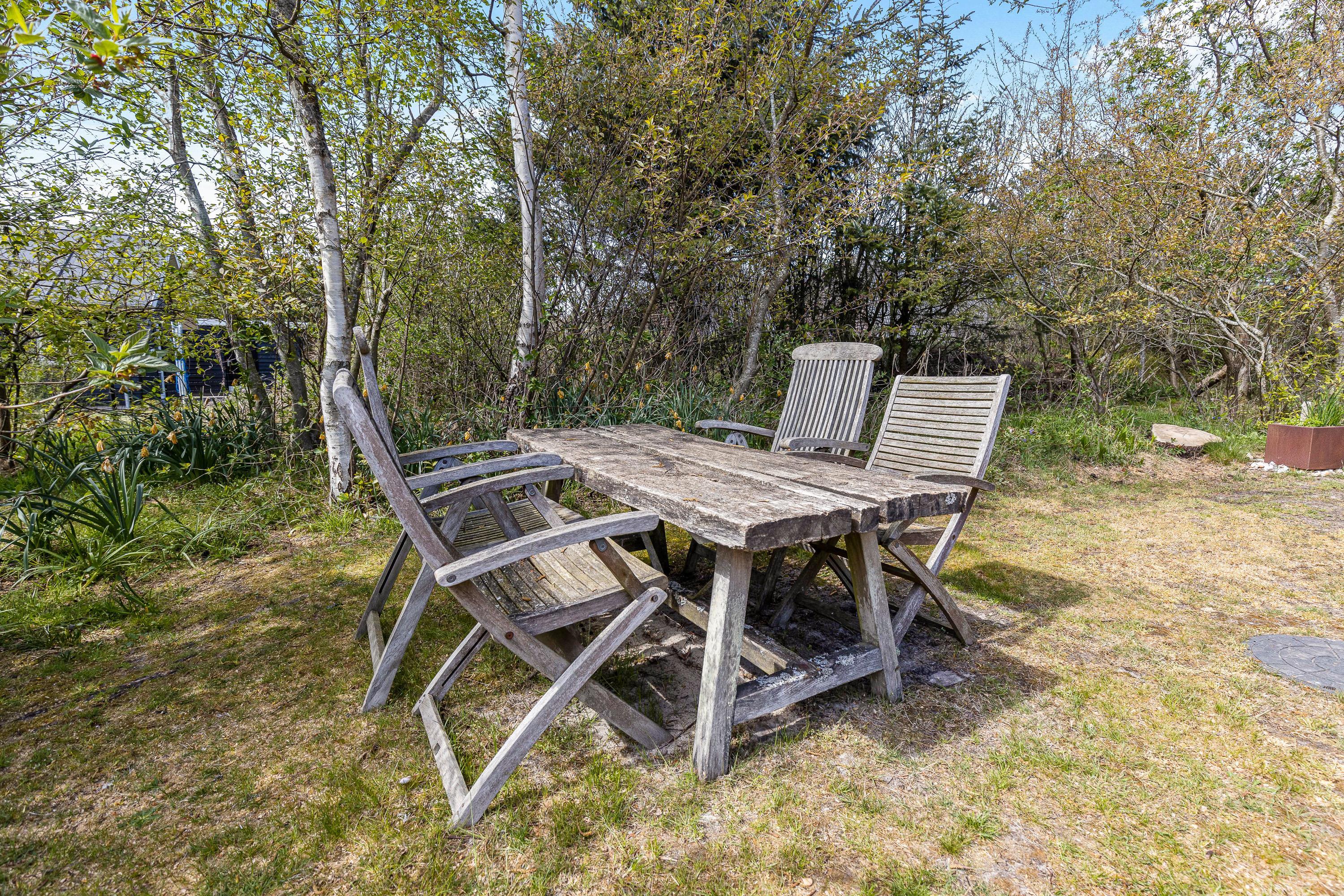 Feriehuset i Blåvand har en skøn, delvist overdækket terrasse, hvor I både kan finde en plads i solen og i skyggen. Havemøbler, liggestole og en grill står til rådighed, så I kan udnytte hver en solstråle på de gode sommerdage, og selv på en regnfuld dag kan I tilberede et lækkert grillmåltid under terrassens overdækkede del. I sommermånederne er der desuden en udebruser til rådighed.
