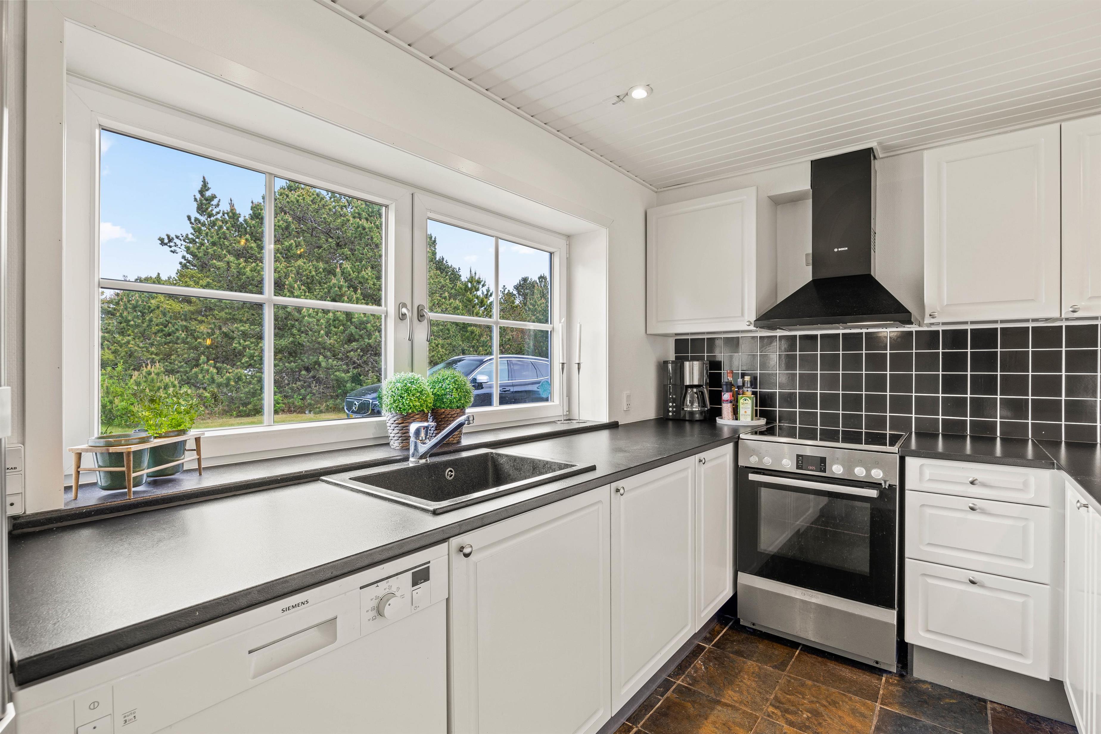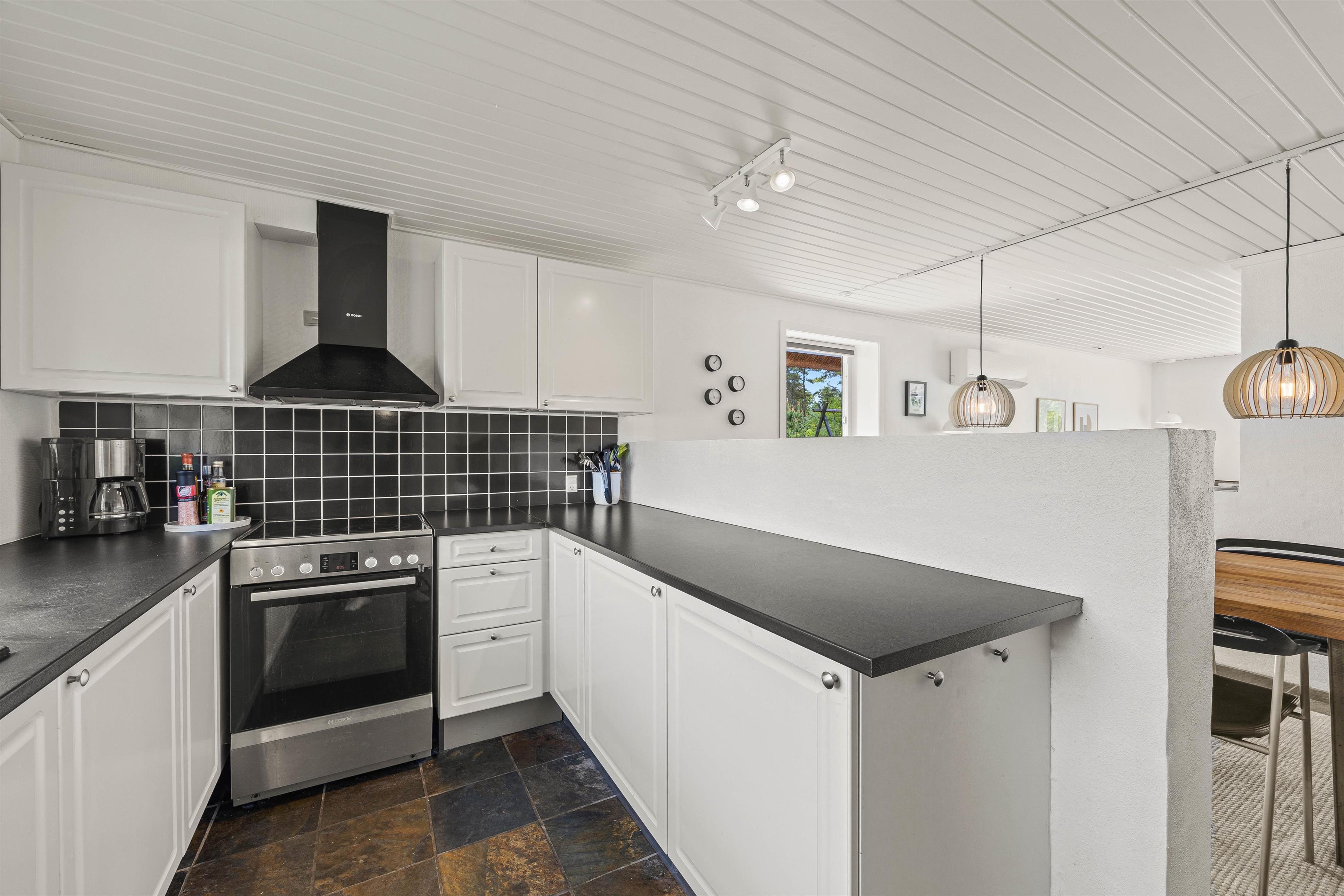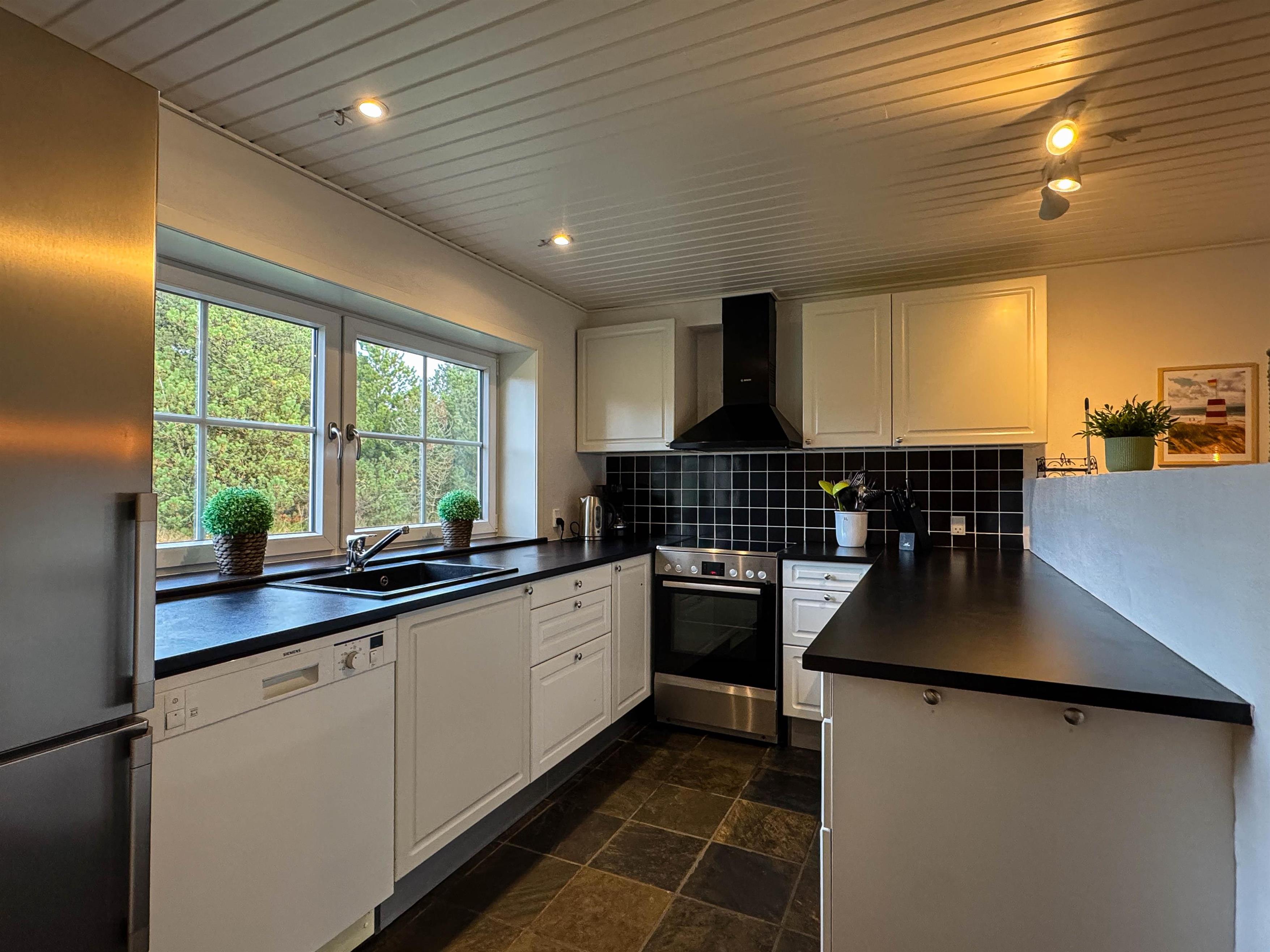 Sommerhusets 139 m2 er fordelt på 2 plan, og i stueetagen finder i det veludstyrede køkken i åben forbindelse med alrummet og stuen. Køkkenet er udstyret med opvaskemaskine, mikroovn og en separat fryser på 60 liter, så det er nemt at lave lækker feriemad og lade maskinerne ordne arbejdet.