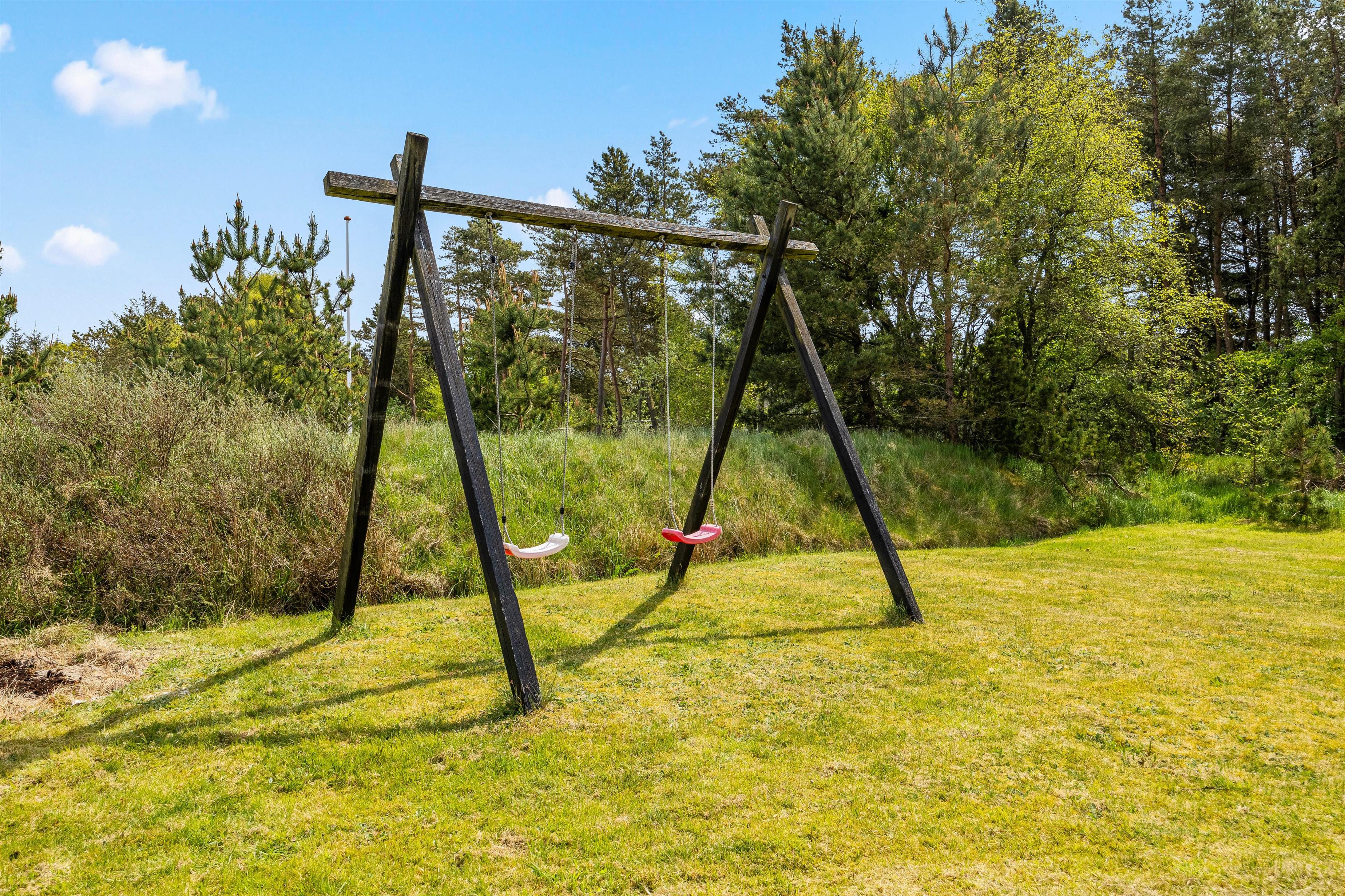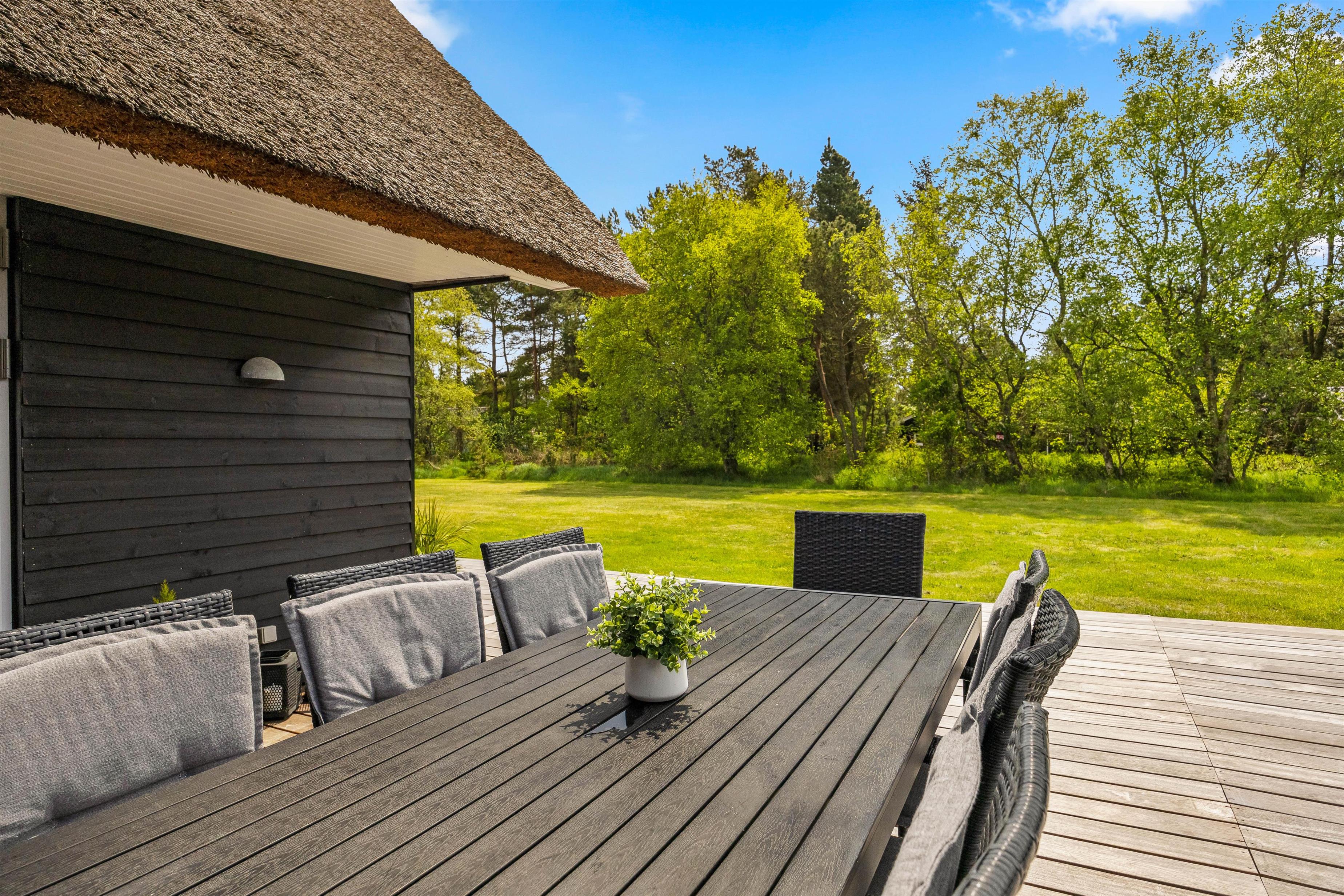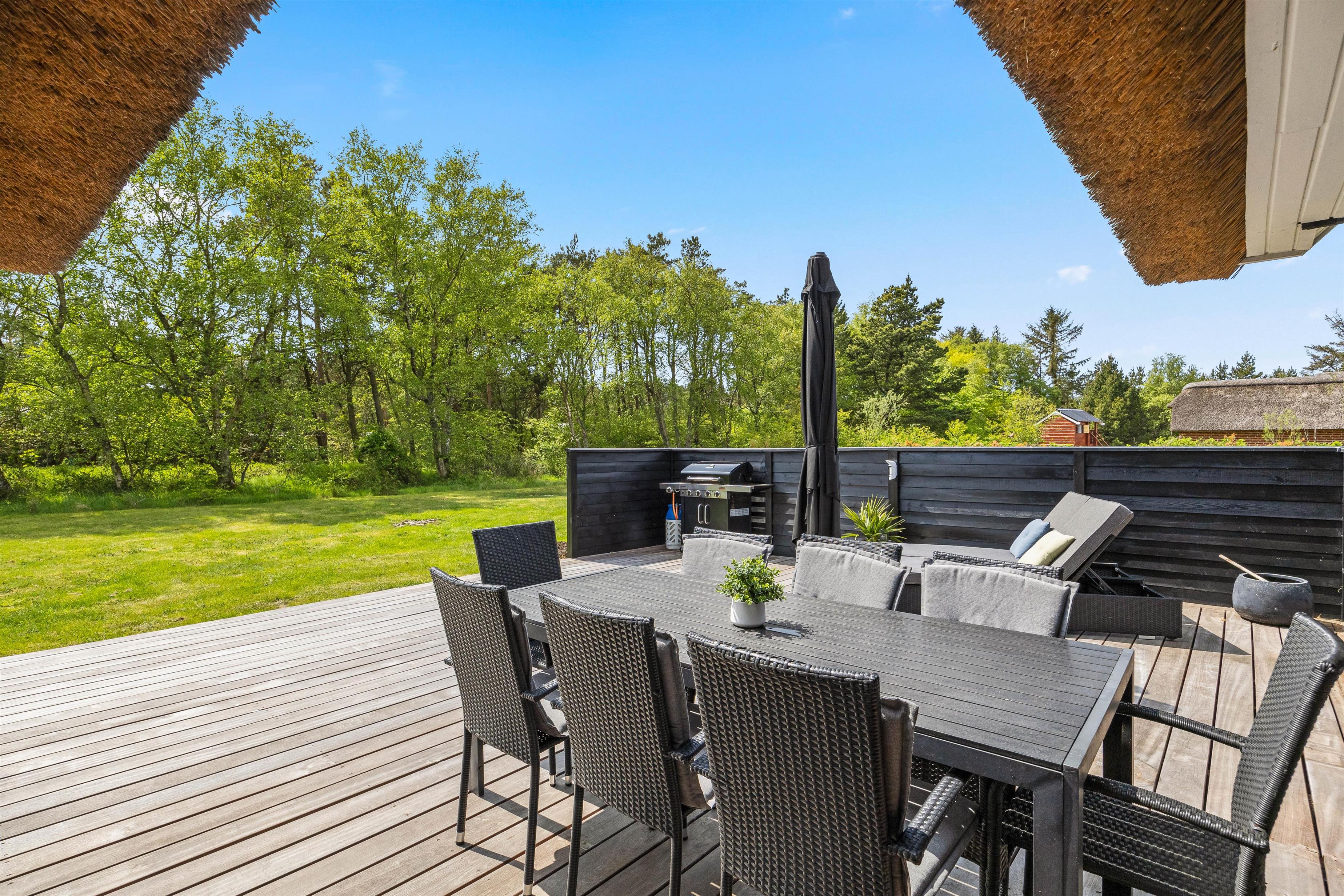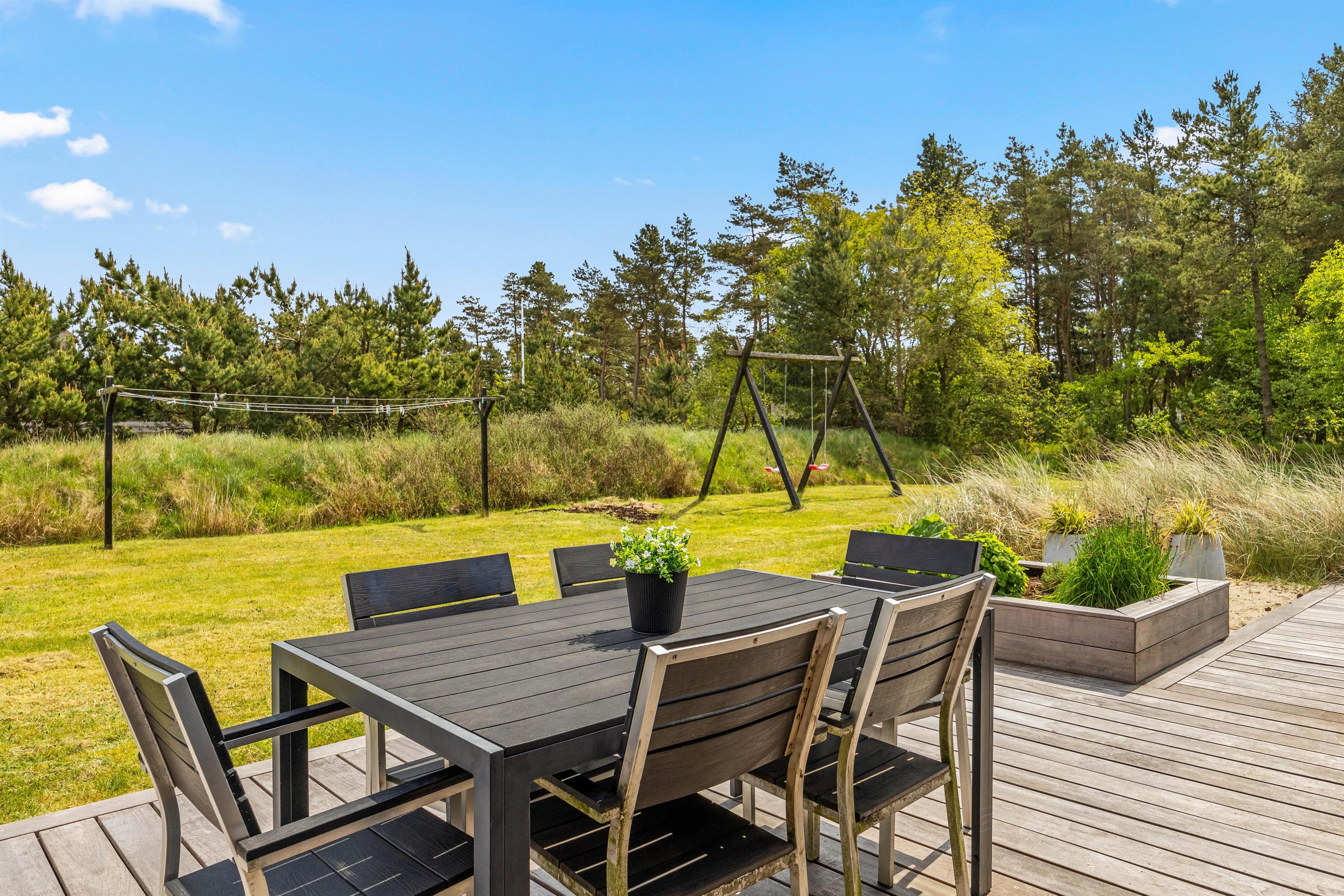 Til sommerhuset hører en skøn, afskærmet træterrasse, som uden tvivl kommer til at være samlingspunktet på de lune sommerdage. Her kan I nyde solen og slappe af i de komfortable havemøbler, mens børnene leger på den 2630 m2 kombinerede natur- og plænegrund, hvor der også er gyngestativ.