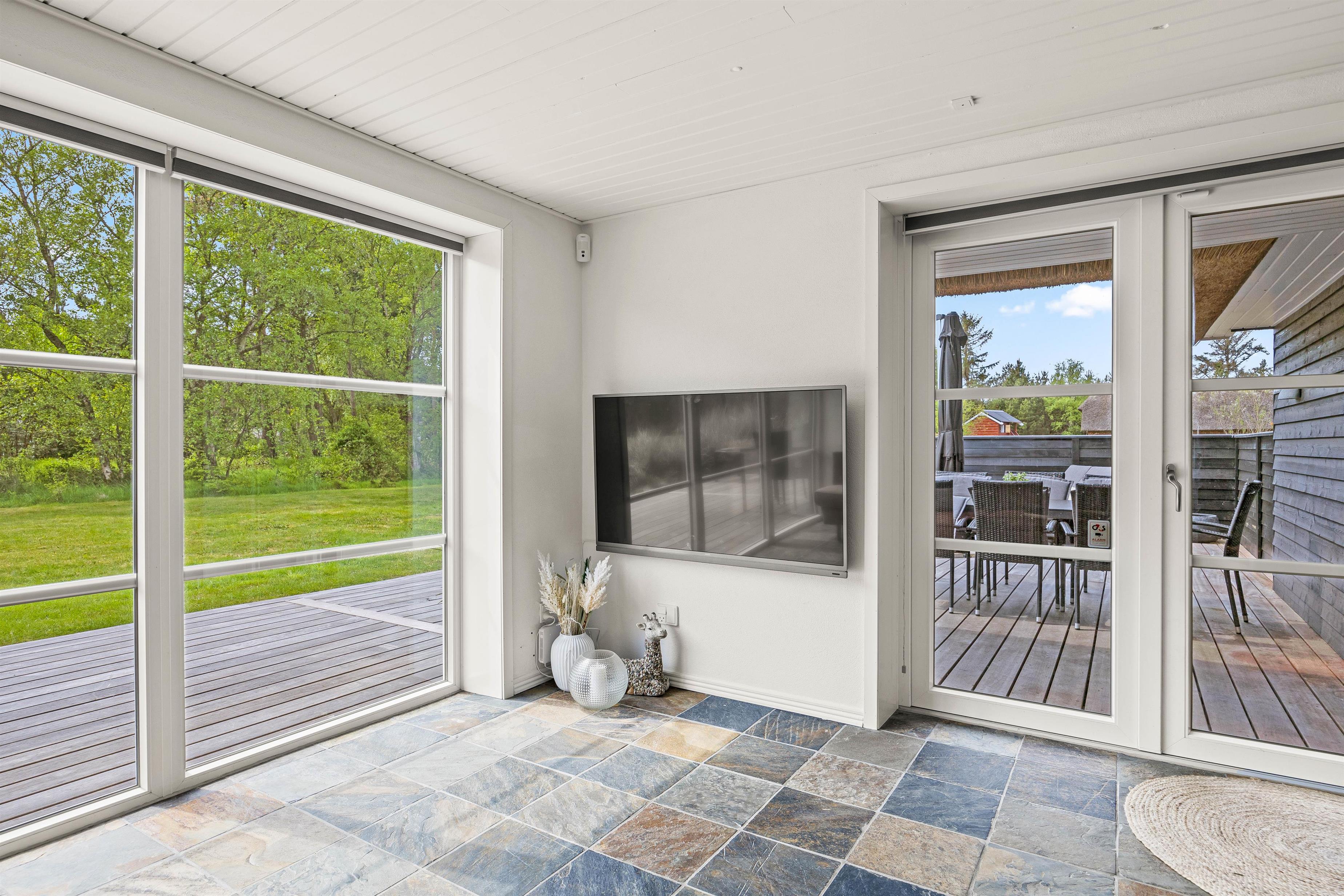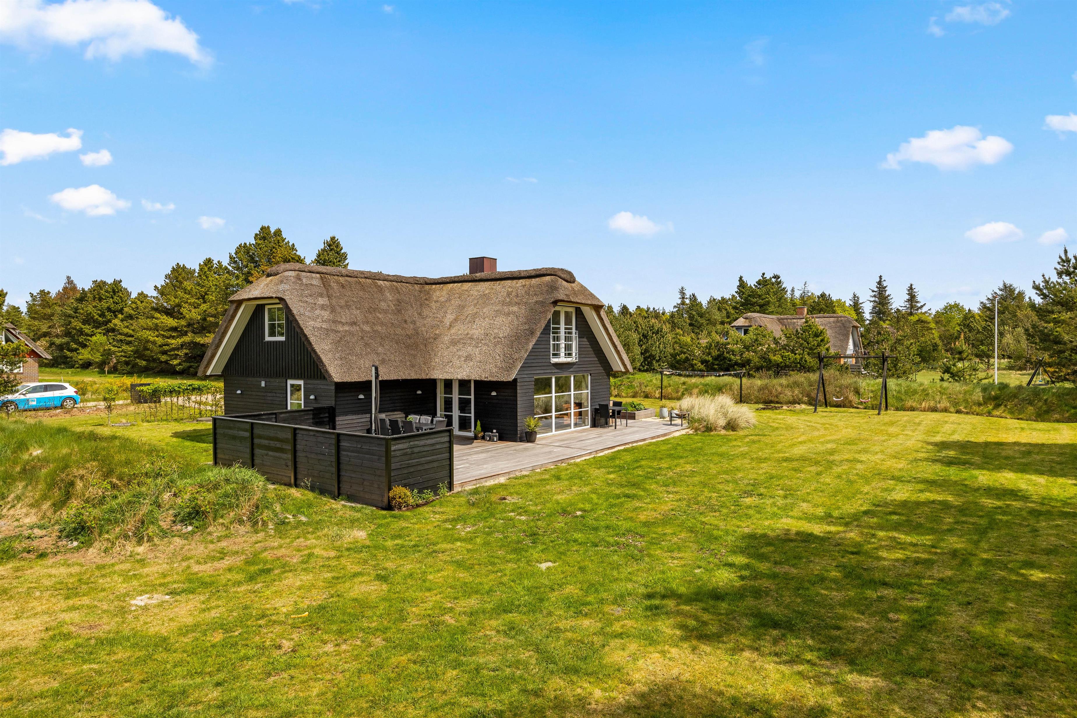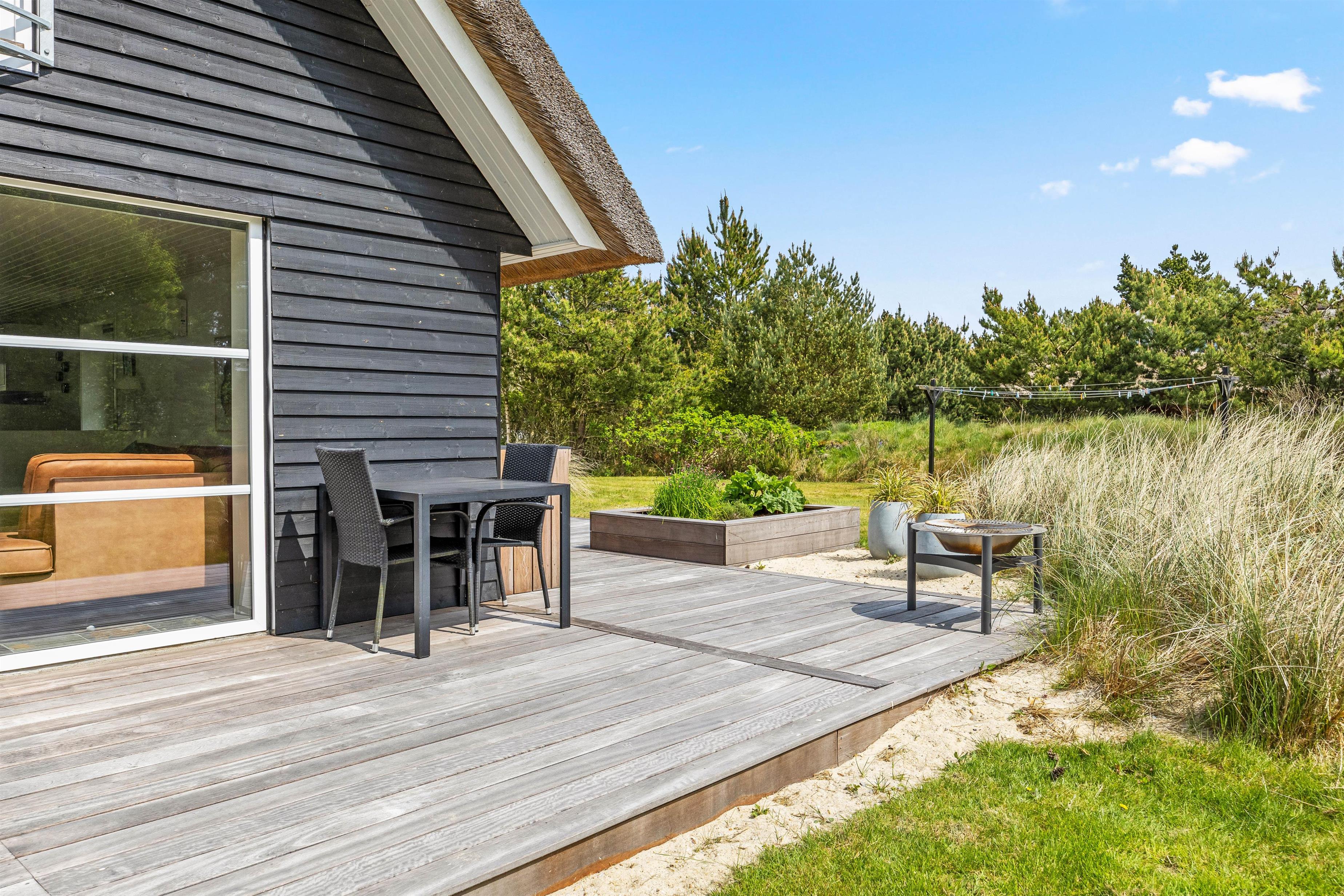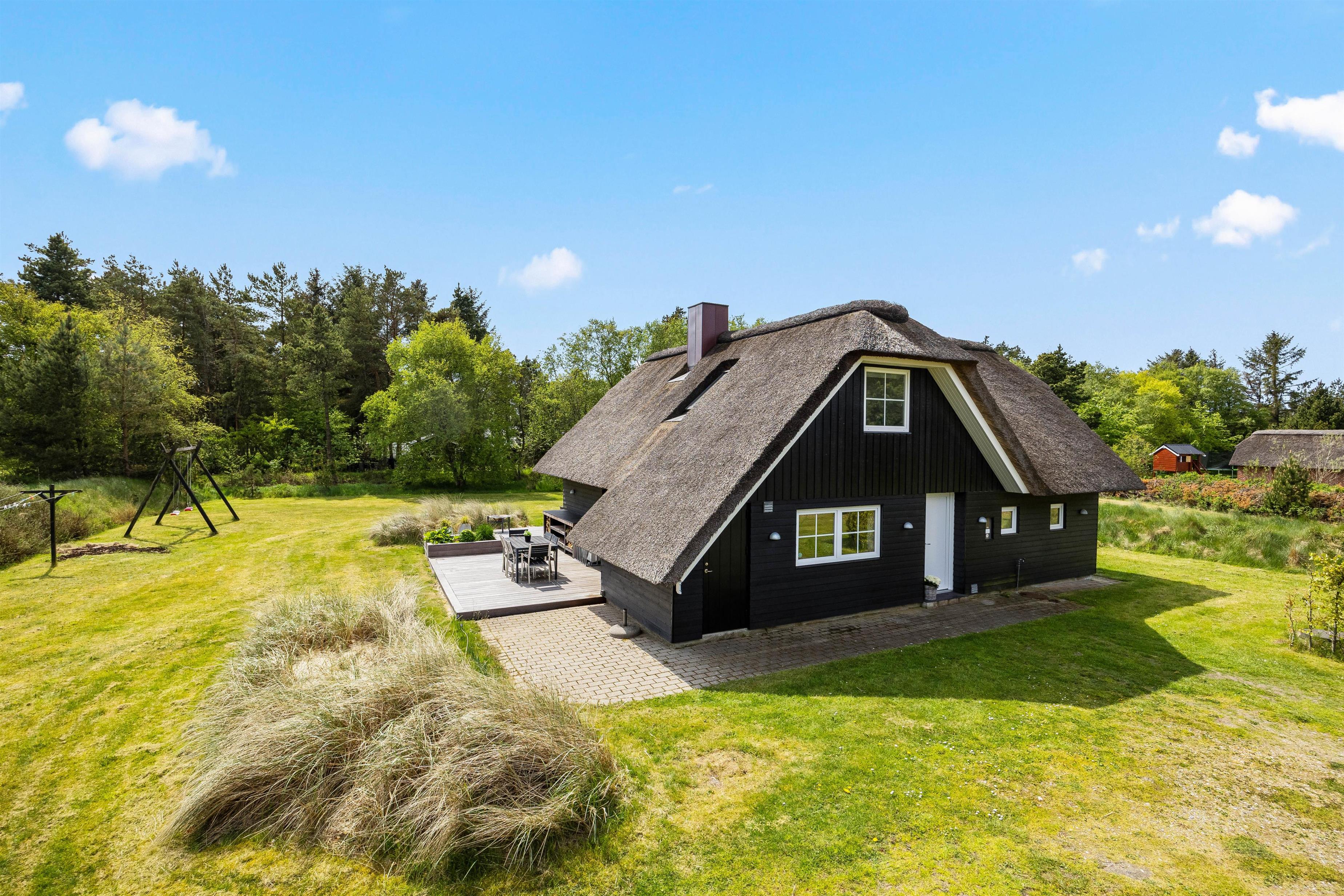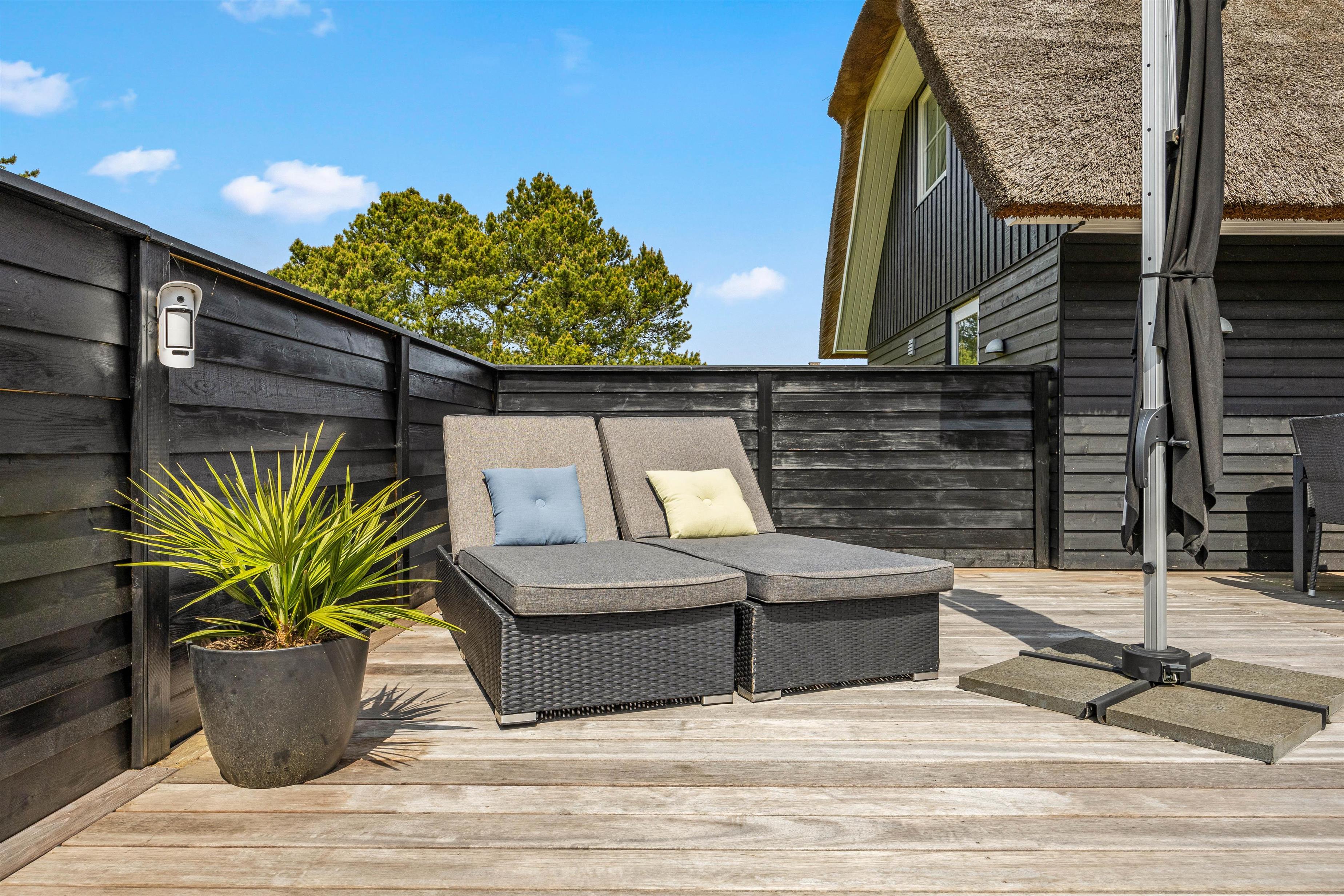 Til sommerhuset hører en skøn, afskærmet træterrasse, som uden tvivl kommer til at være samlingspunktet på de lune sommerdage. Her kan I nyde solen og slappe af i de komfortable havemøbler, mens børnene leger på den 2630 m2 kombinerede natur- og plænegrund, hvor der også er gyngestativ.