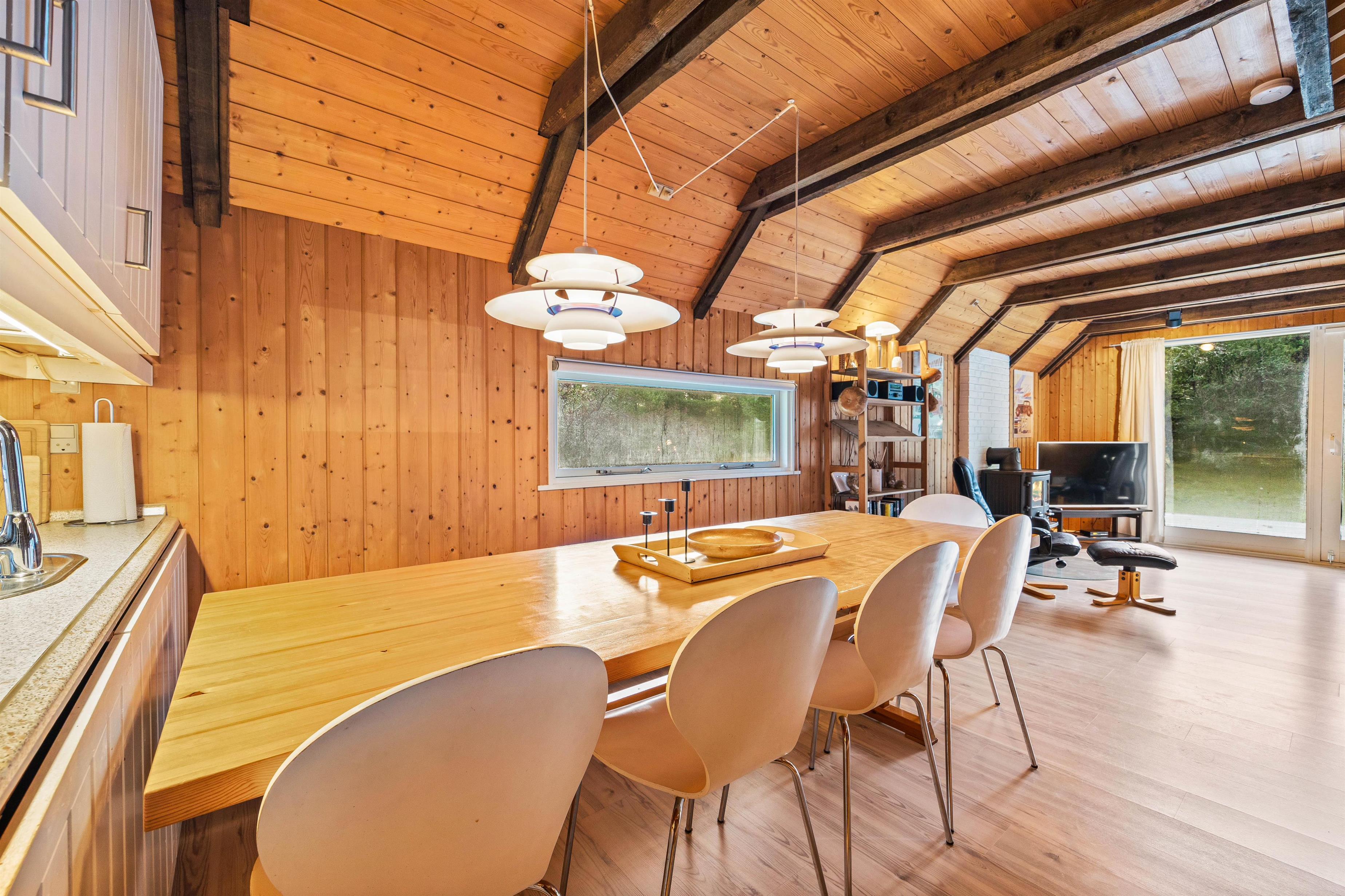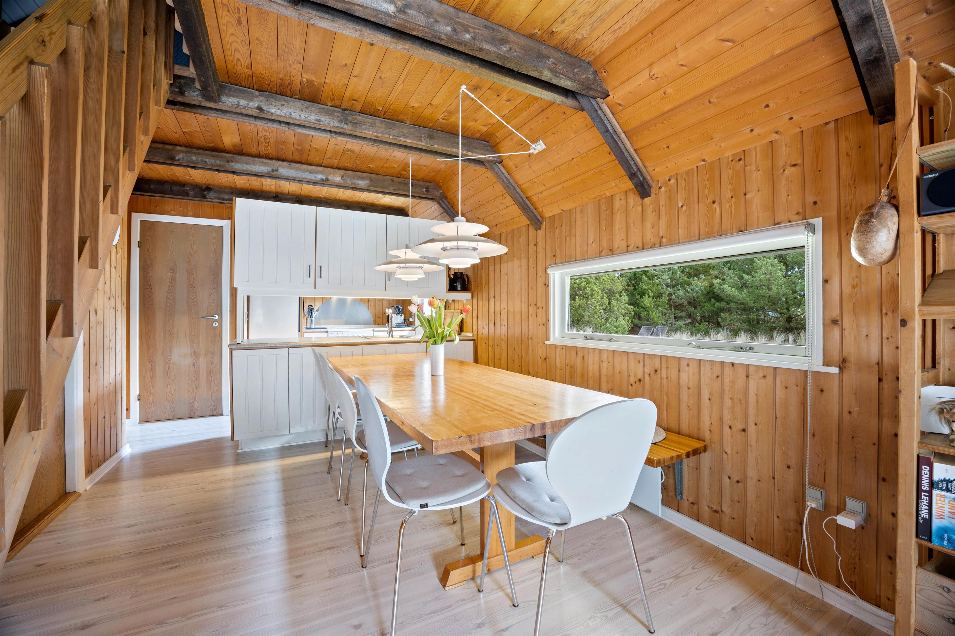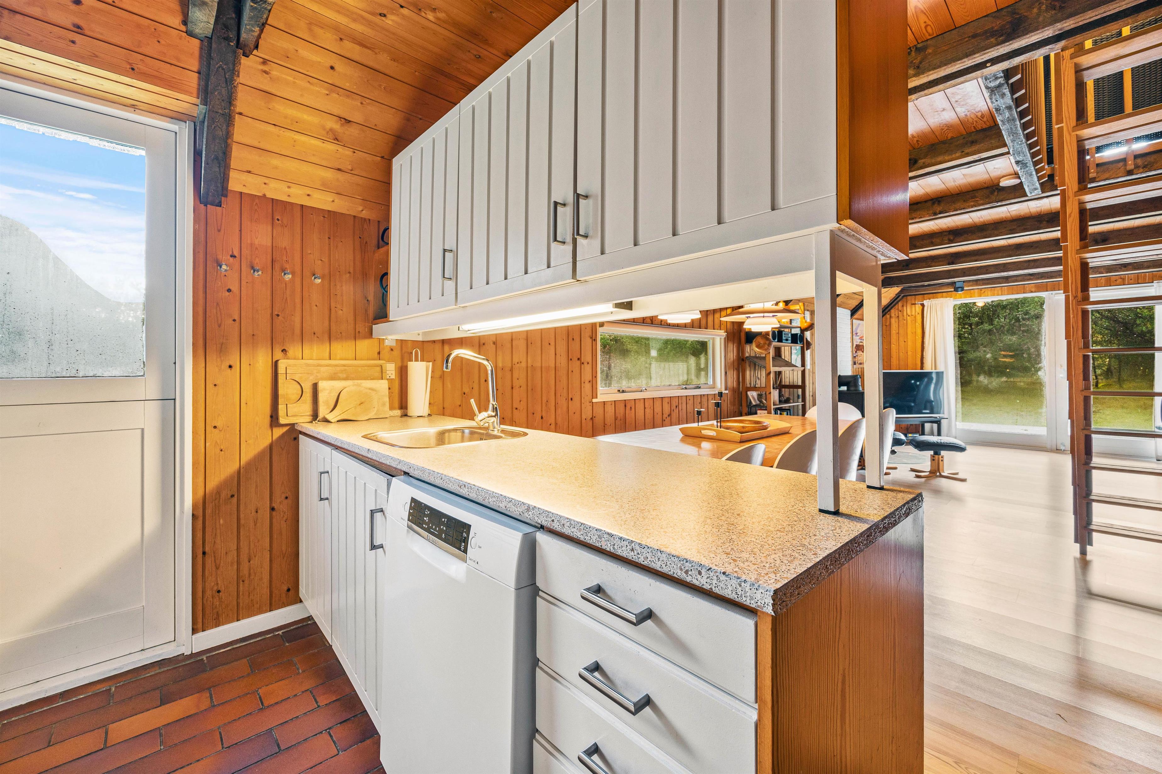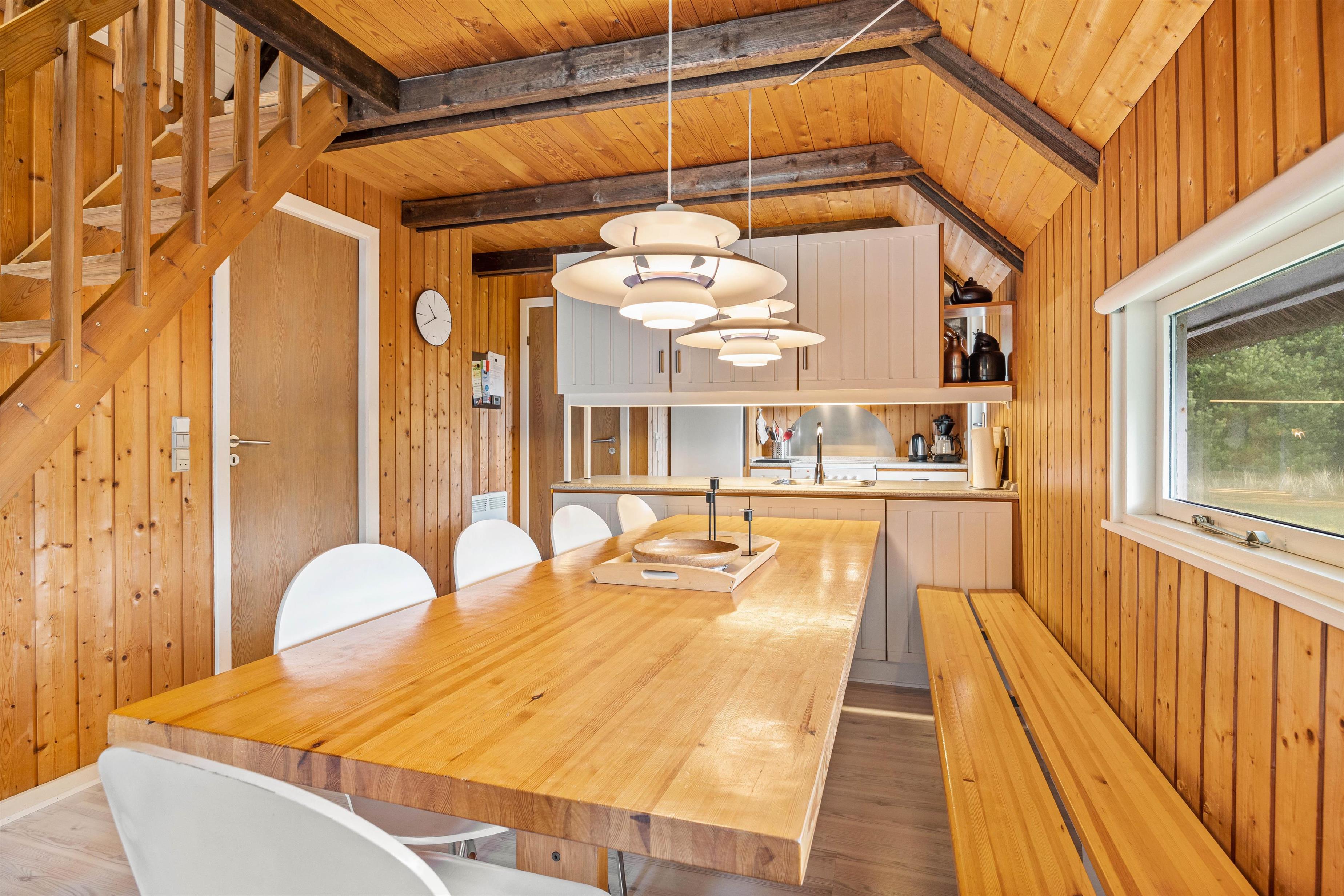 Sommerhusets rustikke indretning og de skønne omgivelser skaber gode rammer for jeres ferie. Køkken og stue er i åben forbindelse og udgør på den måde ét stort rum, hvor hele familien kan samles og nyde godt samvær.