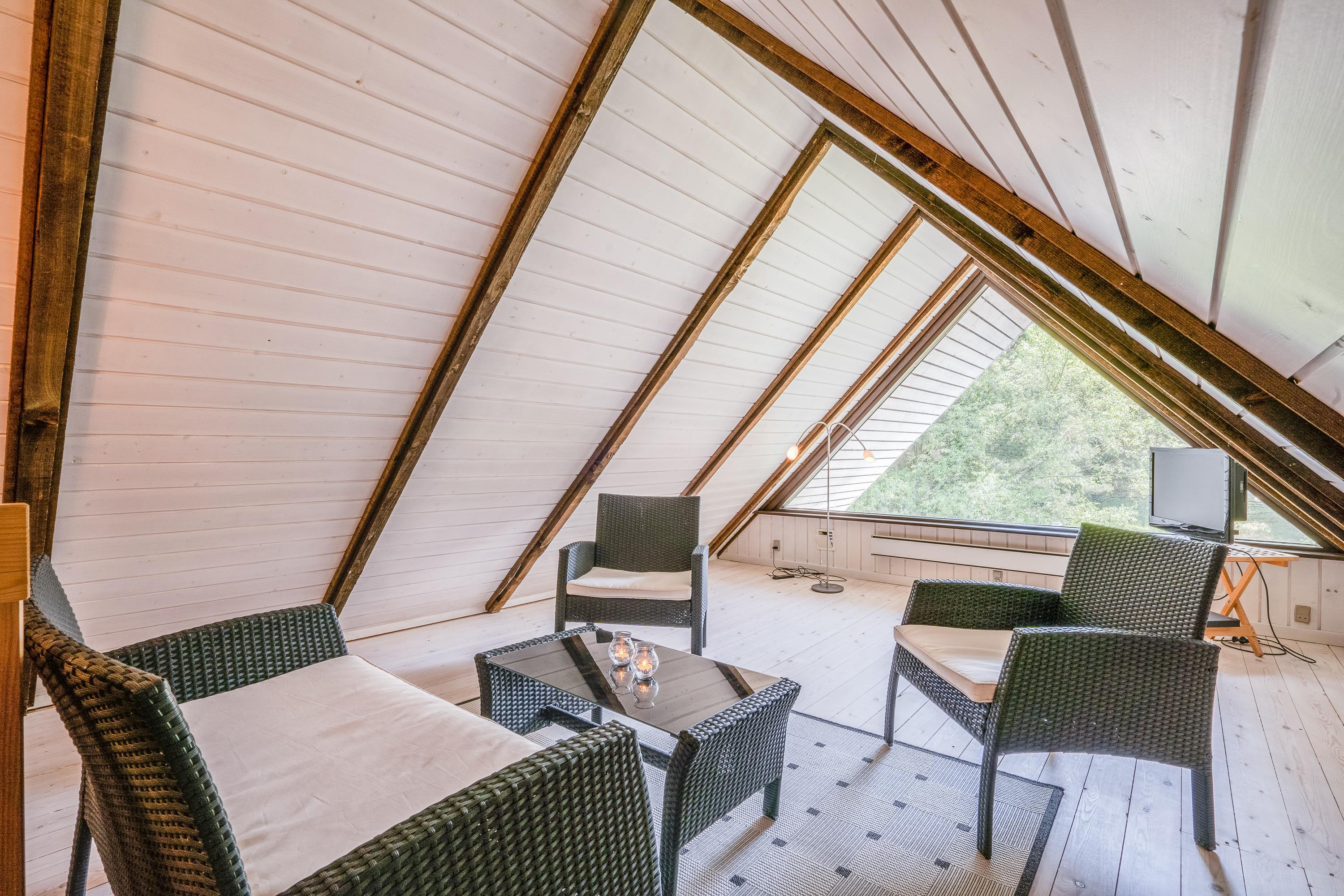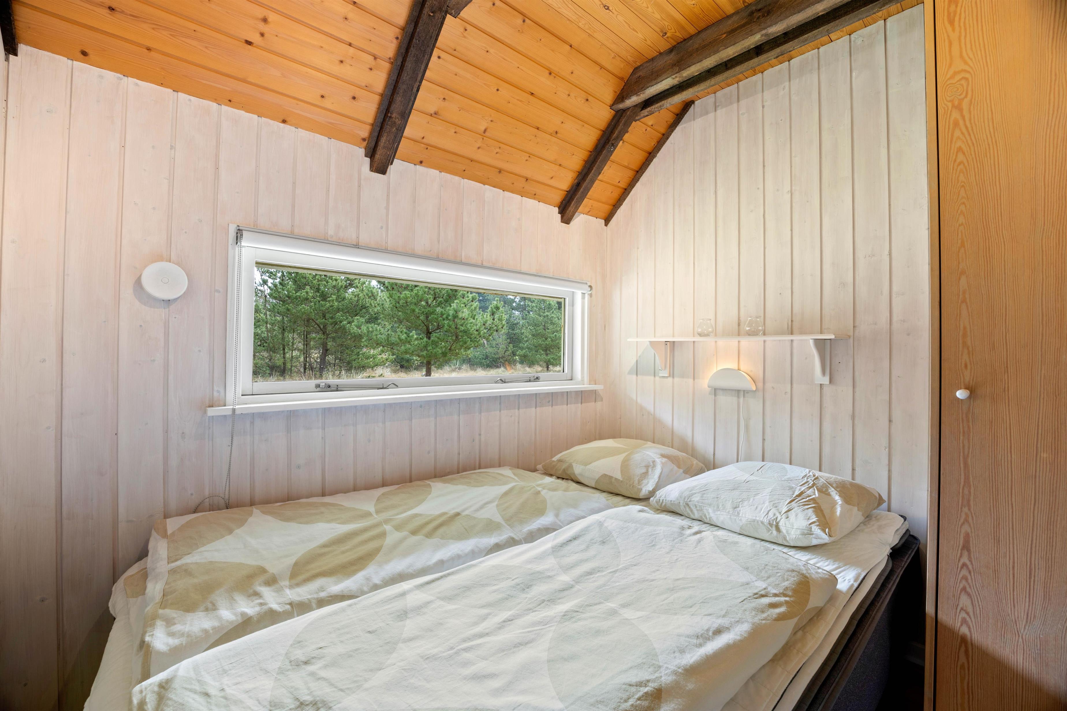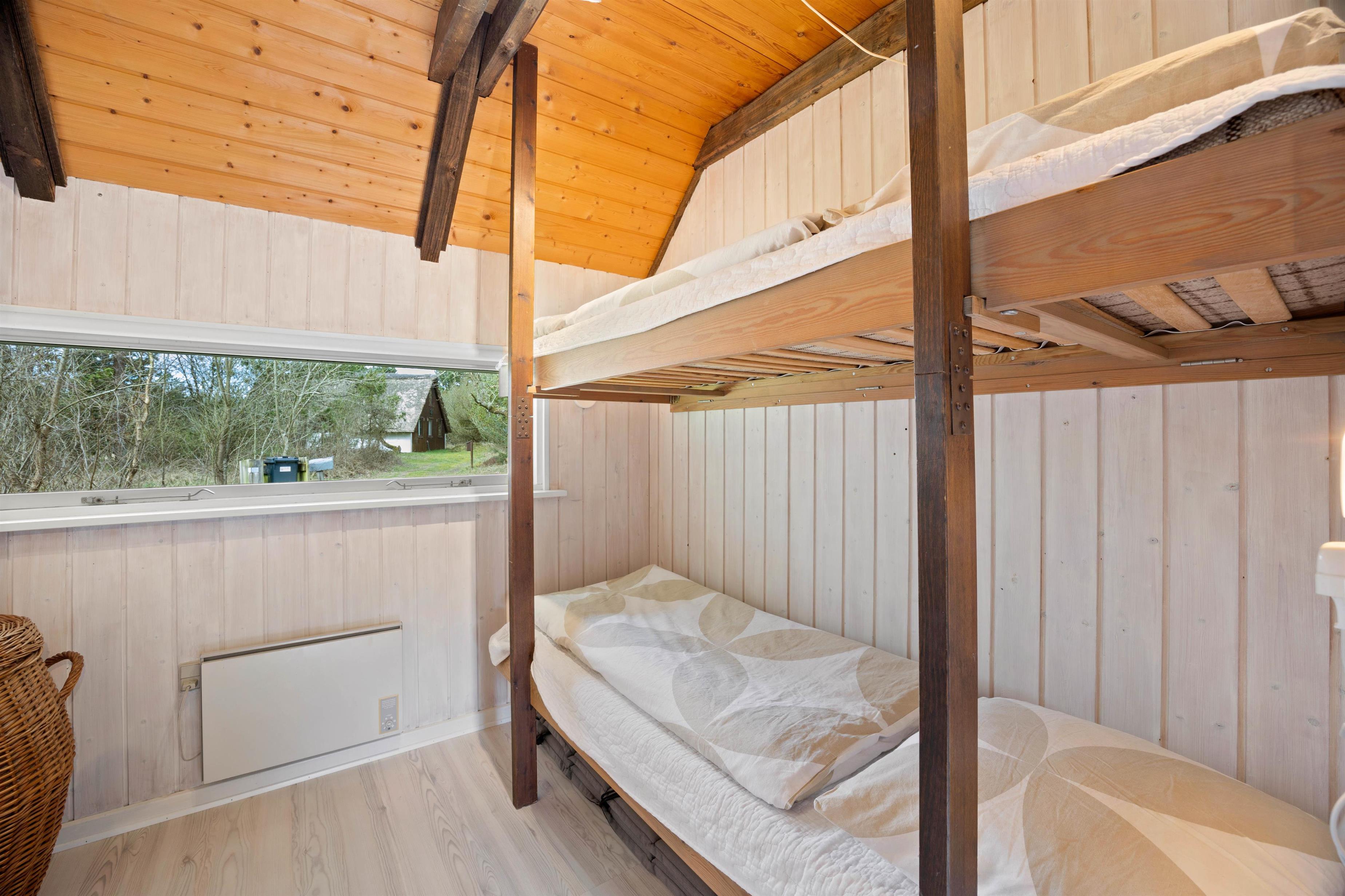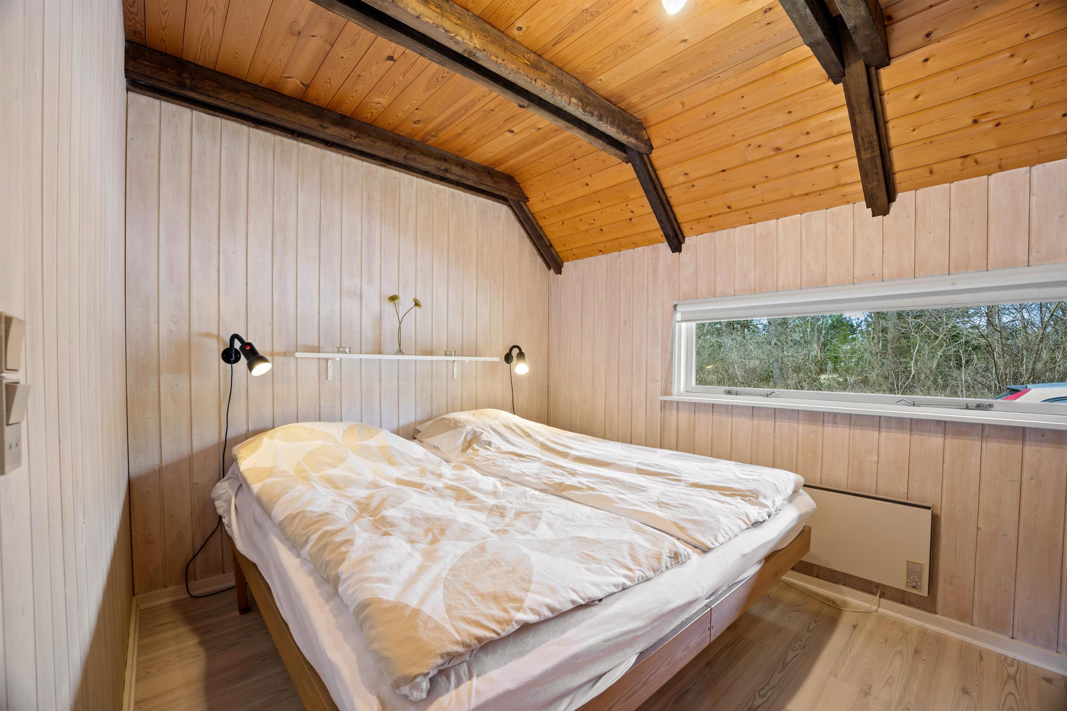 Sommerhusets 6 sovepladser fordeler sig på 4 soveværelser – 3 med dobbeltseng og 1 værelse med en etageseng. Yderligere har sommerhuset et badeværelse med gulvvarme. På første sal har I desuden en god udsigt ud over den smukke natur, som omgiver sommerhuset. Alle sommerhusets rum er lyse og indrettet med træbjælker både på loft og vægge, som skaber den helt rigtige atmosfære.