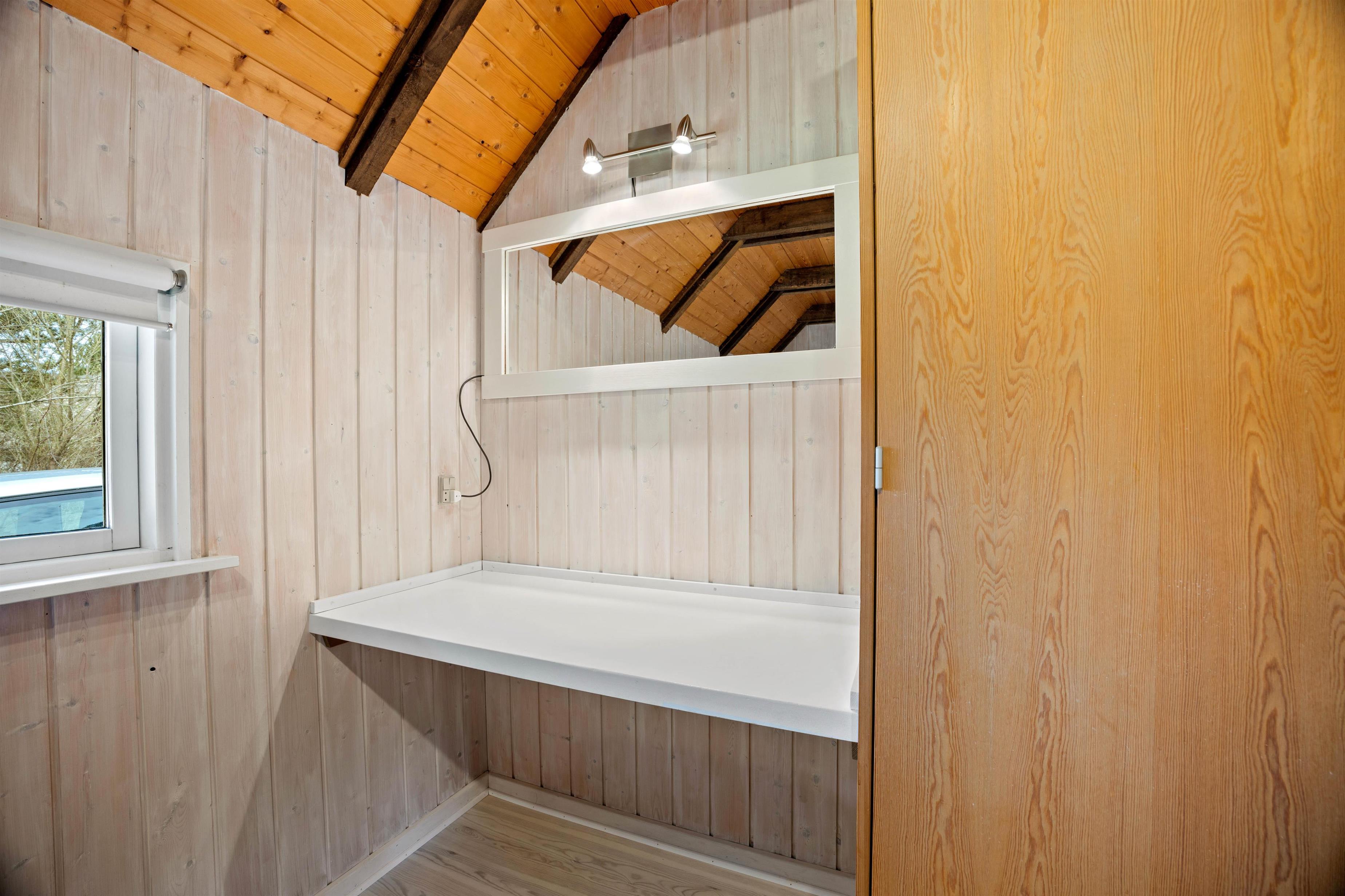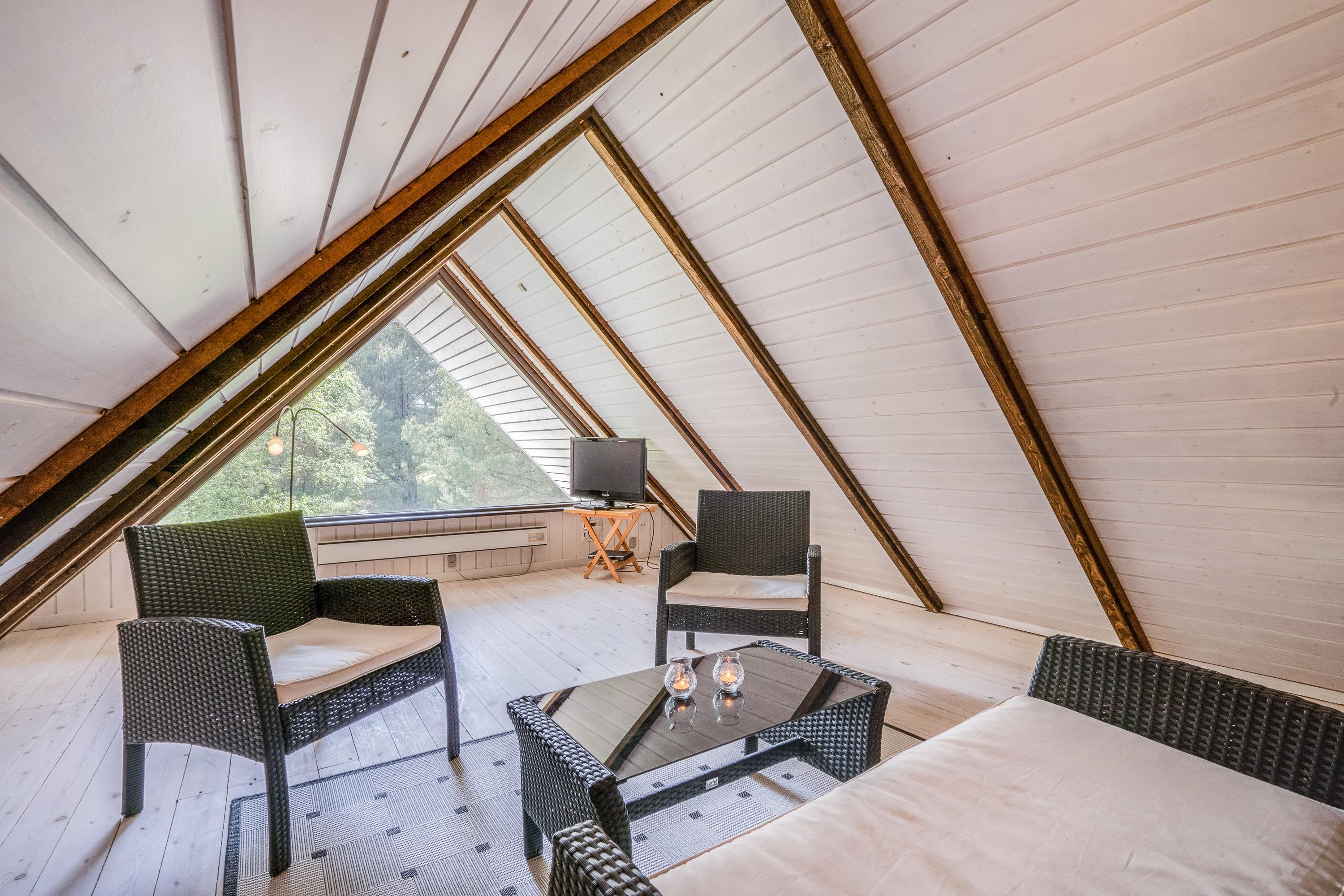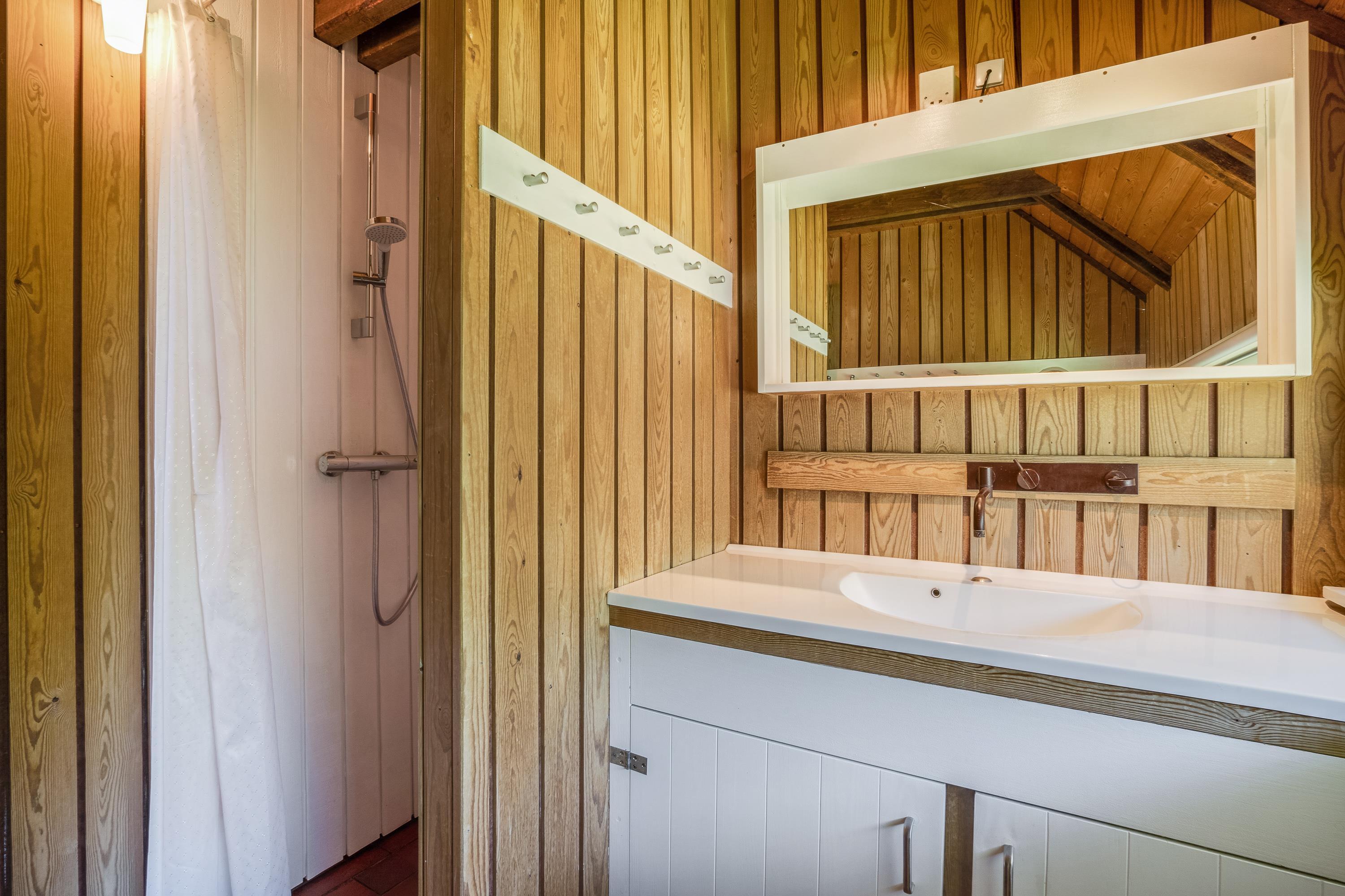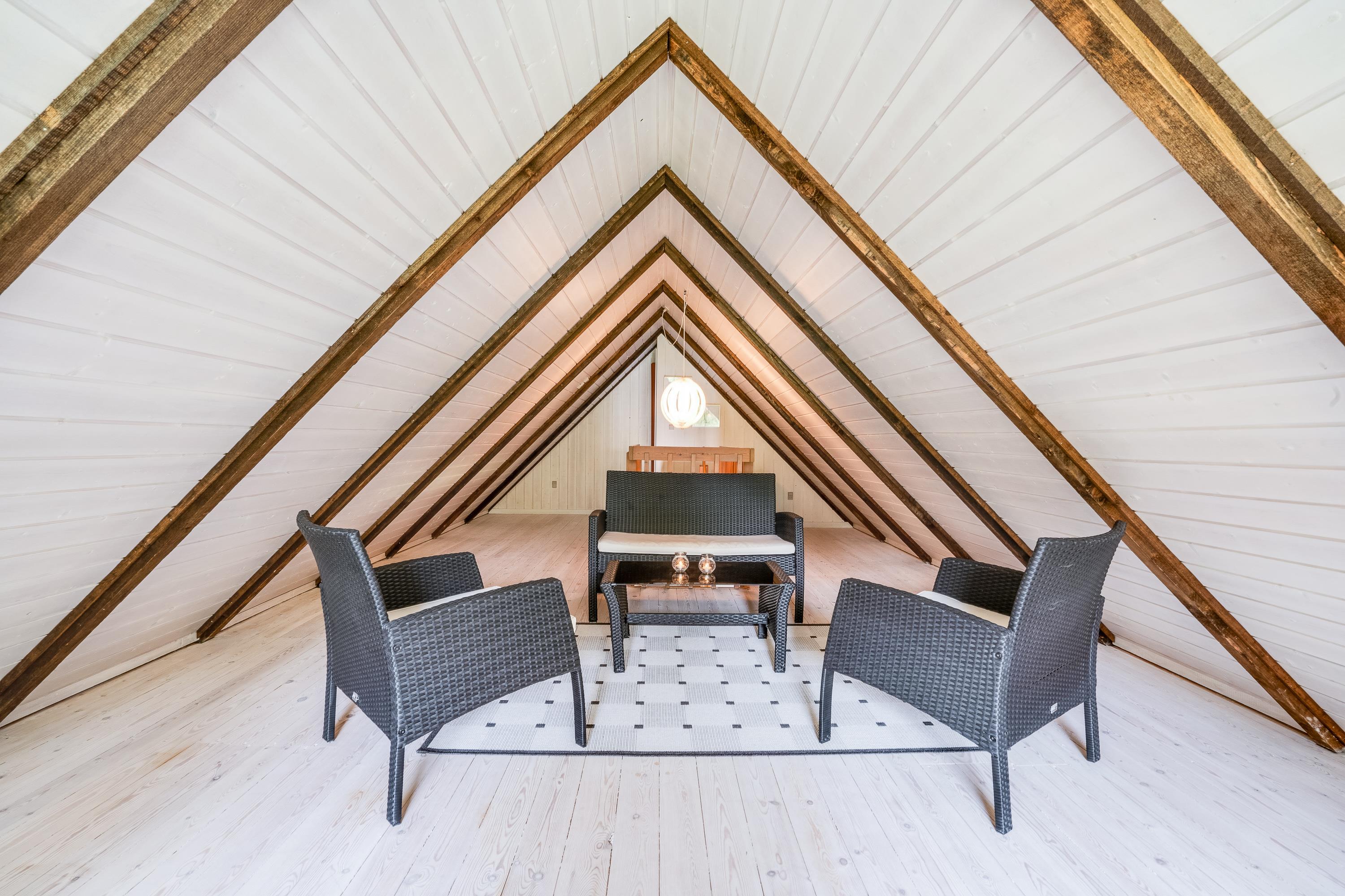 Sommerhusets 6 sovepladser fordeler sig på 4 soveværelser – 3 med dobbeltseng og 1 værelse med en etageseng. Yderligere har sommerhuset et badeværelse med gulvvarme. På første sal har I desuden en god udsigt ud over den smukke natur, som omgiver sommerhuset. Alle sommerhusets rum er lyse og indrettet med træbjælker både på loft og vægge, som skaber den helt rigtige atmosfære.