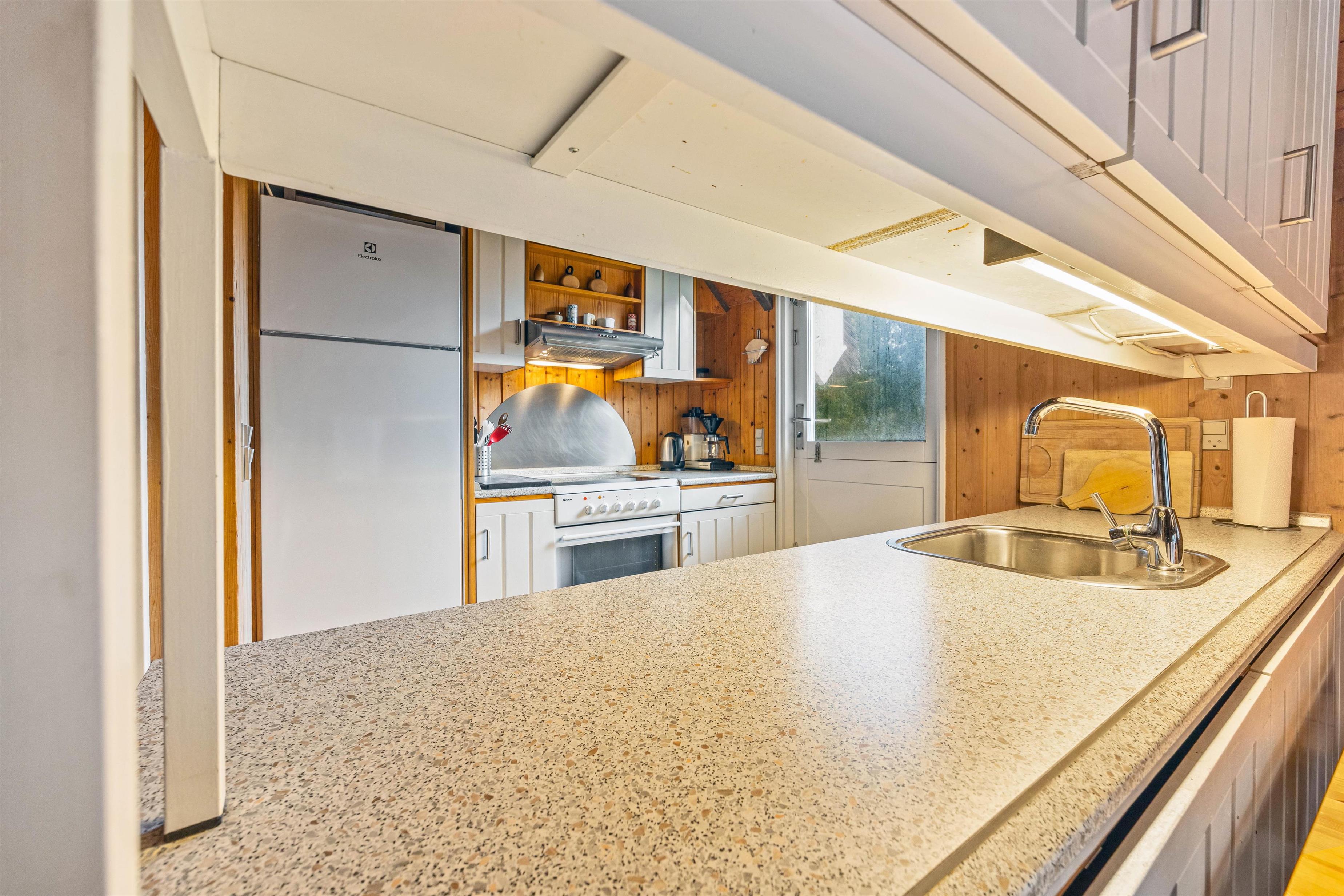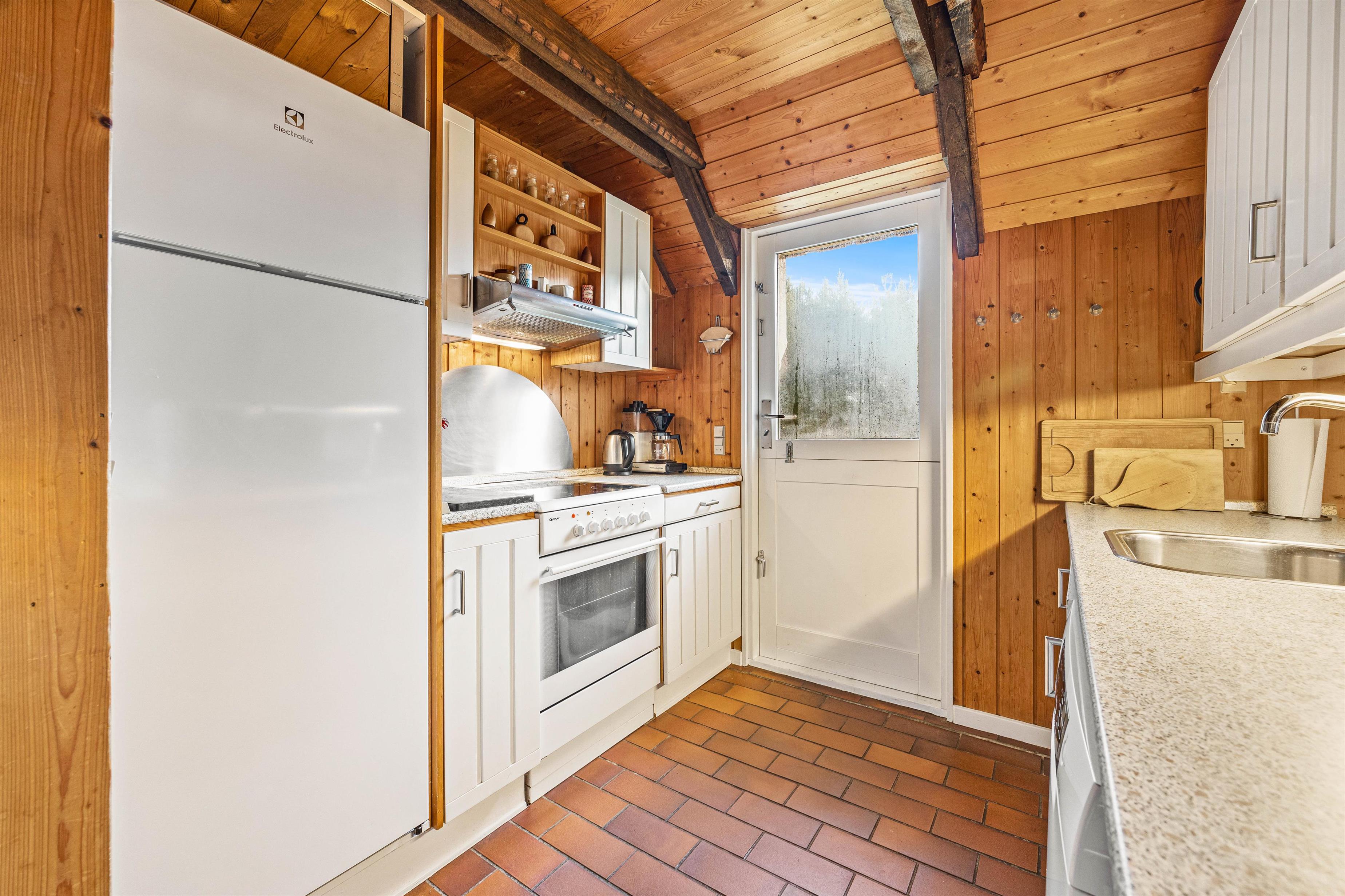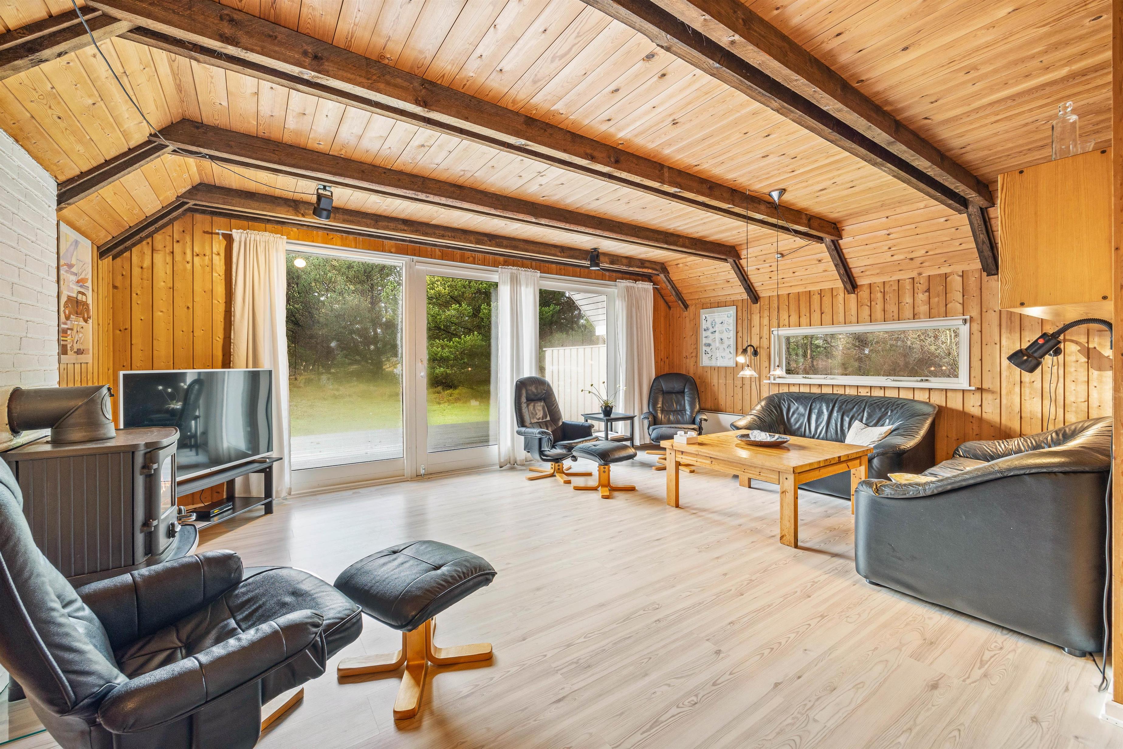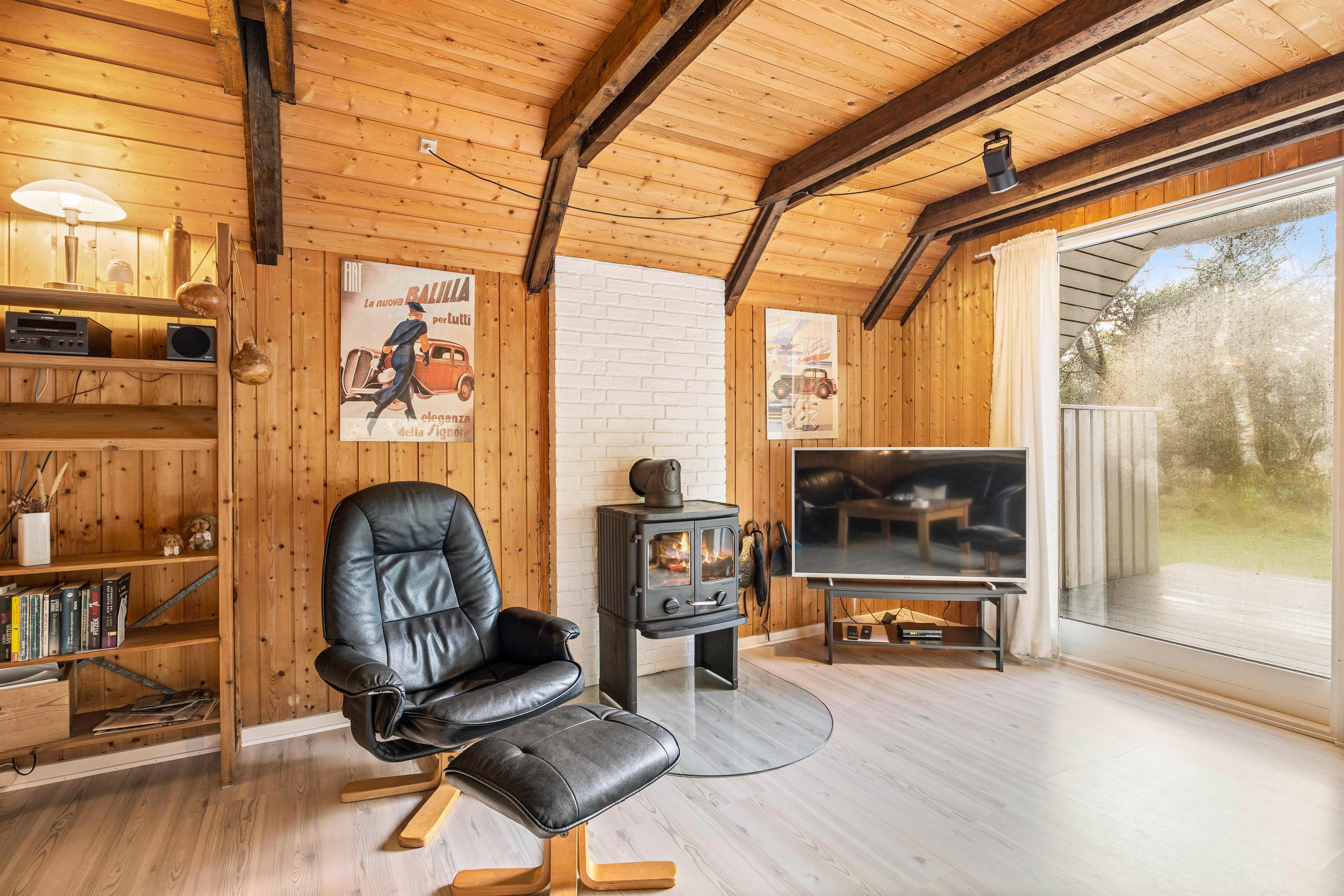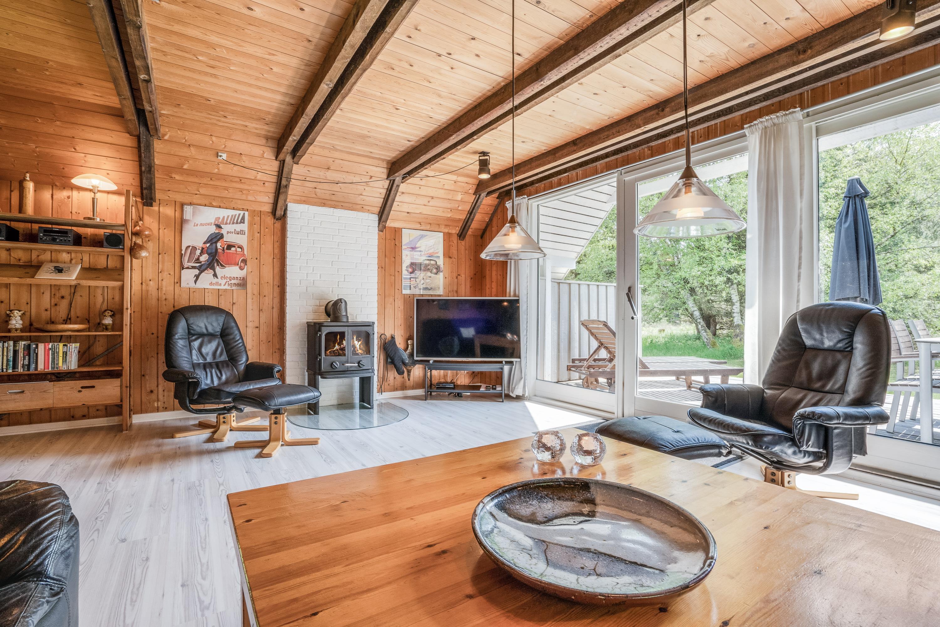 Køkkenet er selvfølgelig udstyret med opvaskemaskine, som klarer den værste opvask for jer. I stuen kan I se jeres yndlingsfilm på sommerhusets fladskærms-tv, mens I varmer jer foran brændeovnen.