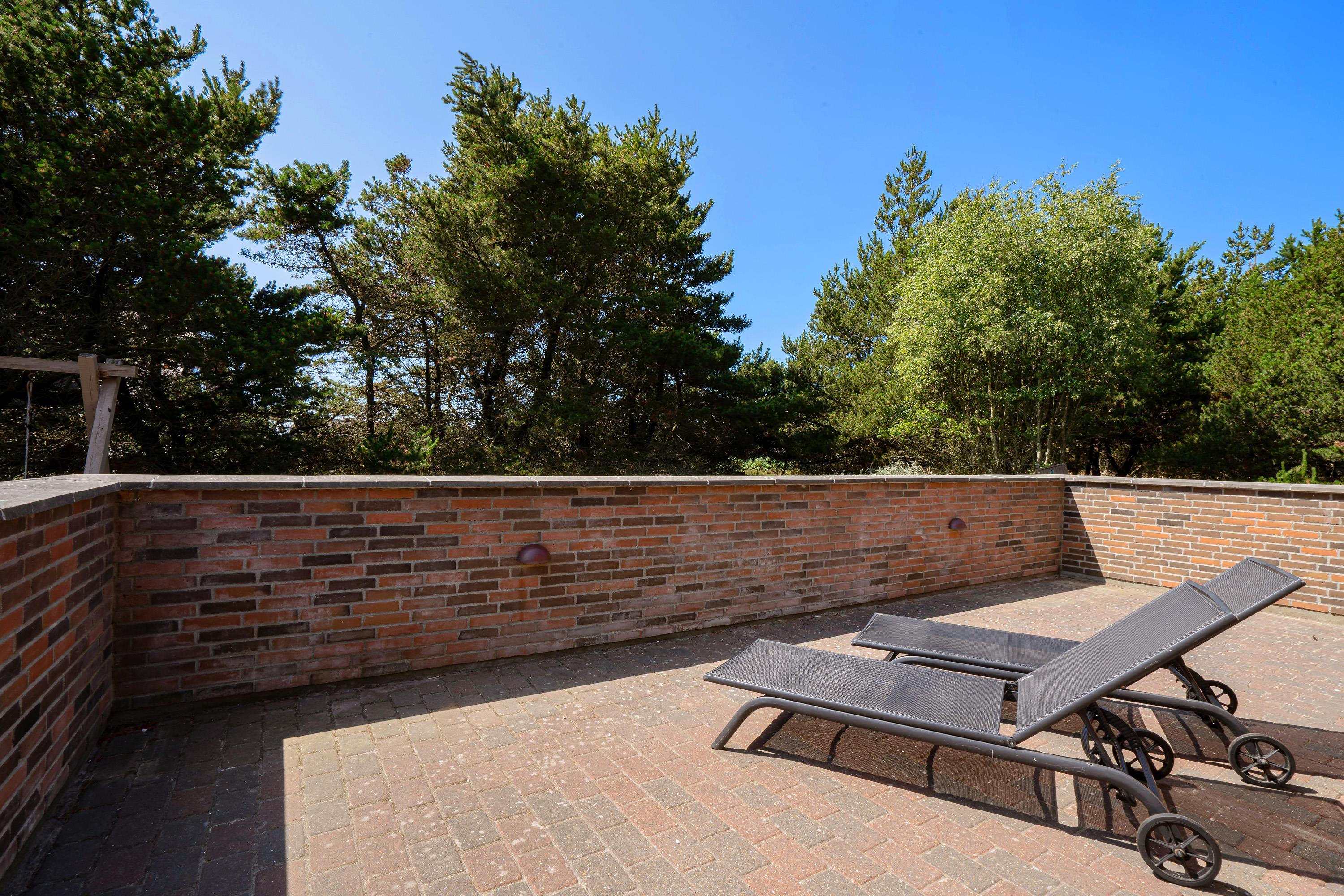 Feriehuset har en skøn afskærmet terrasse, som I kan nyde feriens varme dage fra. Her står både havemøbler og liggestole klar, så I kan finde jer godt til rette på et godt spot i solen. På terrassen er der også en grill, så I kan lave en lækker grillmiddag, som I kan nyde på de lune ferieaftener.
