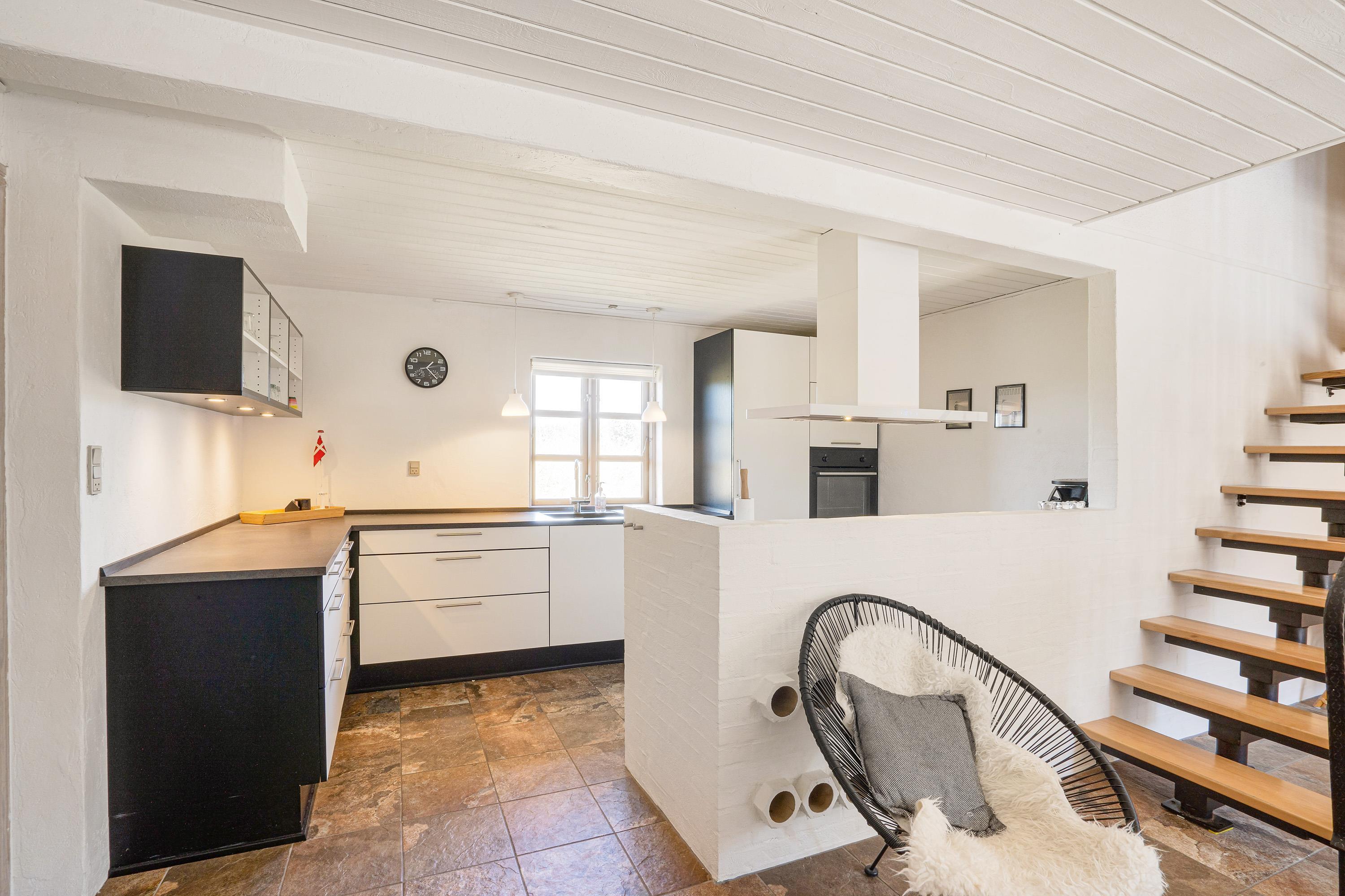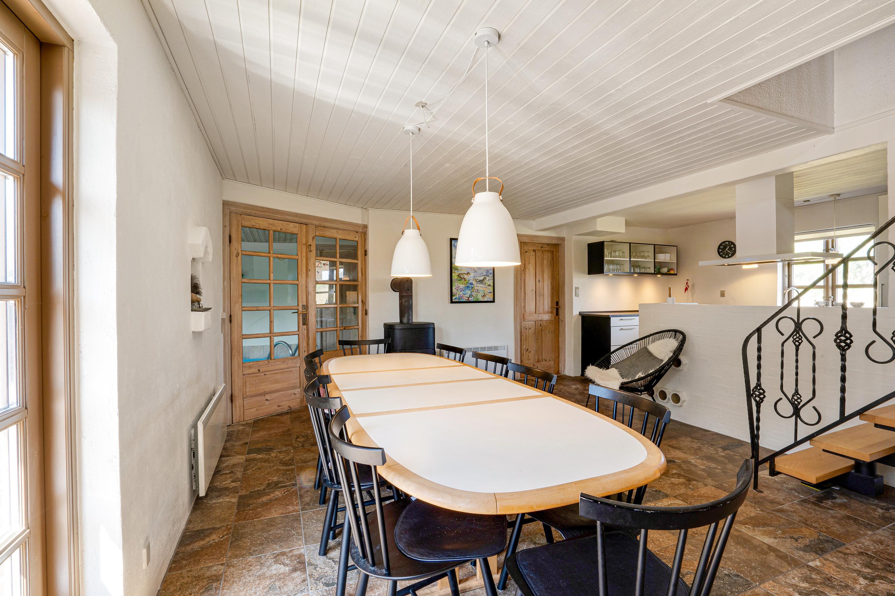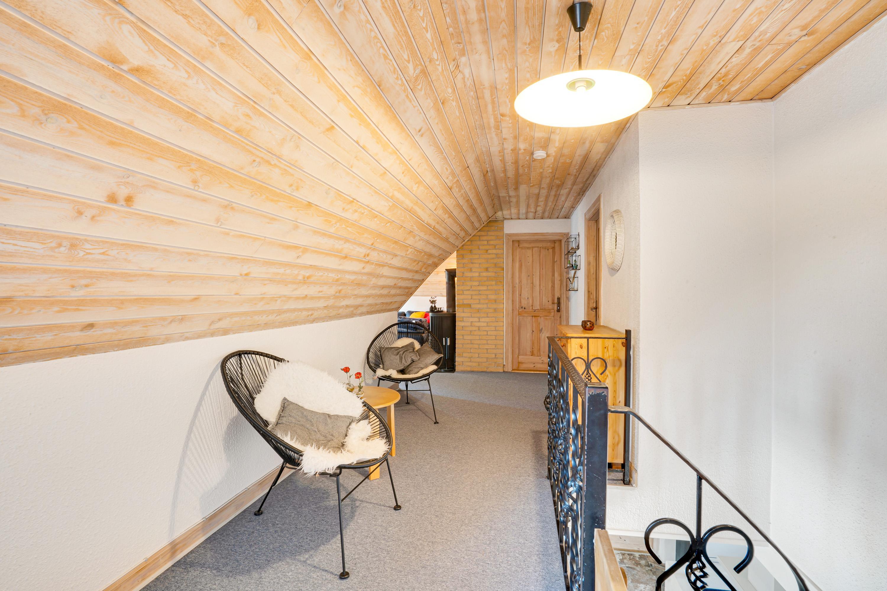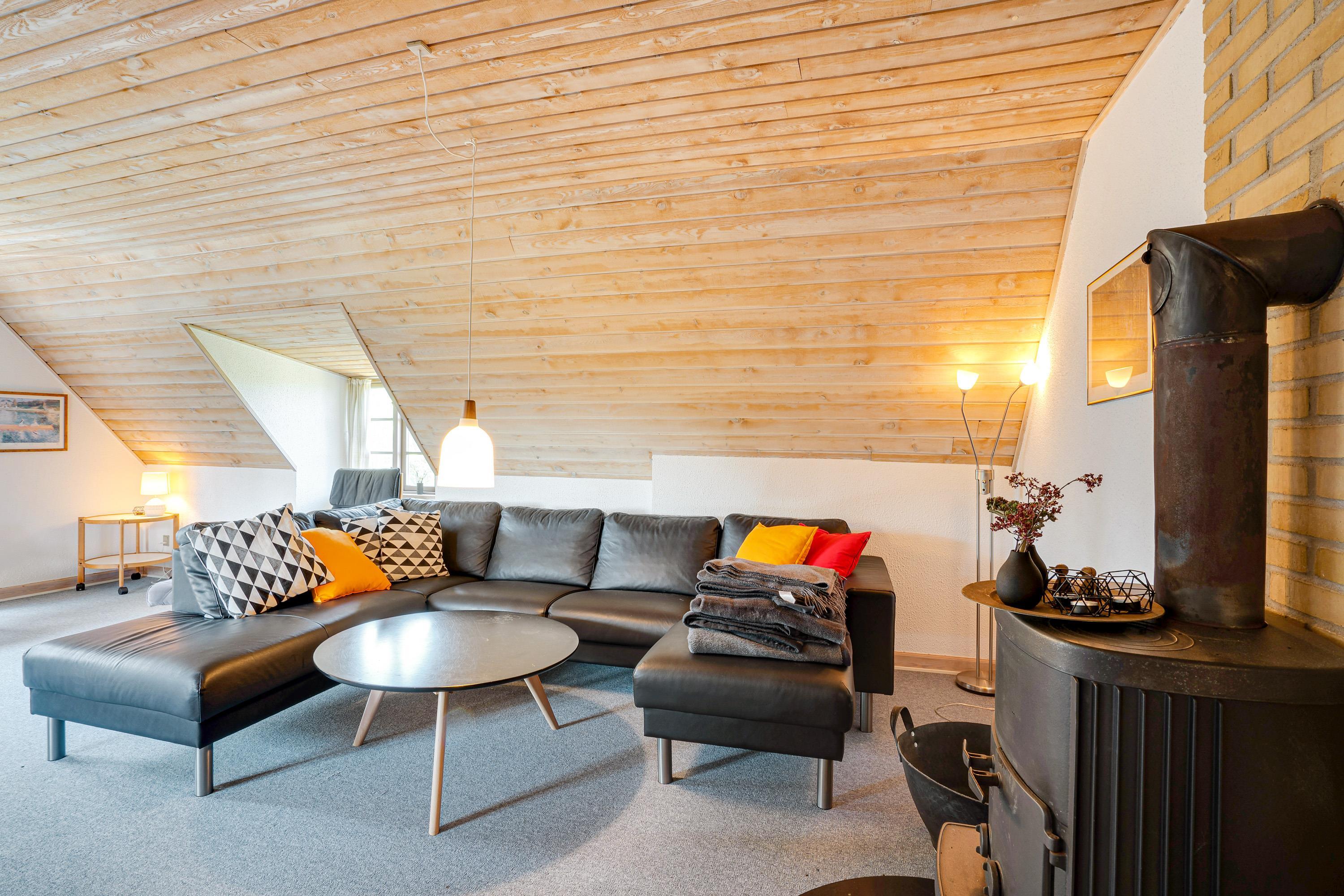 Sommerhuset er indrettet i 2 plan, og både i stueetagen og på førstesalen er der lagt op til mange hyggelige feriestunder. I stueetagen kan I samles i køkkenet til madlavning og omkring spisebordet til skønne måltider. Her sørger brændeovnen for at fuldende den hyggelige feriestemning. På førstesalen er der en opholdsstue, hvor I kan sætte jer til rette i sofaen til en god film.