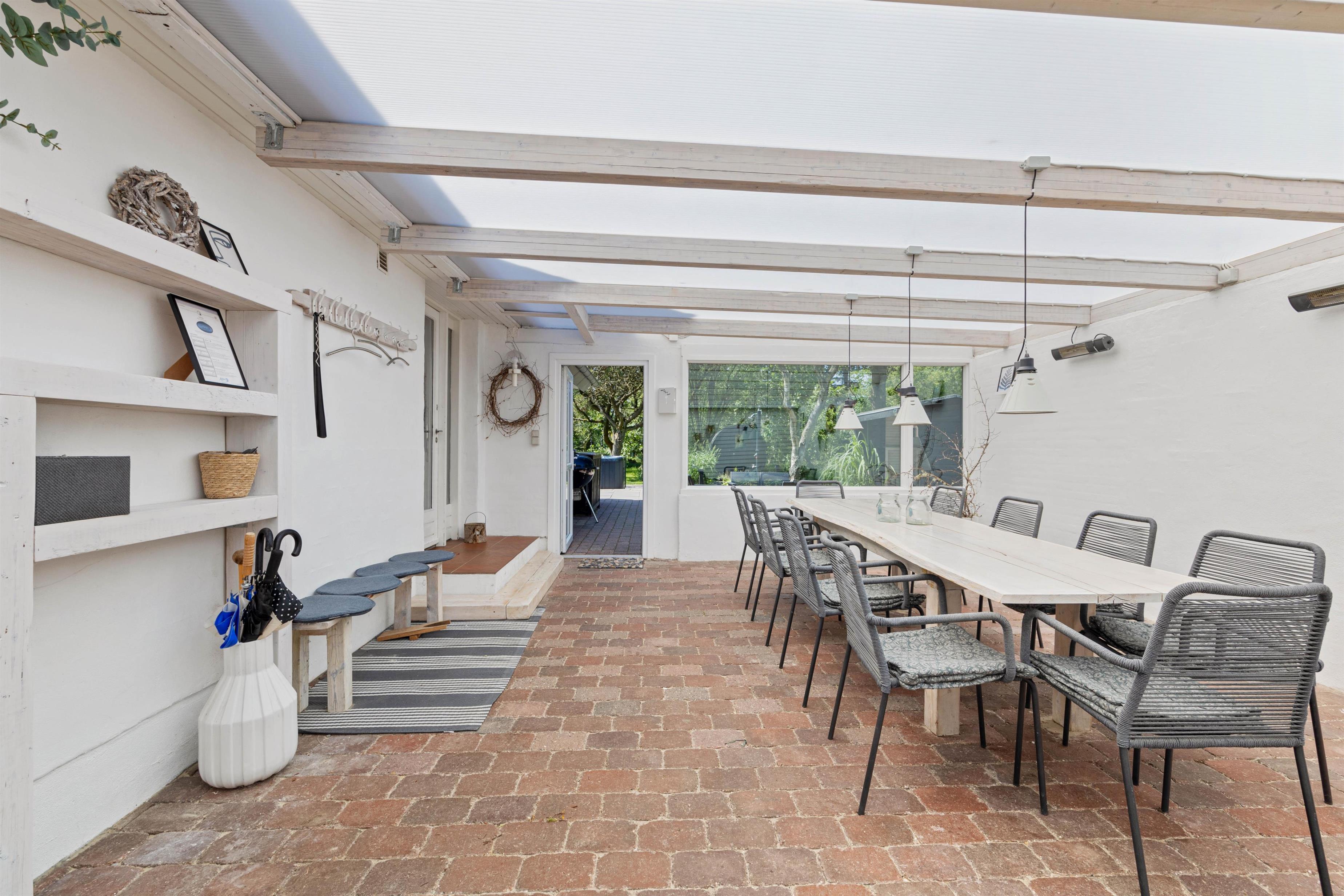 På terrasserne er der naturligvis komfortable havemøbler, hvor I kan slappe af og nyde et godt måltid fra grillen, ligesom liggestolene inviterer til afslapning og måske en lille middagslur. Feriehusets redskabsrum er åbent låsbart, så I kan roligt sætte jeres cykler ind her.