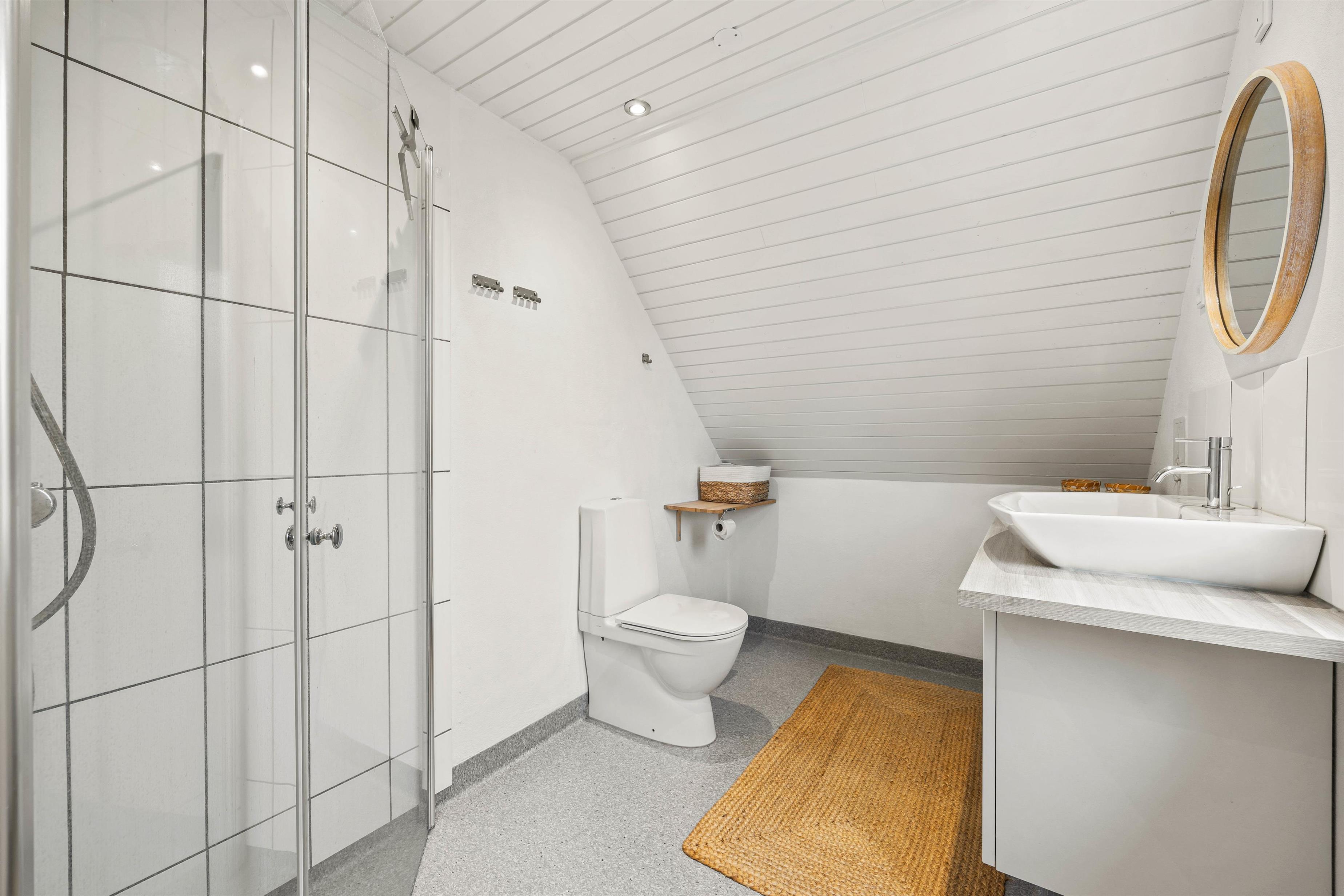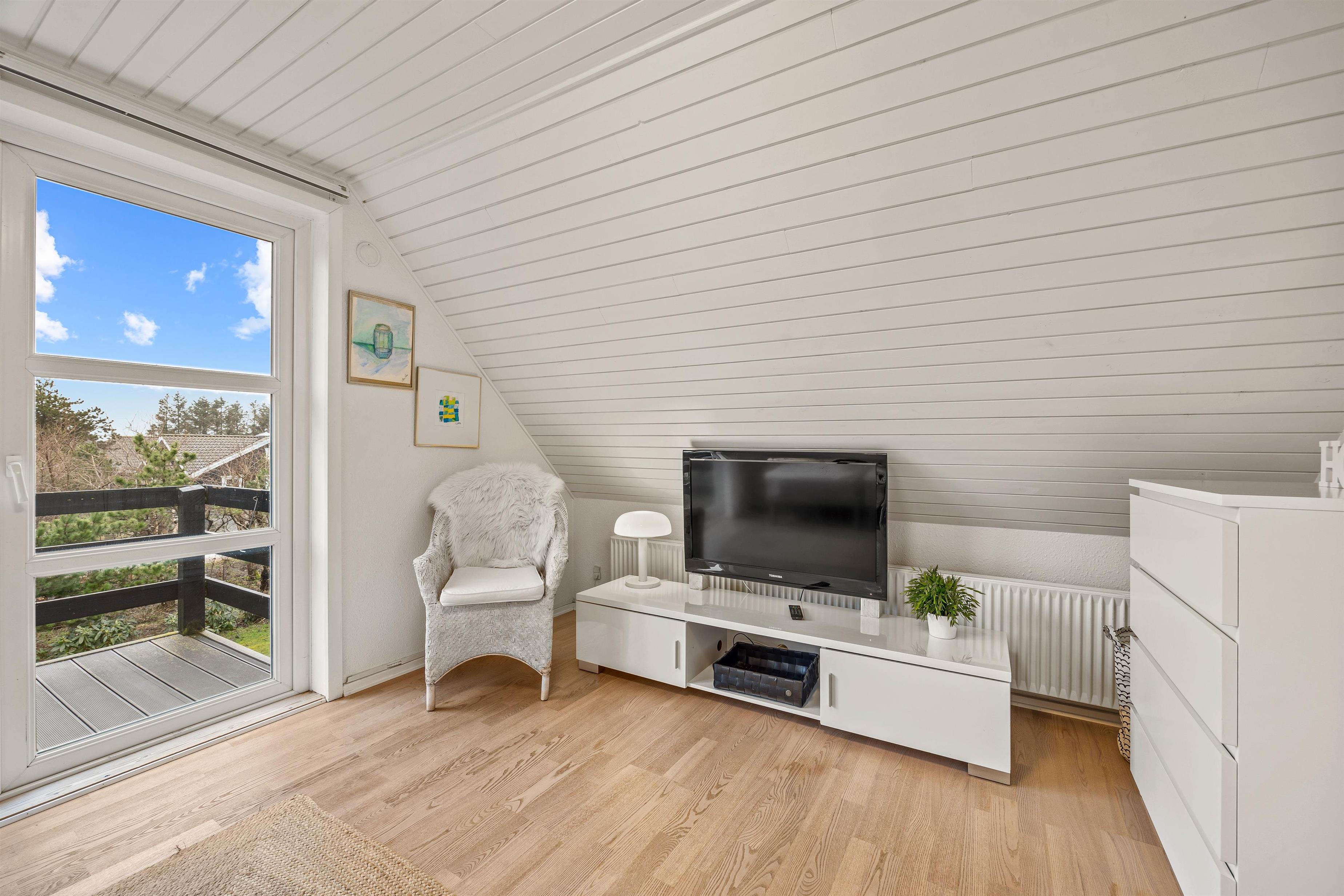 To af feriehusets fem soveværelser ligger i stueetagen sammen med et badeværelse med bruser og gulvvarme. Ovenpå findes de øvrige soveværelser og det andet badeværelse. Et værelse er med køjesenge med en bred underkøje, mens de andre fire har dobbeltsenge. To af soveværelserne har desuden eget TV. Fra førstesalens ene værelse kan man nyde altanen og udsigten udover den grønne have.