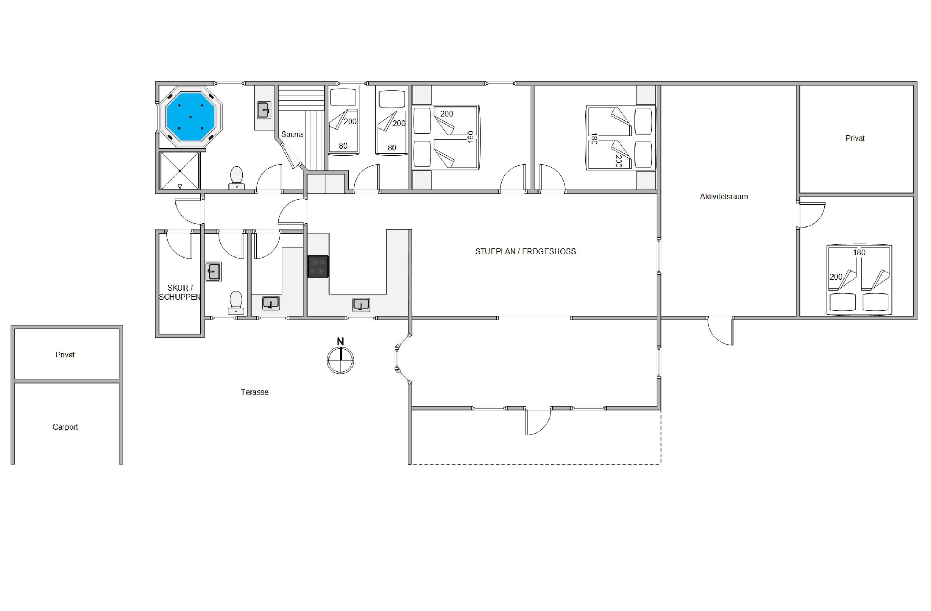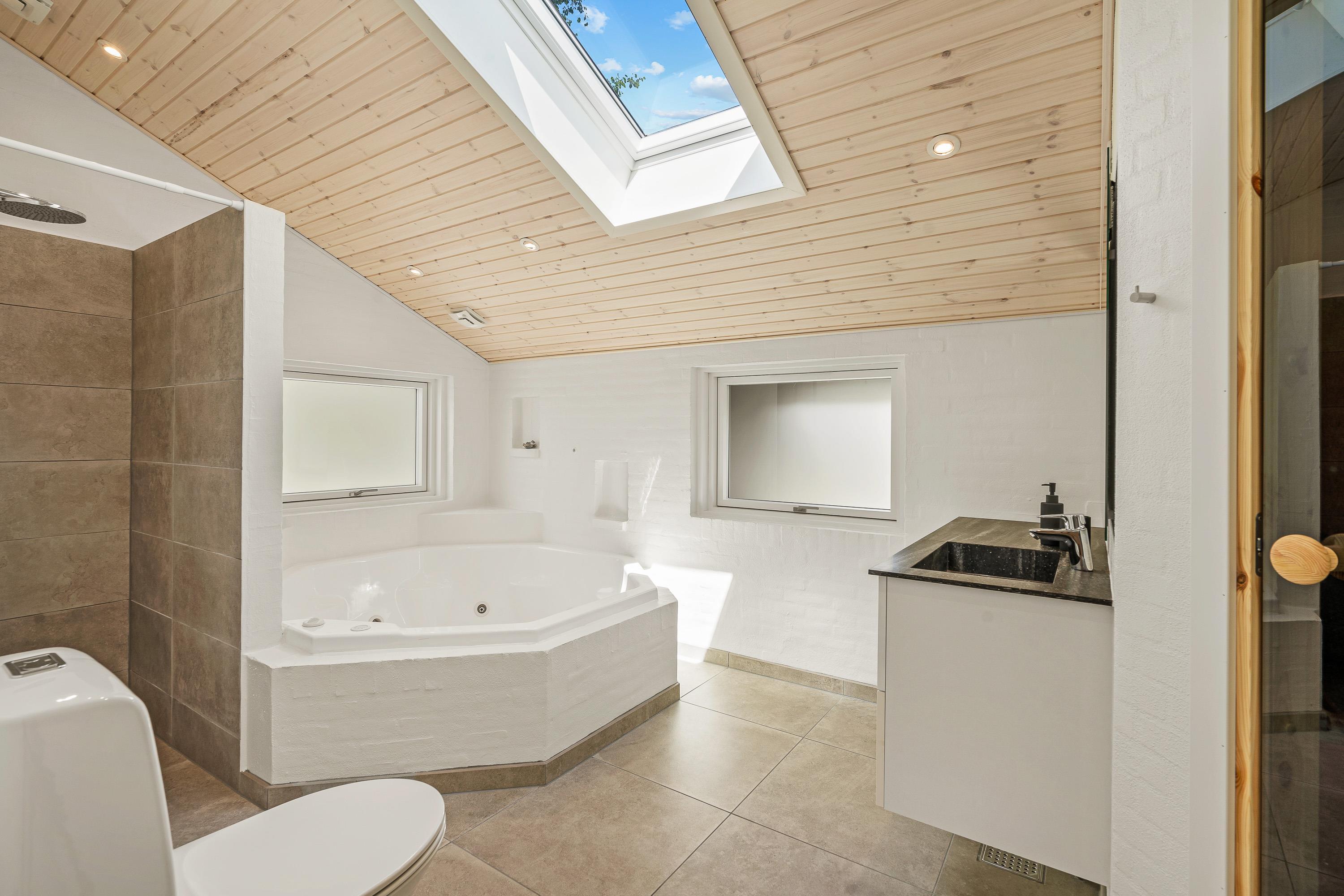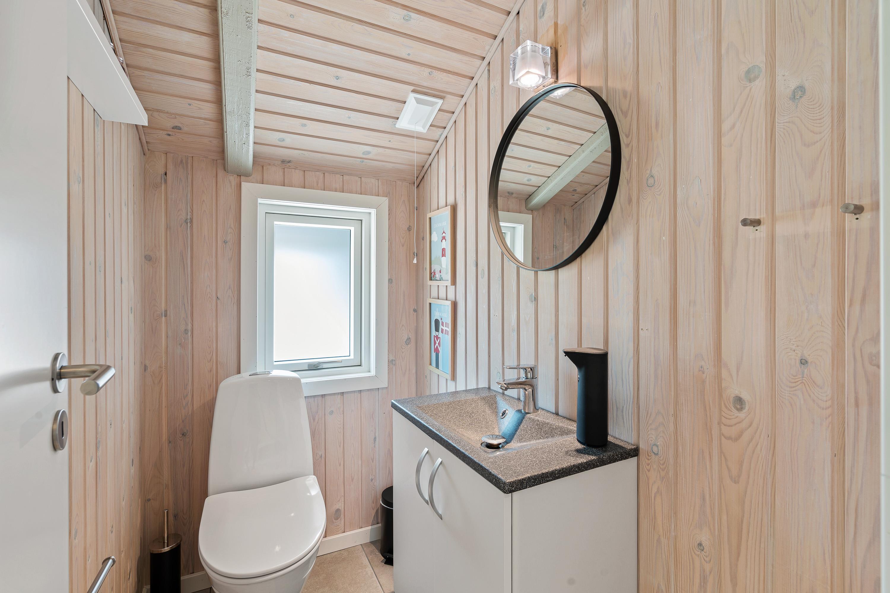 I sommerhuset er der 1 badeværelse med gulvvarme samt 1 gæstetoilet. På badeværelset står der også et lækkert spabad klar til jer, hvor I virkelig kan få slappet af i det varme, boblende vand. Desuden byder sommerhuset også på en sauna, hvor der er mulighed for endnu mere afslapning på ferien.