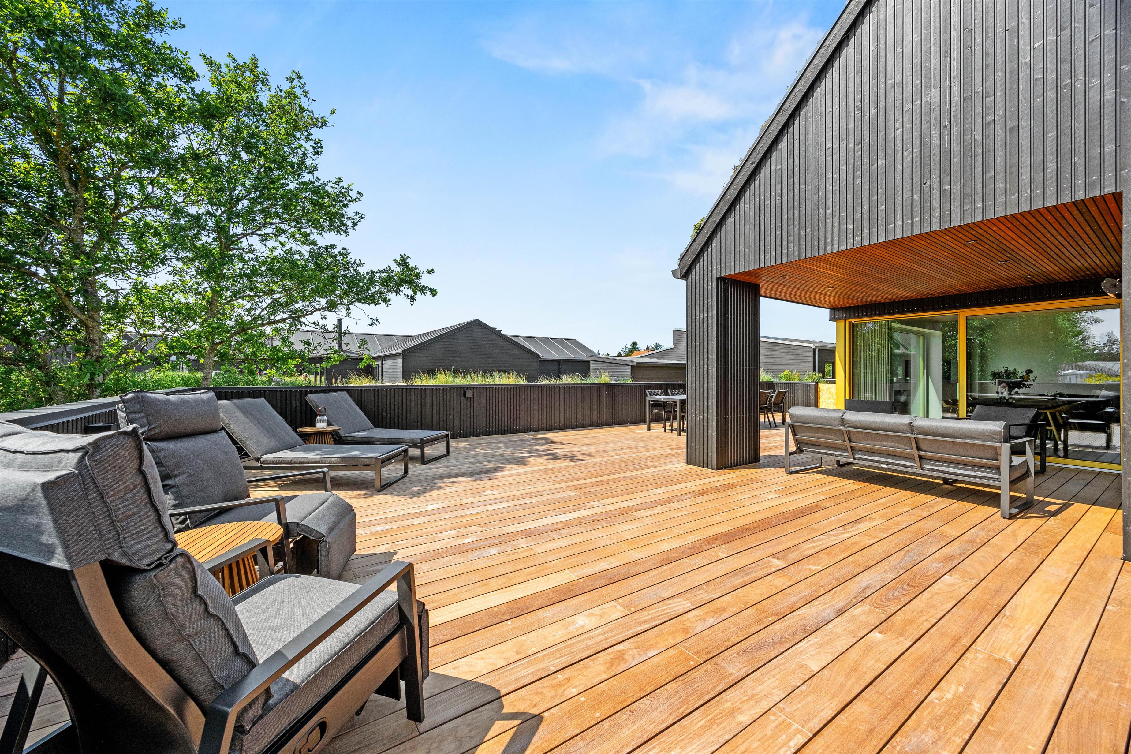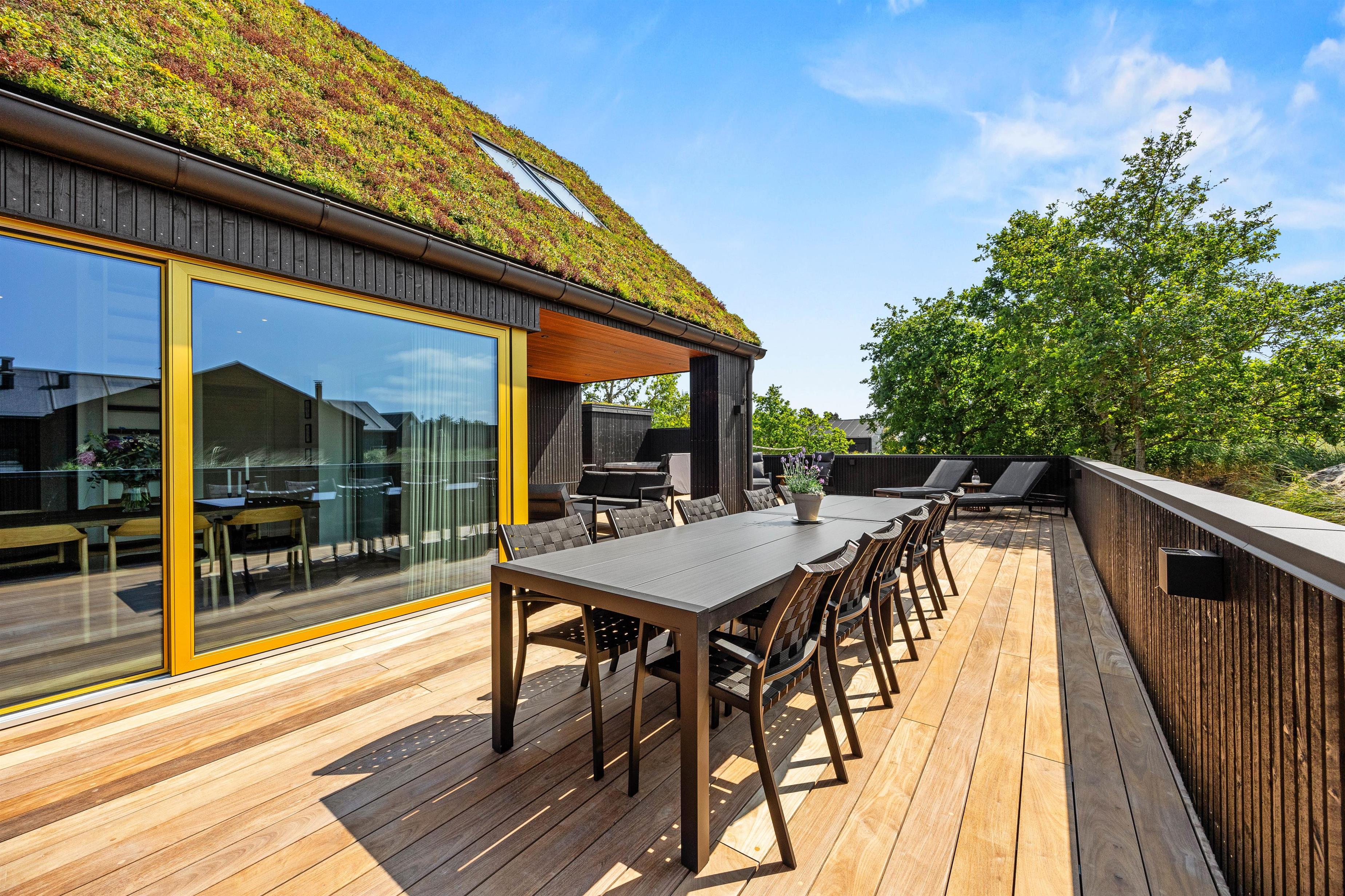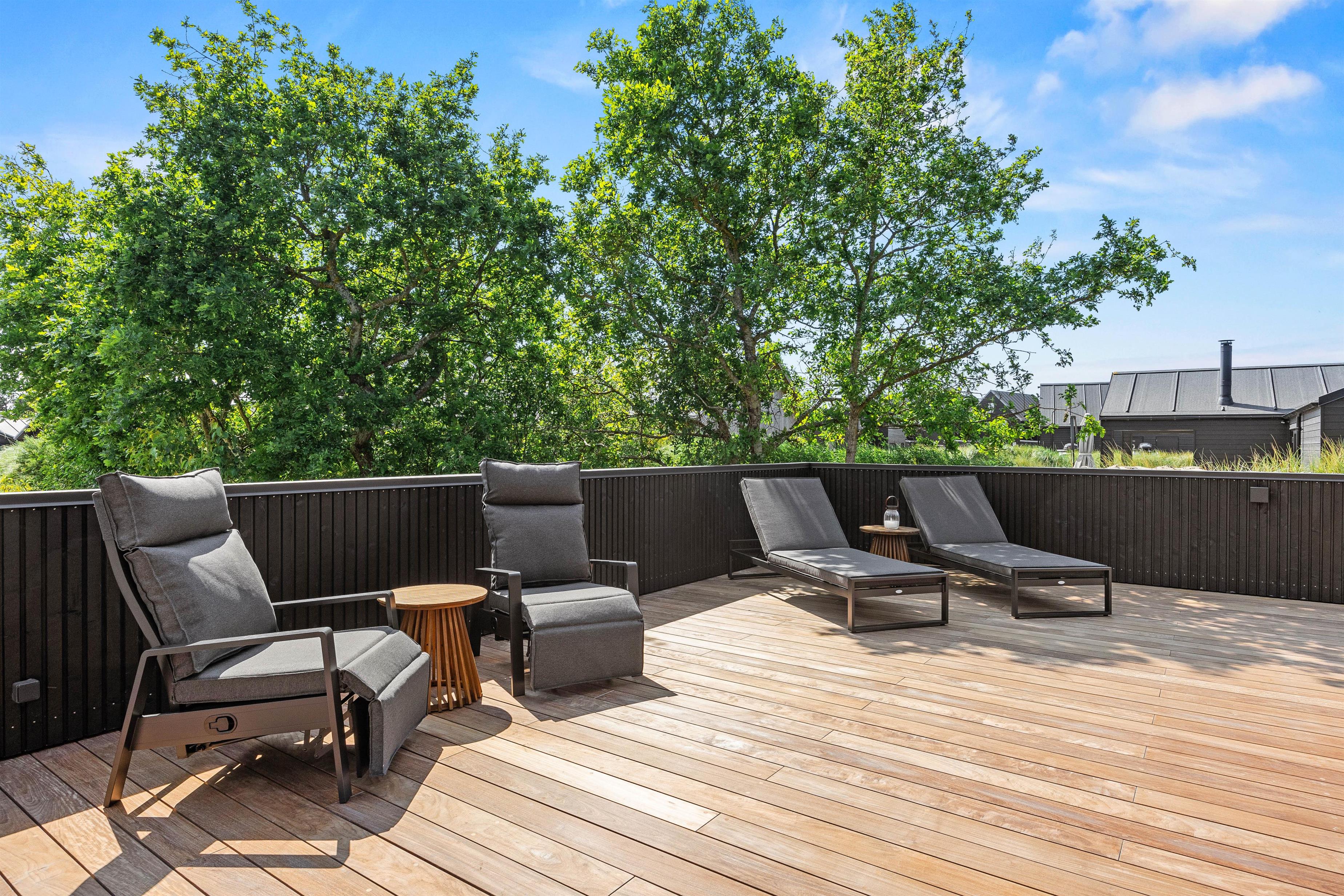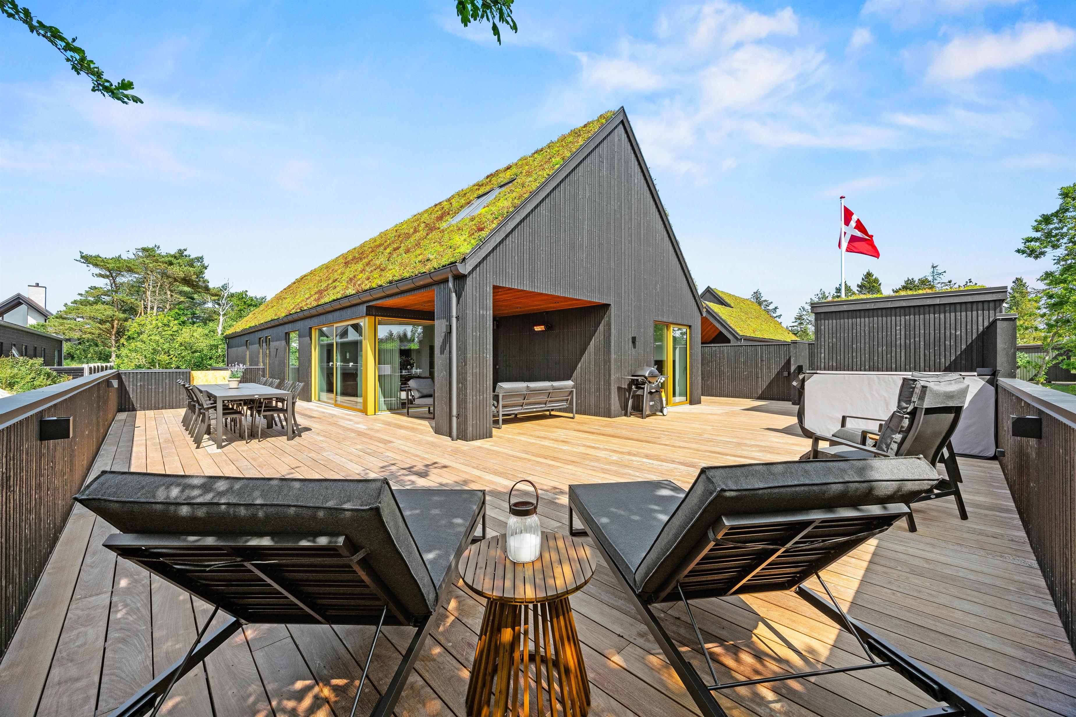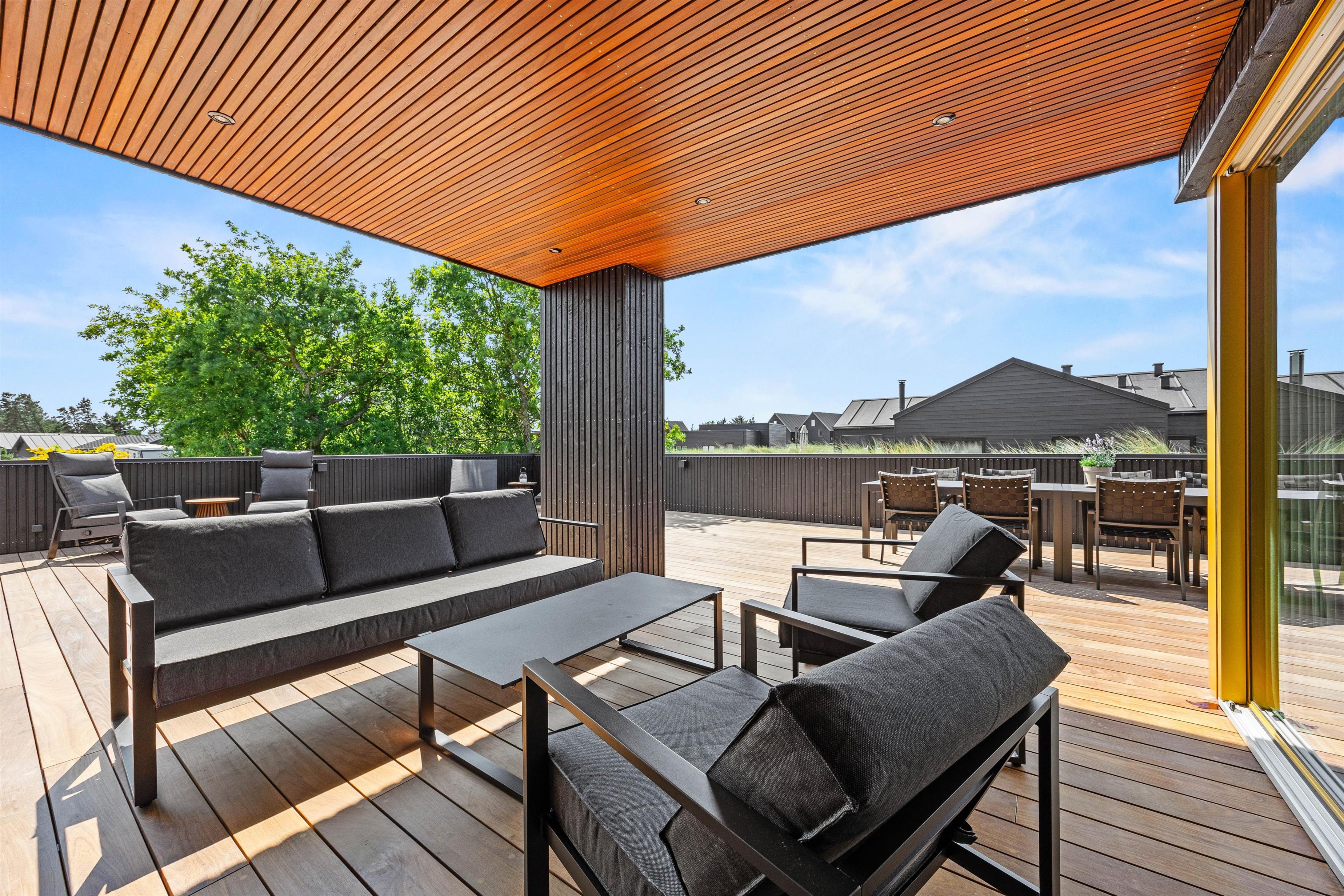 I får ikke kun et gennemført luksuriøst indre, men også et helt fantastisk udeområde med en stor, delvist overdækket terrasse, som danner rammerne om udendørs aktiviteter. Her kan I nyde morgenkaffen eller slappe af i solen efter en dag fyldt med aktiviteter. Havemøbler, liggestole og gasgrillen står klar til jer.