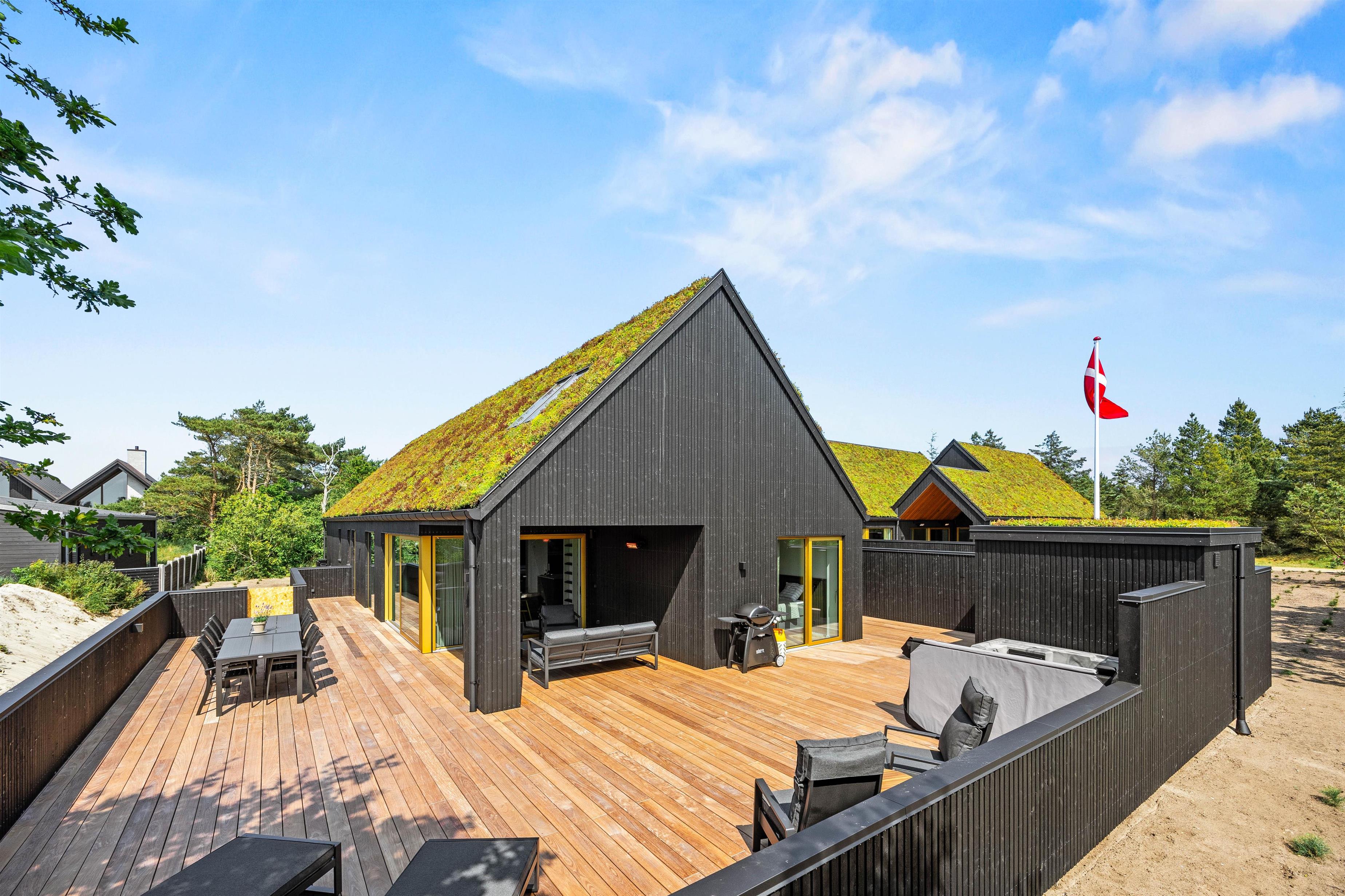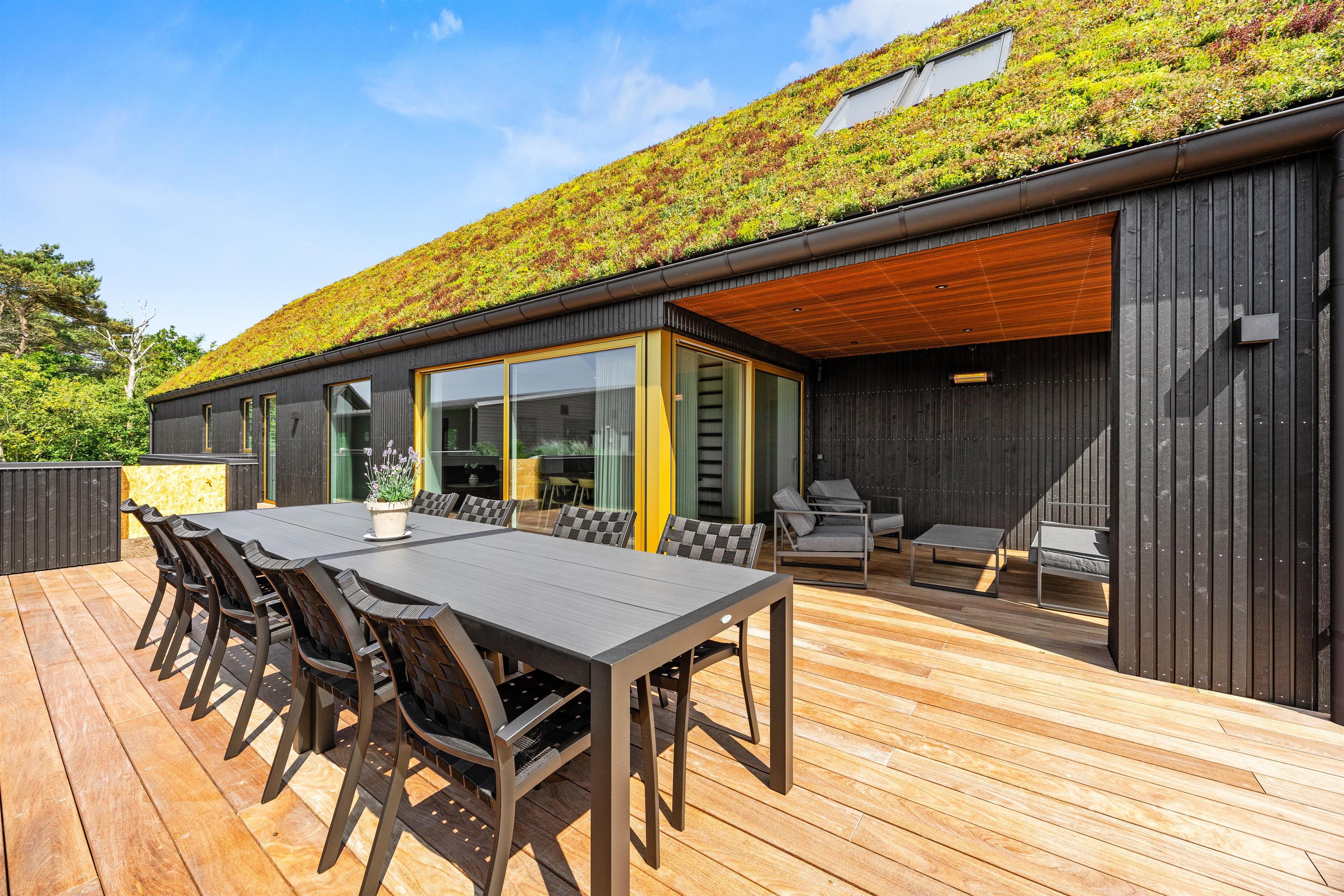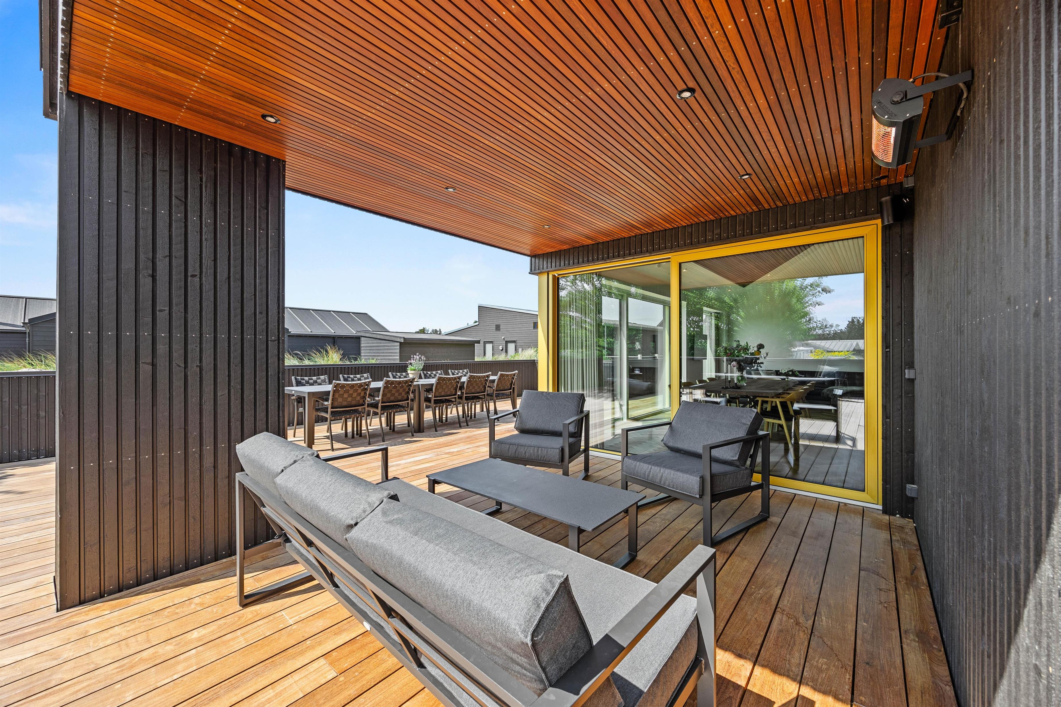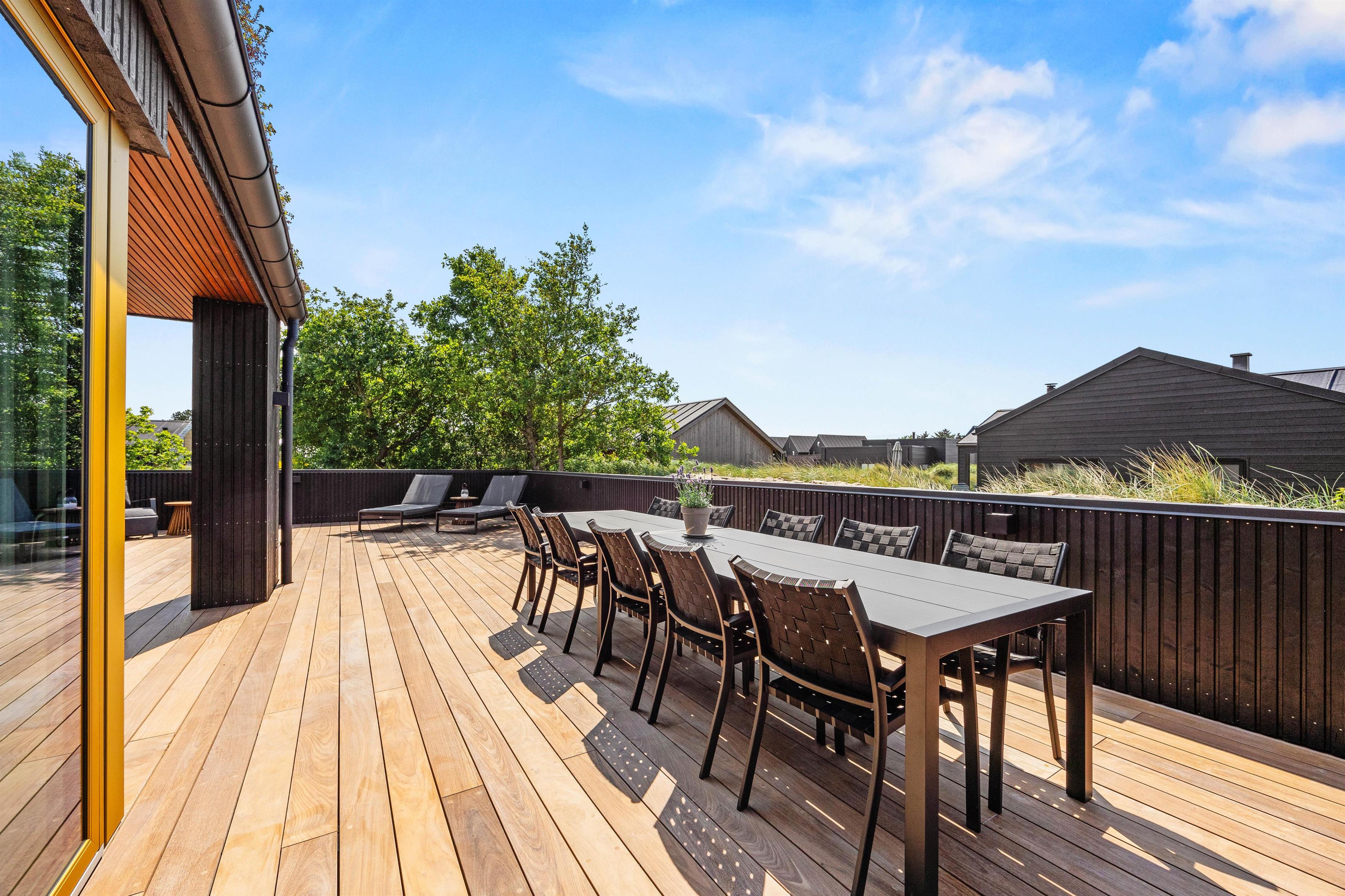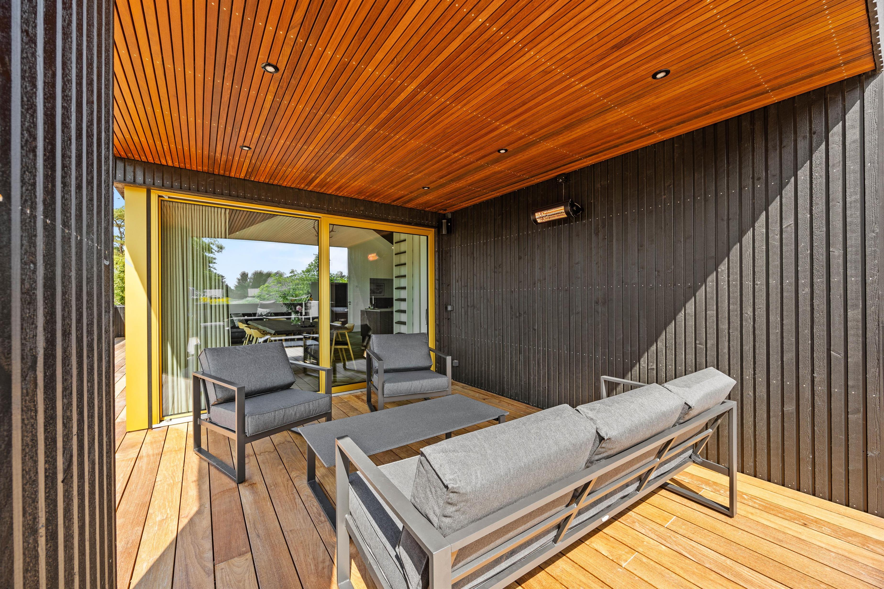 I får ikke kun et gennemført luksuriøst indre, men også et helt fantastisk udeområde med en stor, delvist overdækket terrasse, som danner rammerne om udendørs aktiviteter. Her kan I nyde morgenkaffen eller slappe af i solen efter en dag fyldt med aktiviteter. Havemøbler, liggestole og gasgrillen står klar til jer.