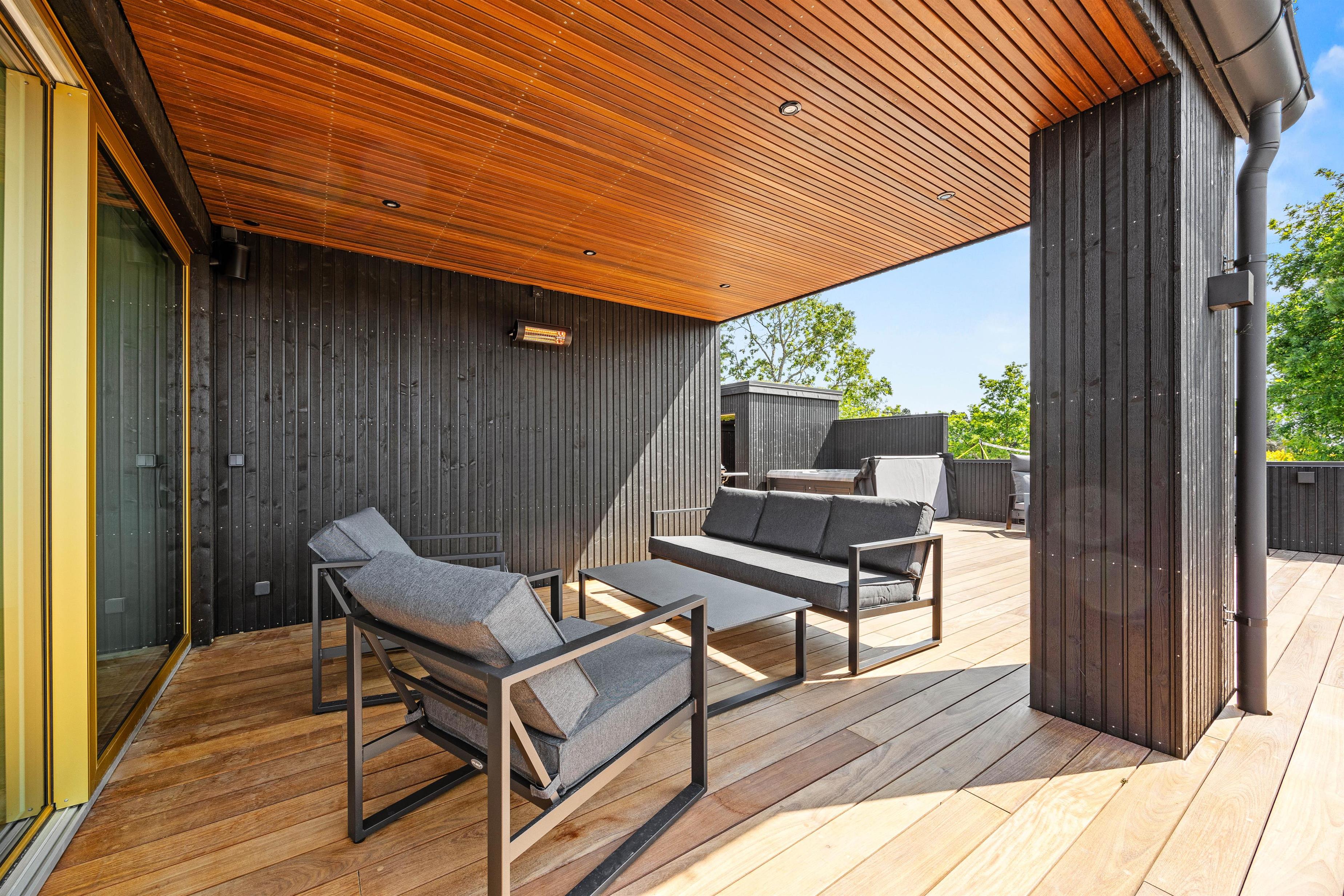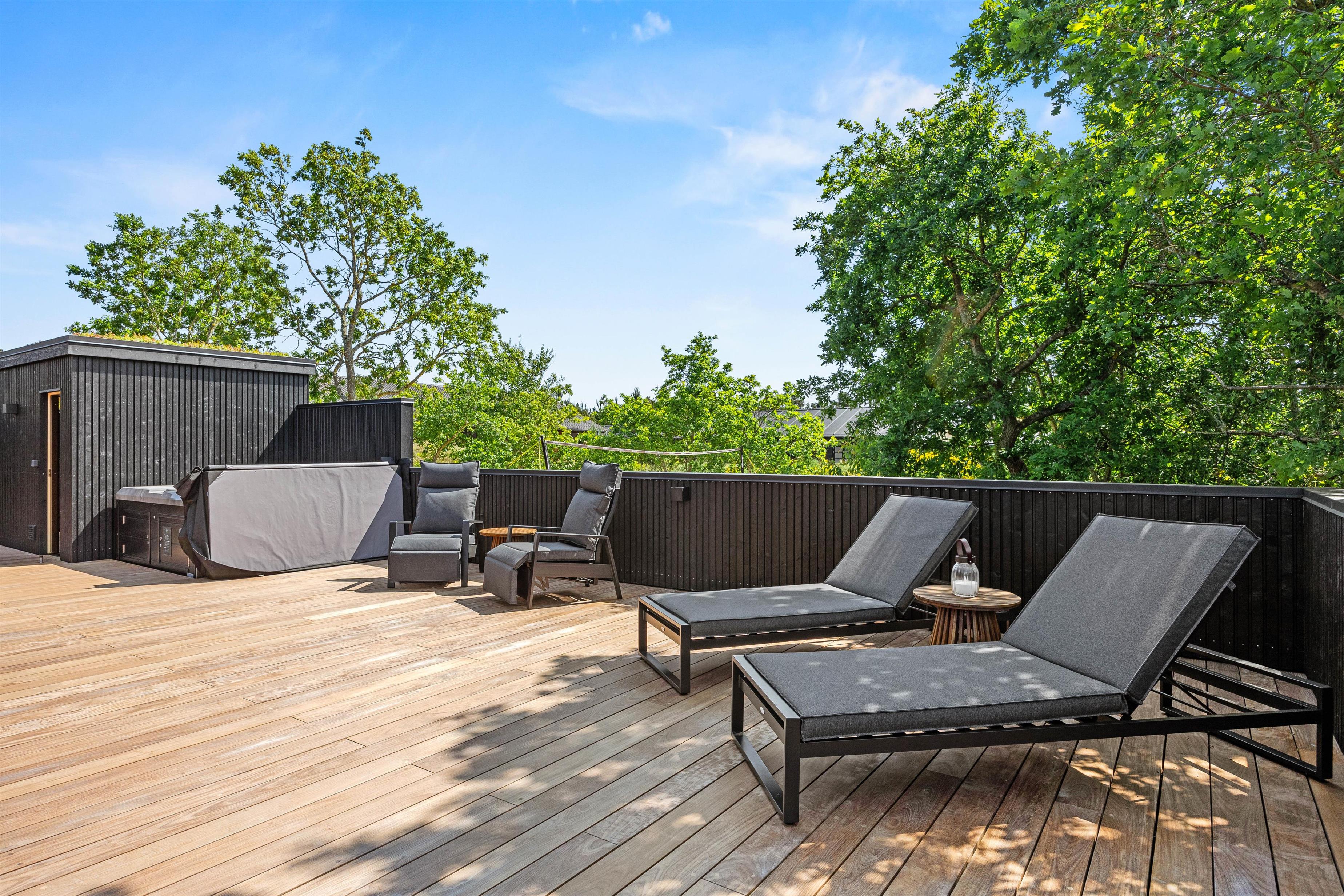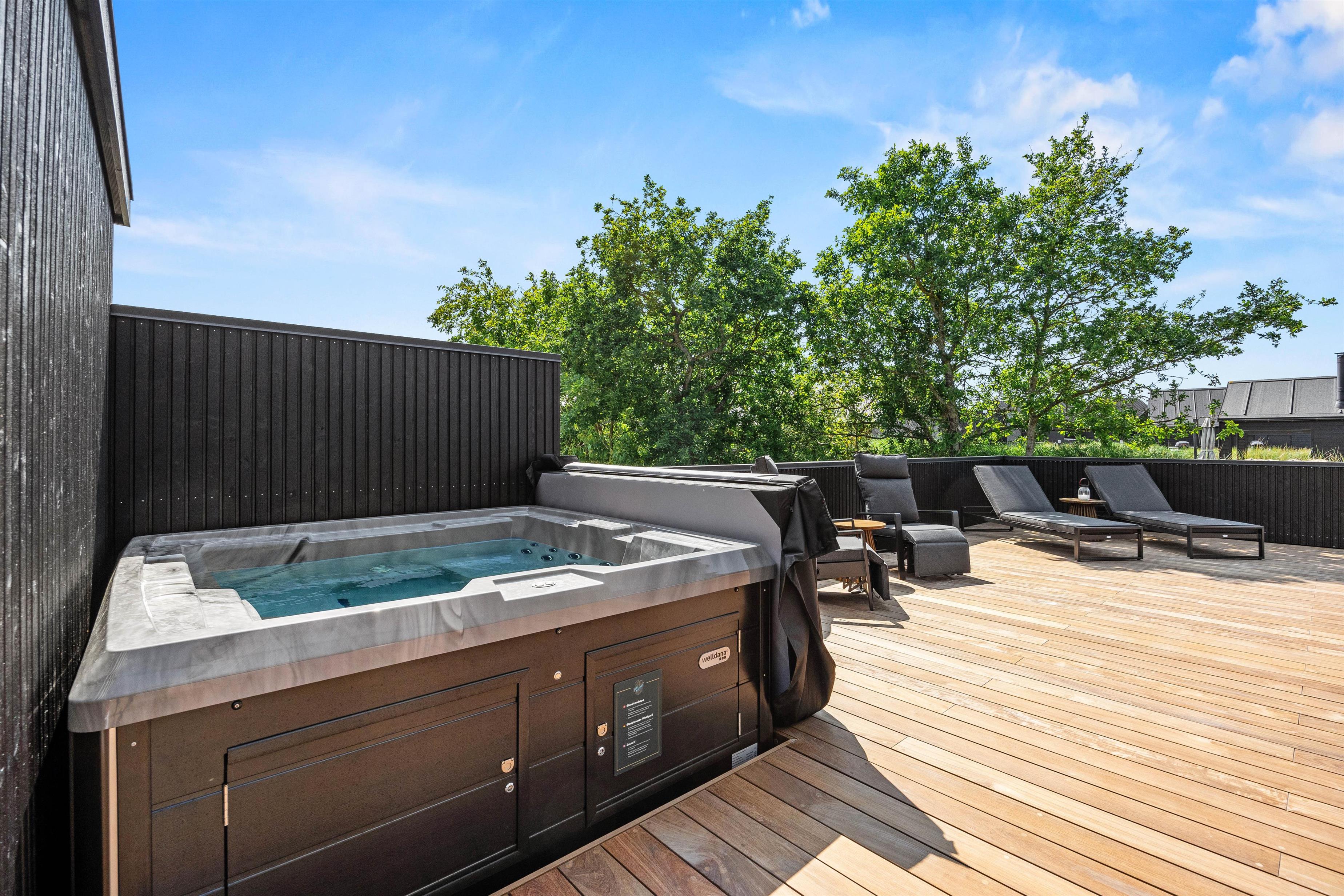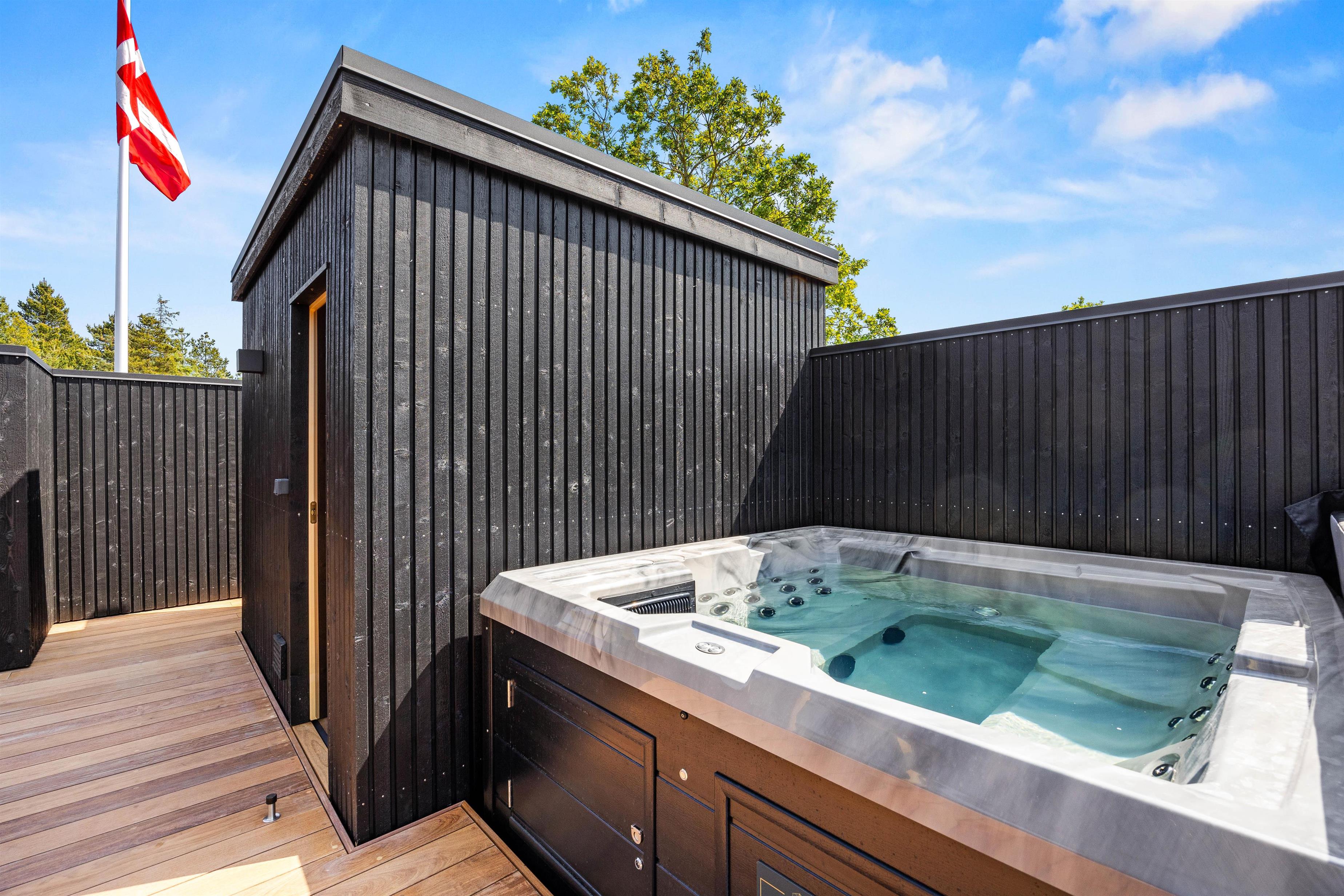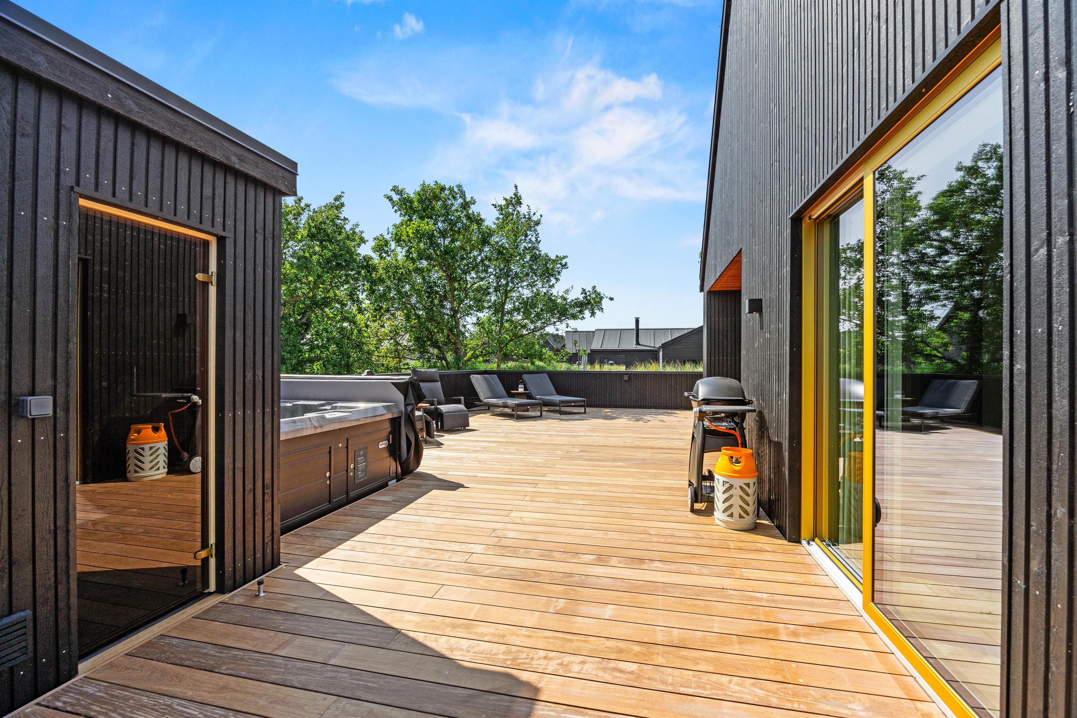 Stor terrasse med udespa, udesauna og udebruser