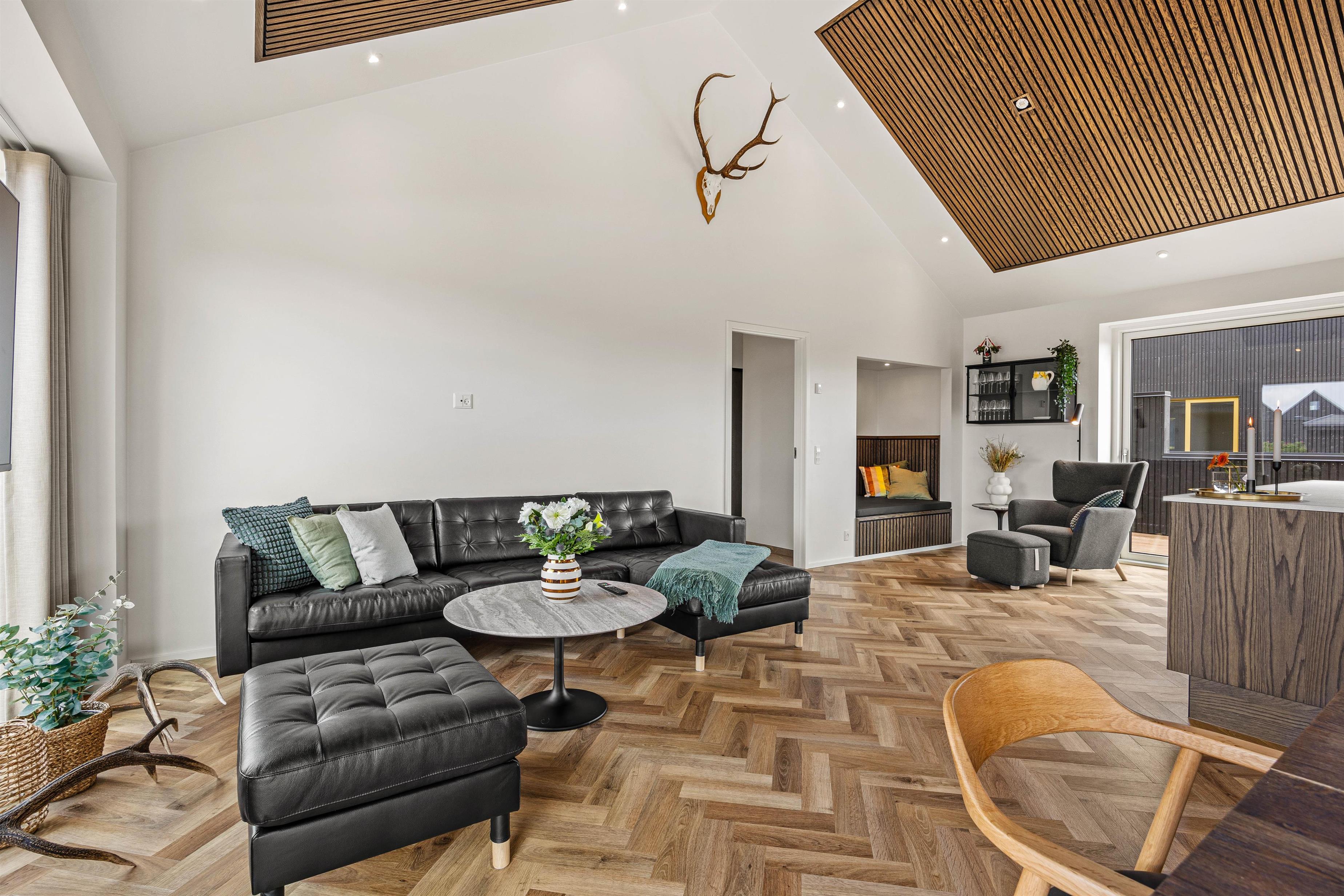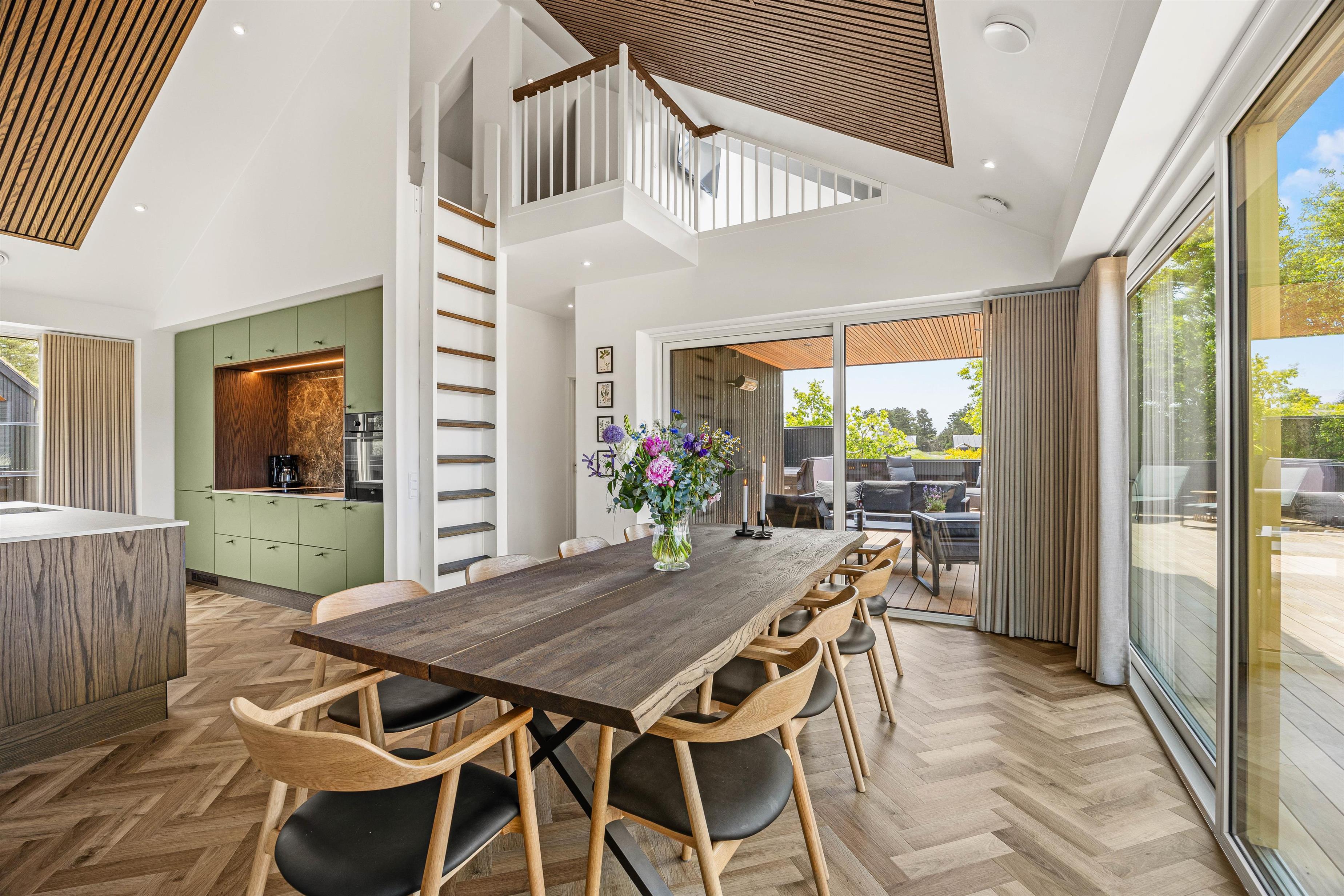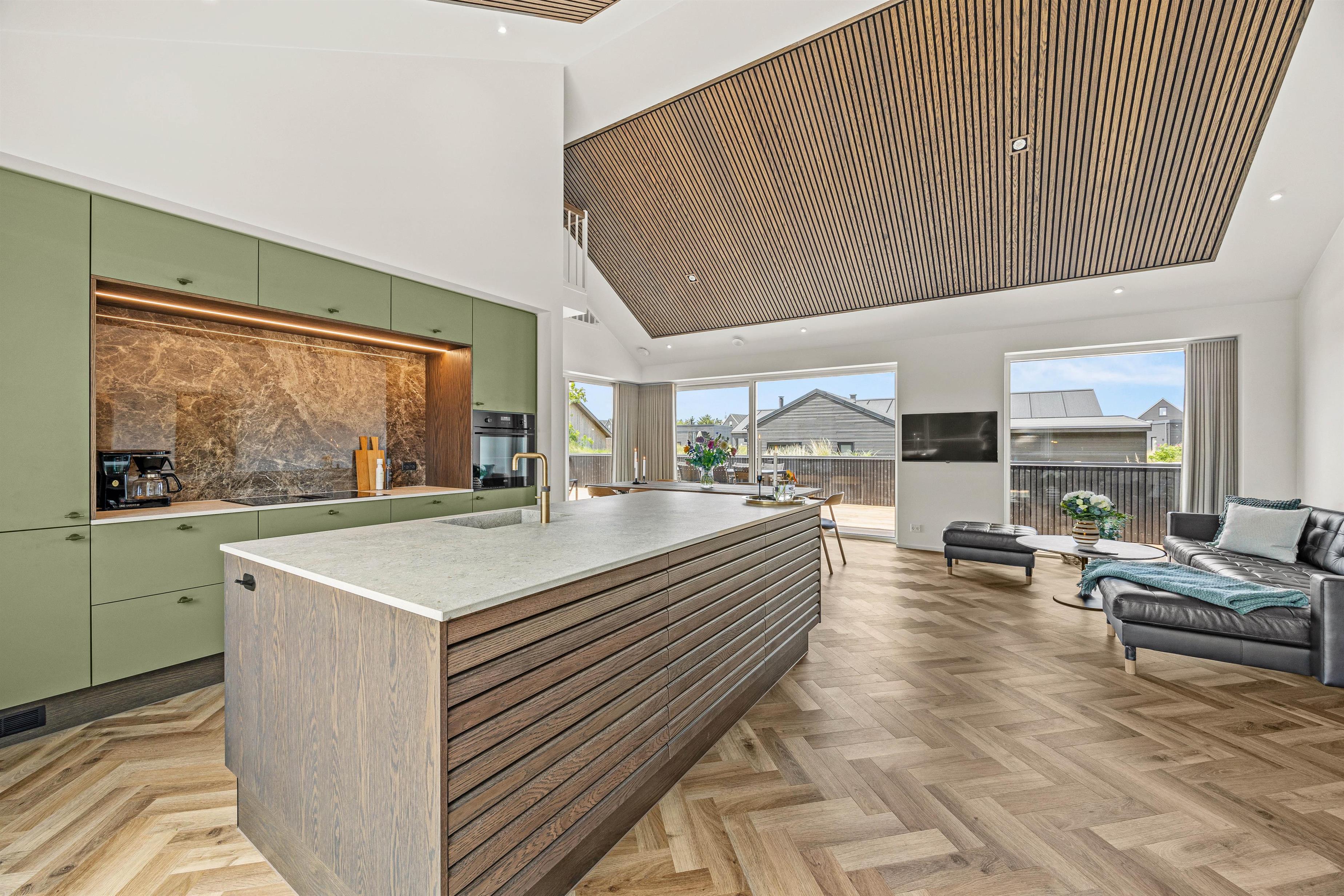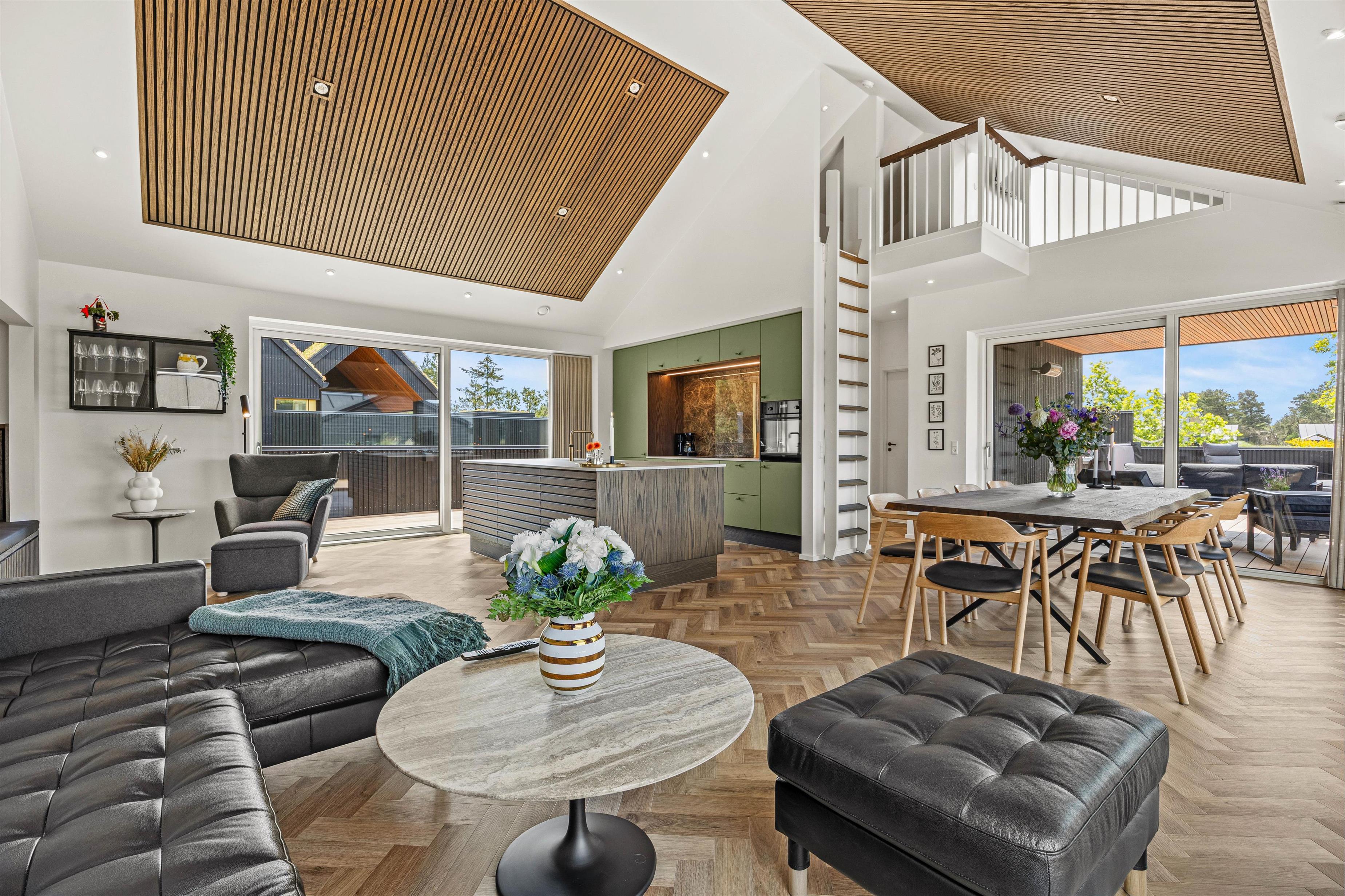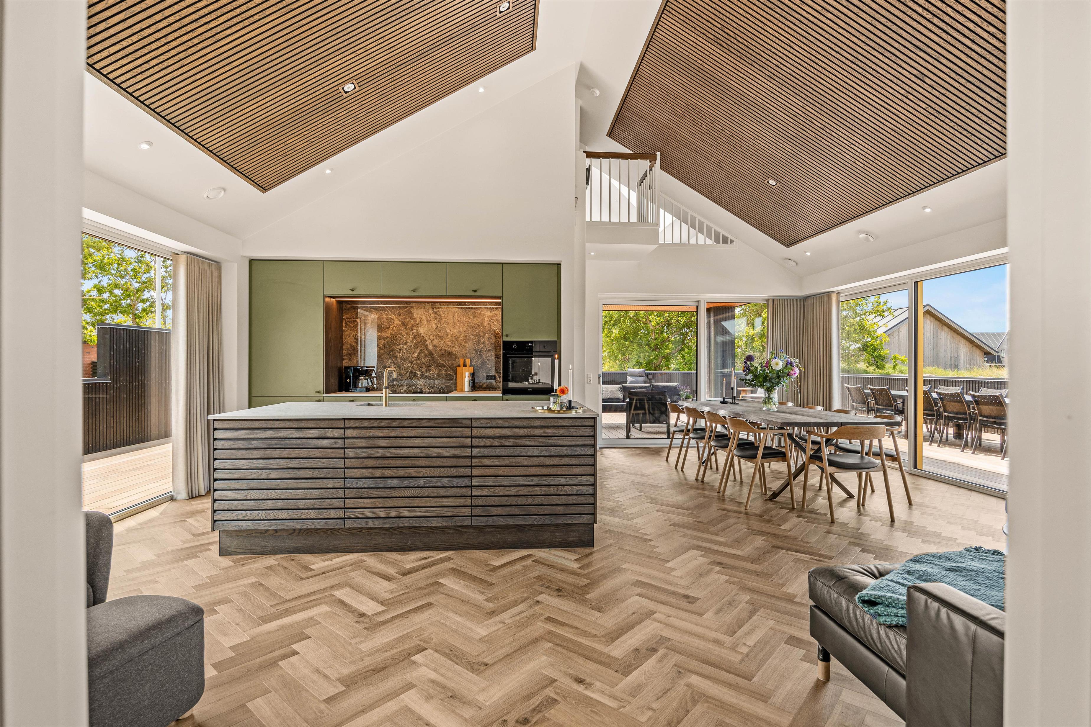 Hjerterummet er det åbne alrum, hvor køkken og stue smelter sammen. Her er lyst og og god plads til familielivet – uanset om I skal lave dejlig mad i det veludstyrede køkken, spille brætspil eller slappe af i sofaen med en god film. Fra det rummelige alrum er der direkte udgang til den fantastiske terrasse.