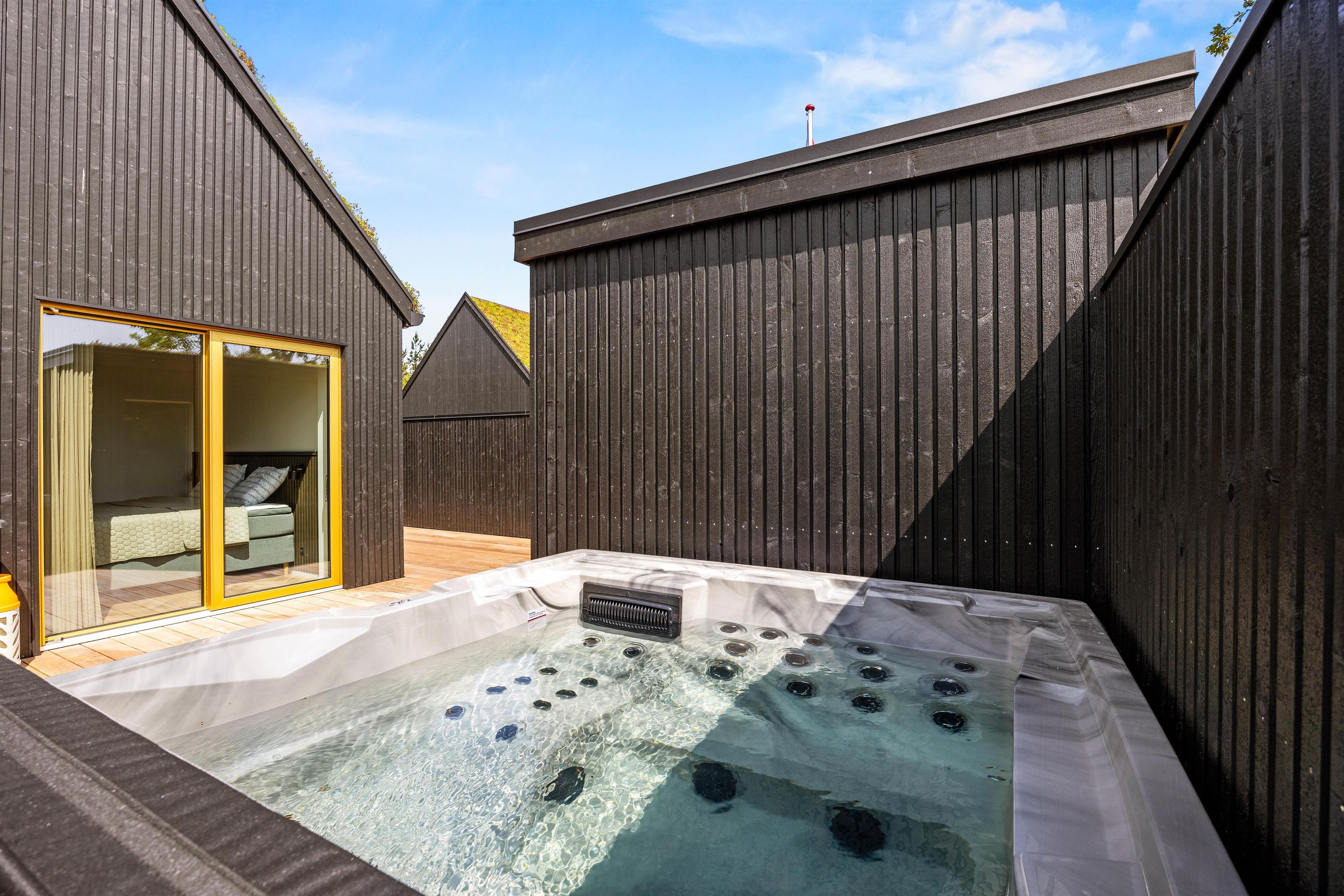 Efter et lækkert grillmåltid står den varme udespa klar til at give jer en afslappende wellnessoplevelse. Skal I varmes ekstra godt igennem, er her også en udendørssauna, og så er sommerhuset også udstyret med en udebruser, som er perfekt til at skylle kroppen under efter en saunasession eller til at skylle sandet af efter en dag på stranden. Udebruseren kan benyttes fra 1. april til 31. oktober.