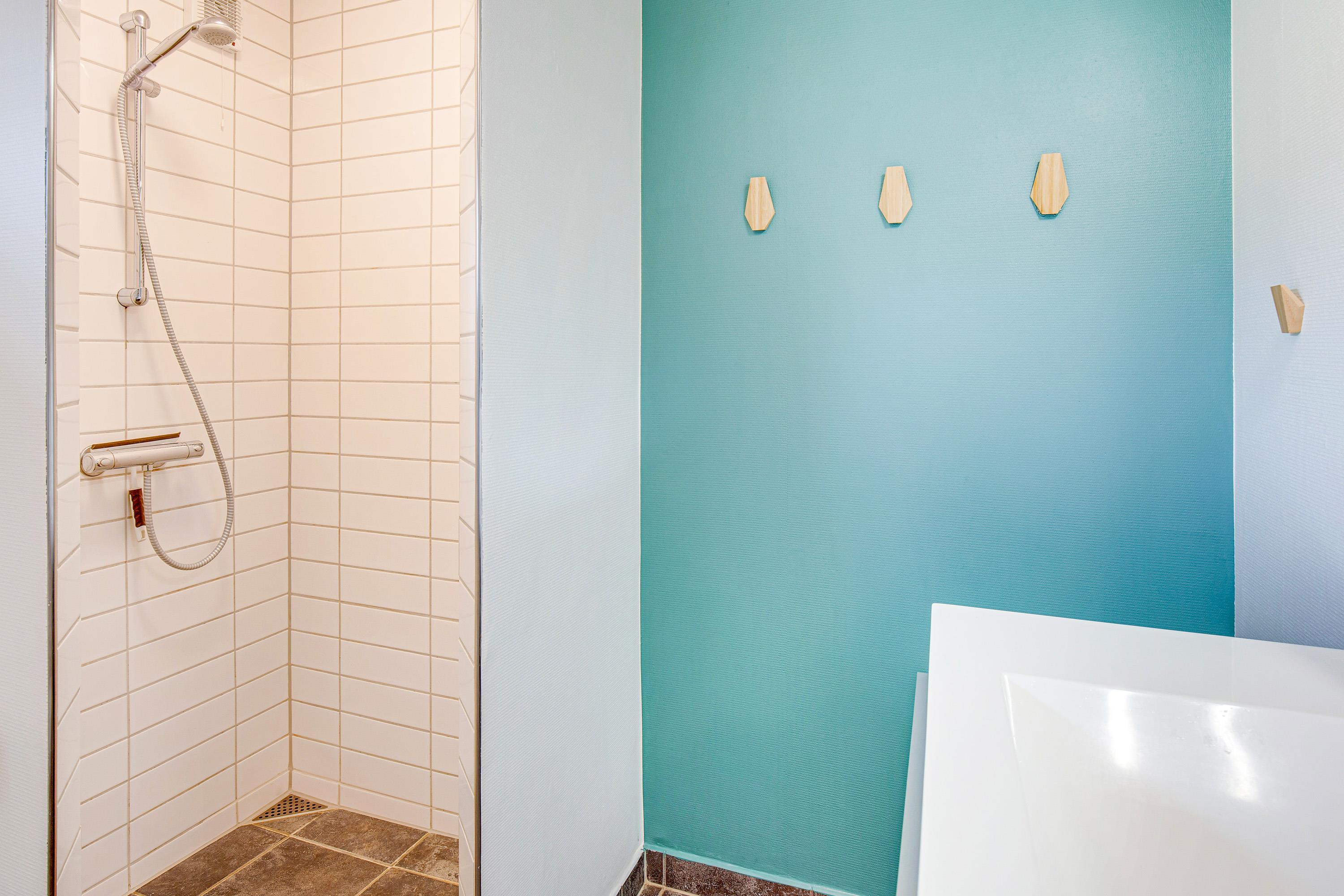 Husets flotte badeværelse har gulvvarme og her finder i også en vaskemaskine.