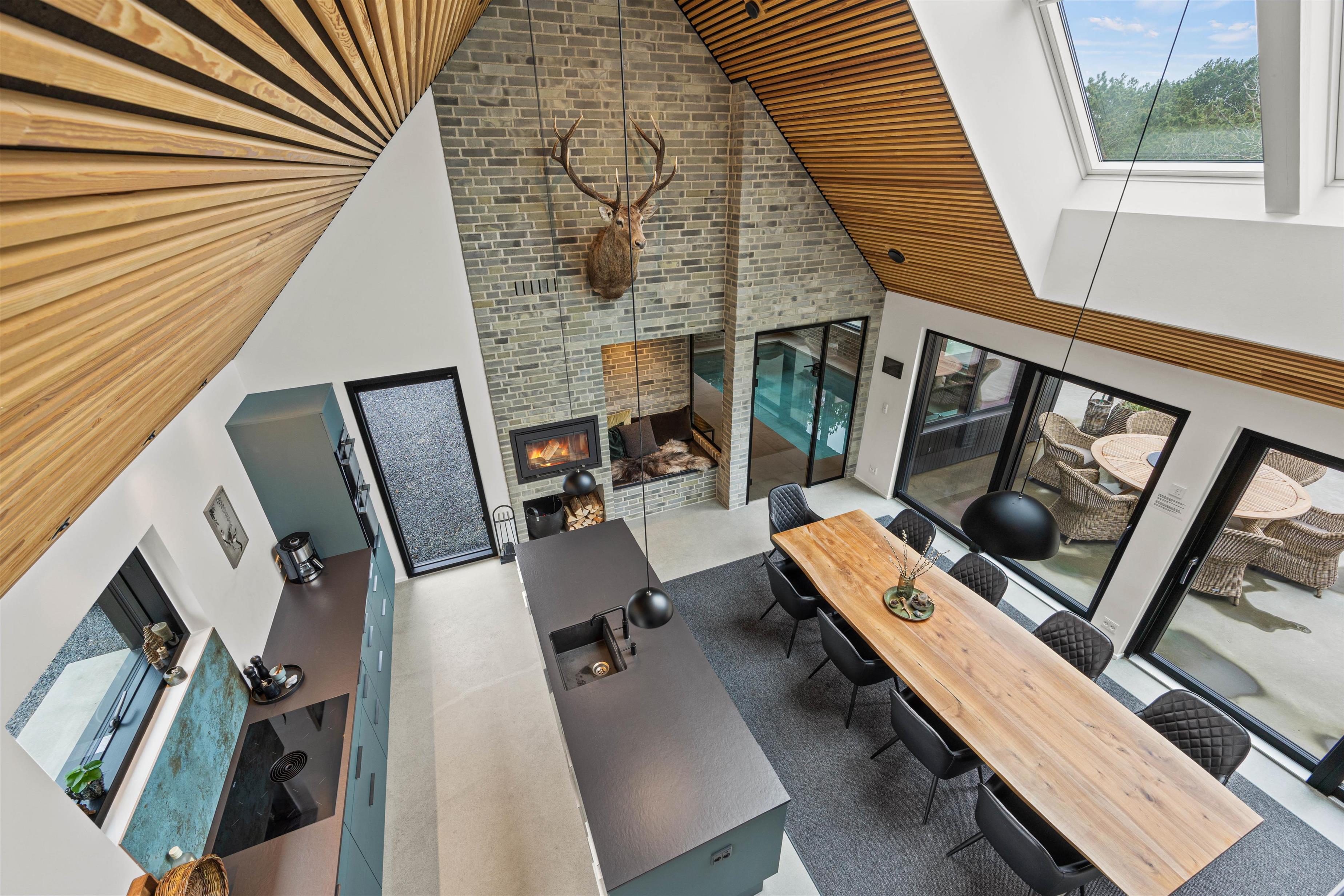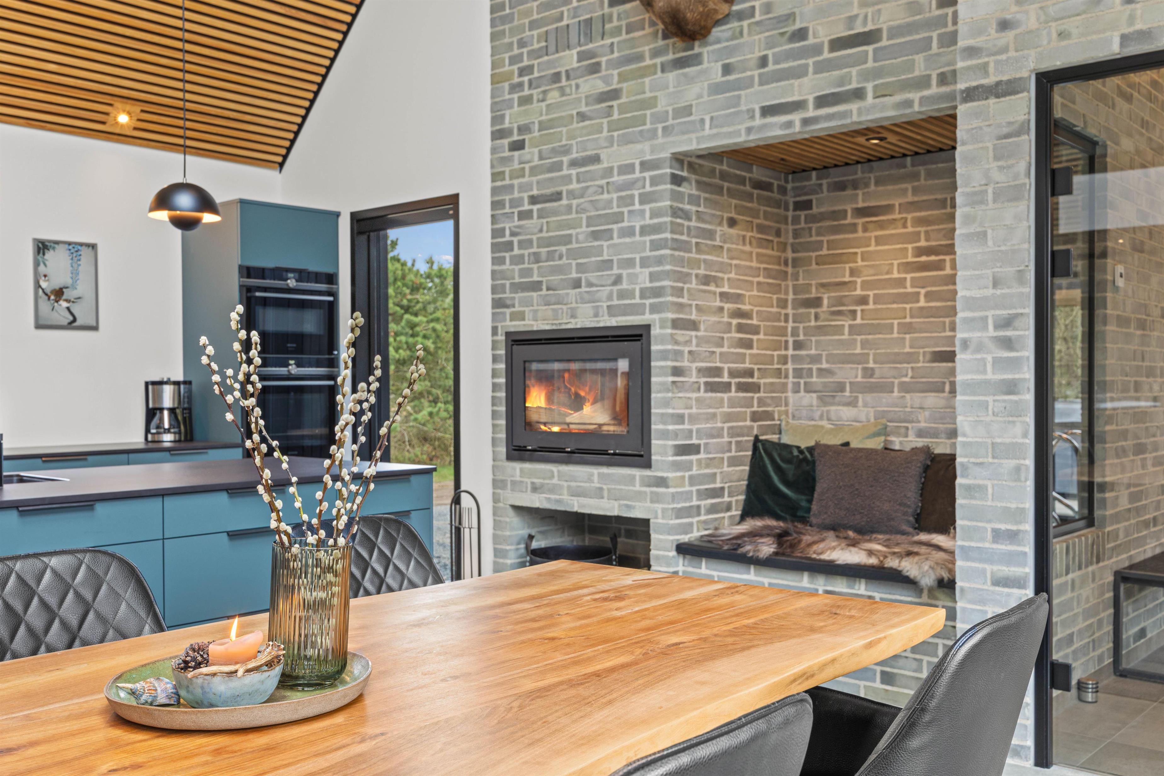 Det rummelig køkkenalrum i forbindelse med aktivitetsrummet udgør feriehusets hjerte med kig til opholdsstuen på 1.sal. I det veludstyrede køkken, der både har vinkøleskab, cooker og kombiovn, er der rig plads til at samles om madlavningen. Ved siden af køkkenet er der ved pejsen indrettet en lille hyggekrog, hvor man kan slappe af med en god bog.