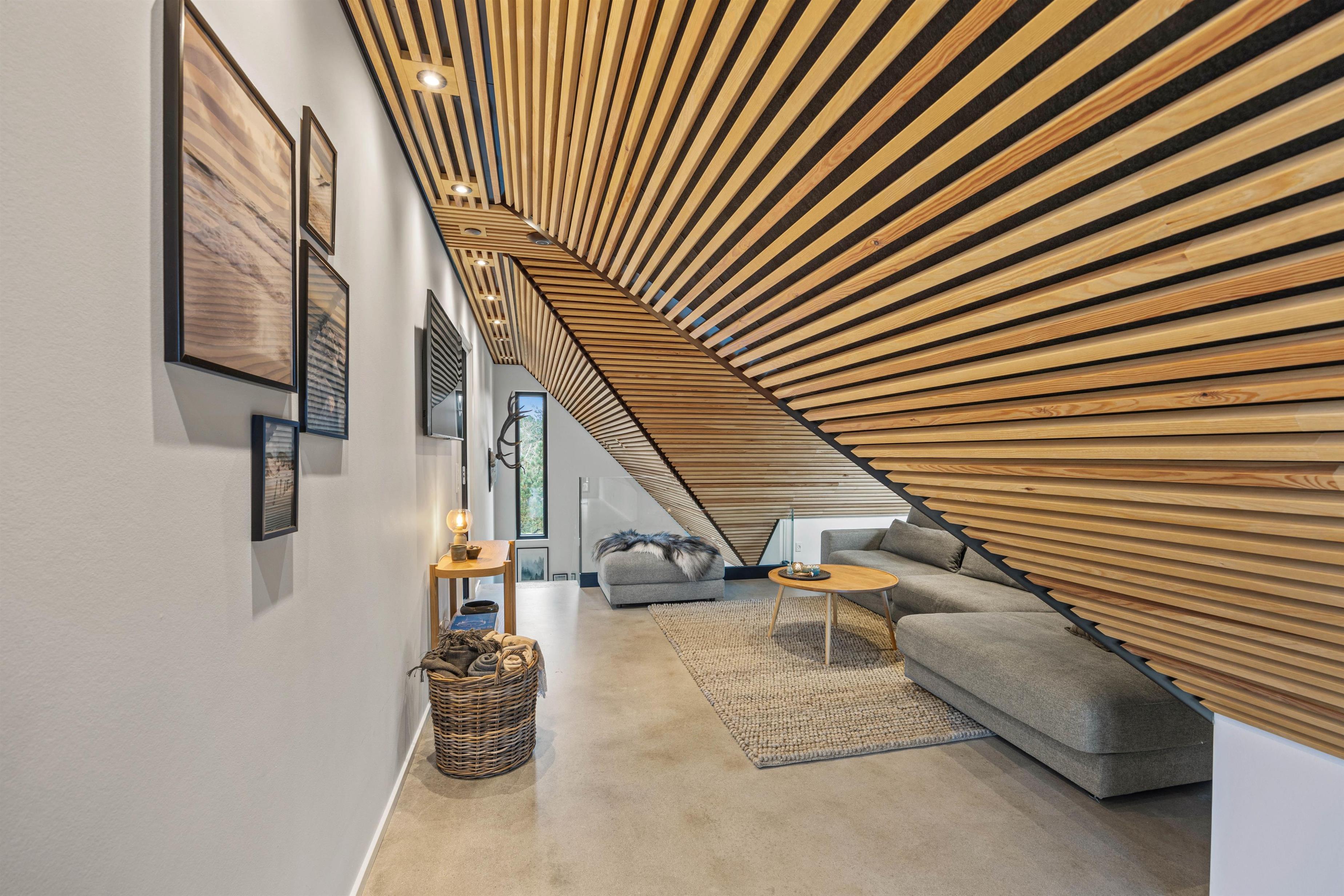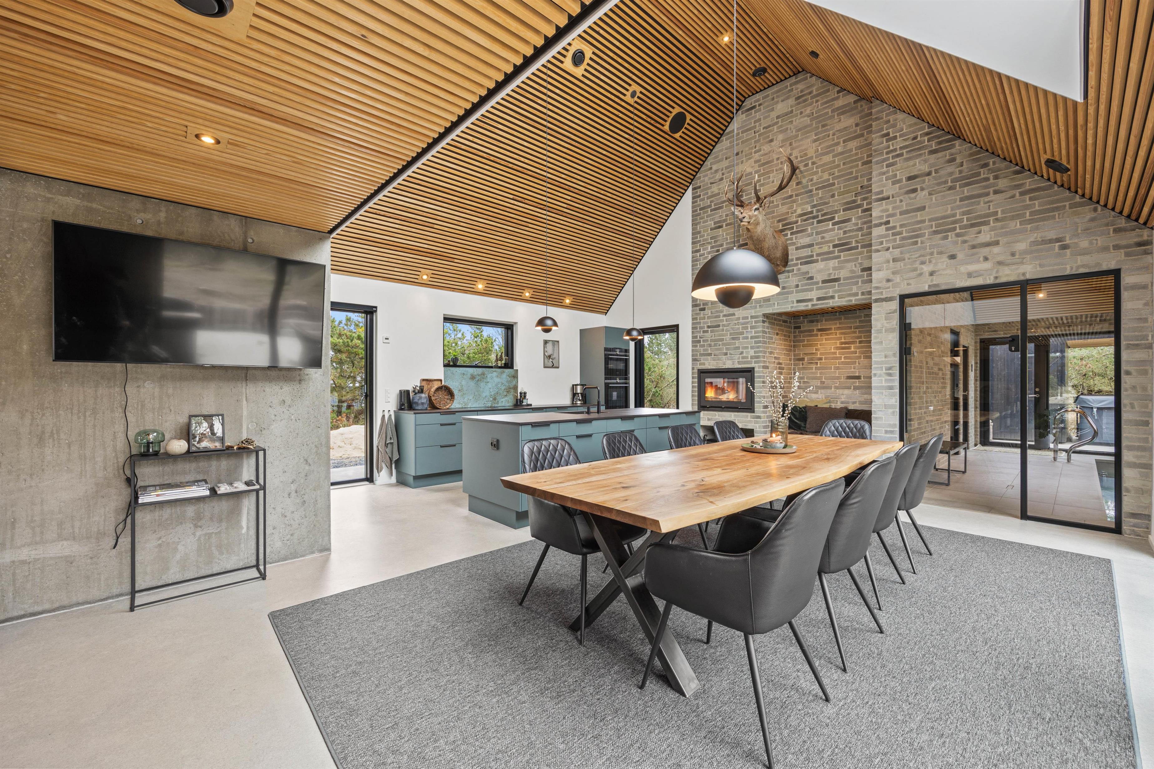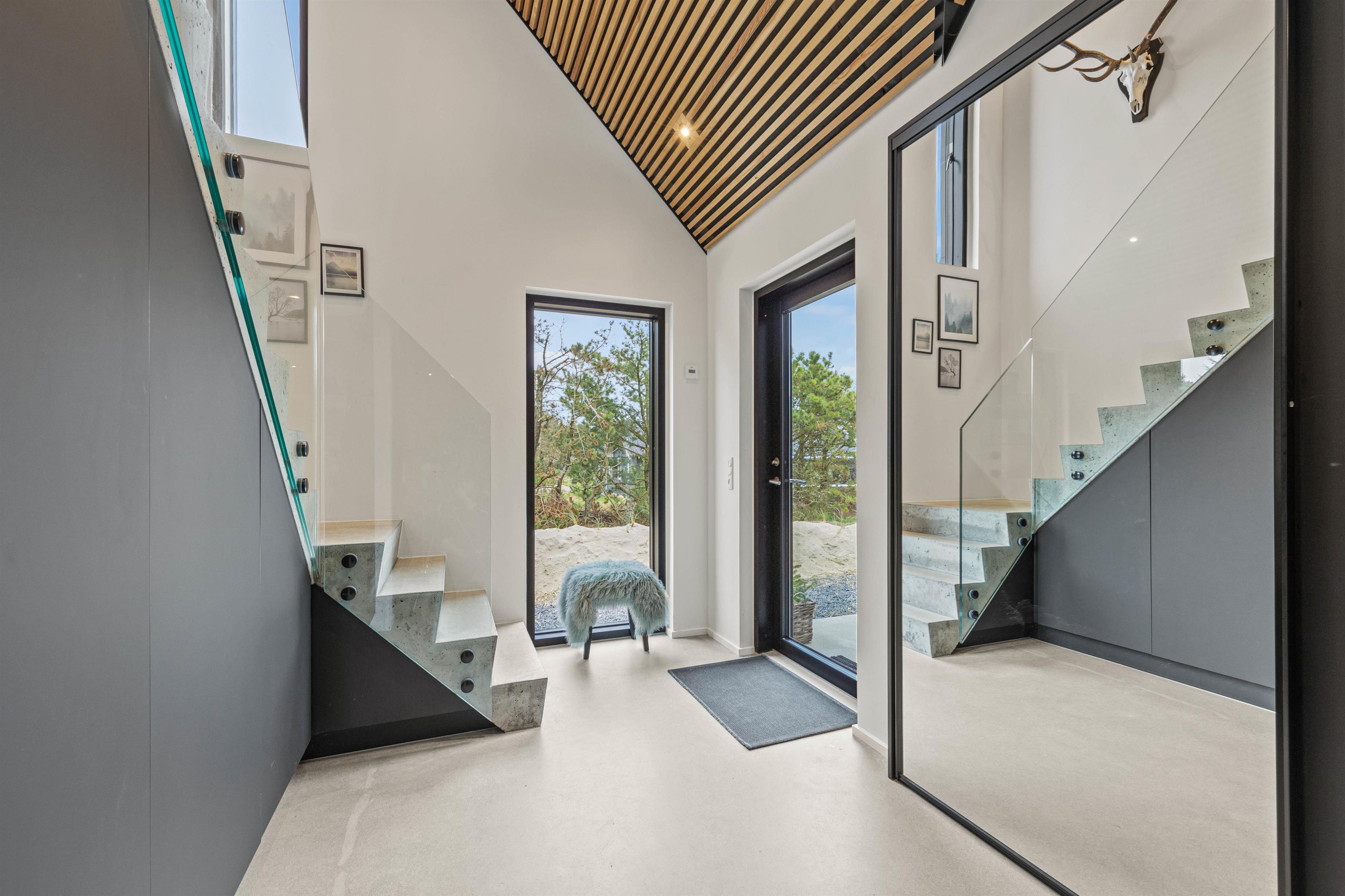 Feriehuset på Bjergbovej 21 A er udført i kvalitetsmaterialer og står med vægge og gulve i råt betonlook, samt akustikpaneler på lofterne. Det rå og moderne udtryk bliver blødgjort af den lette og rummelige indretning.