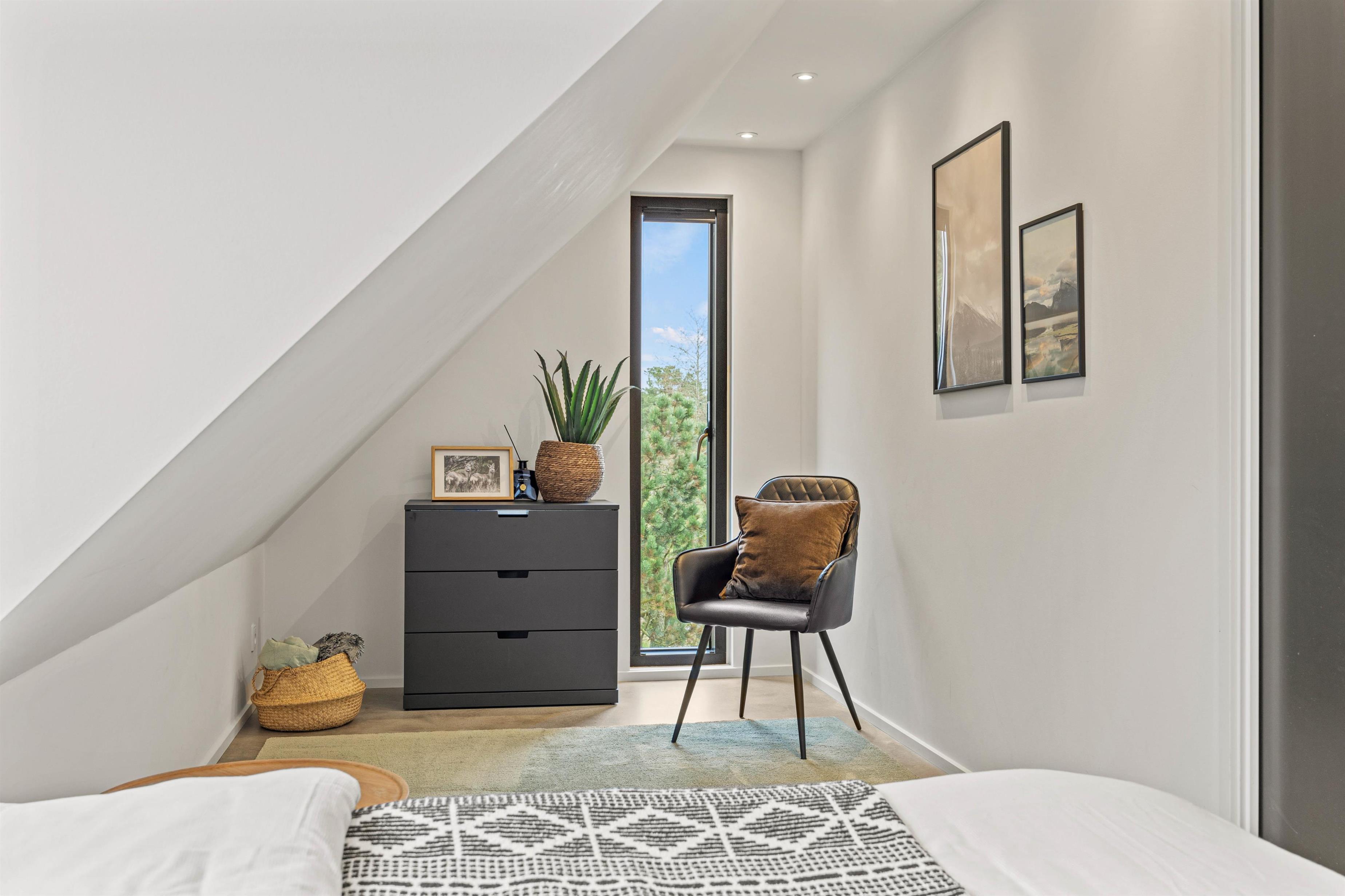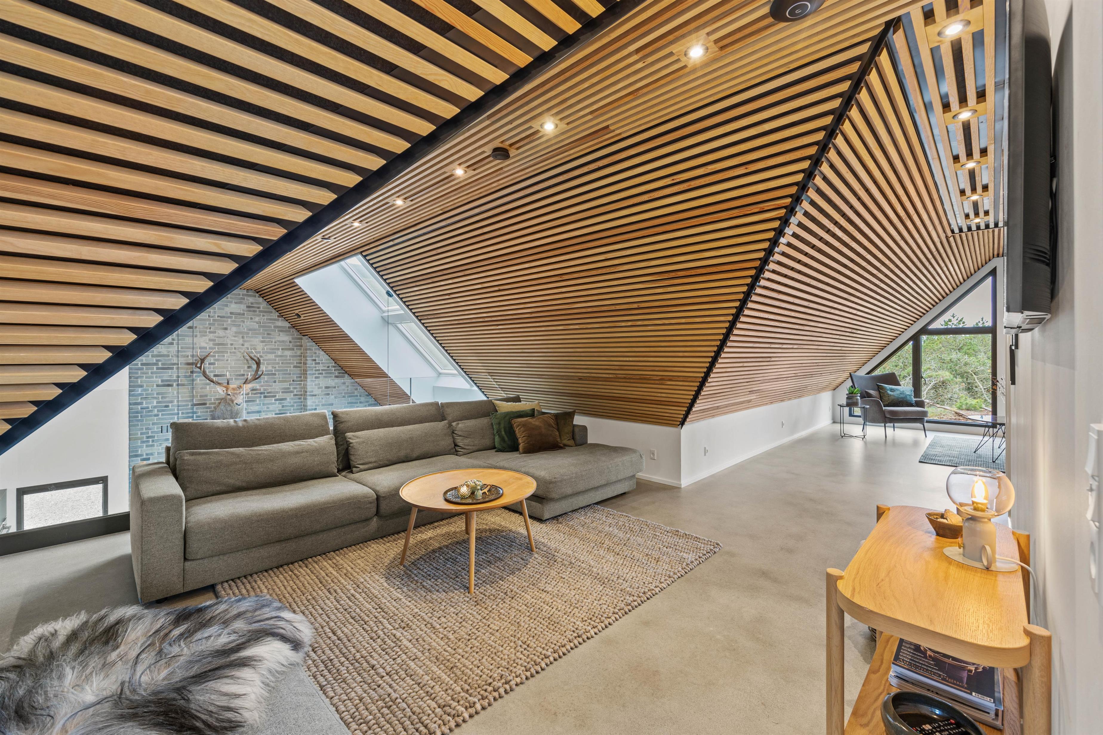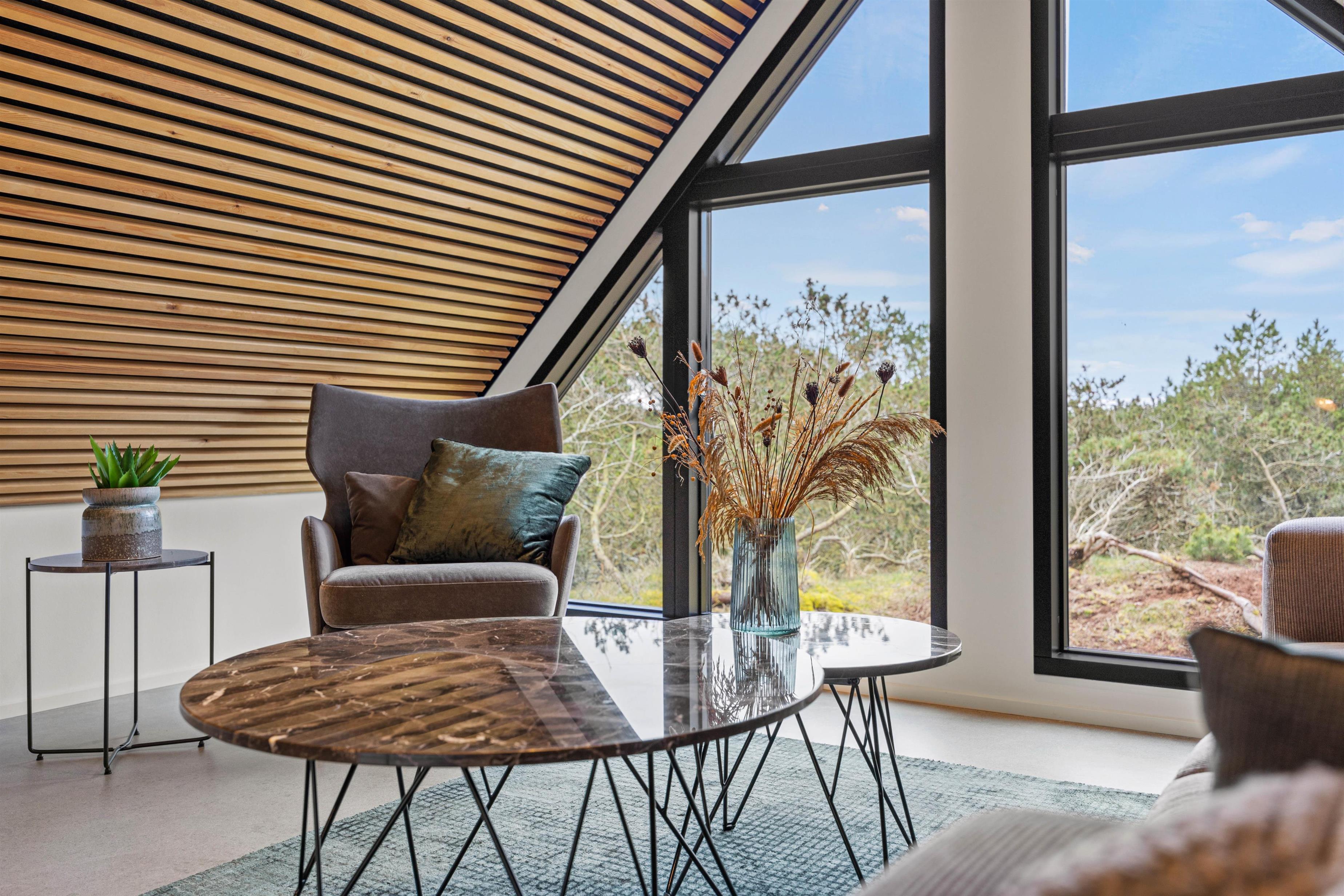 Opholdsstuen befinder sig på 1. sal, hvor I har 2 lækre sofaarrangementer og en storslået udsigt udover den store naturbeskyttede grund. Stream en spændende film via den indbyggede Chromecast eller afspil musik på stereoanlægget med en iPad.